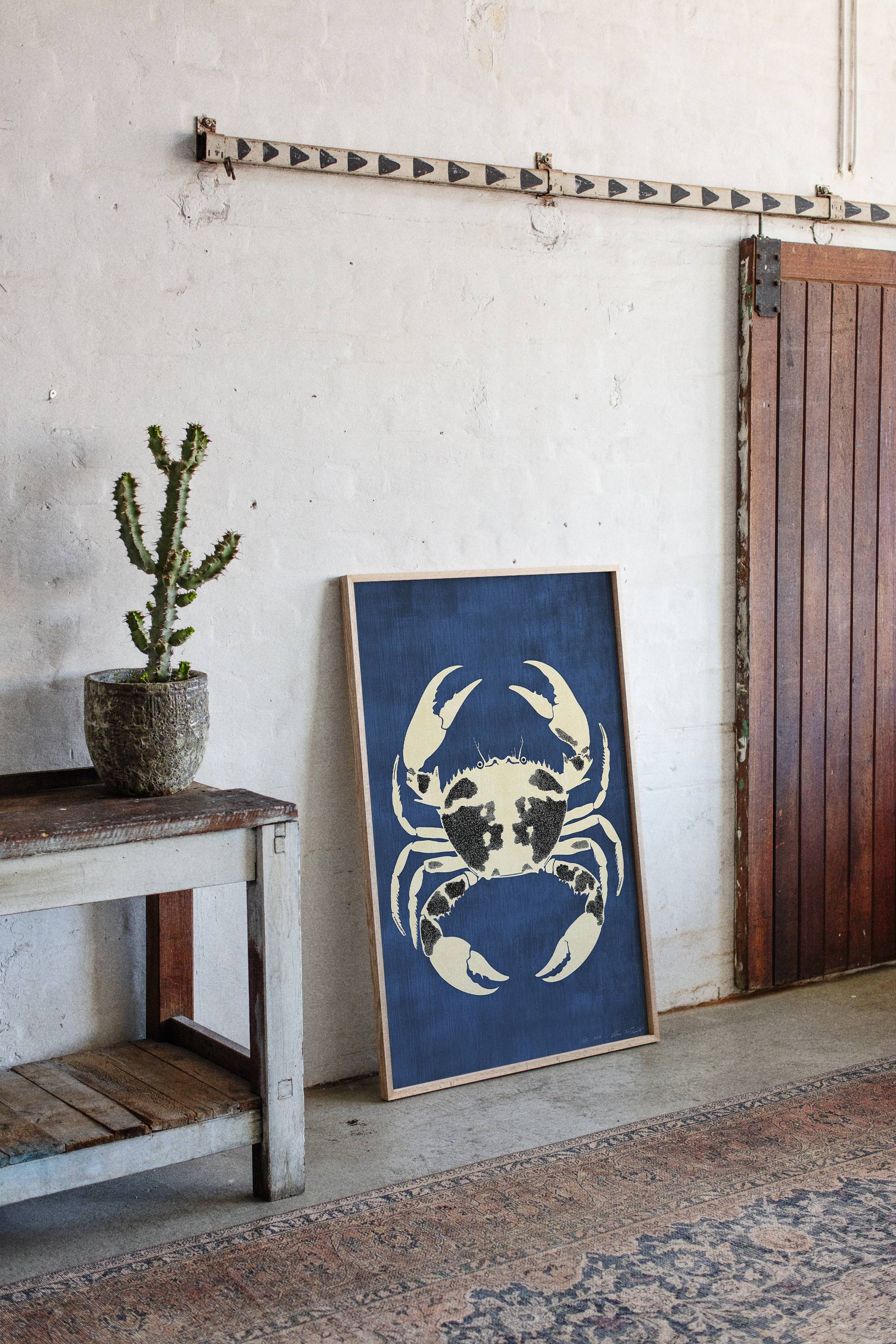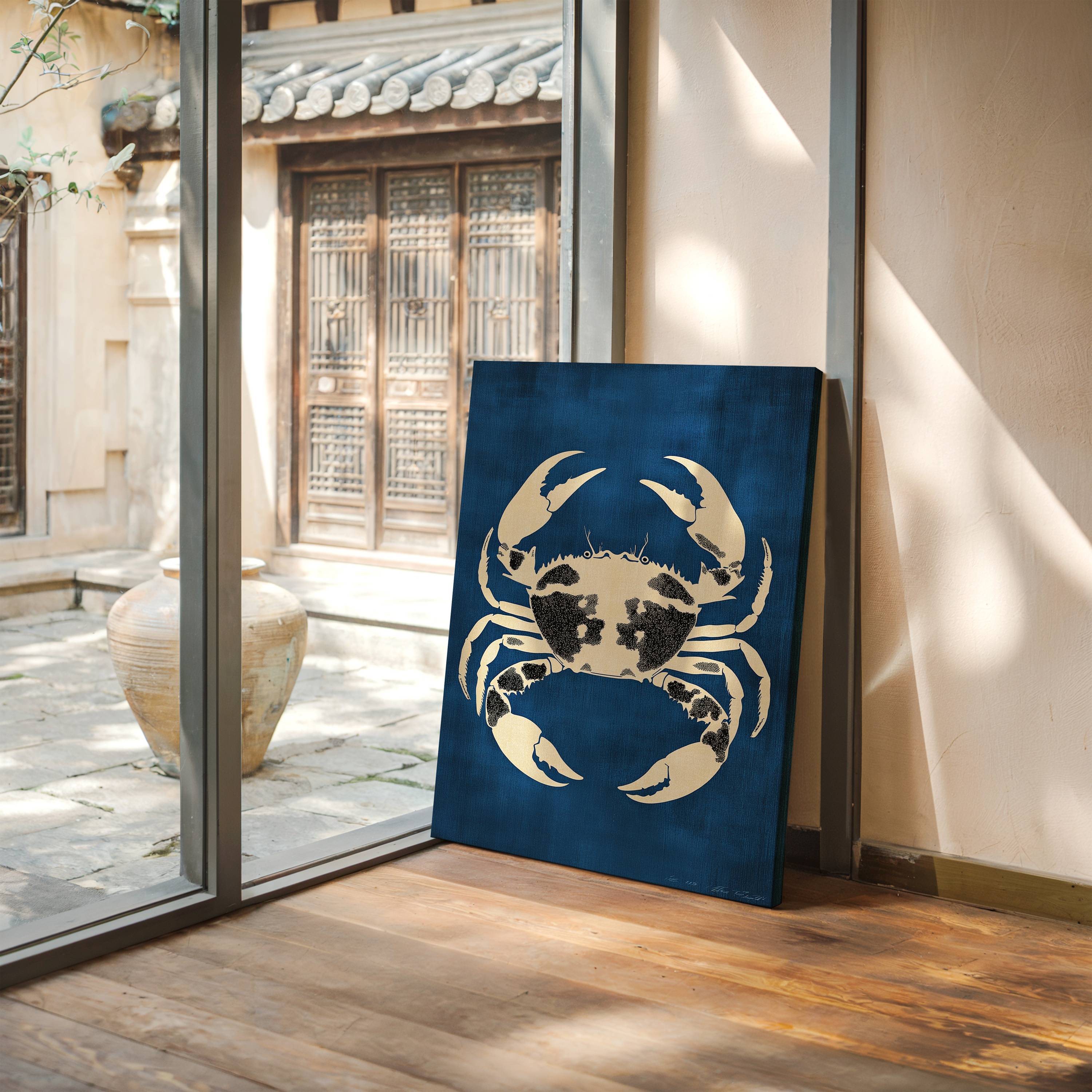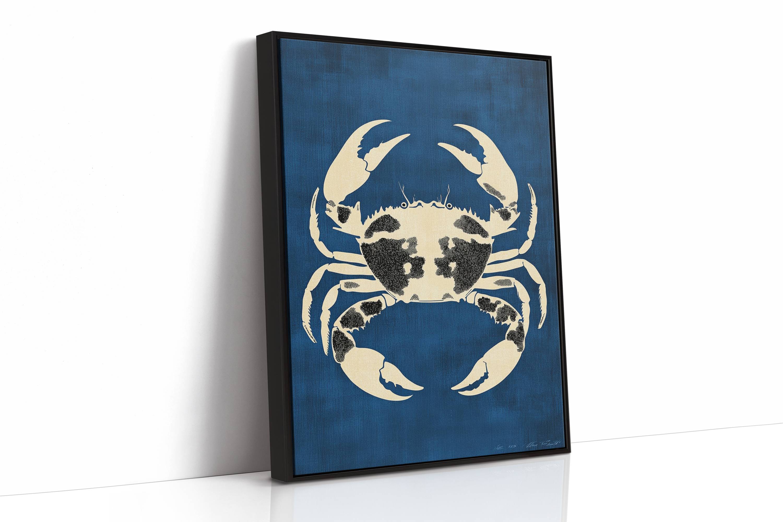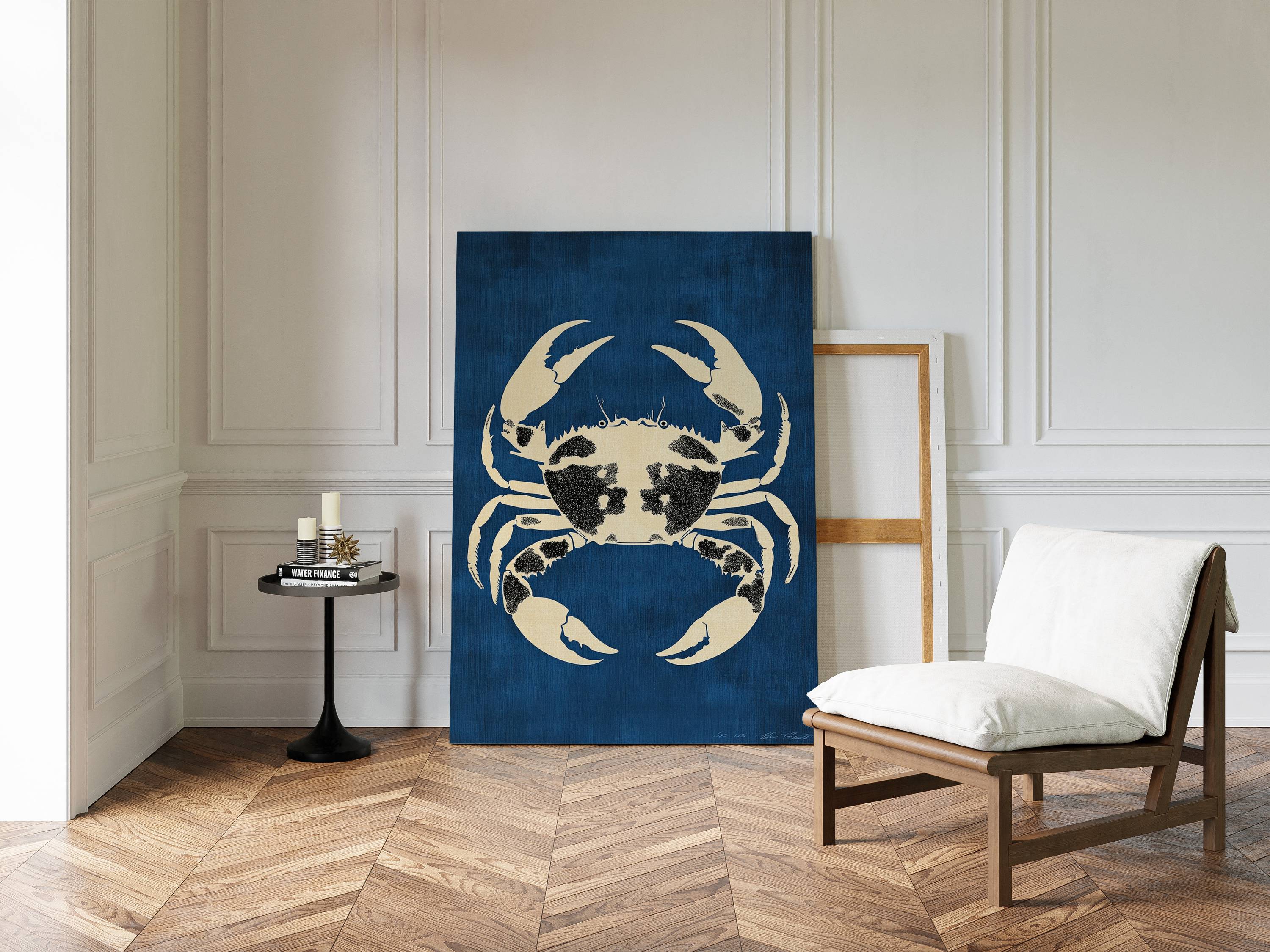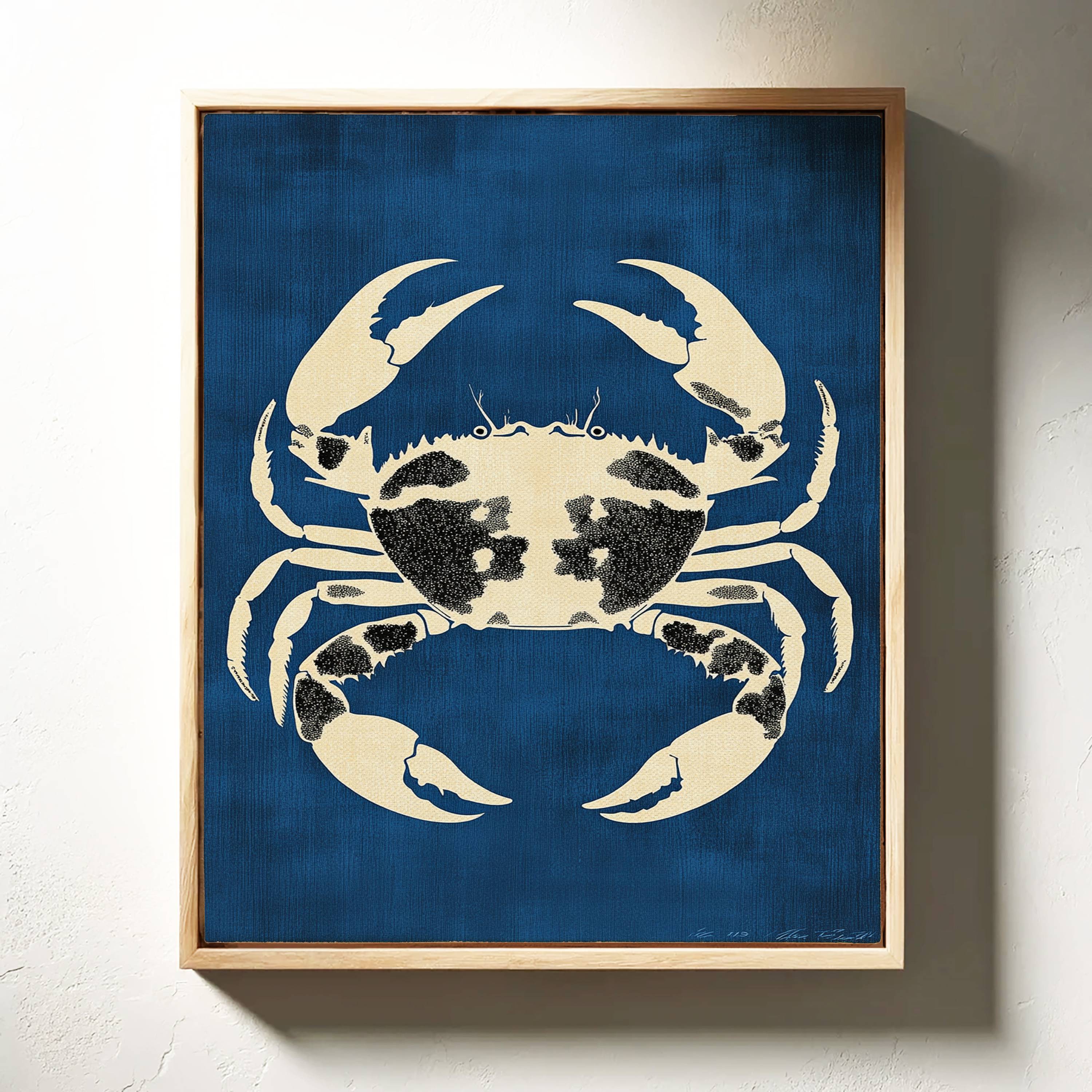 Against a deep midnight blue backdrop, a striking white crab silhouette commands attention with bold geometric precision. The creature's form is masterfully rendered in cream and black, creating a powerful contrast that speaks to both natural beauty and modern design sensibility. Detailed stippling adds rich texture to the shell's patterns, while clean lines trace the elegant architecture of claws and legs. This piece brings sophisticated coastal charm to contemporary spaces, perfect for creating a focal point in a modern beach house or adding maritime elegance to an urban dwelling.