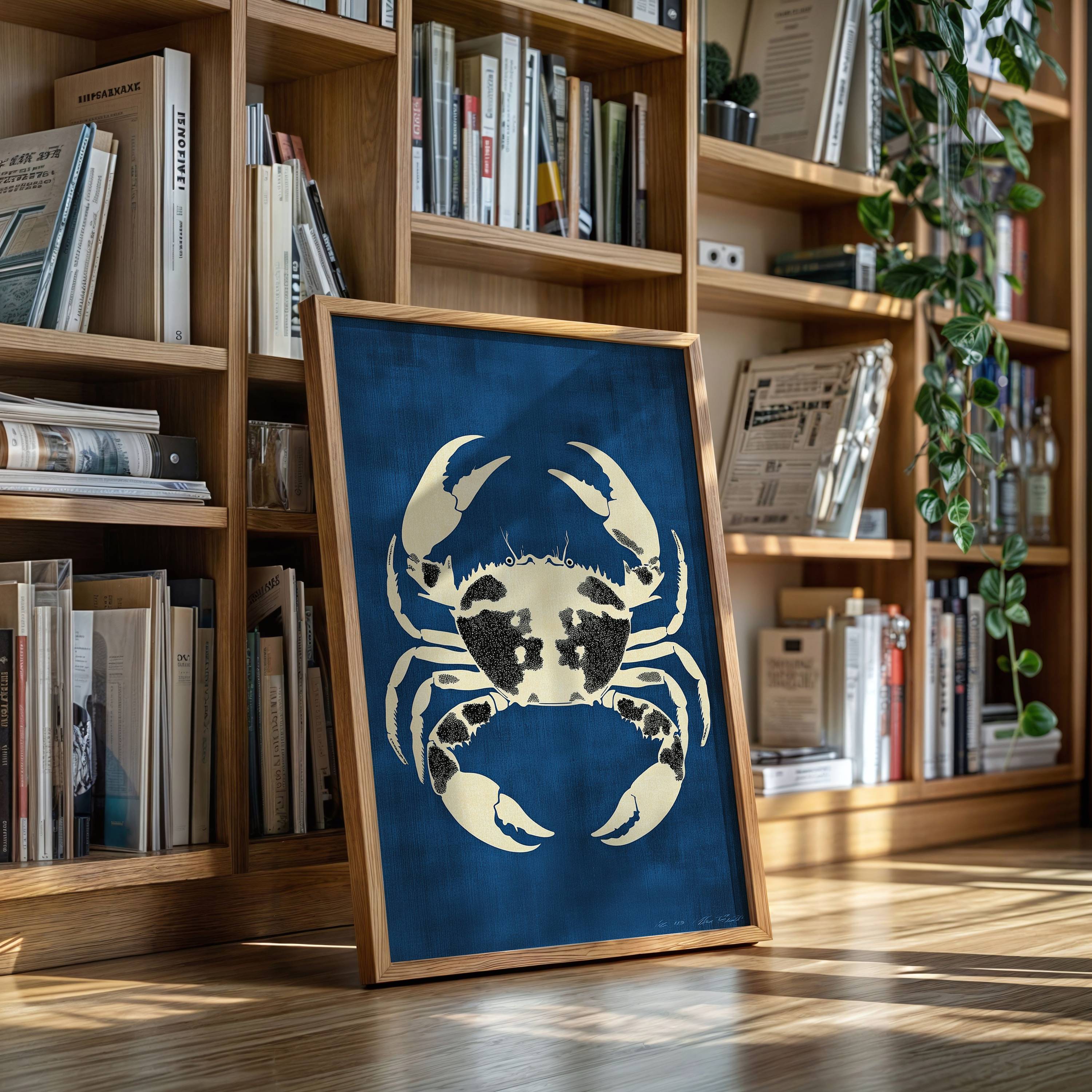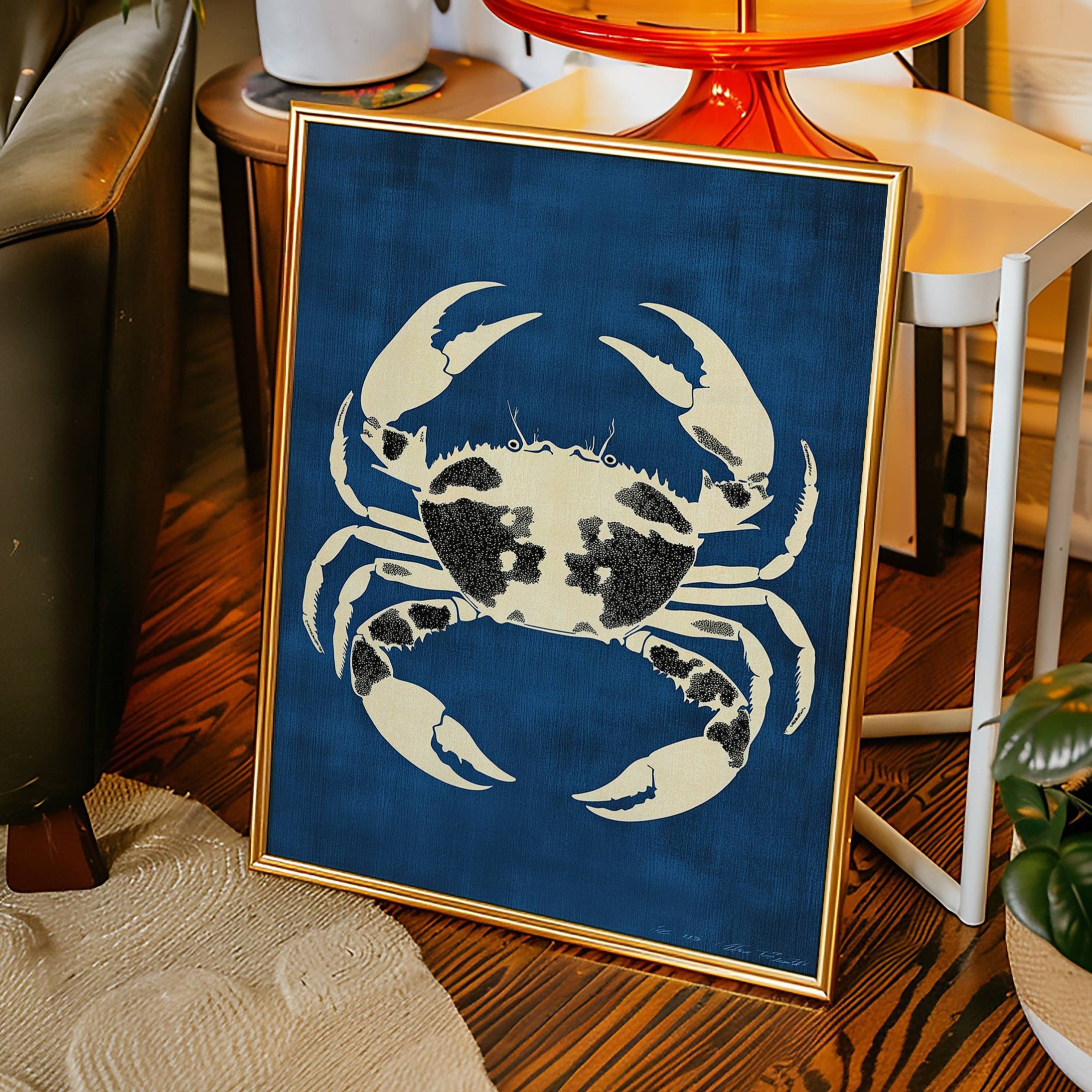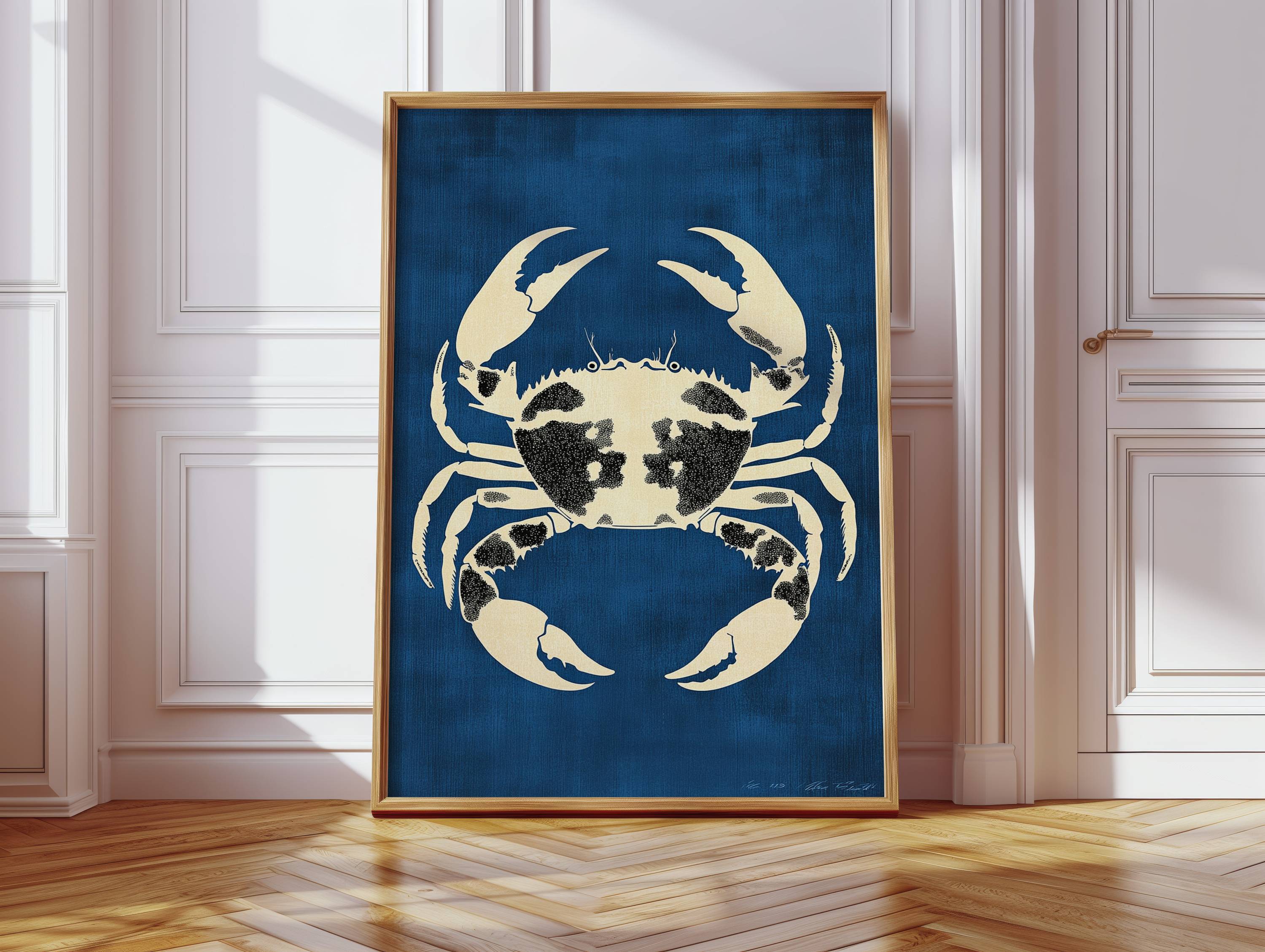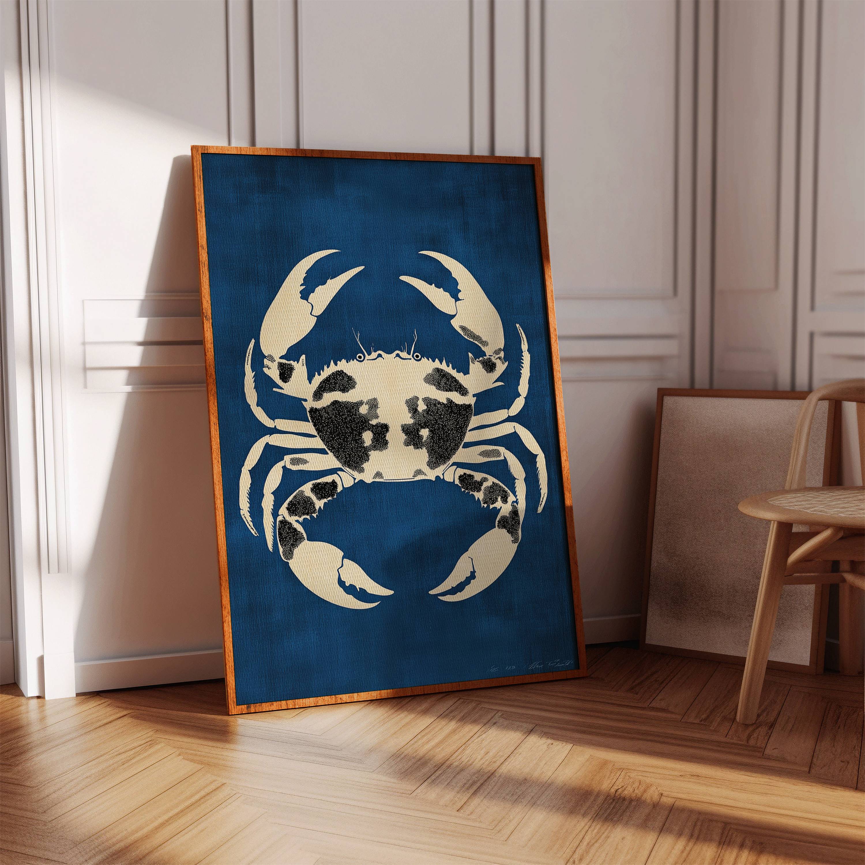 Against a deep midnight blue backdrop, a striking white crab silhouette commands attention with bold geometric precision. The creature's form is masterfully rendered in cream and black, creating a powerful contrast that speaks to both natural beauty and modern design sensibility. Detailed stippling adds rich texture to the shell's patterns, while clean lines trace the elegant architecture of claws and legs. This piece brings sophisticated coastal charm to contemporary spaces, perfect for creating a focal point in a modern beach house or adding maritime elegance to an urban dwelling.