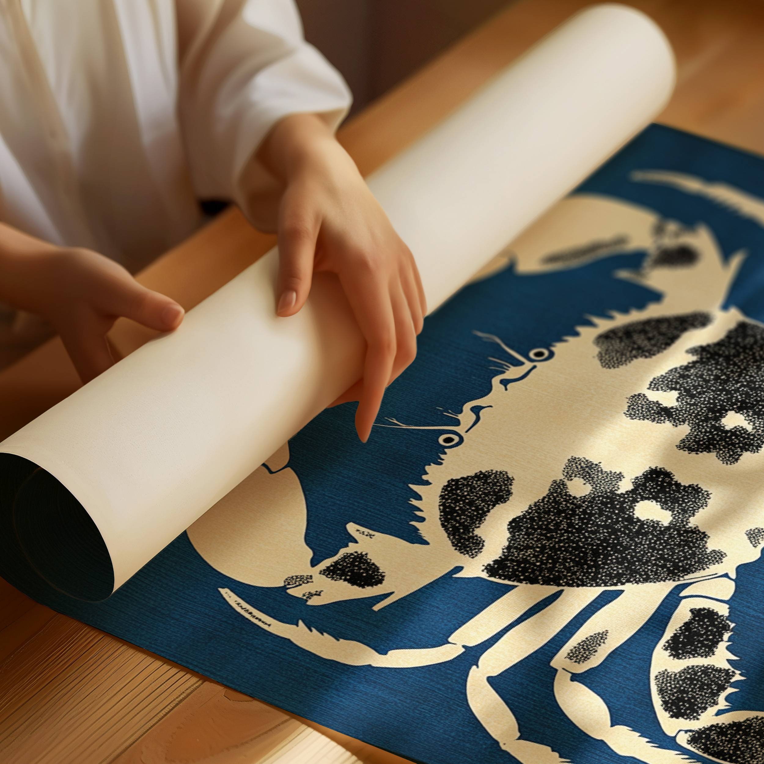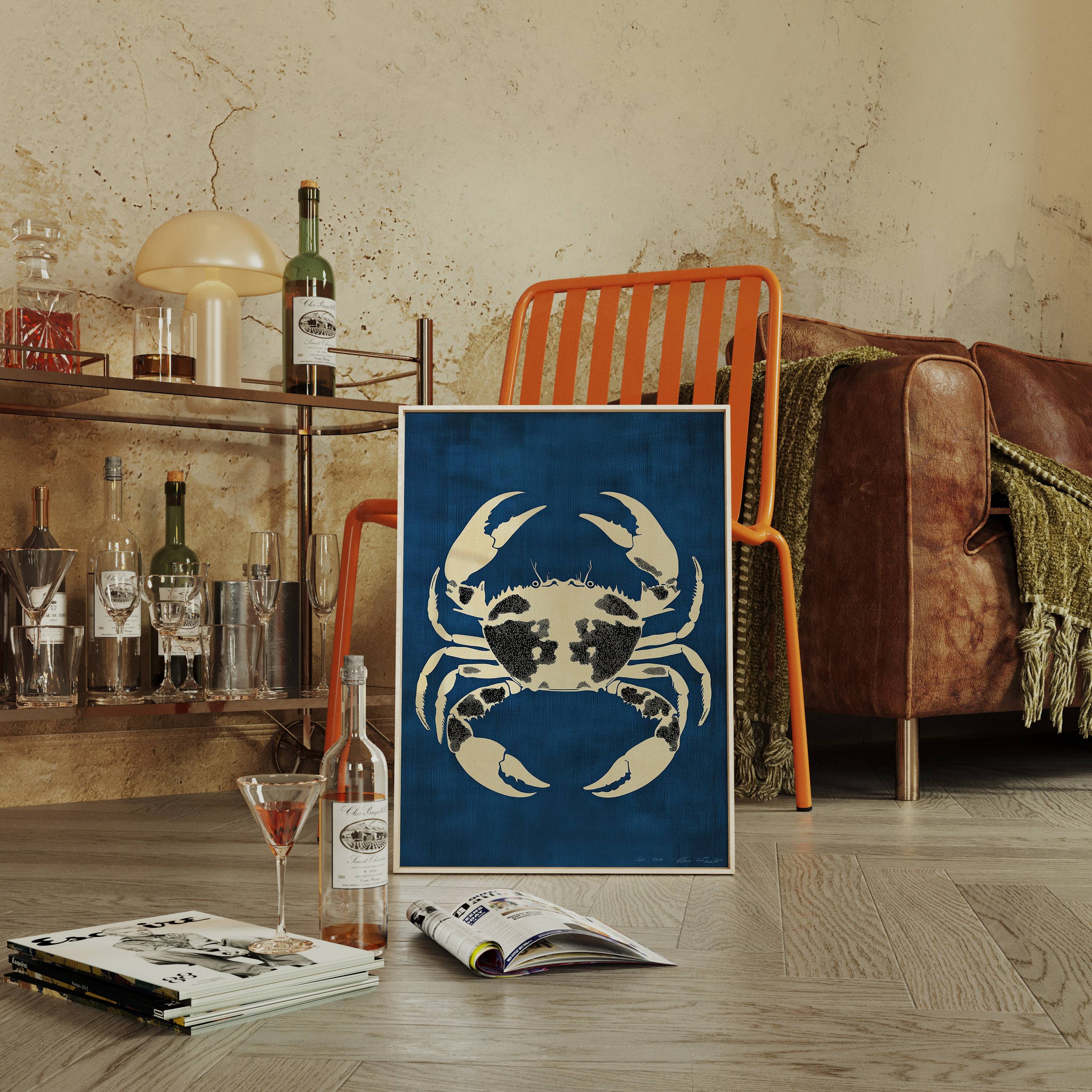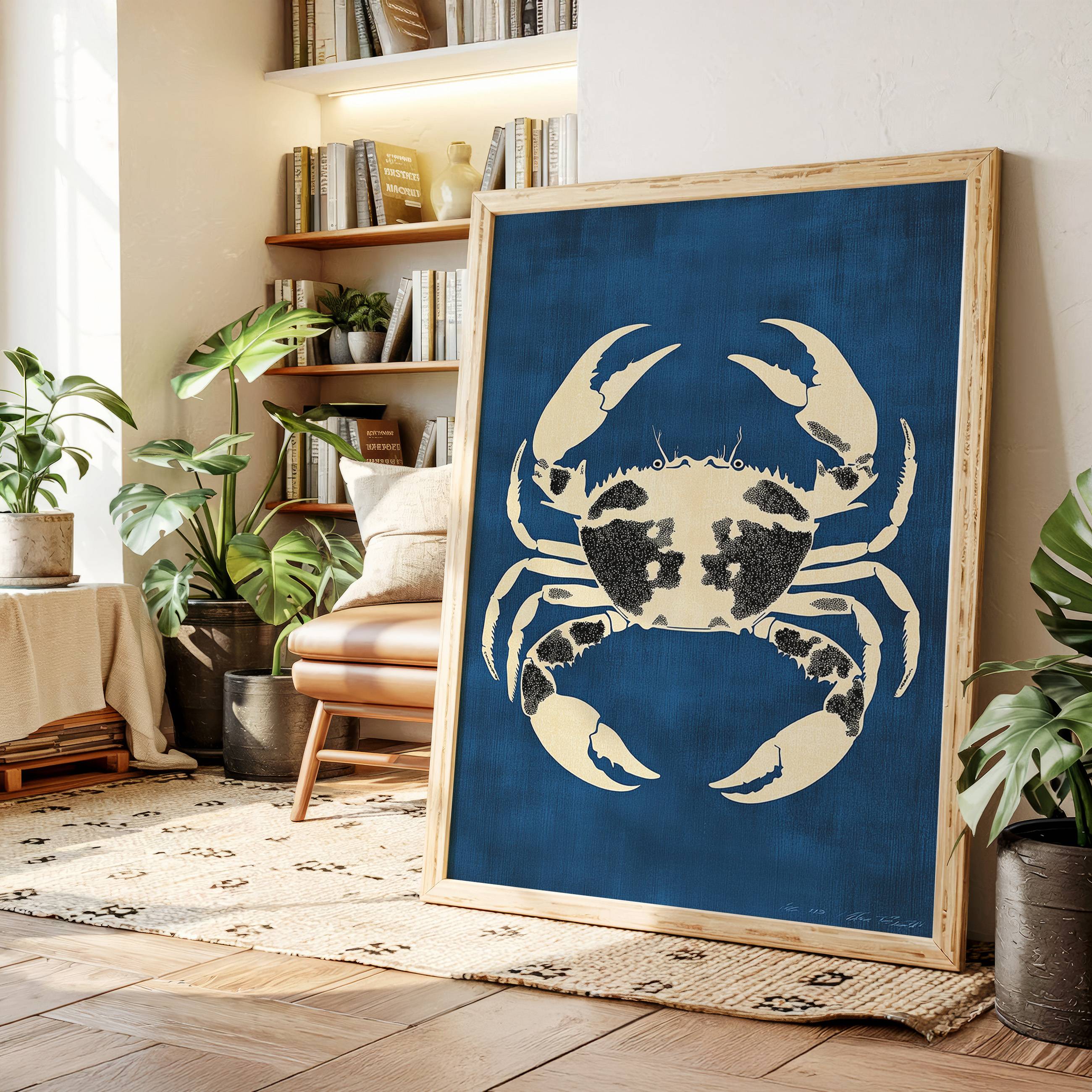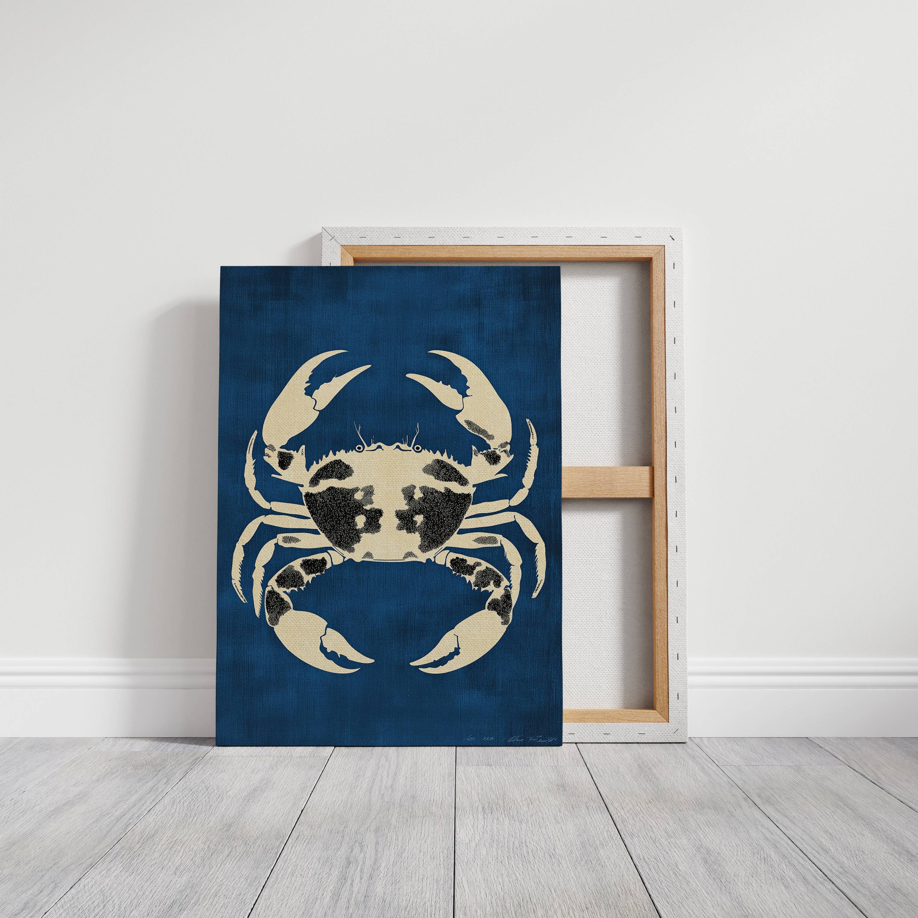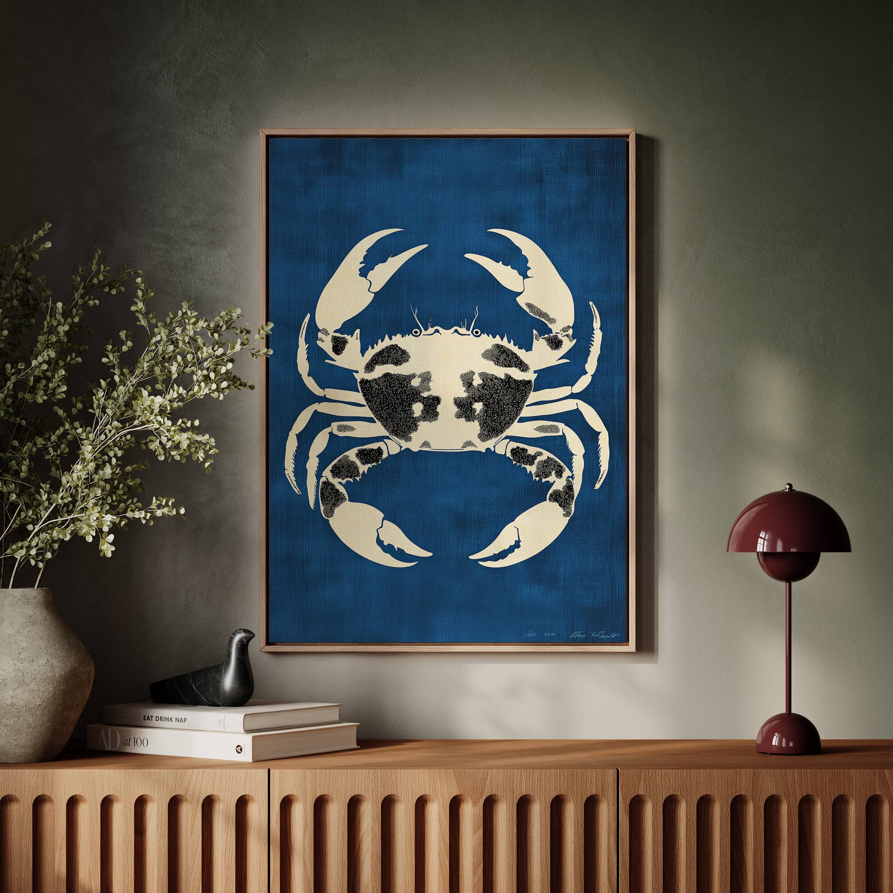 Against a deep midnight blue backdrop, a striking white crab silhouette commands attention with bold geometric precision. The creature's form is masterfully rendered in cream and black, creating a powerful contrast that speaks to both natural beauty and modern design sensibility. Detailed stippling adds rich texture to the shell's patterns, while clean lines trace the elegant architecture of claws and legs. This piece brings sophisticated coastal charm to contemporary spaces, perfect for creating a focal point in a modern beach house or adding maritime elegance to an urban dwelling.