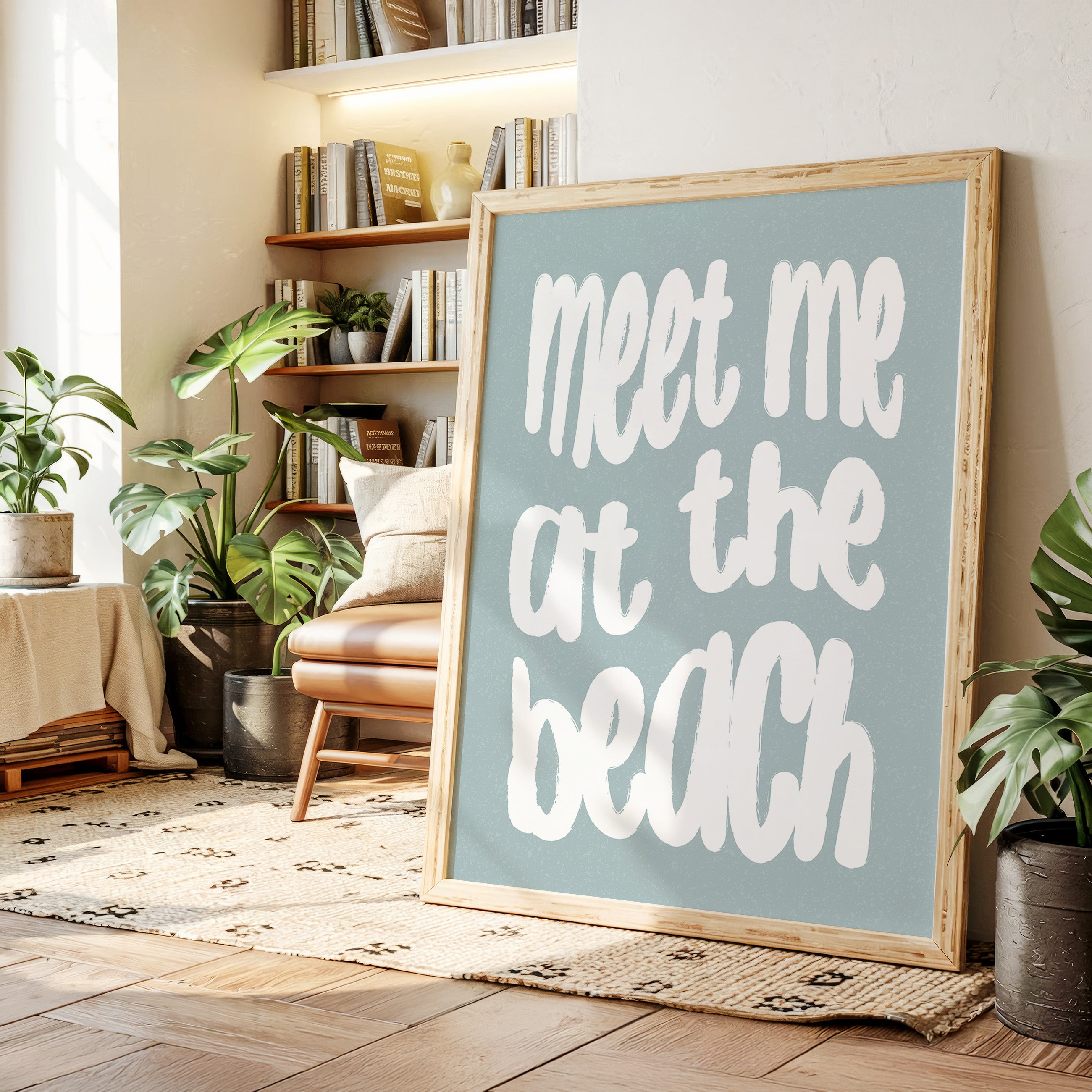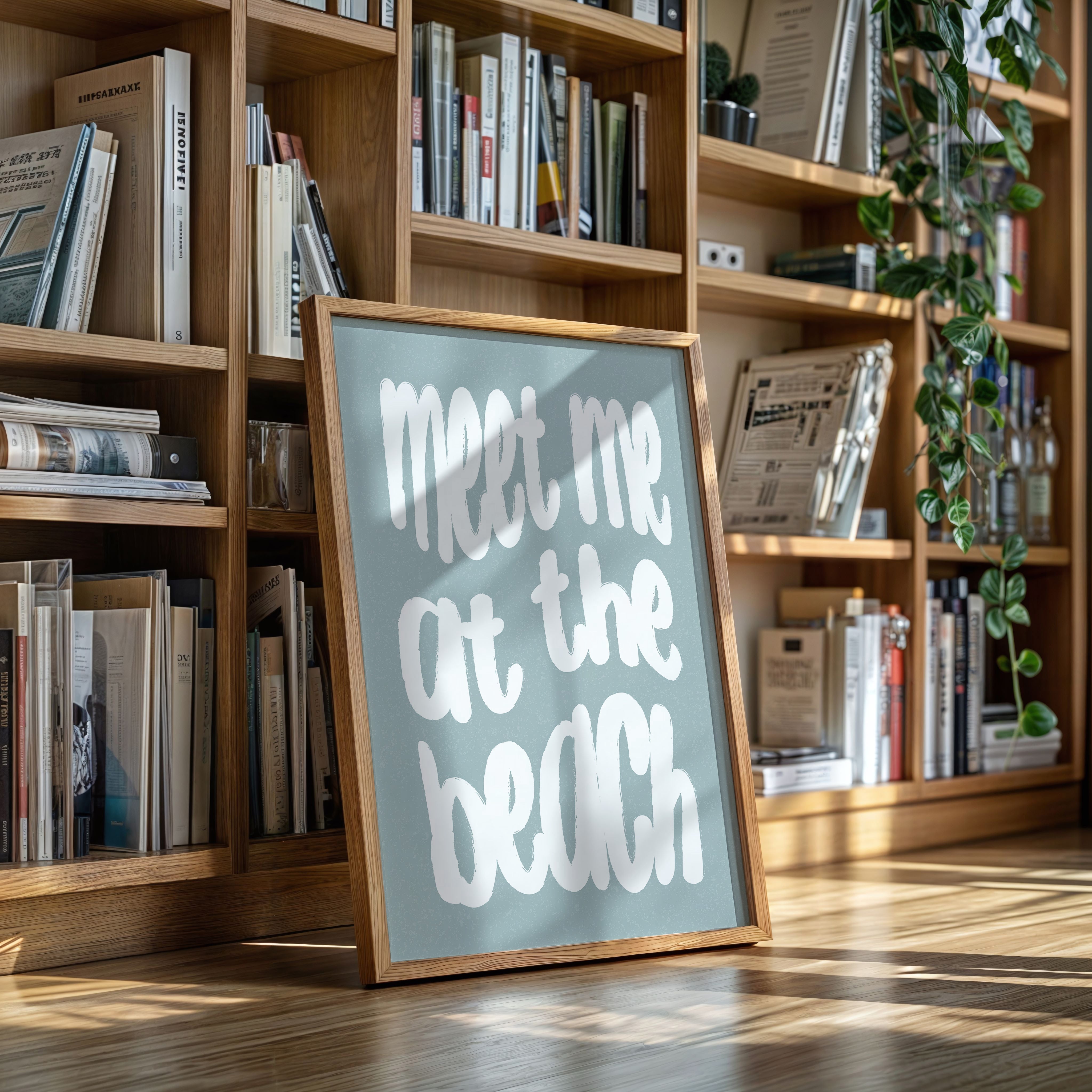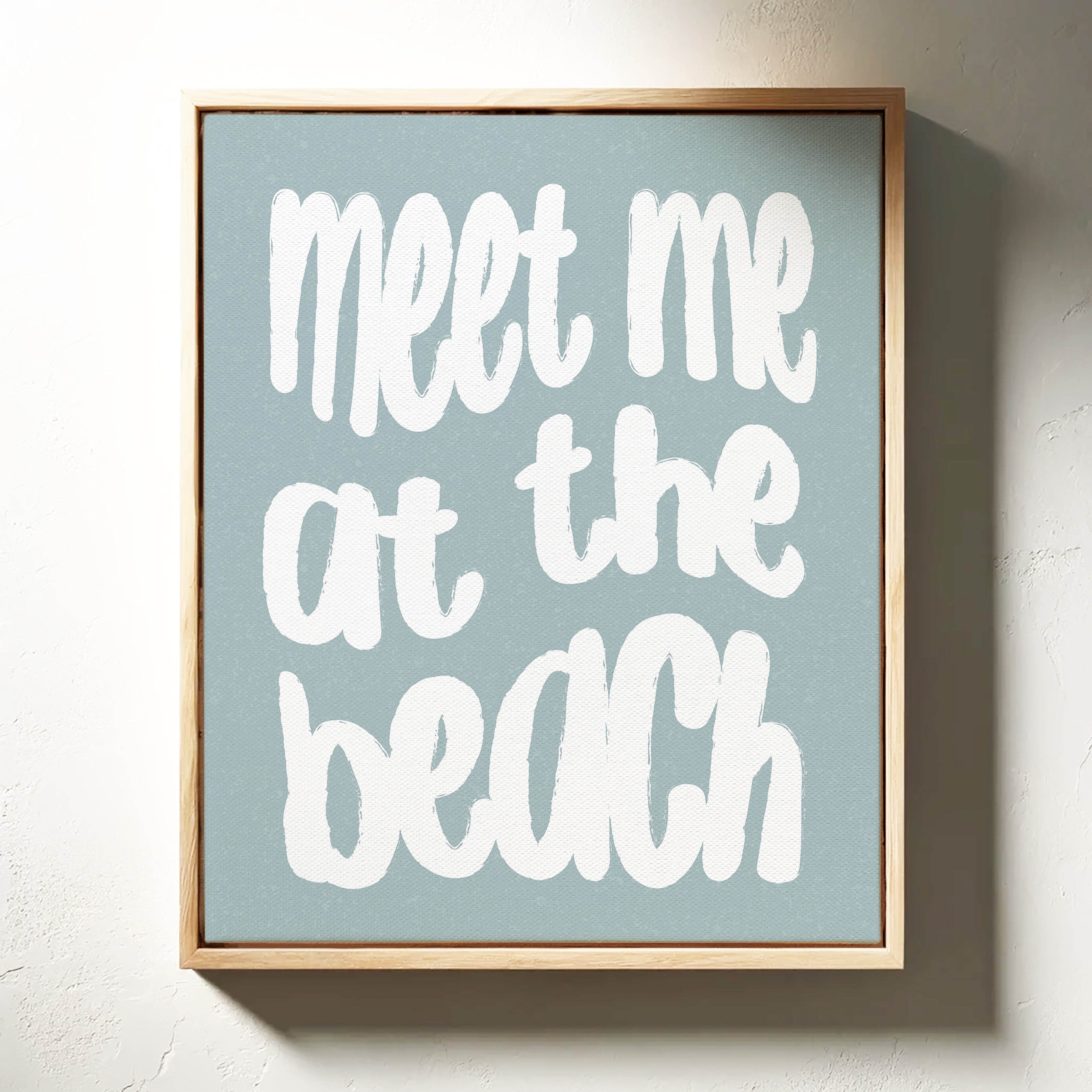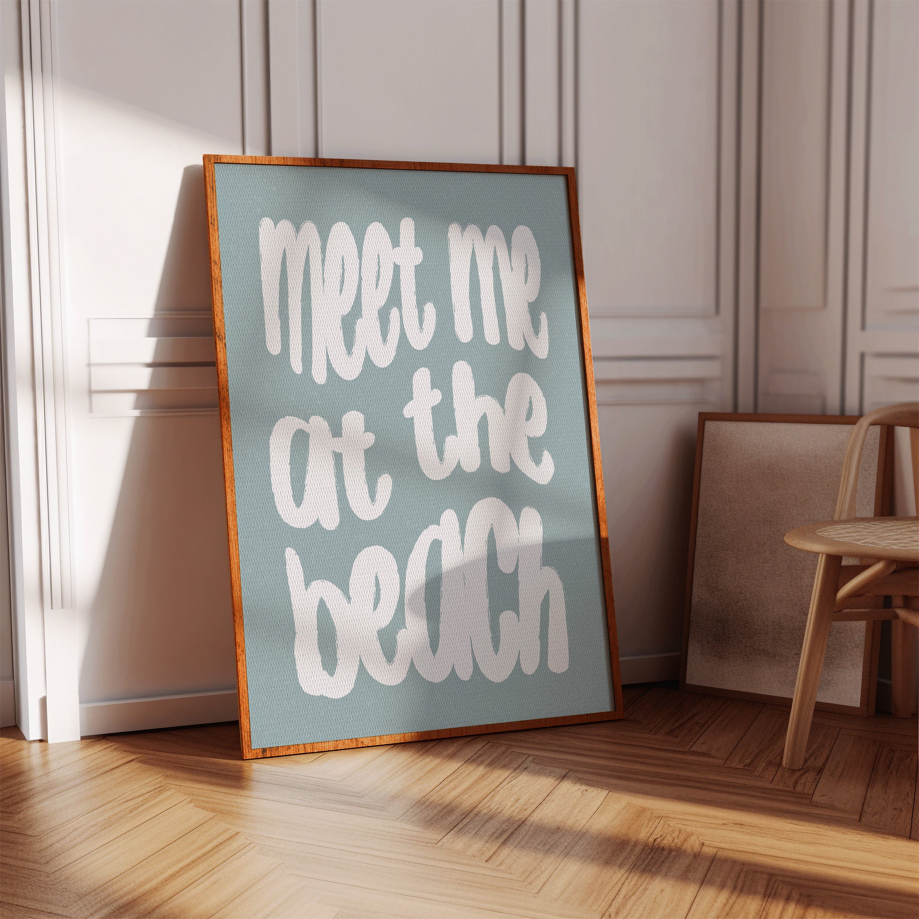 Soft morning light filters through sheer curtains, casting gentle shadows across a serene coastal-inspired bedroom. This contemporary typography piece brings a breath of fresh seaside air into modern spaces. The soothing sage-blue background cradles crisp white letters in a playful, hand-drawn style, creating an inviting message that speaks of sandy toes and salty breezes. Against warm wooden furnishings and clean white walls, it serves as both an artistic focal point and a daily reminder of beach-bound adventures. Perfect for bringing coastal charm to bedrooms, home offices, or any space yearning for a touch of seaside serenity.