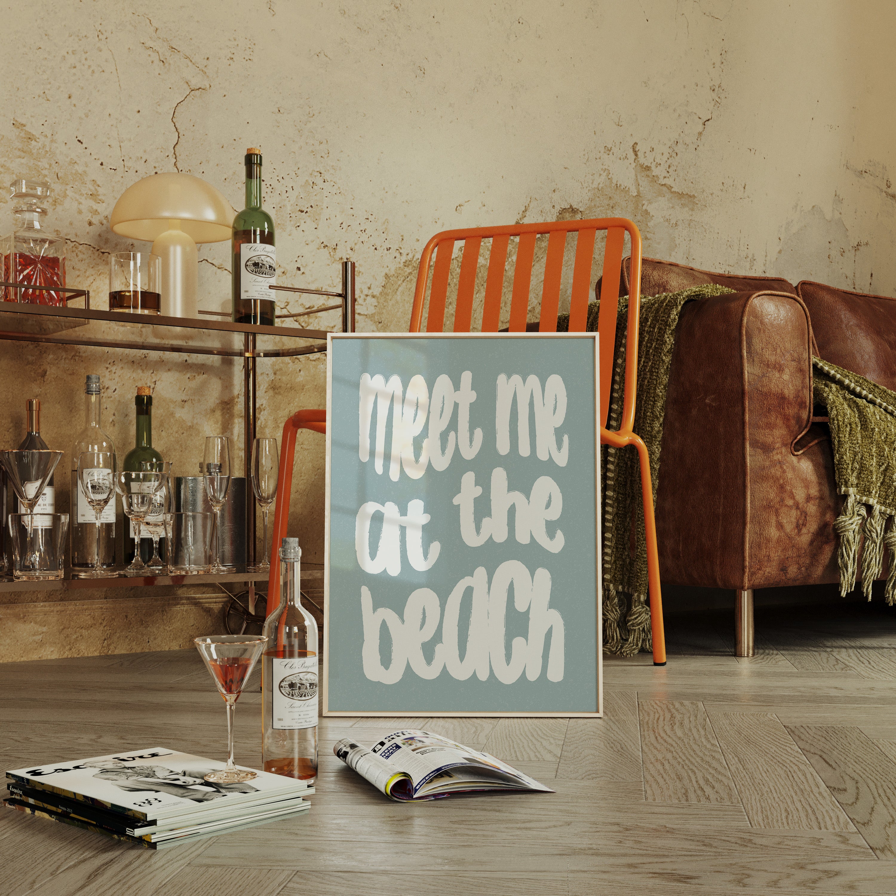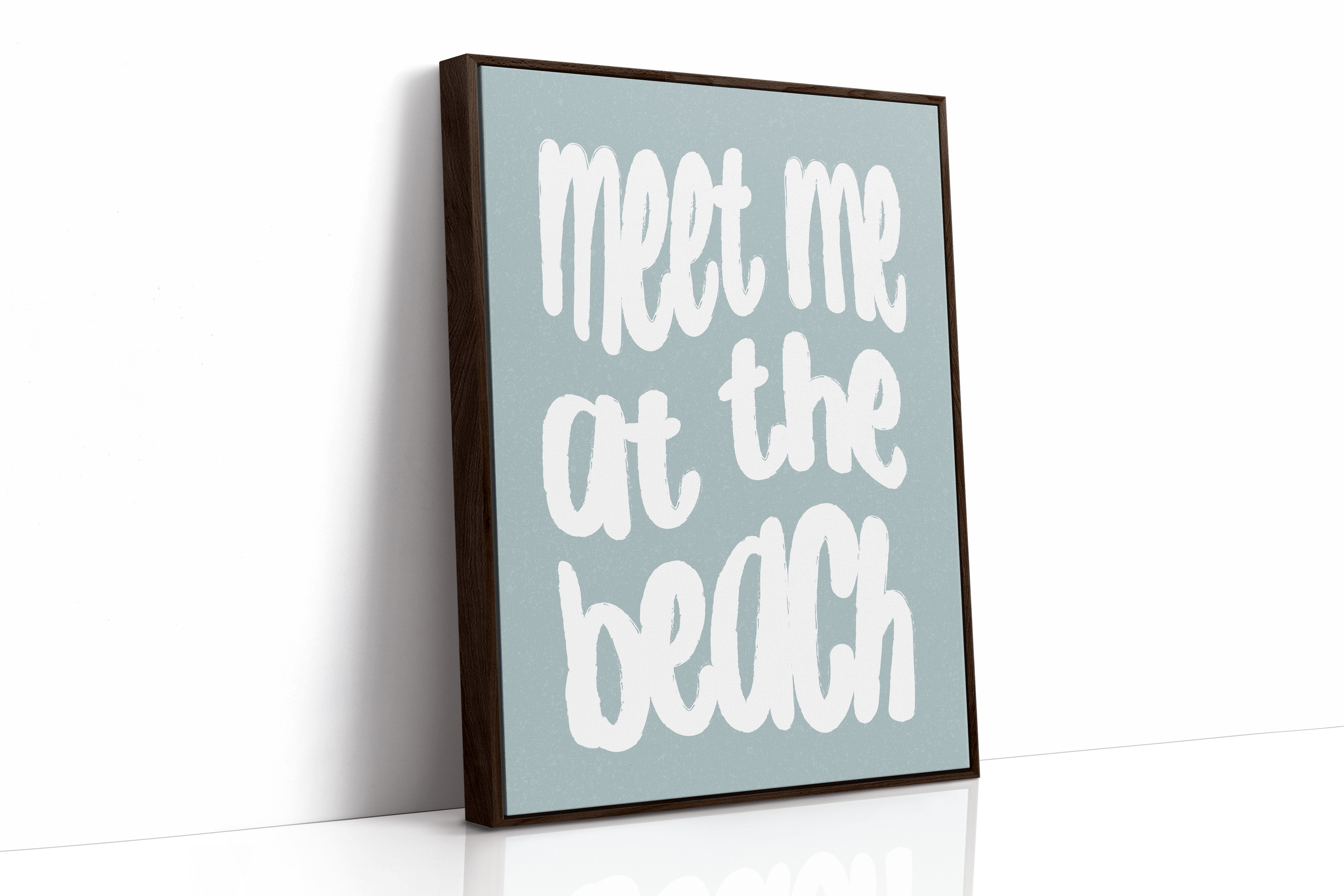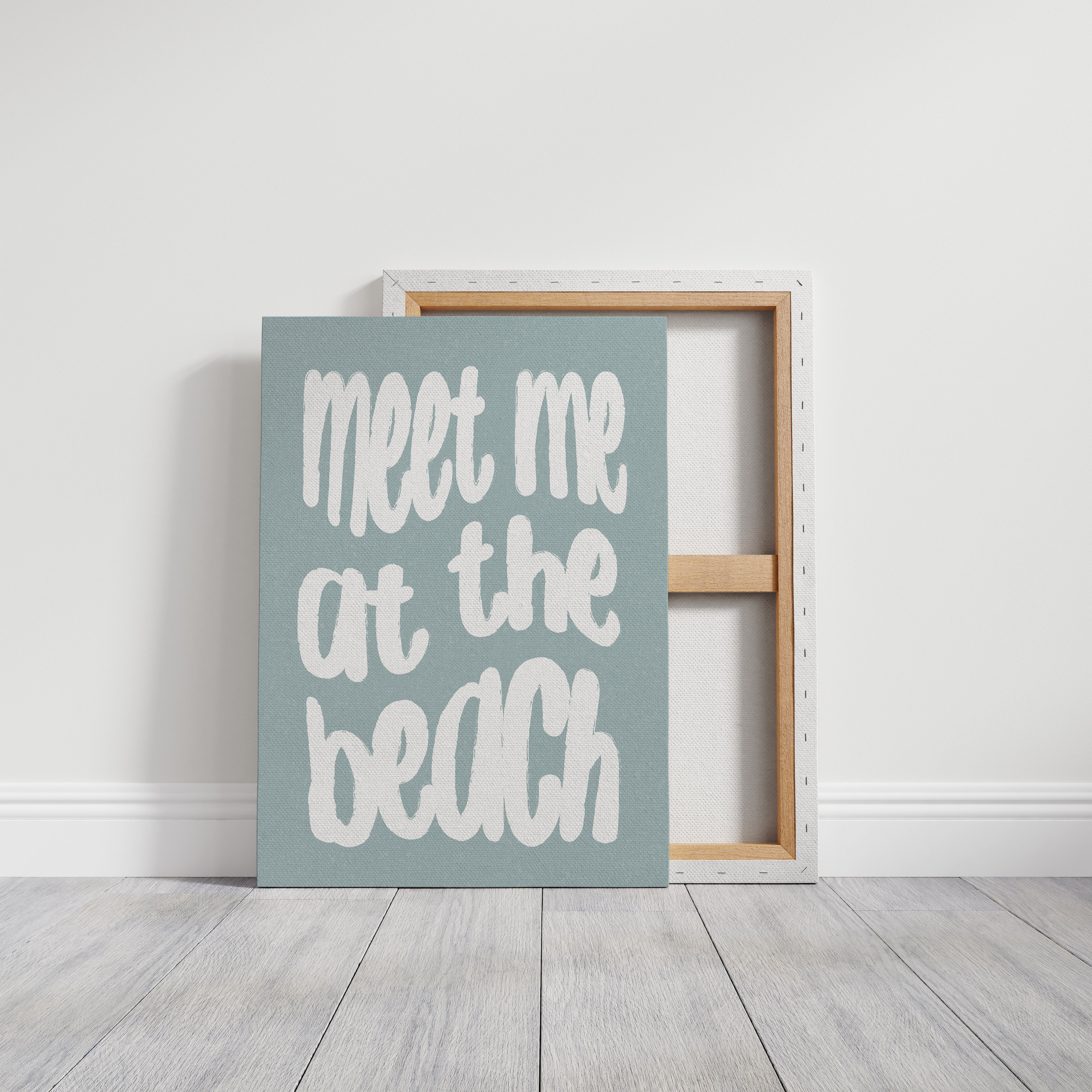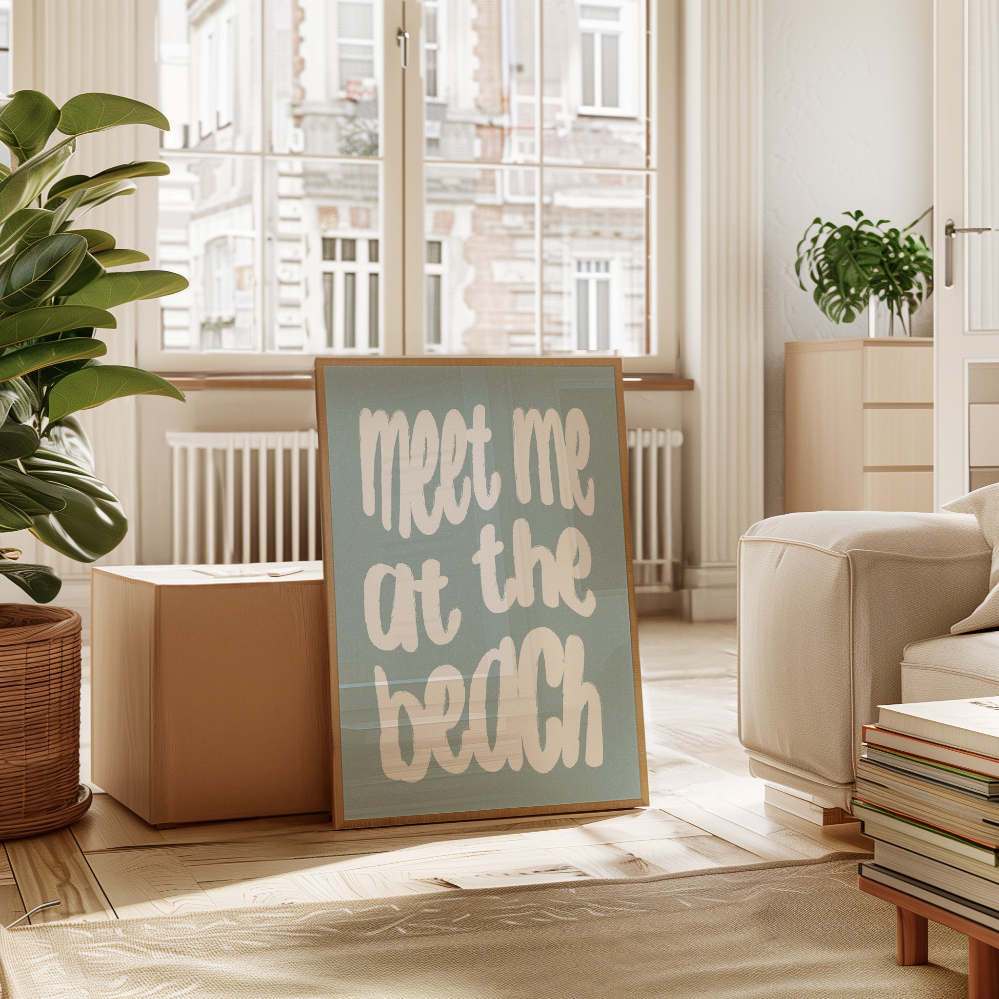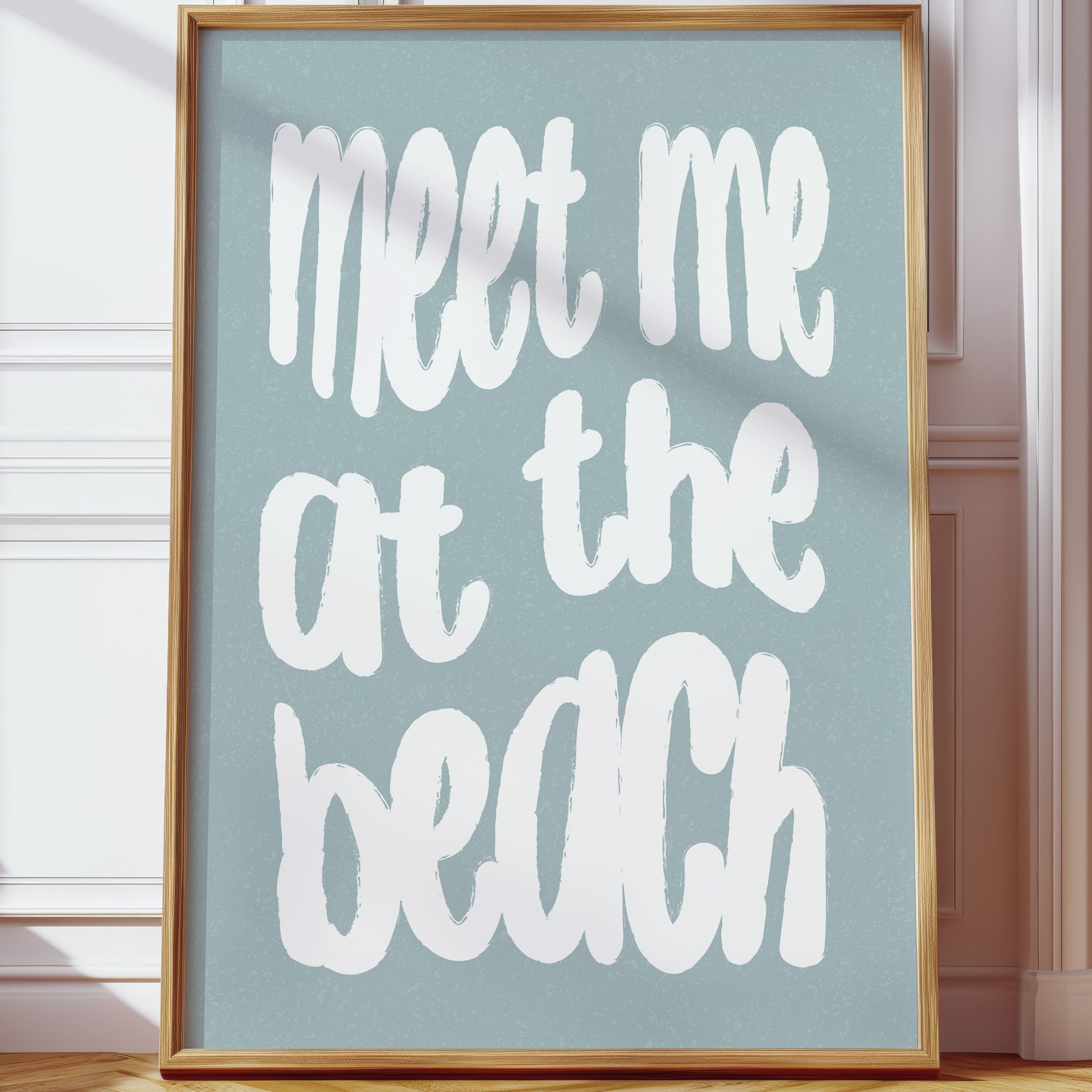 Soft morning light filters through sheer curtains, casting gentle shadows across a serene coastal-inspired bedroom. This contemporary typography piece brings a breath of fresh seaside air into modern spaces. The soothing sage-blue background cradles crisp white letters in a playful, hand-drawn style, creating an inviting message that speaks of sandy toes and salty breezes. Against warm wooden furnishings and clean white walls, it serves as both an artistic focal point and a daily reminder of beach-bound adventures. Perfect for bringing coastal charm to bedrooms, home offices, or any space yearning for a touch of seaside serenity.