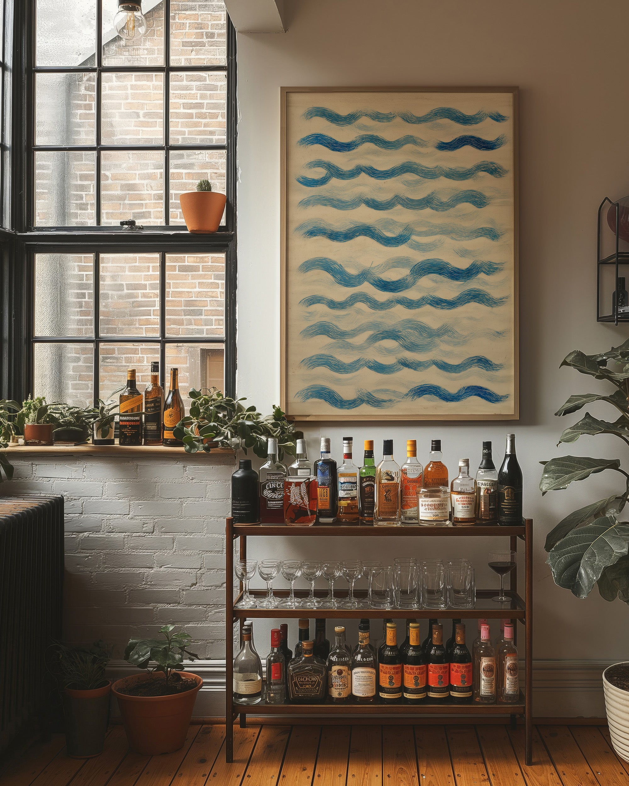 Brushstrokes of azure blue ripple across a cream canvas, capturing the gentle undulation of ocean waves in their most elemental form. The repetitive pattern creates a mesmerizing meditation on movement and flow, each wave unique yet part of a greater harmony. The modern composition finds perfect complement in its bright, airy setting, where natural light plays across the surface and enhances the artwork's sense of fluid motion. This statement piece would transform any coastal-inspired living space, creating a focal point that bridges sophisticated minimalism with organic energy.