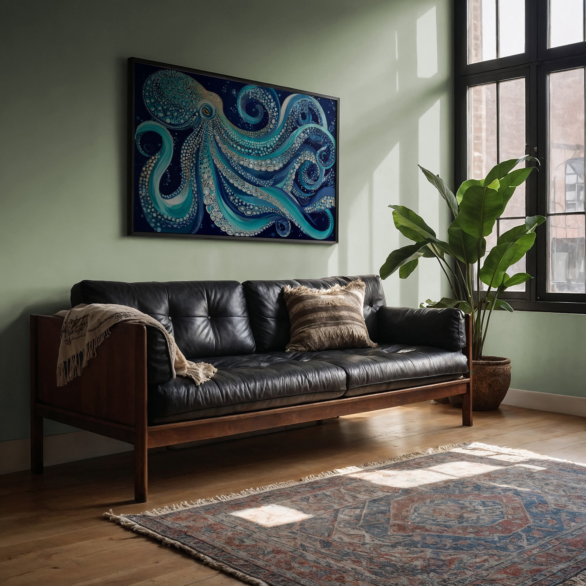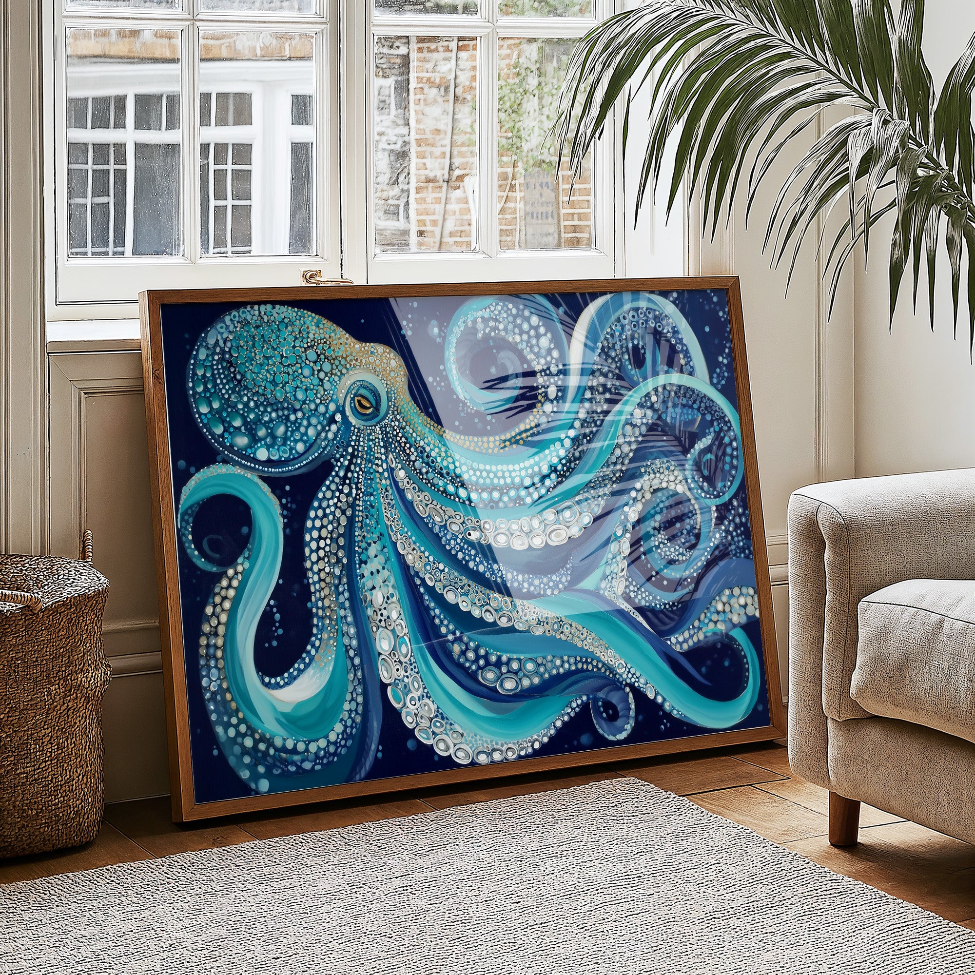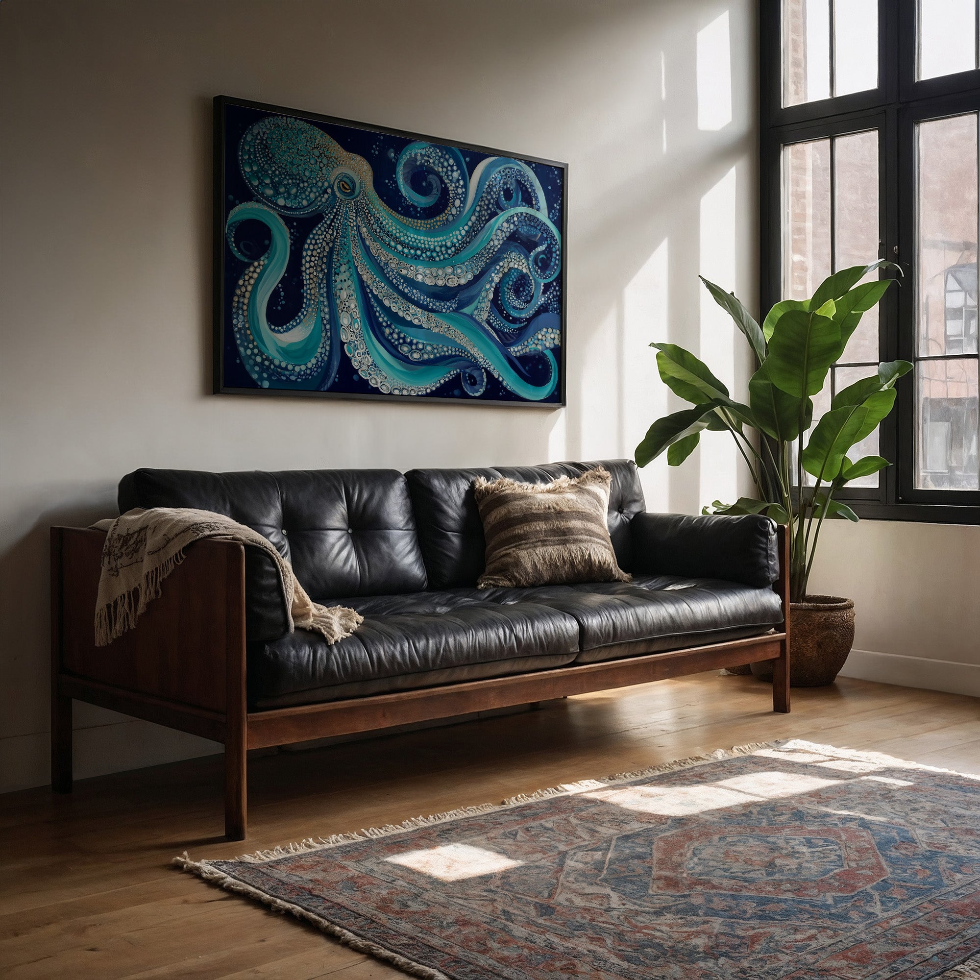 Afternoon sunlight streams across a corduroy couch, illuminating an enchanting octopus illustration rendered in mesmerizing shades of turquoise and navy. Delicate dots and swirling tentacles create a hypnotic pattern, suggesting movement beneath midnight waters. The artwork's fluid lines and ethereal aqua tones contrast beautifully with the warm amber light and organic shadows cast by nearby plants. This piece would bring a splash of coastal mystique to a reading nook, home office, or any space seeking that perfect balance between whimsy and sophistication.