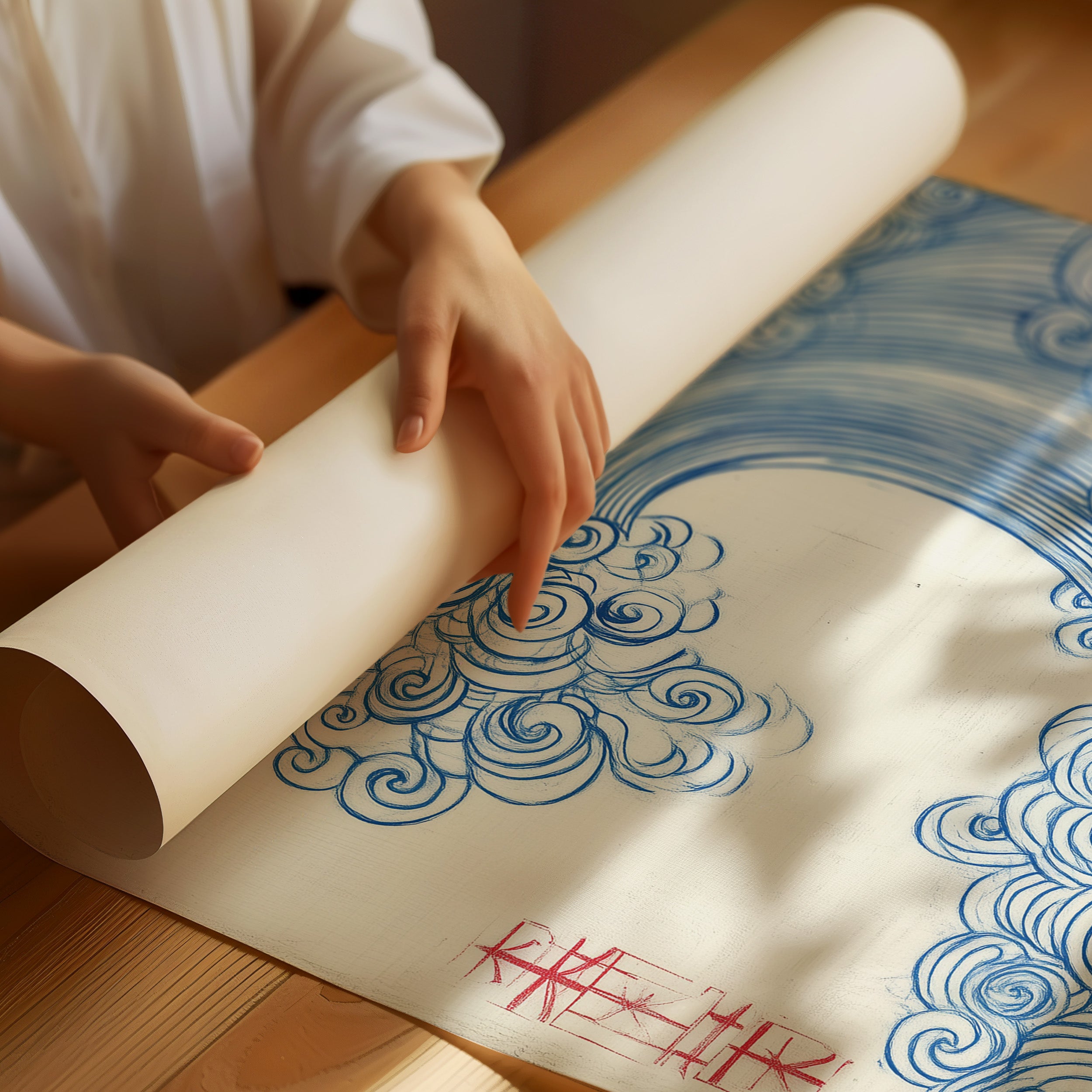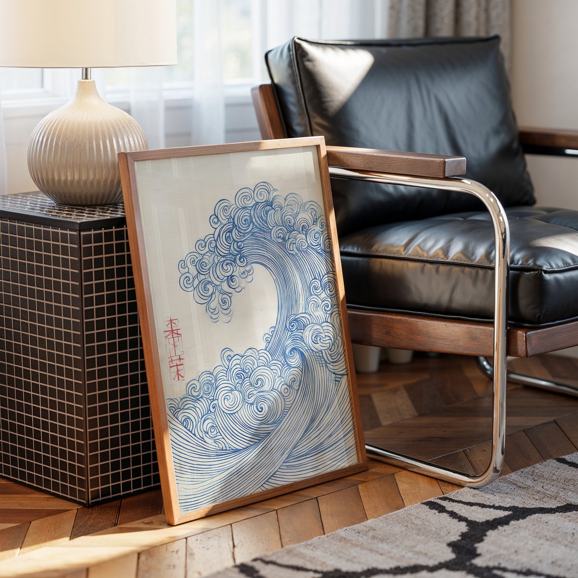 A mesmerizing wave rises with graceful intensity, its swirling patterns capturing the raw energy of the sea in traditional Japanese style. Delicate blue brushstrokes weave together to form an elegant tapestry of curves and spirals, creating a dynamic force that seems to pulse with life against the serene cream background. The composition balances power and tranquility, with detailed wave curls that speak to nature's infinite patterns. This piece would bring a sense of zen and movement to a reading nook, home office, or meditation space, especially when paired with natural materials and minimalist decor.