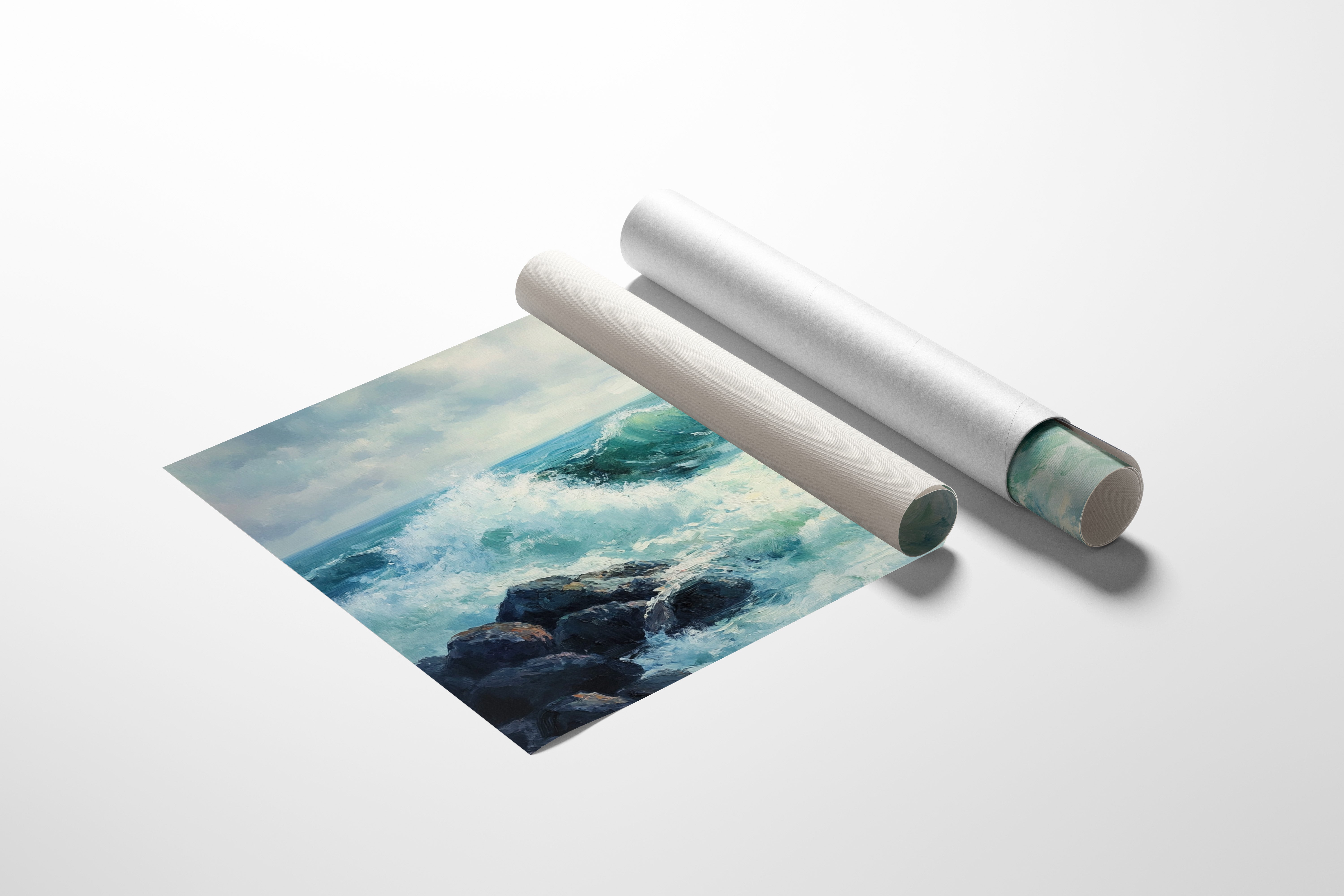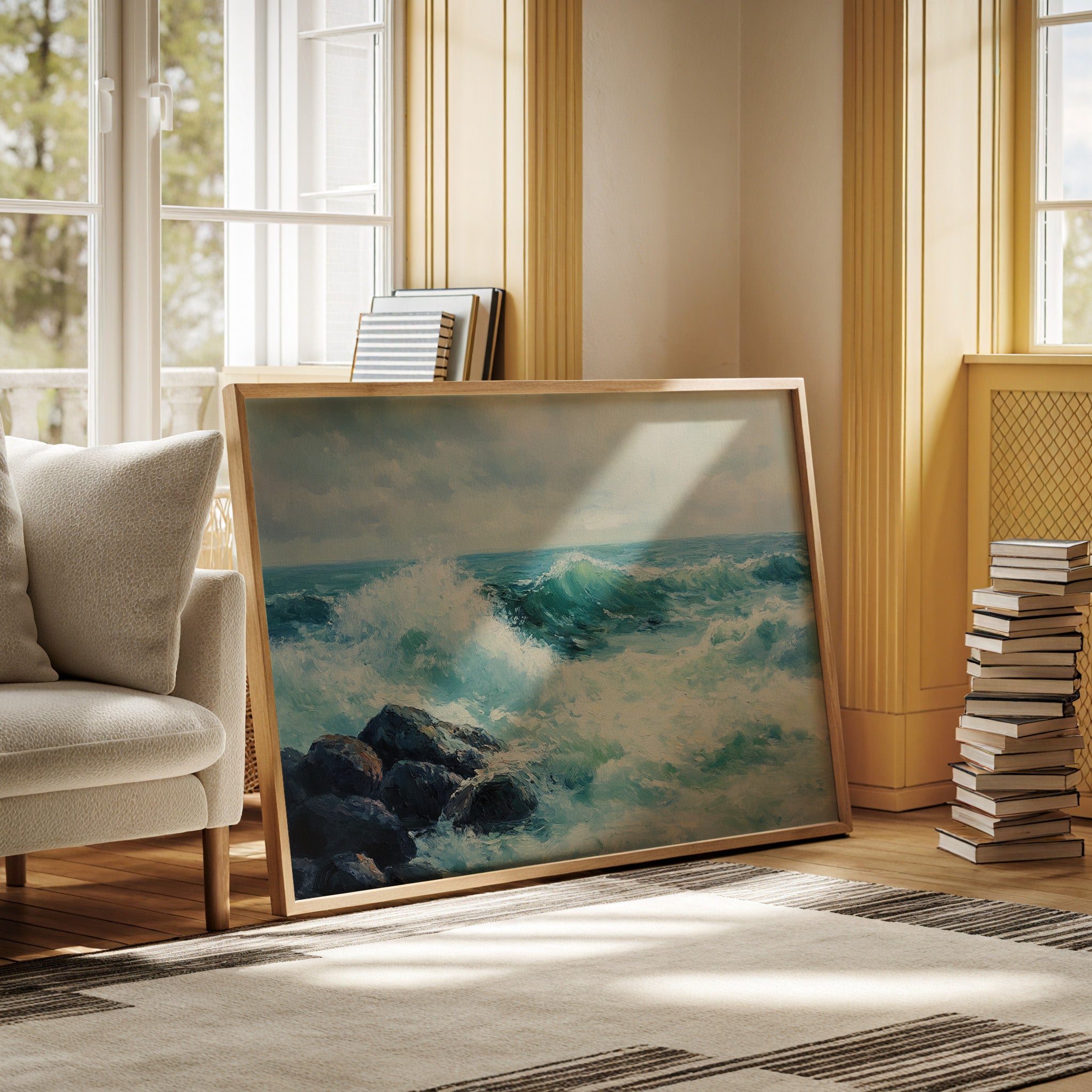 Turbulent waves crash against dark coastal rocks, sending plumes of white spray skyward in a dramatic display of nature's raw power. The sea churns in mesmerizing shades of turquoise and emerald, each wave catching light as it rises and falls against the misty horizon. Thick, textured brushstrokes capture the dynamic energy of the surf, while moody gray clouds hover above, creating a perfect balance between stormy drama and serene beauty. This piece brings the invigorating essence of coastal living into any space, ideal for creating a focal point in a beach house great room or adding natural drama to a contemporary living space.