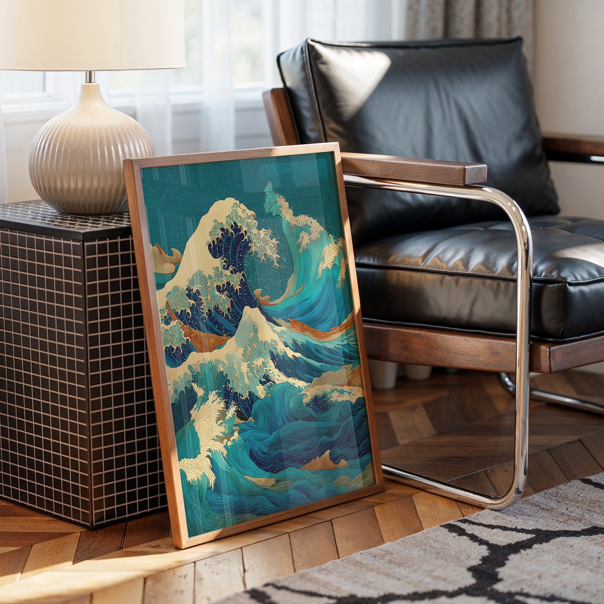 Turquoise waves surge with dramatic energy, their foam-tipped peaks adorned with shimmering gold leaf accents. The composition masterfully captures the raw power of the sea through sweeping curves and dynamic movement, where deep navy blues transition into vibrant teals. This contemporary interpretation of a classic Japanese wave motif brings together traditional artistic elements with modern color sensibilities, creating a mesmerizing dance of water and light. This statement piece would transform a modern living room or office space, adding a splash of sophisticated drama while maintaining a sense of serenity through its harmonious color palette.