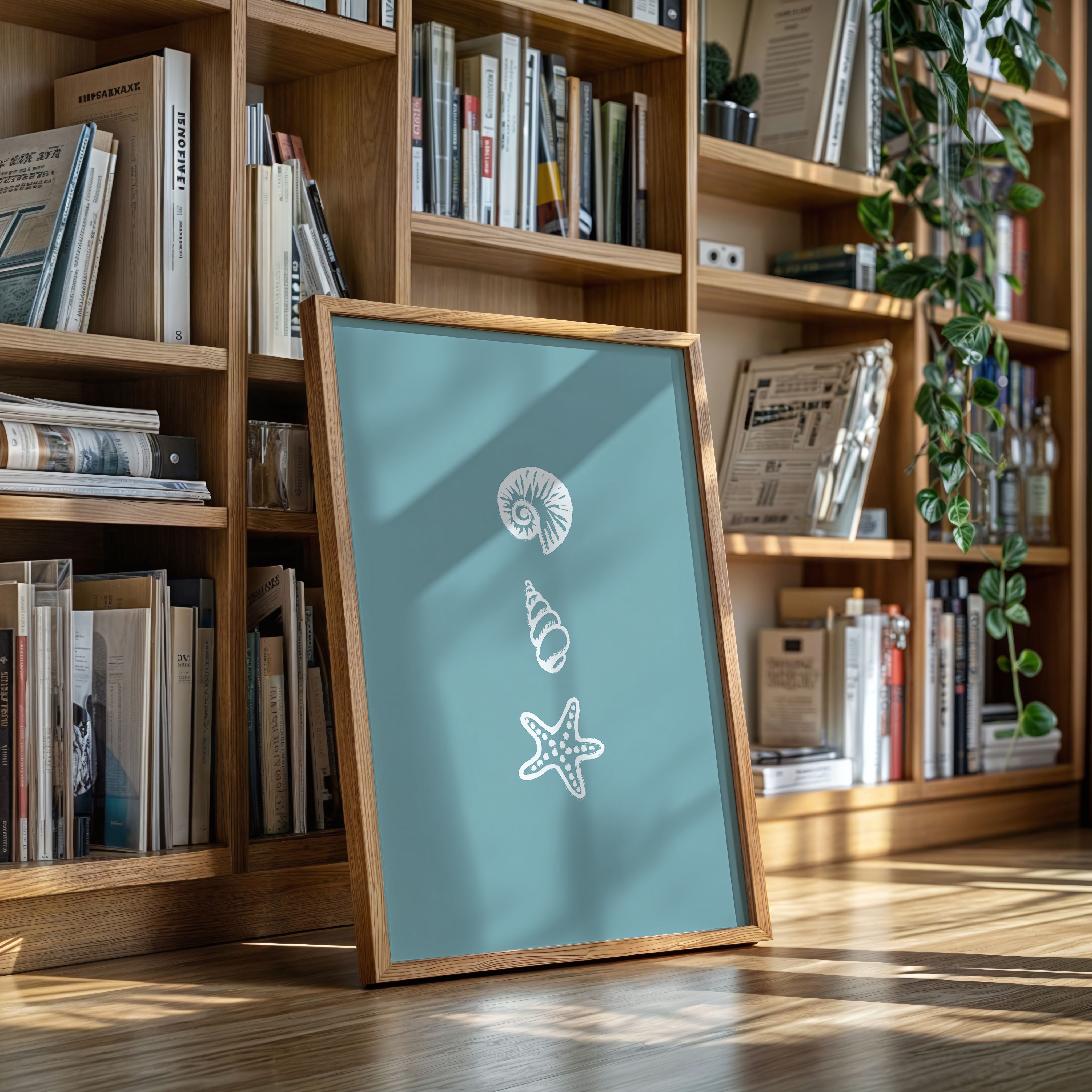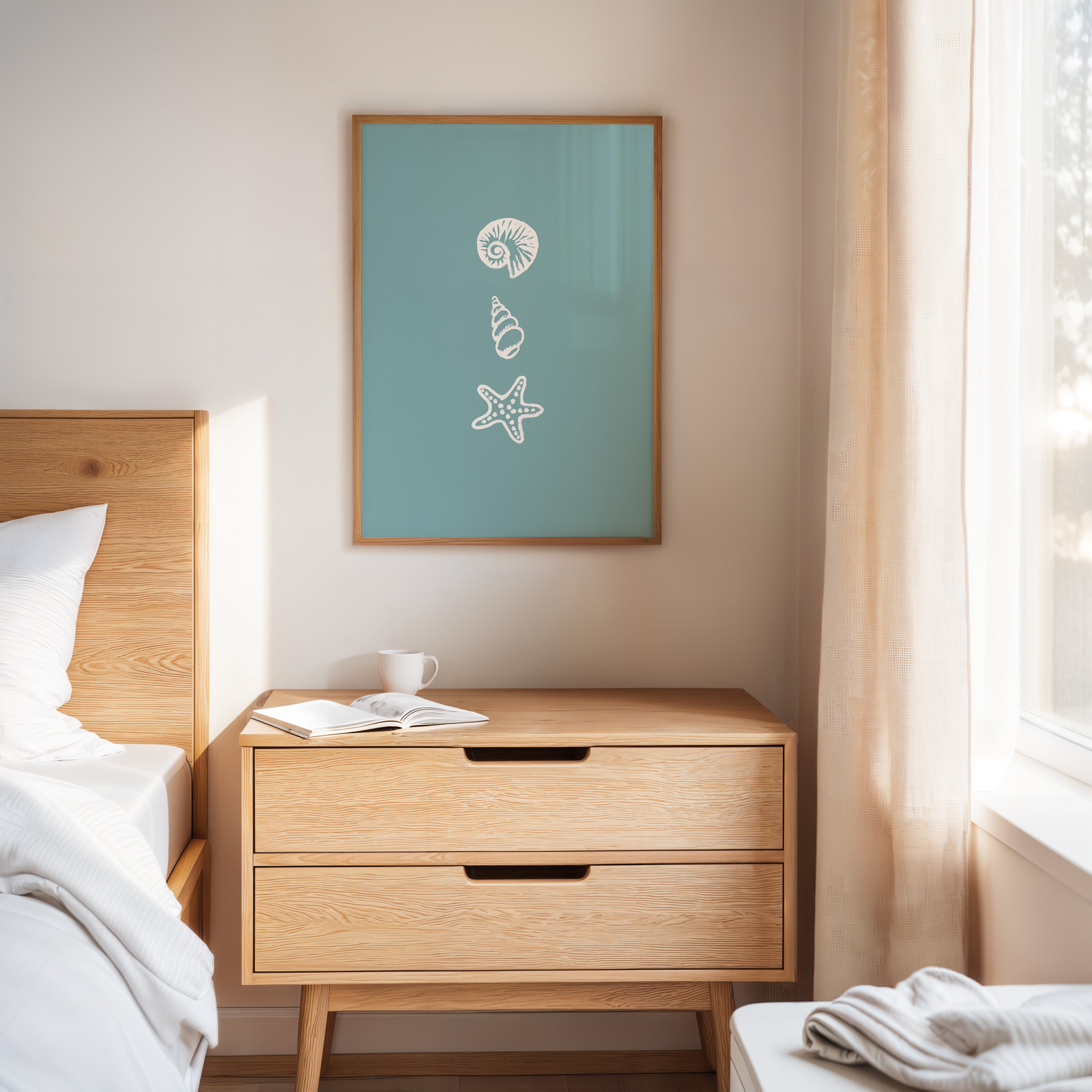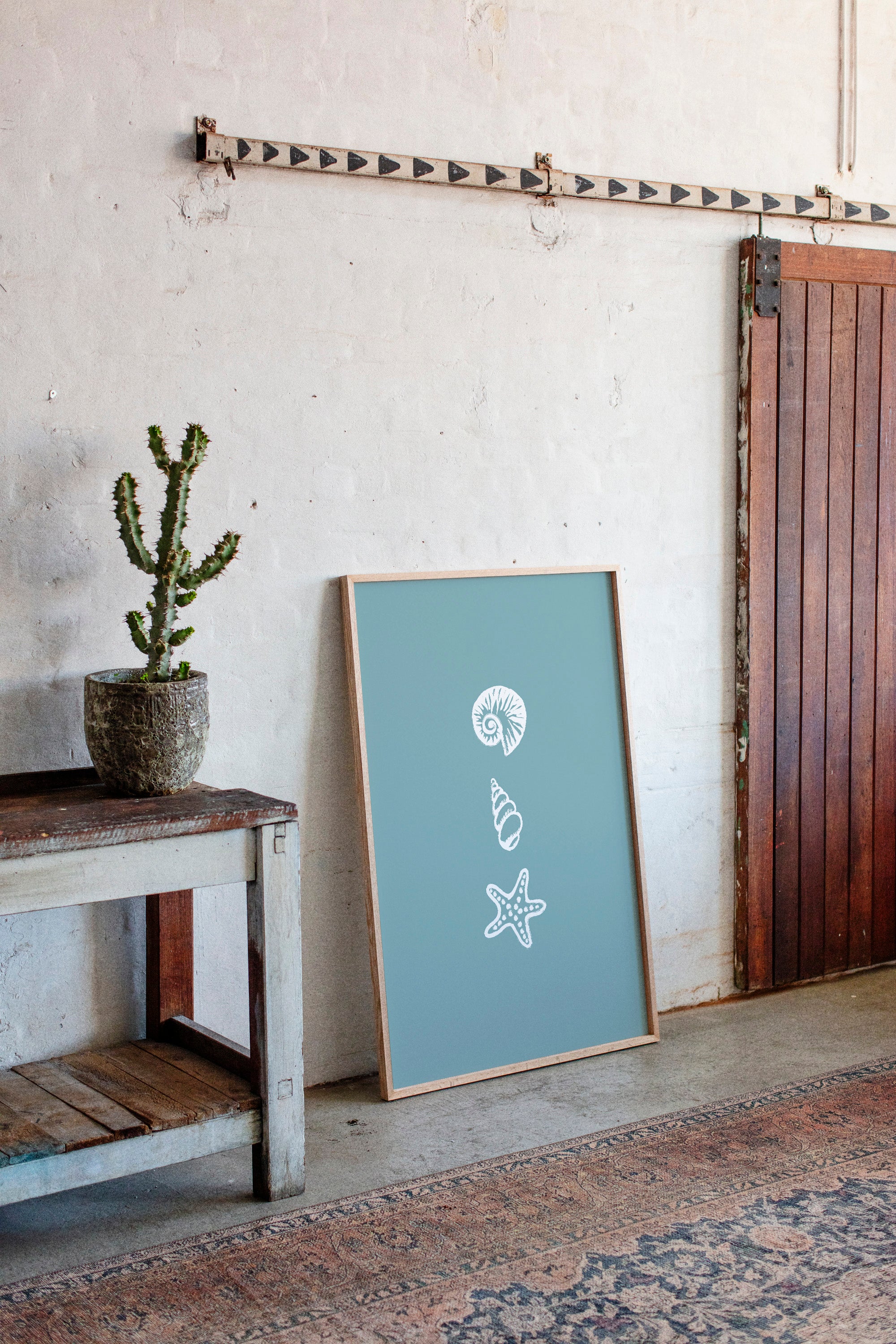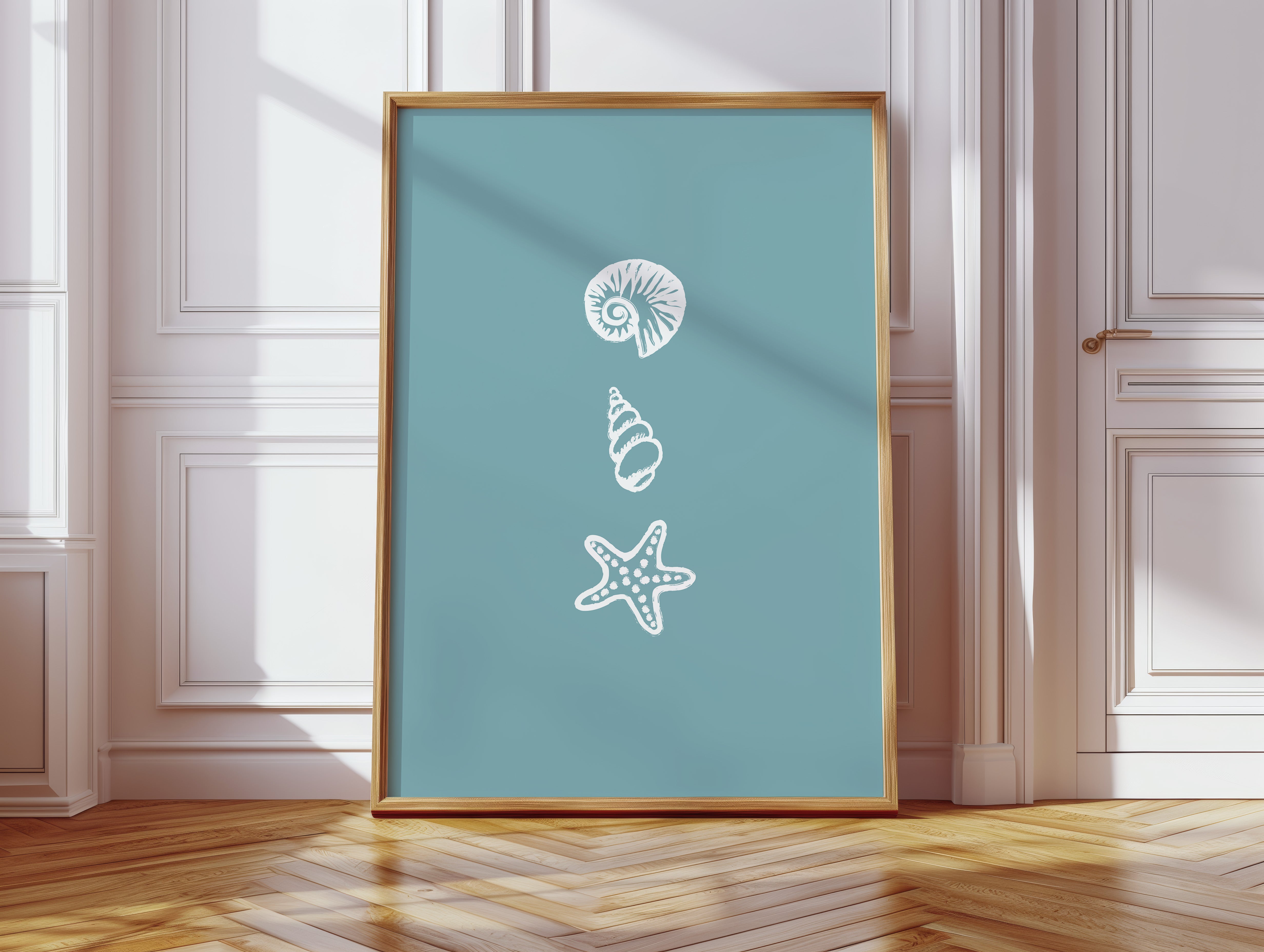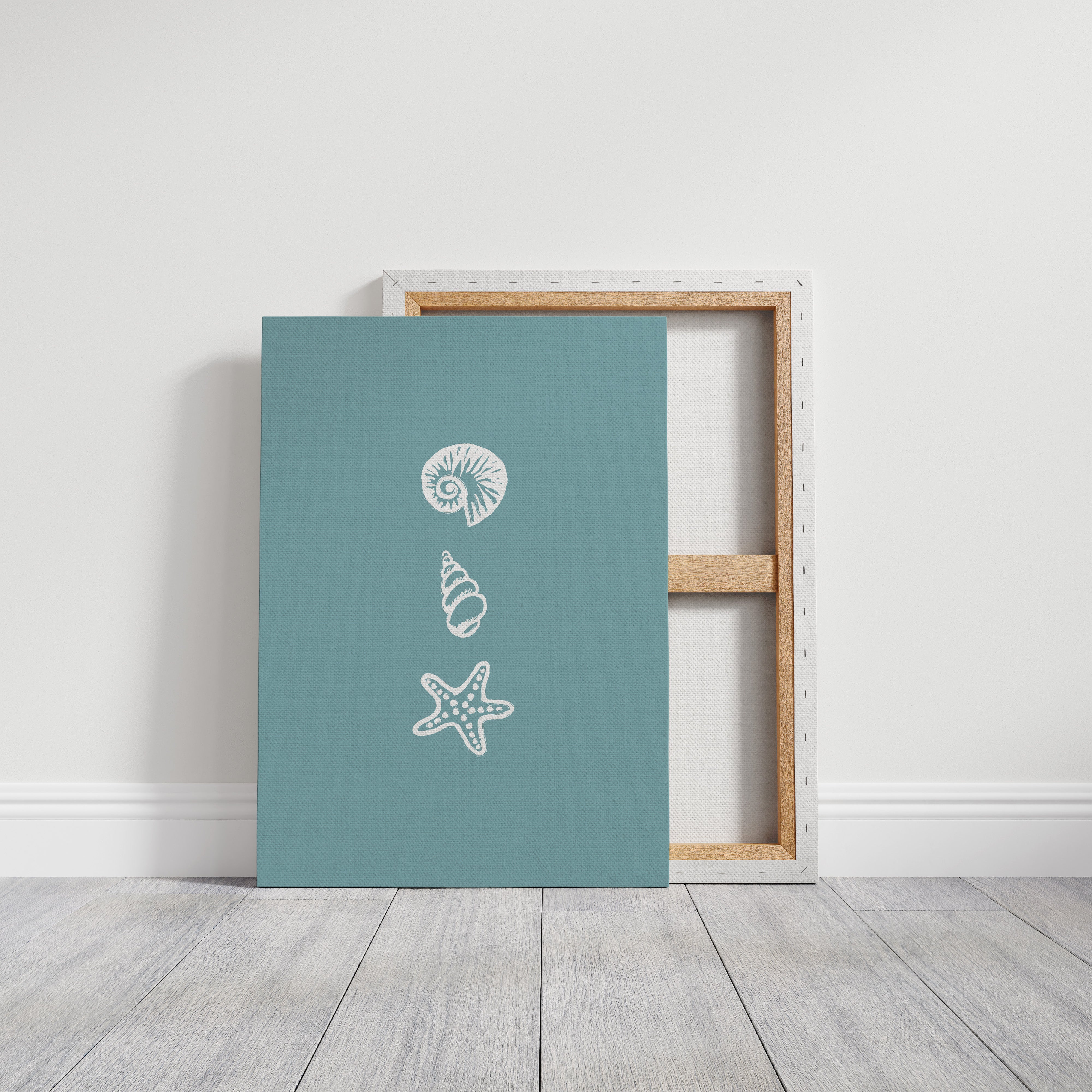 White seashells drift against a serene aqua backdrop, each one a delicate story from the deep. This piece from our Contemporary collection brings minimalist coastal elegance to modern spaces. The pristine nautical elements - a nautilus spiral, conch shell, and starfish - dance in perfect harmony against the soothing seafoam background, creating a sense of peaceful floating meditation. This calming composition would bring a touch of coastal serenity to a bathroom, bedroom, or any space seeking that perfect balance of modern simplicity and oceanic charm. Let these timeless maritime symbols remind you of peaceful days by the sea.