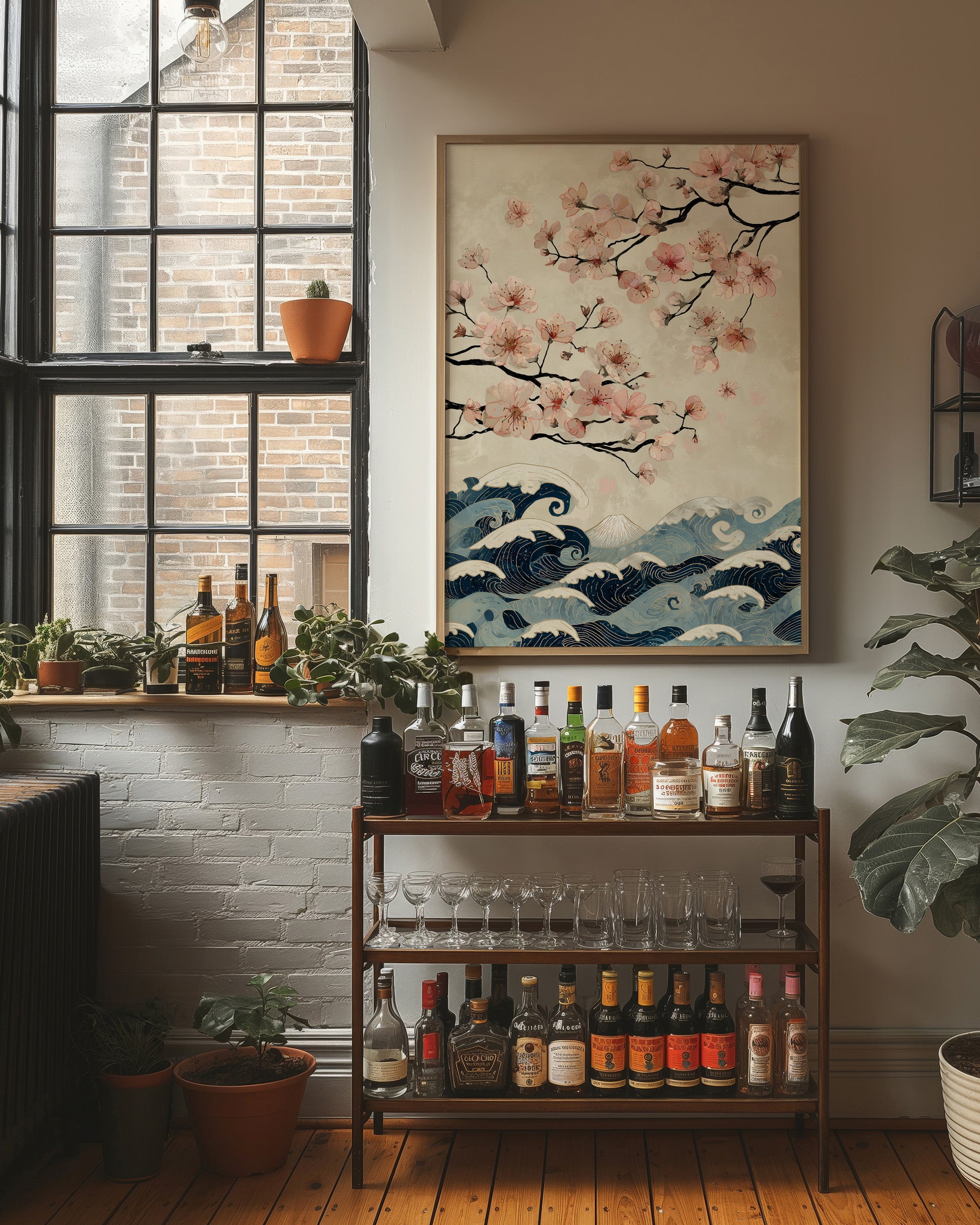 Delicate pink cherry blossoms dance above turbulent indigo waves, creating a stunning contrast between gentle spring and wild sea. The composition marries traditional Japanese artistry with contemporary styling, as graceful branches stretch across a misty background while stylized waves curl and foam below. This piece brings together the dynamic energy of crashing waves with the serene beauty of spring flowering trees. This statement piece would transform a reading nook or meditation space into a tranquil sanctuary, offering a perfect balance of movement and peace.