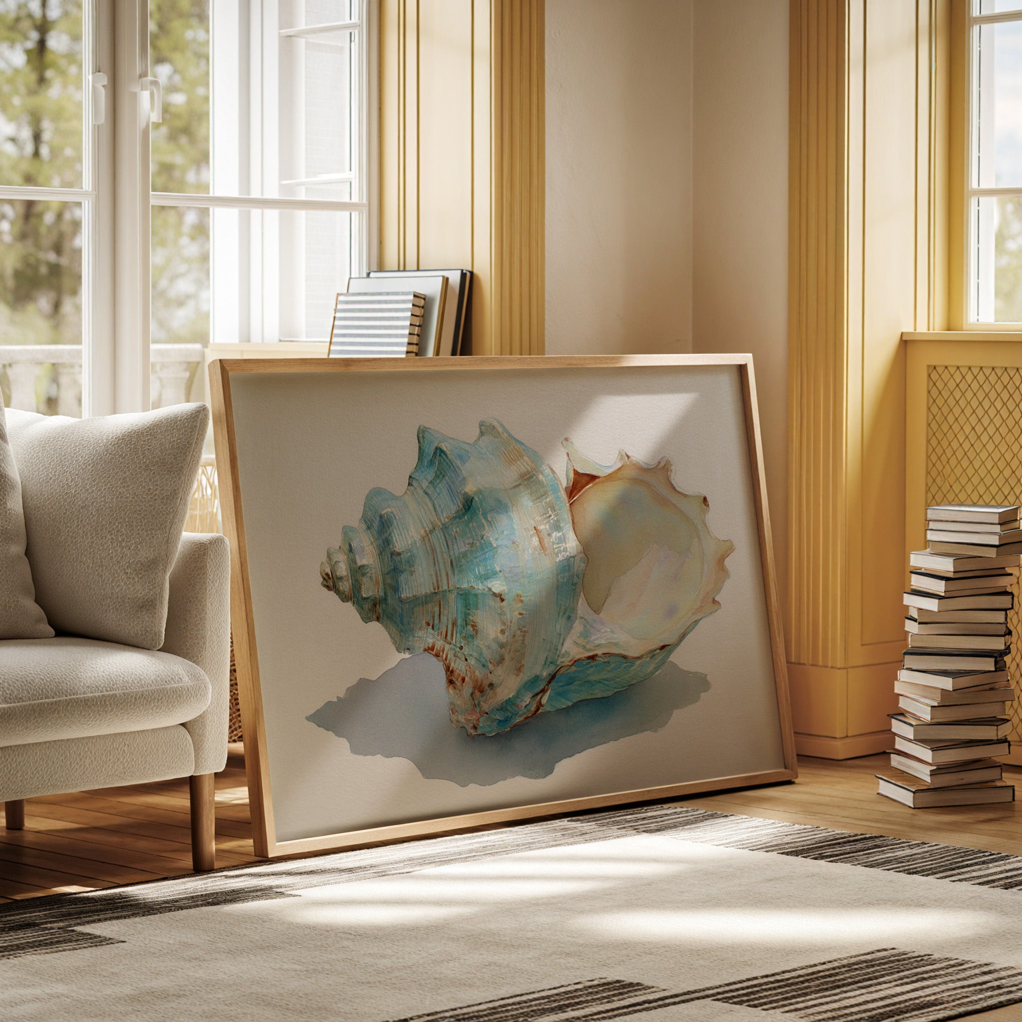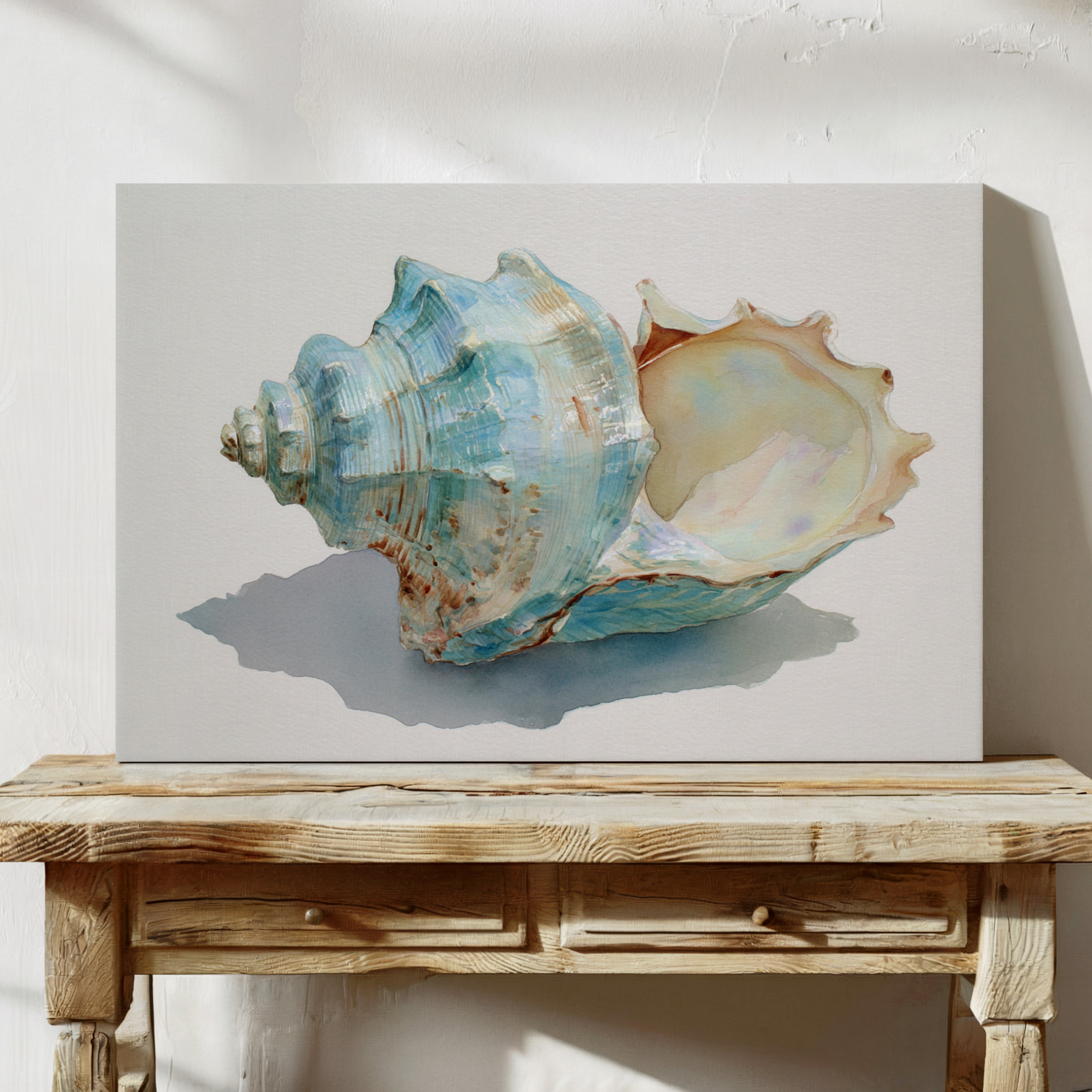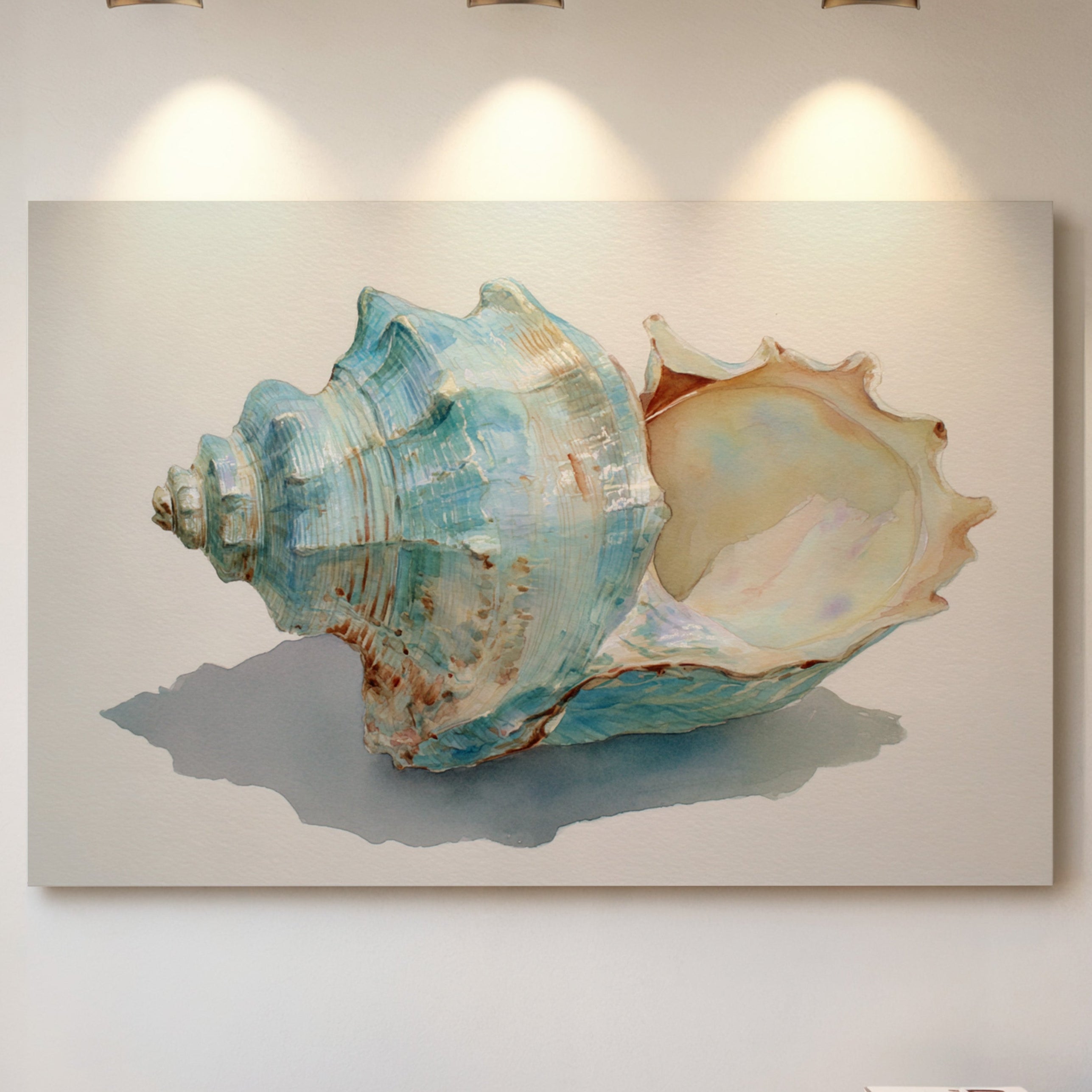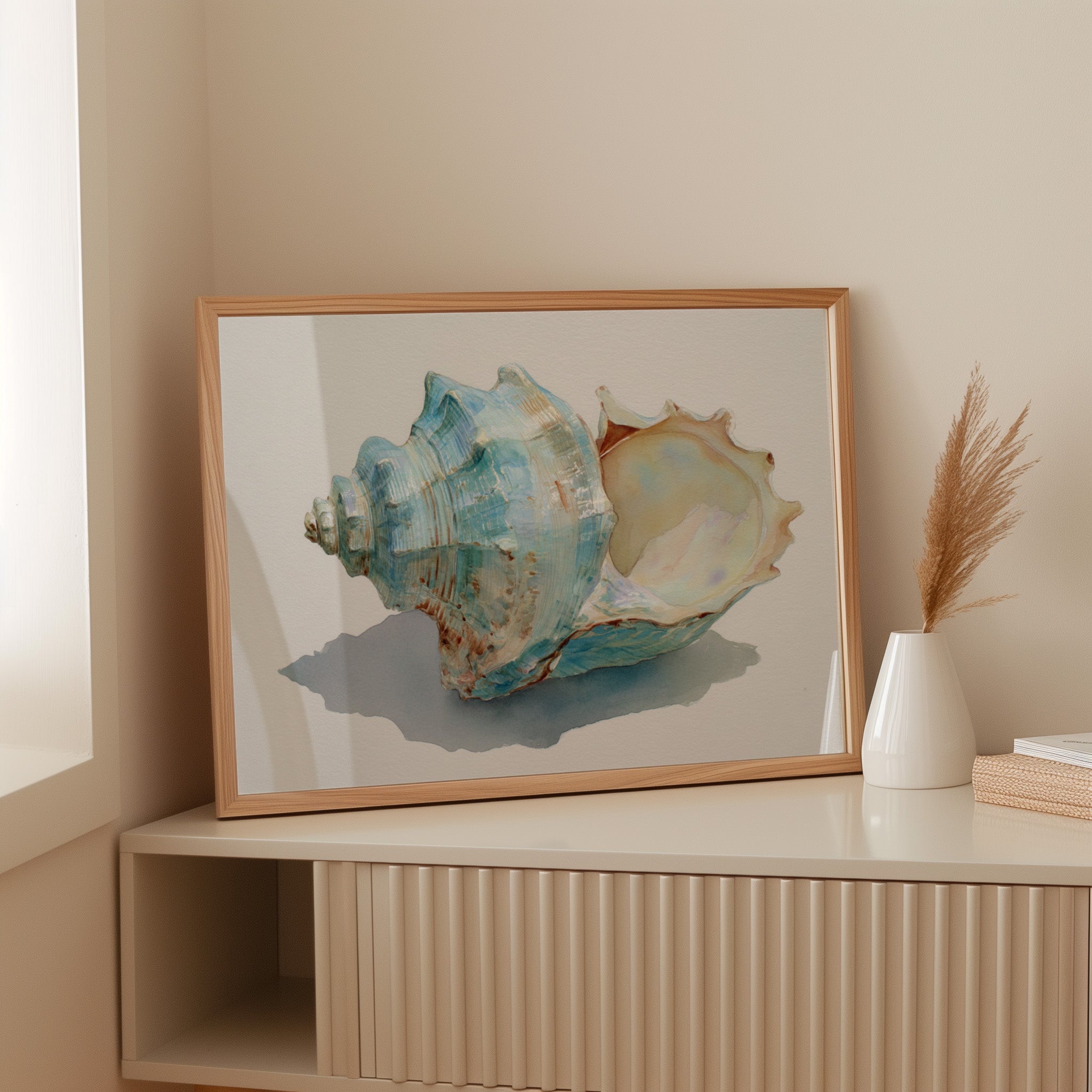 A single conch shell rests in quiet dignity, its aqua blues and creamy whites telling stories of distant tides. Delicate brushstrokes capture the spiral architecture of nature, where translucent layers of watercolor mirror the shell's iridescent surface. The gentle play of light and shadow reveals every ridge and whorl, while a soft gray shadow grounds the piece in contemplative stillness. This serene coastal study brings sophisticated beach house elegance to any space, perfect for creating a sense of calm in a master bathroom or adding organic beauty to a light-filled living room.