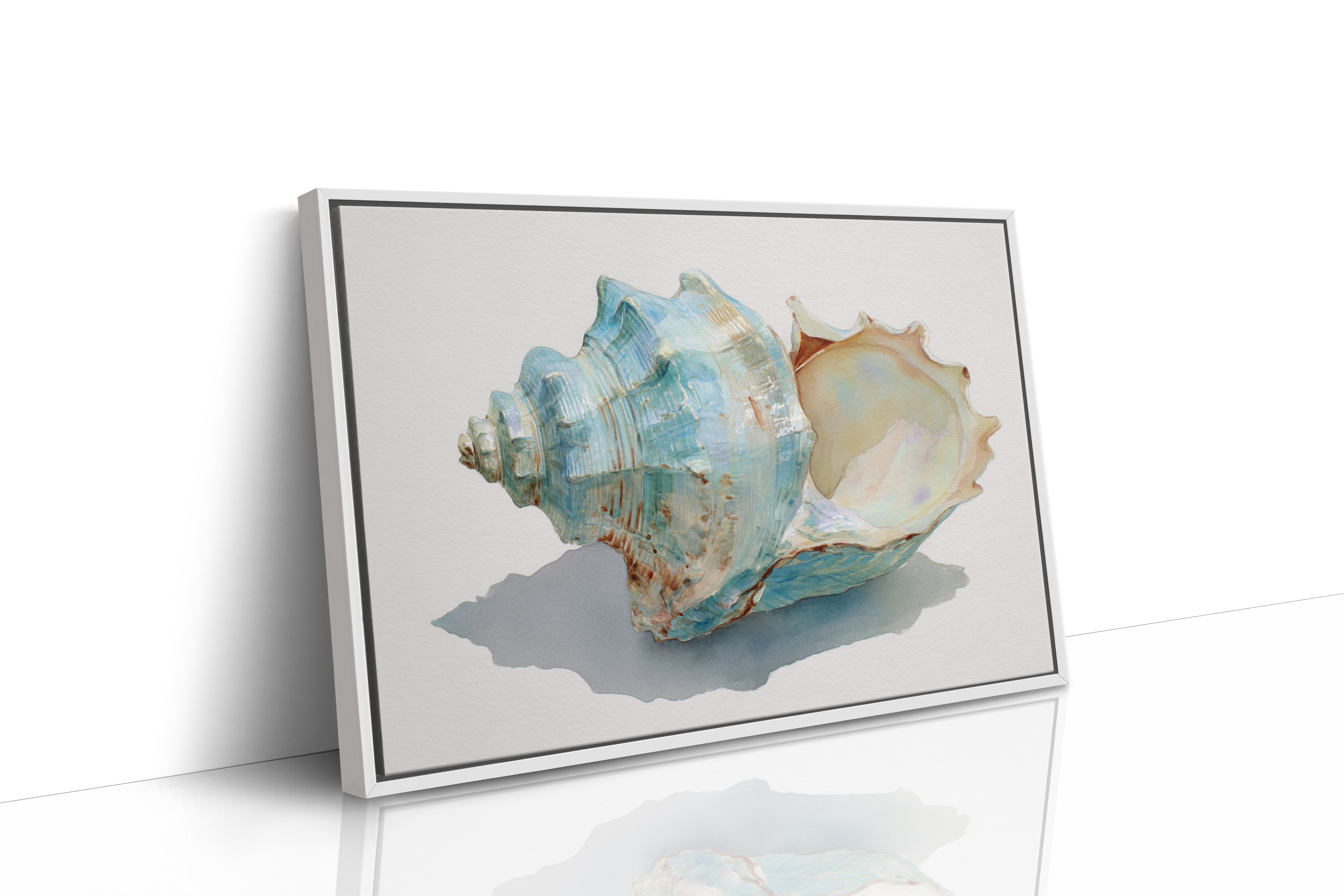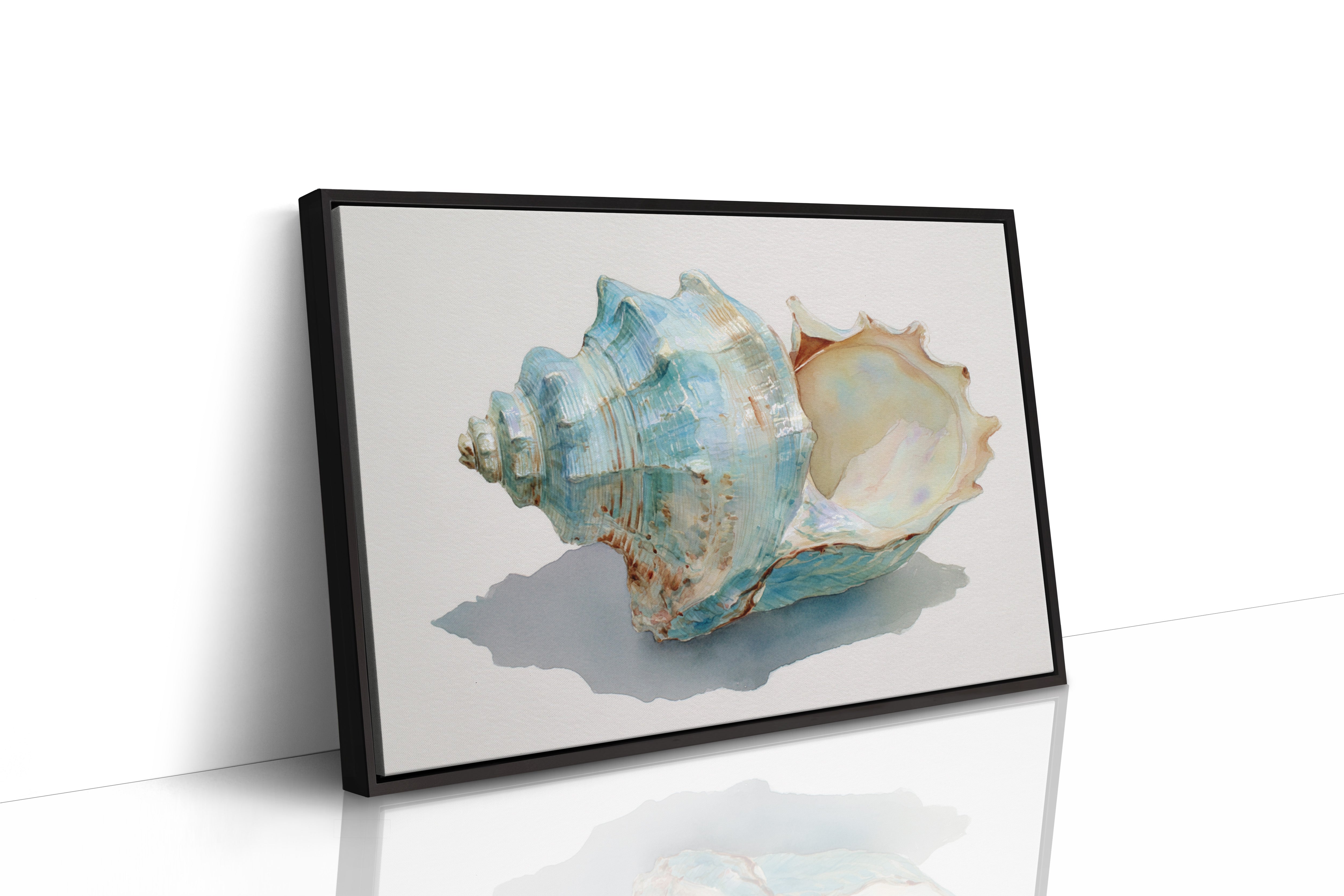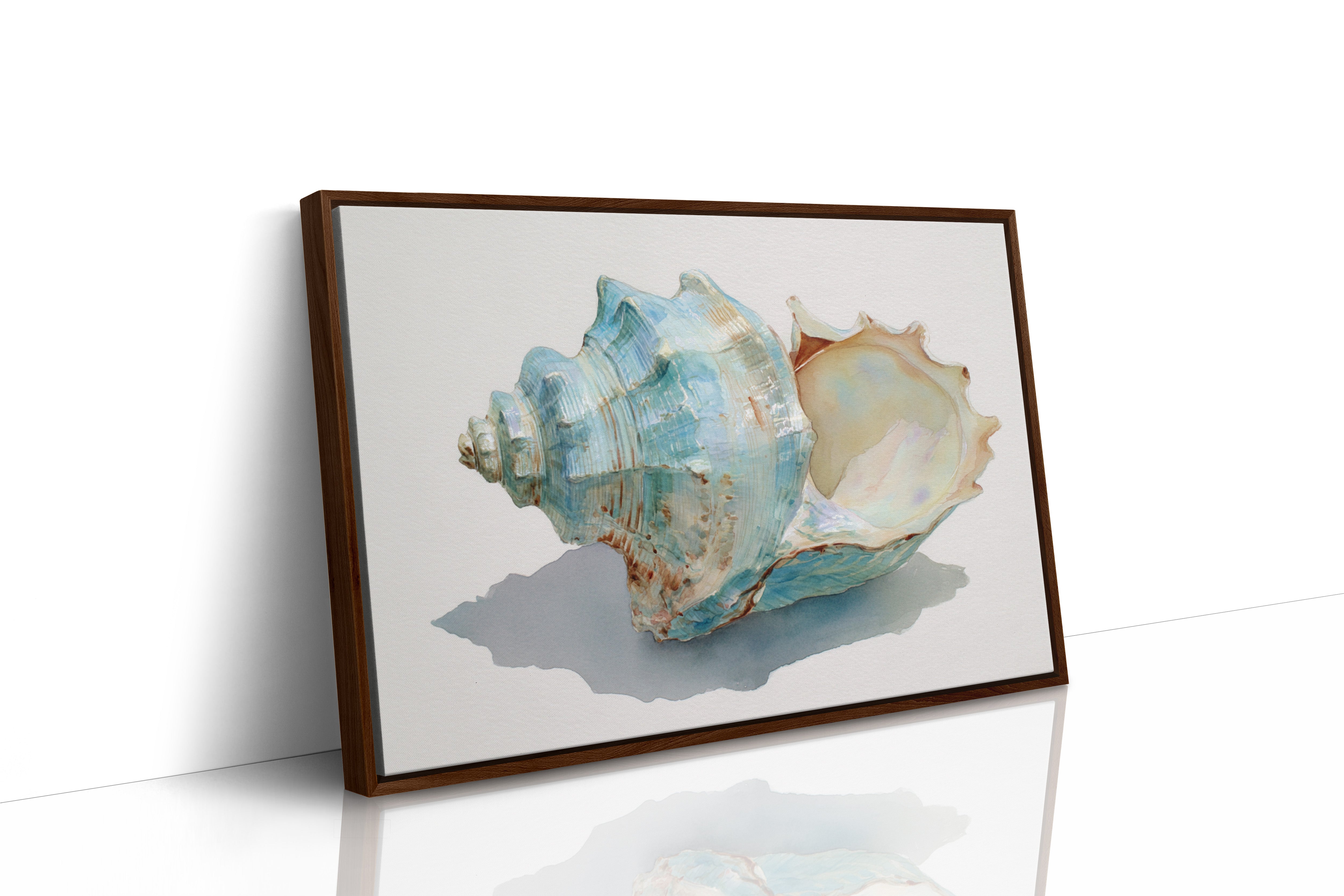 A single conch shell rests in quiet dignity, its aqua blues and creamy whites telling stories of distant tides. Delicate brushstrokes capture the spiral architecture of nature, where translucent layers of watercolor mirror the shell's iridescent surface. The gentle play of light and shadow reveals every ridge and whorl, while a soft gray shadow grounds the piece in contemplative stillness. This serene coastal study brings sophisticated beach house elegance to any space, perfect for creating a sense of calm in a master bathroom or adding organic beauty to a light-filled living room.