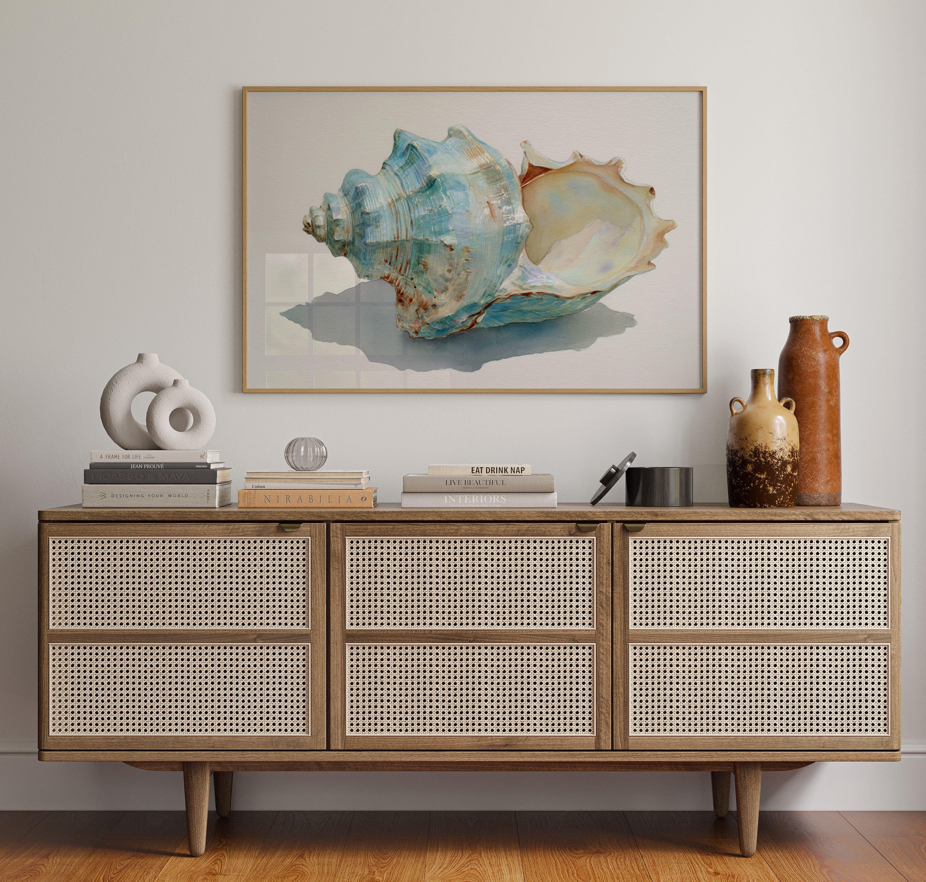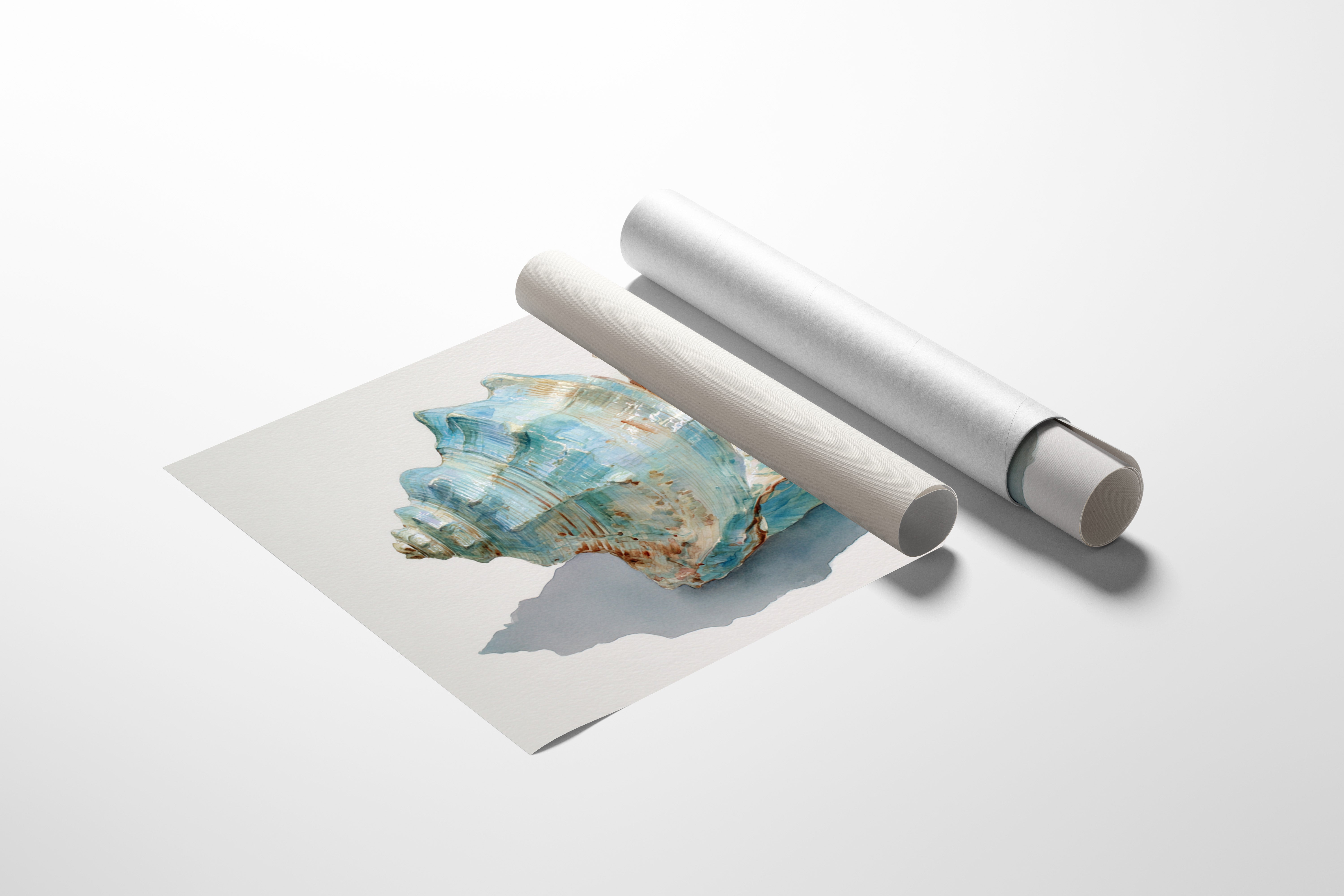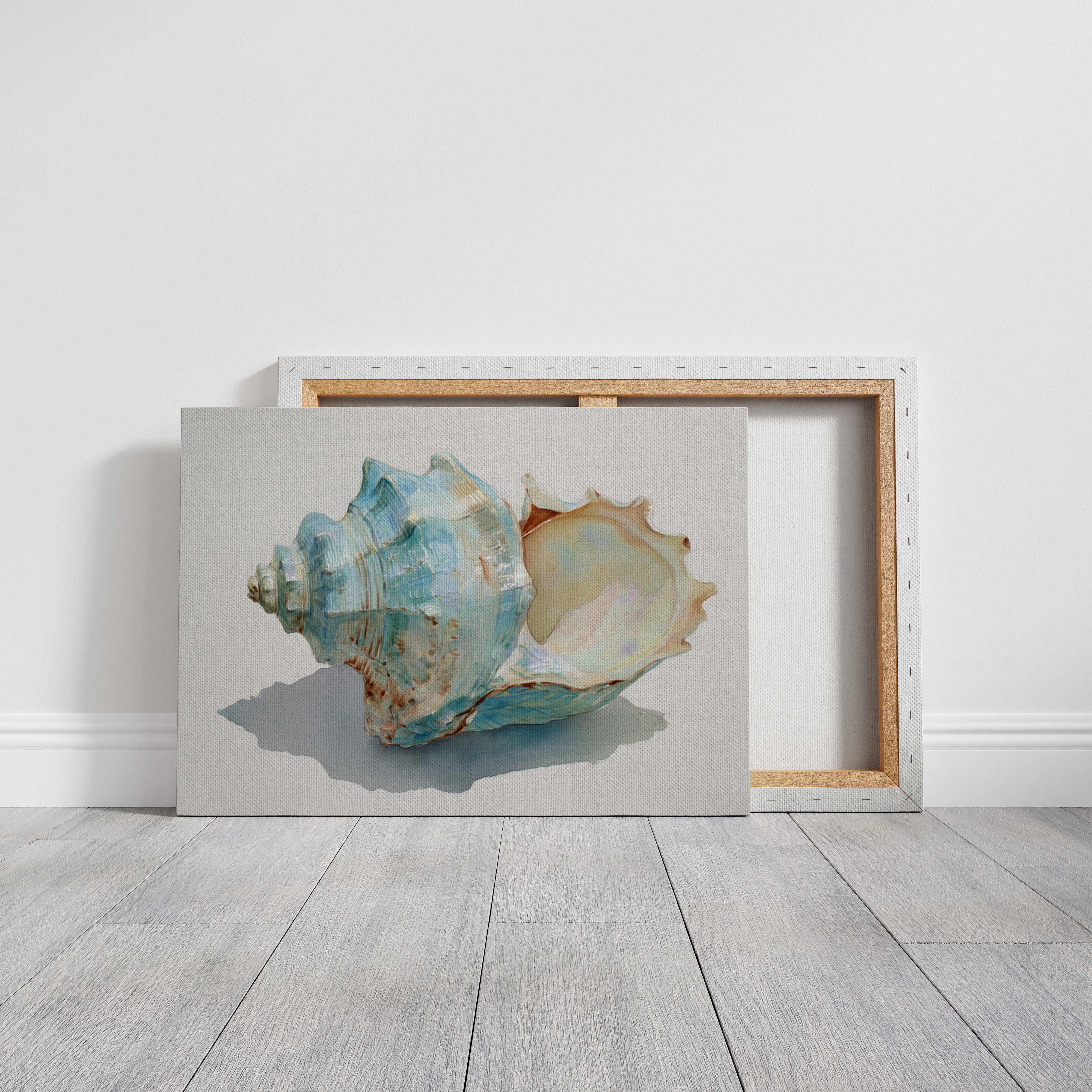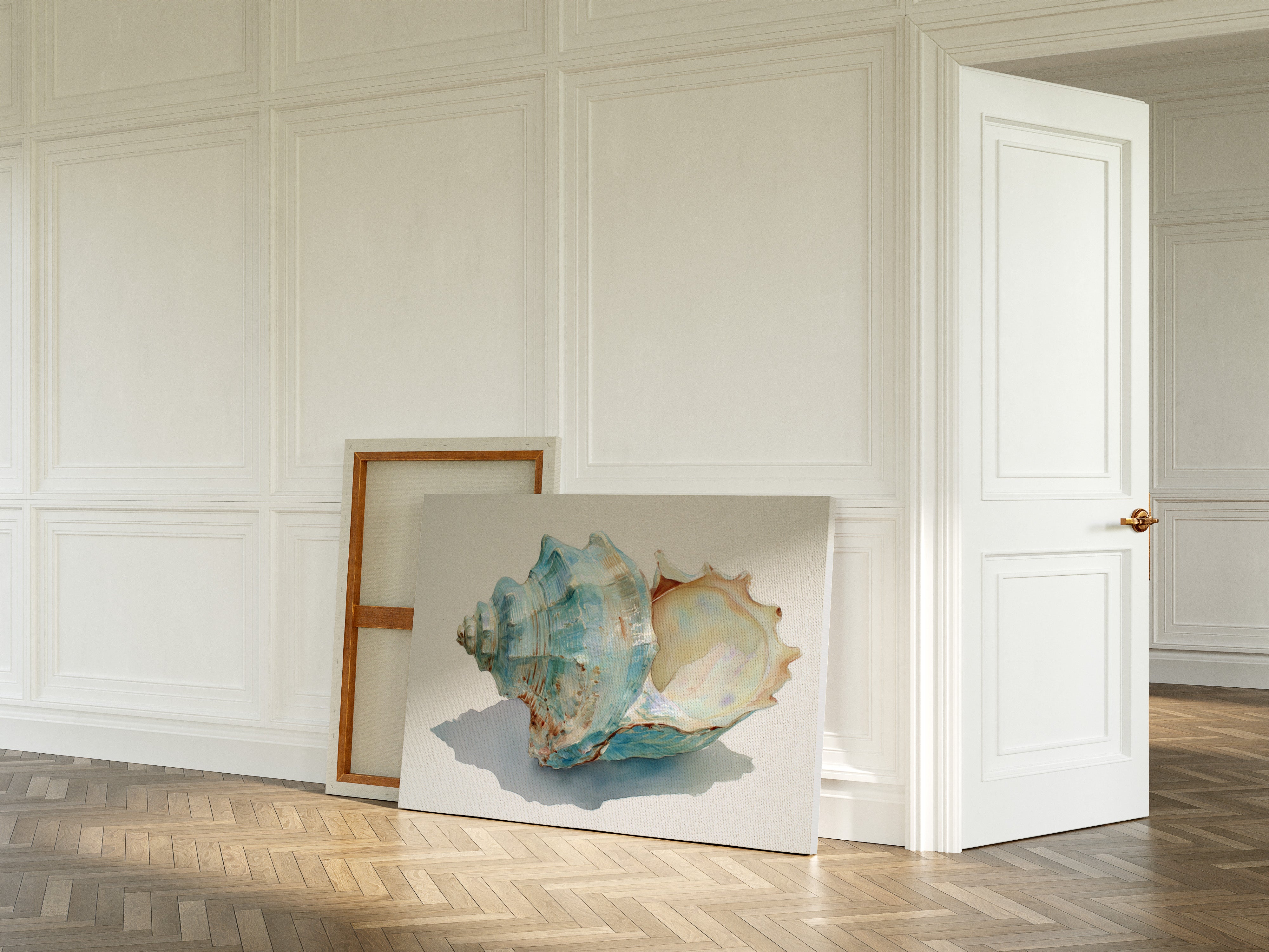 A single conch shell rests in quiet dignity, its aqua blues and creamy whites telling stories of distant tides. Delicate brushstrokes capture the spiral architecture of nature, where translucent layers of watercolor mirror the shell's iridescent surface. The gentle play of light and shadow reveals every ridge and whorl, while a soft gray shadow grounds the piece in contemplative stillness. This serene coastal study brings sophisticated beach house elegance to any space, perfect for creating a sense of calm in a master bathroom or adding organic beauty to a light-filled living room.