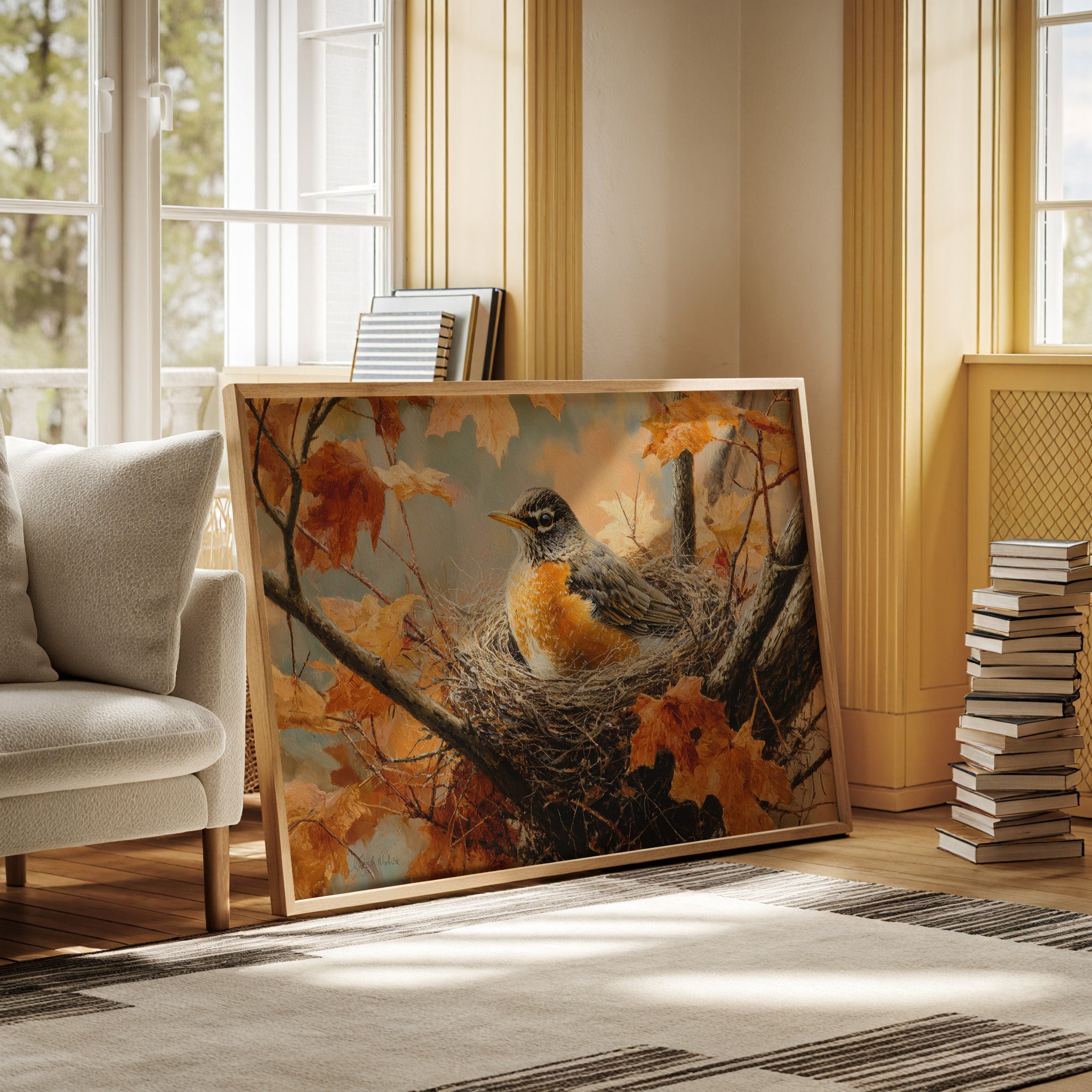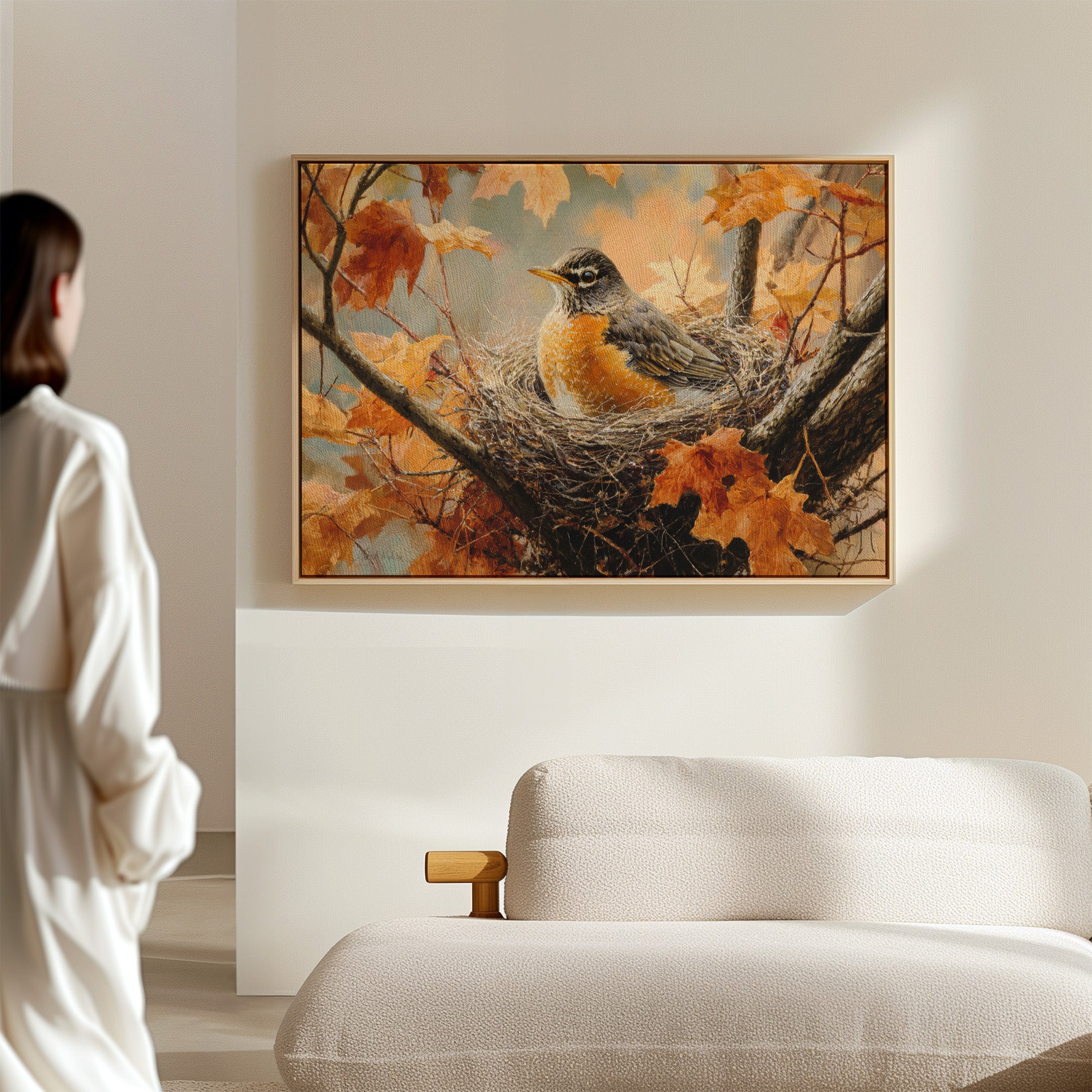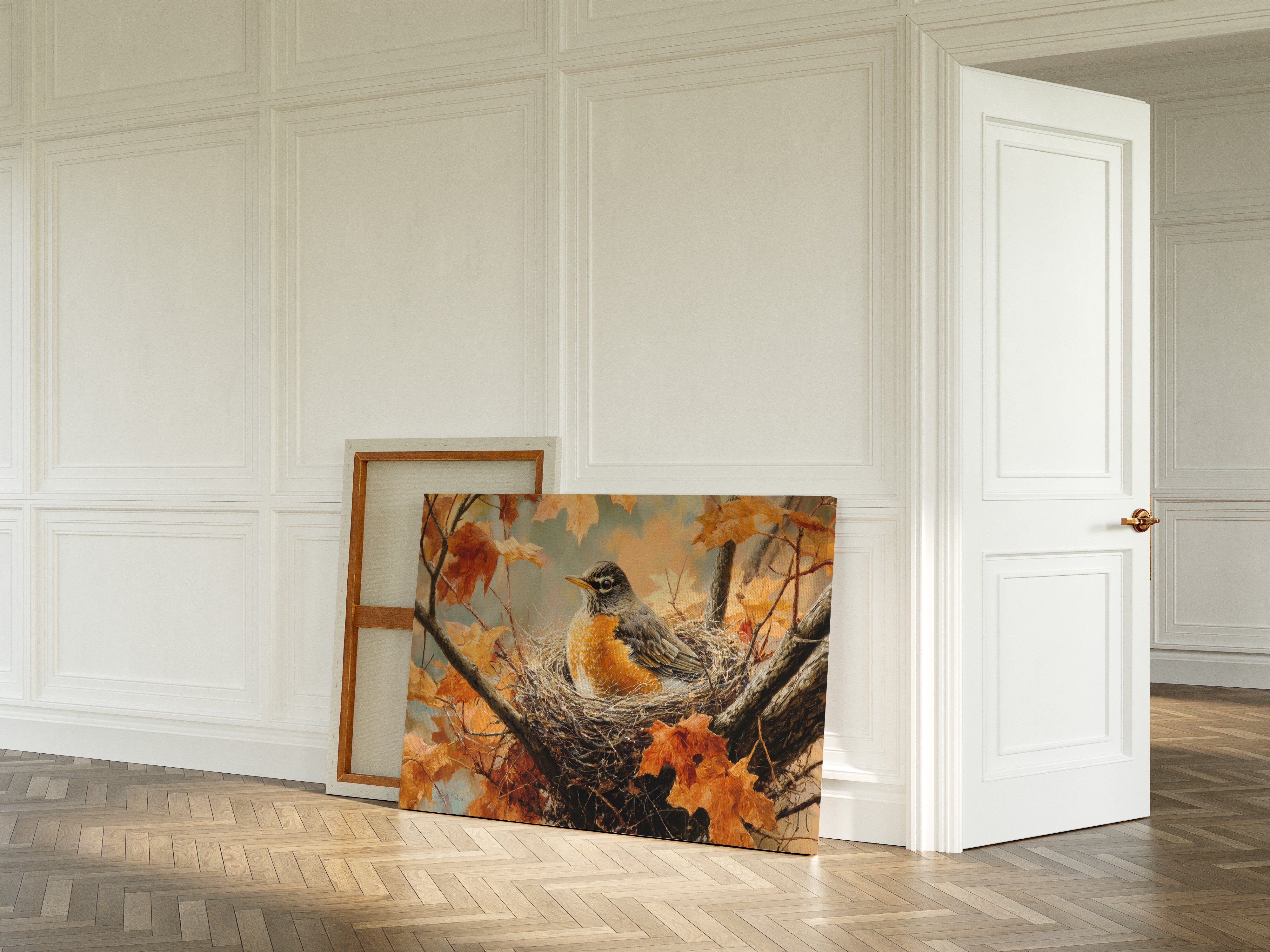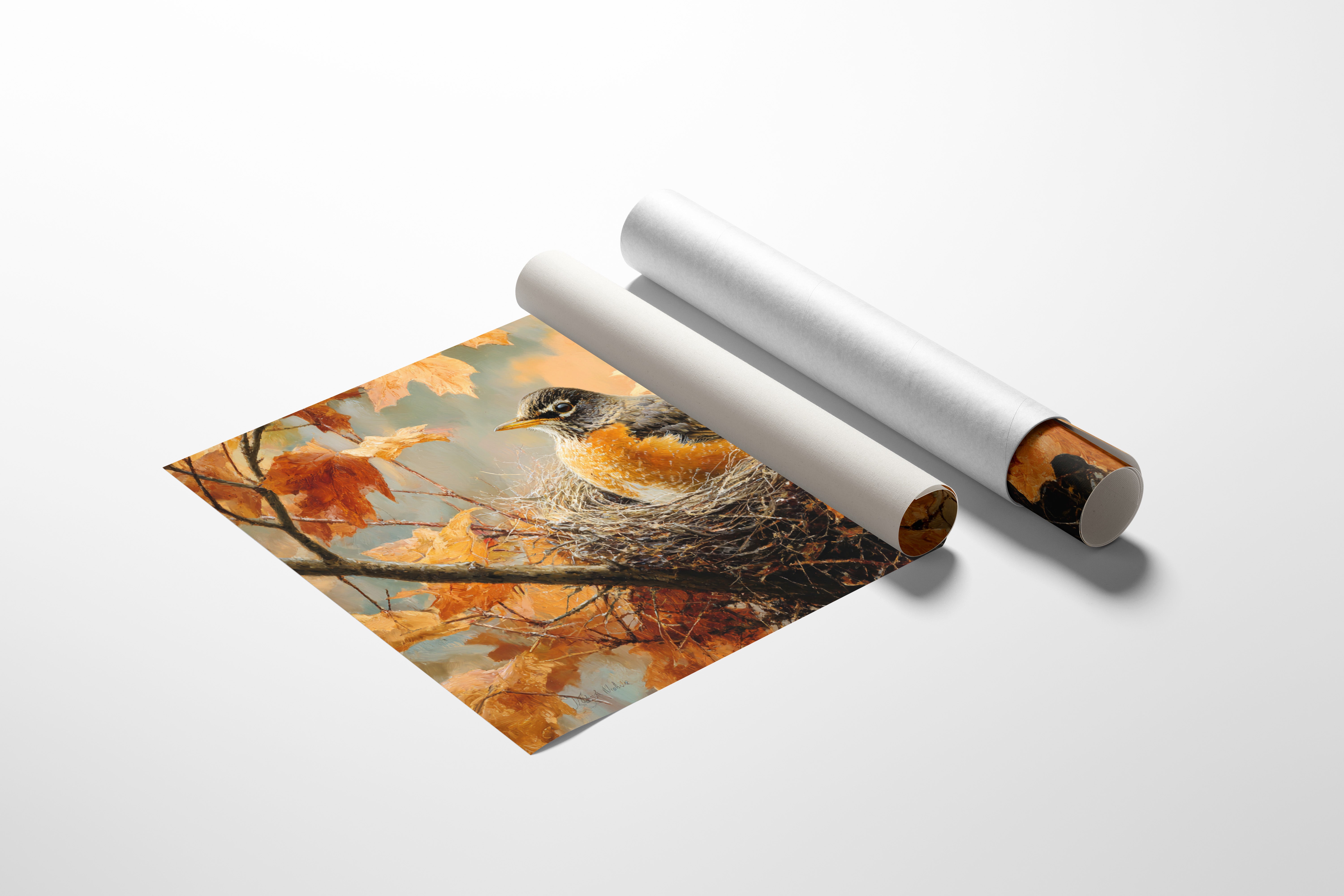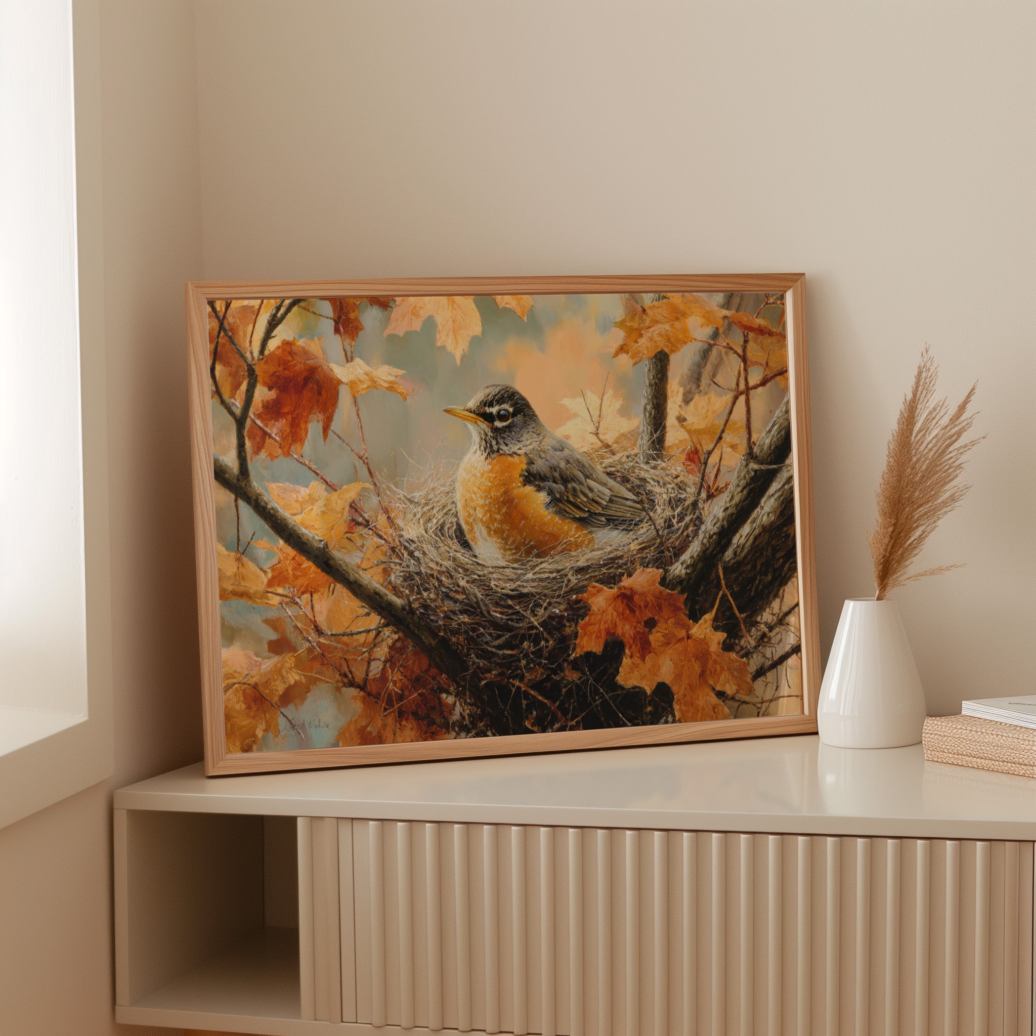 Nestled among autumn's golden embrace, a robin settles into its carefully woven sanctuary. The maple leaves dance around in shades of amber and rust, creating nature's own stained glass window. Rich brushstrokes capture every detail, from the bird's alert gaze to its distinctive orange breast feathers, while fallen leaves frame this intimate moment like nature's own photograph. The soft, dreamy background suggests early morning light filtering through the canopy, creating a peaceful meditation on home and seasonal change. This piece would bring natural warmth to a reading nook or living space where quiet contemplation is cherished.