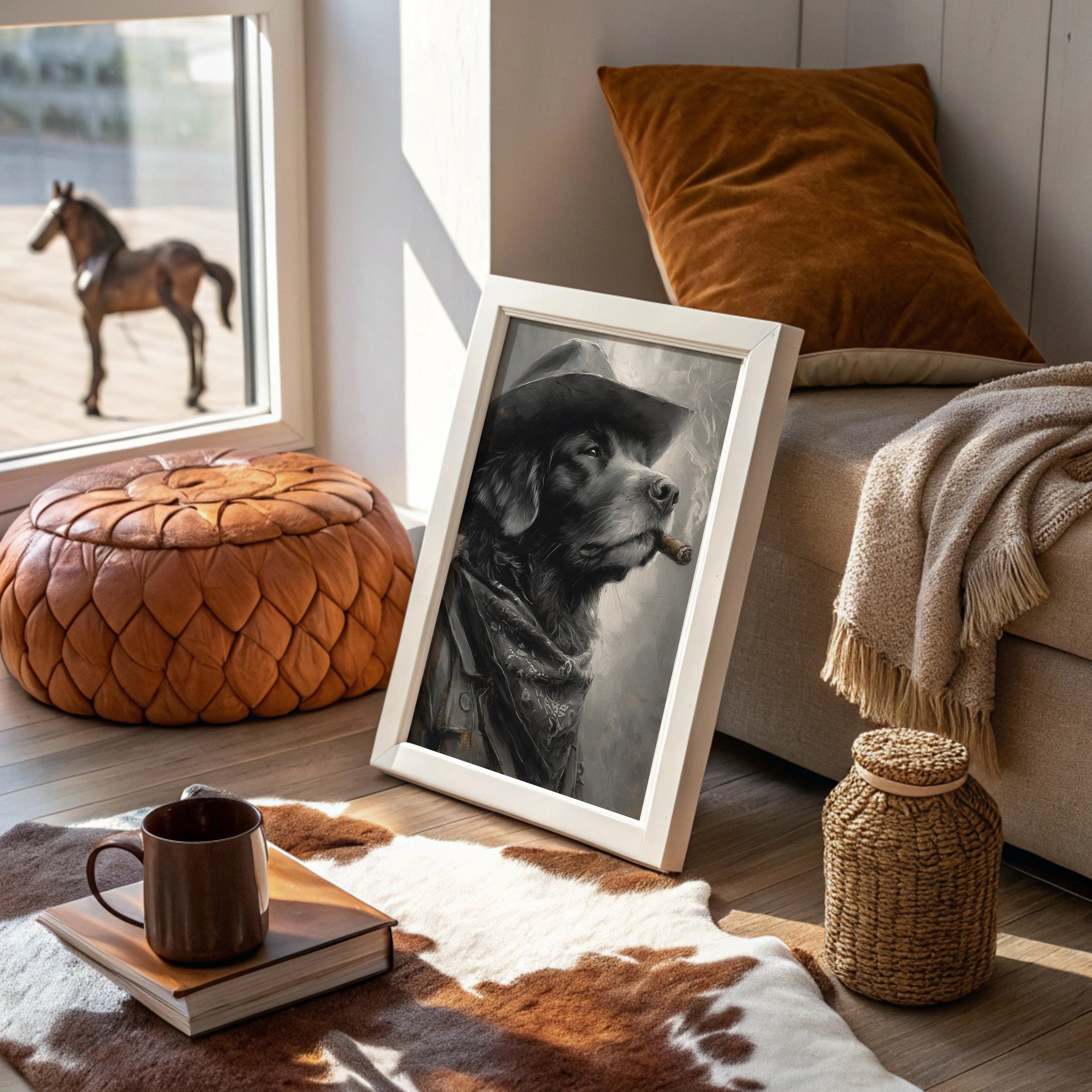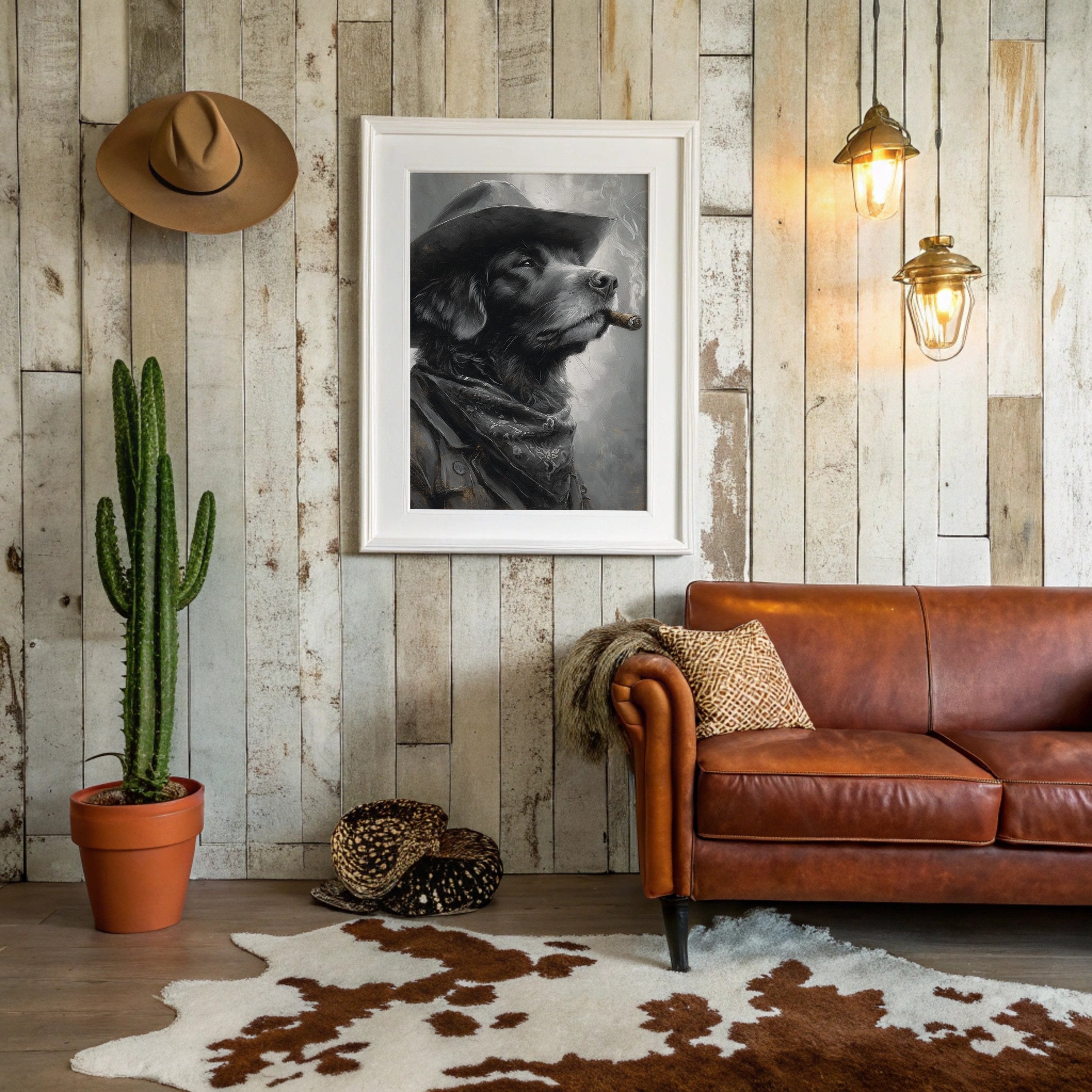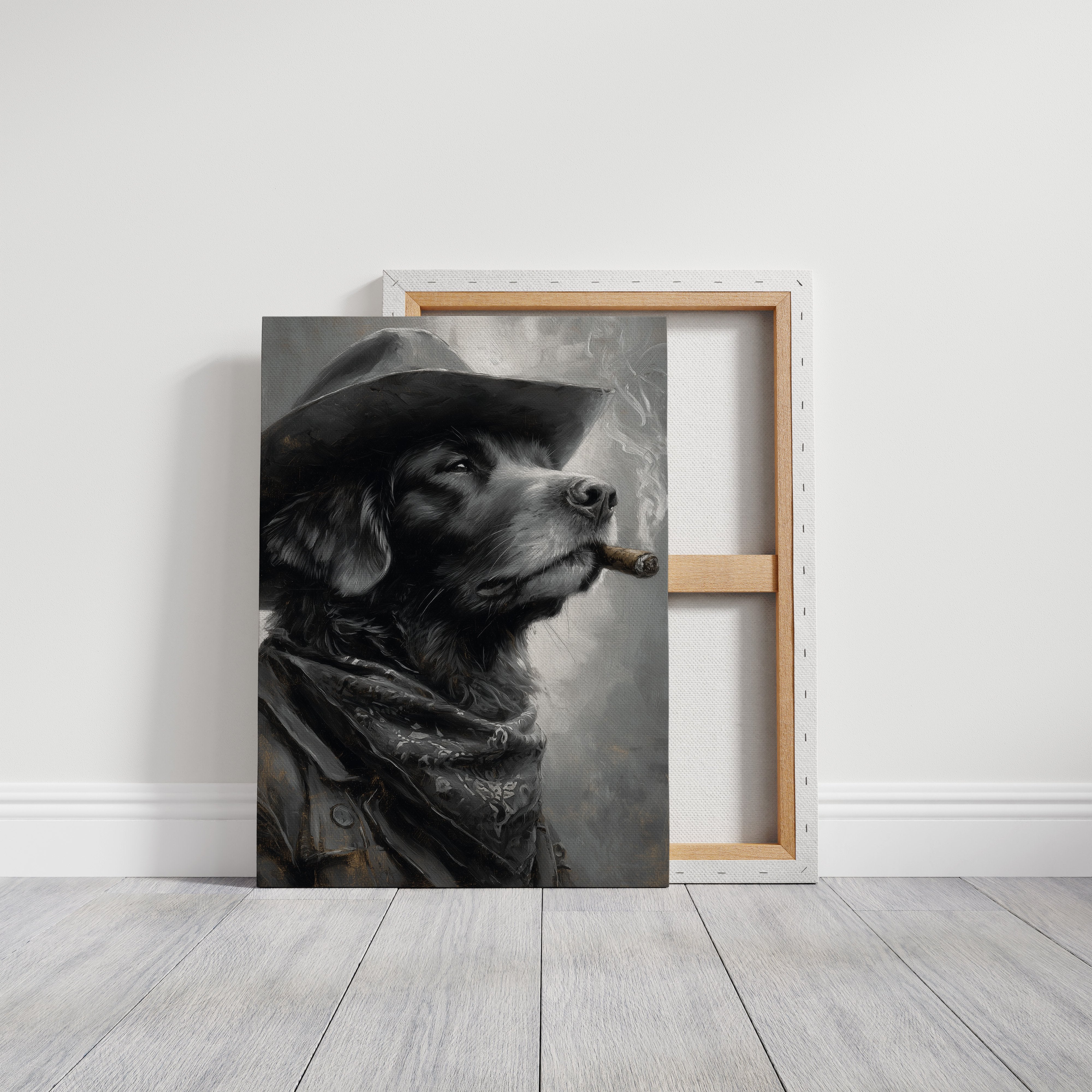 Smoke curls lazily from the cigar clenched in this contemplative canine's jaw, his eyes holding stories from another time. The monochromatic portrait captures a dignified character dressed in vintage cowboy attire, complete with bandana and weathered hat, exuding a rugged charm against the moody backdrop. This playful yet sophisticated piece brings character and conversation to any space.