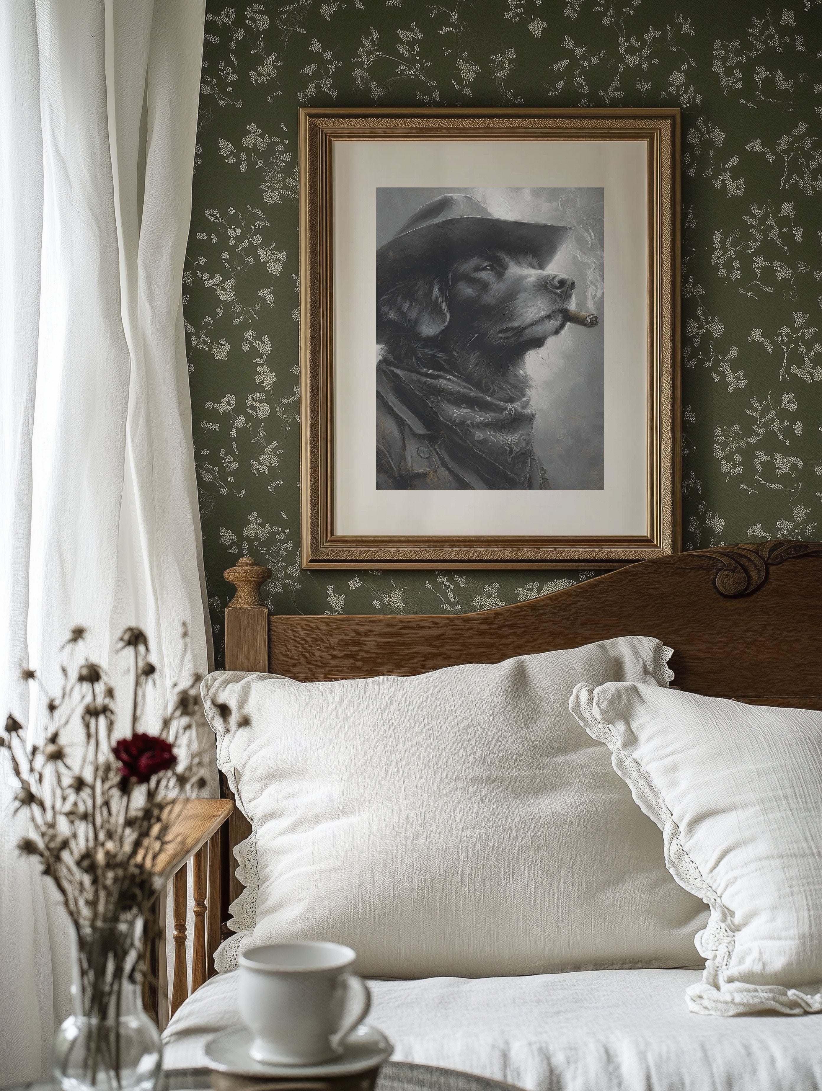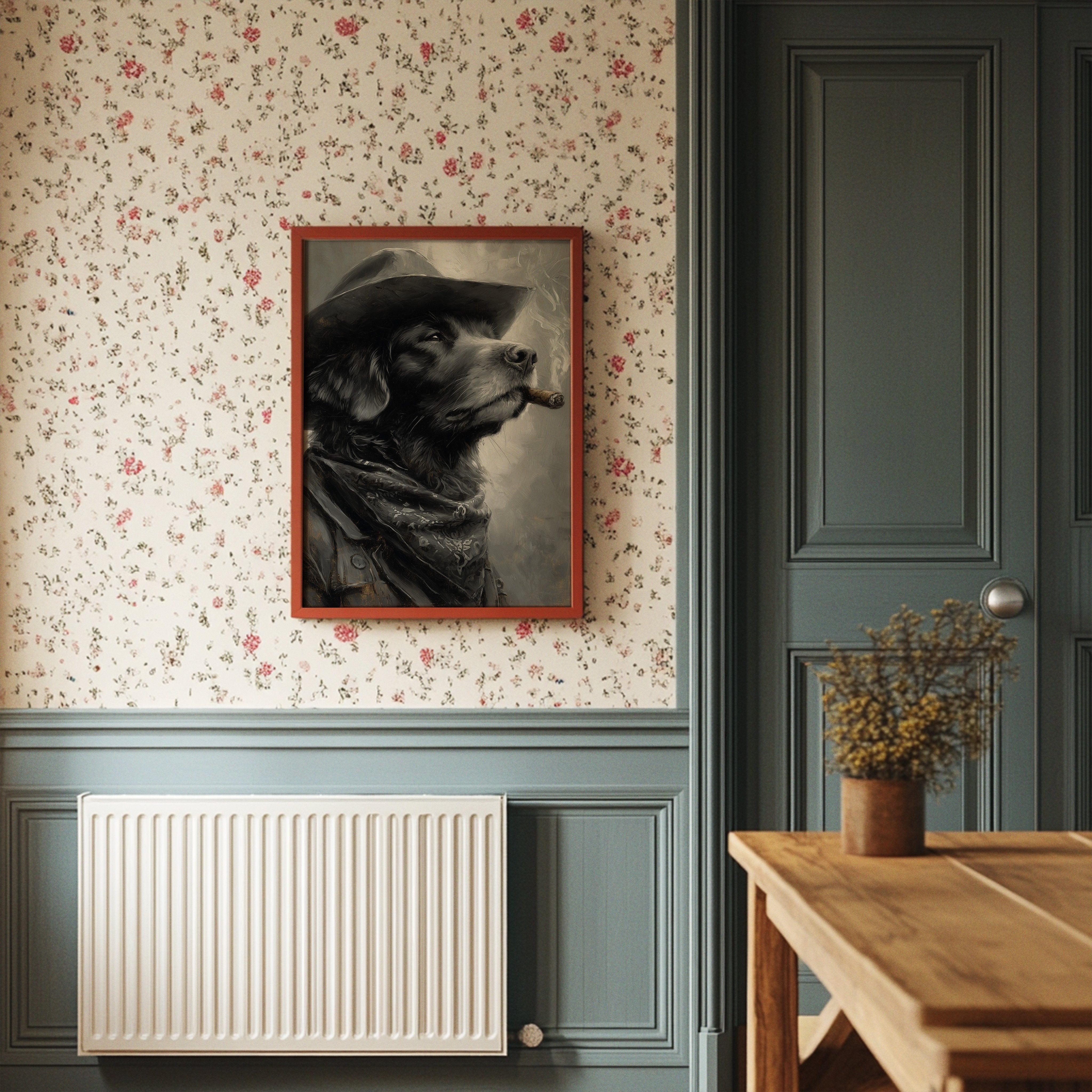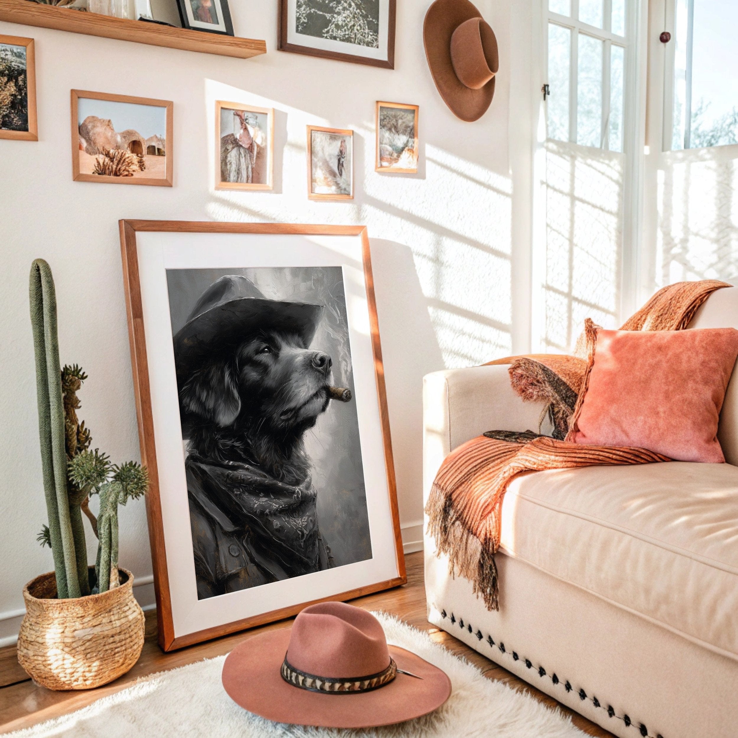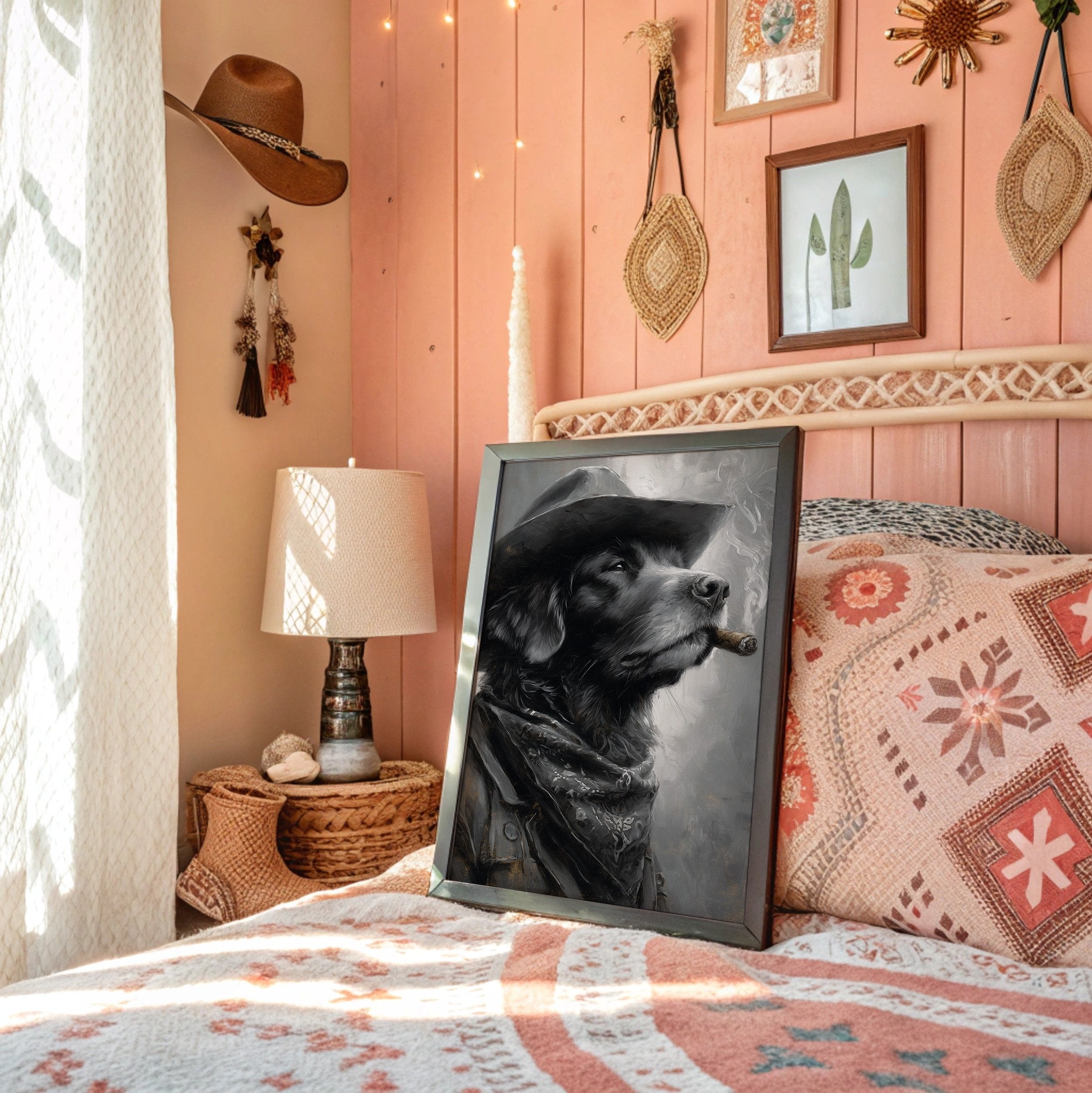 Smoke curls lazily from the cigar clenched in this contemplative canine's jaw, his eyes holding stories from another time. The monochromatic portrait captures a dignified character dressed in vintage cowboy attire, complete with bandana and weathered hat, exuding a rugged charm against the moody backdrop. This playful yet sophisticated piece brings character and conversation to any space.