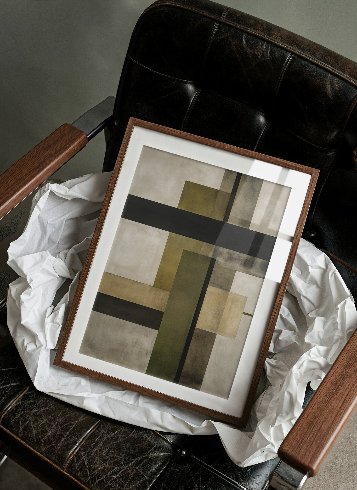 Afternoon light streams through industrial windows, casting geometric shadows across a thoughtfully curated space. The bold abstract artwork in olive and charcoal tones creates a sophisticated focal point, while earthen pottery and trailing plants soften the urban edges. A carefully arranged bar cart displays amber and crystal bottles like a modern still life, speaking to moments of leisure and connection in this contemporary sanctuary.
