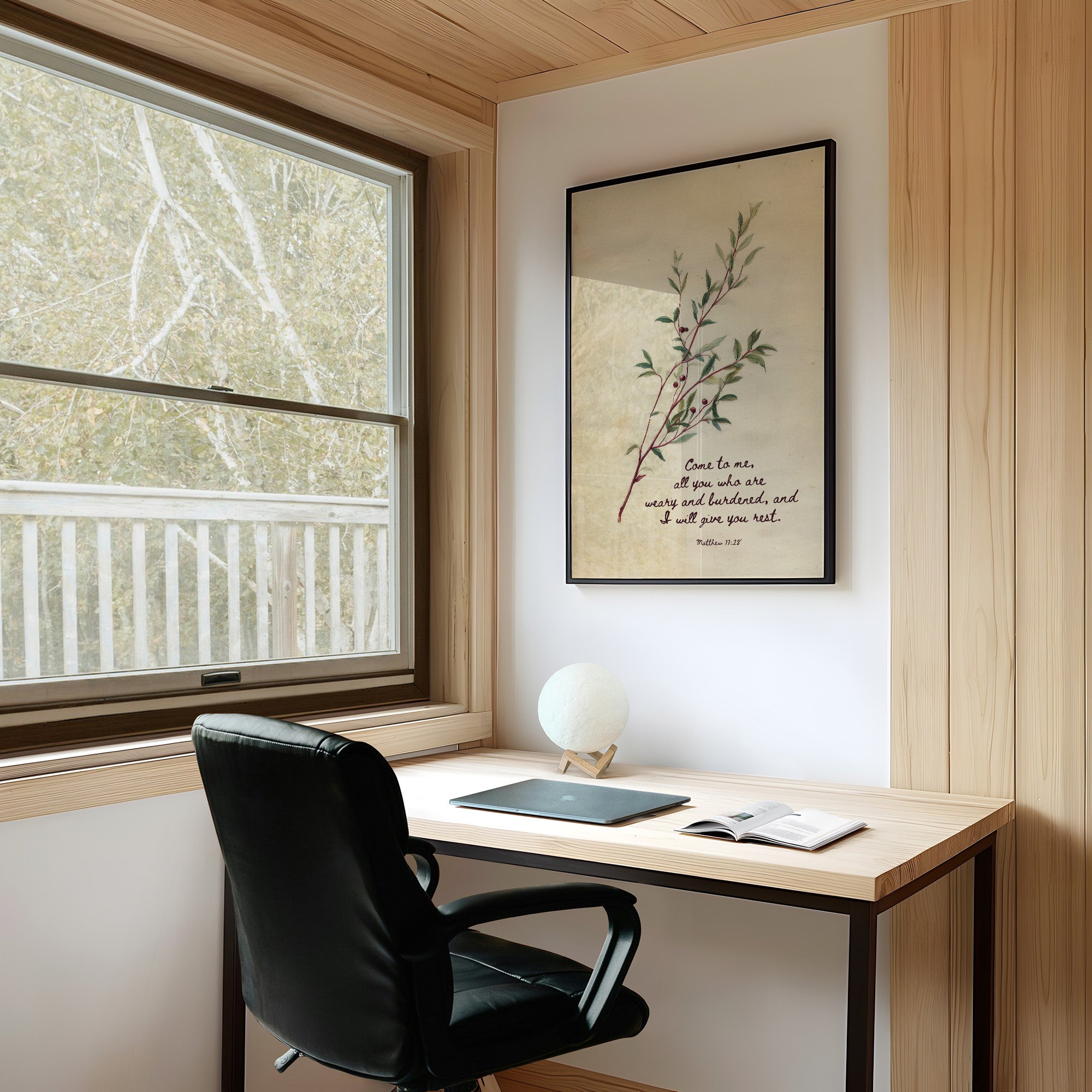 Morning light casts a gentle glow on a handwritten verse nestled beneath delicate botanical illustration. The weathered parchment, adorned with slender stems and verdant leaves, carries the comforting promise of Matthew 11:28 across its cream-colored surface. The rustic wooden table beneath creates a sanctuary of calm, where thoughtful reflection mingles with natural simplicity.