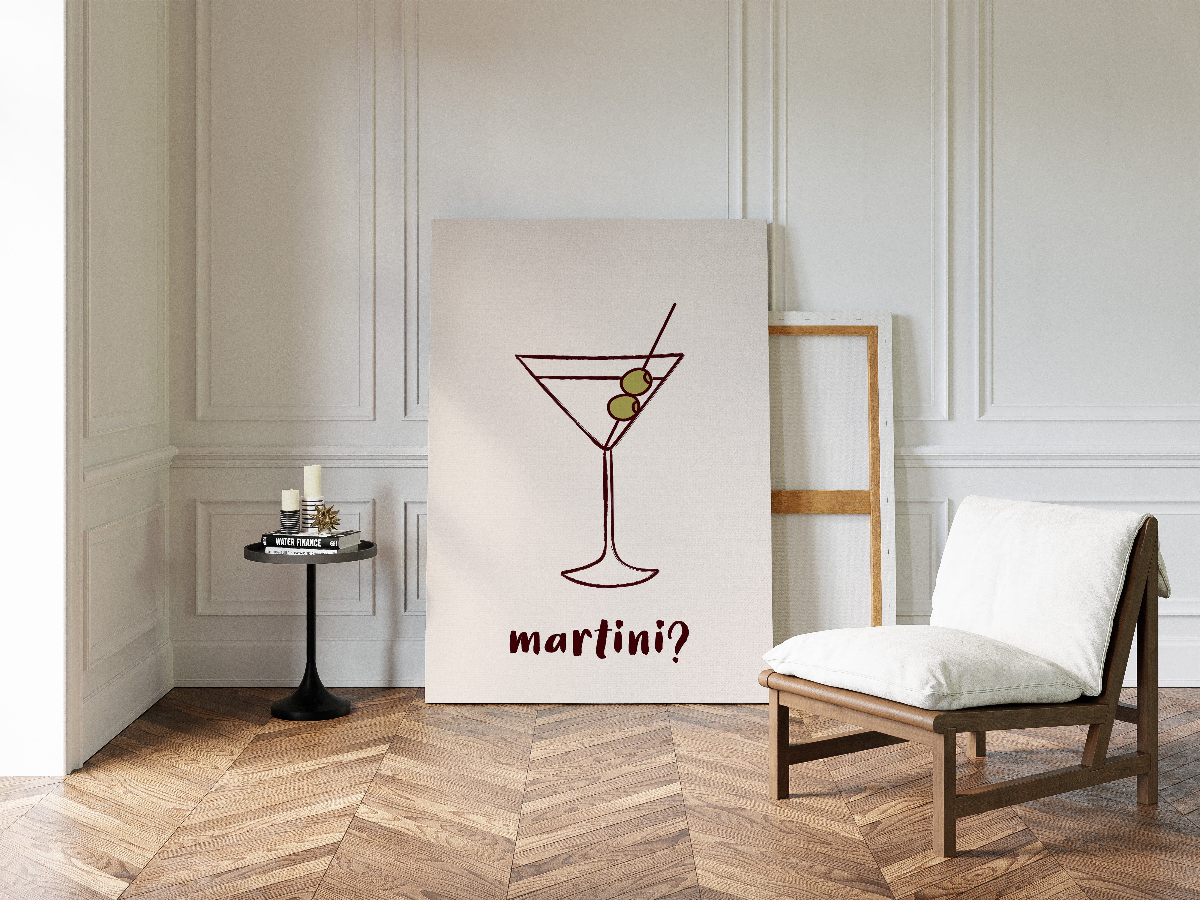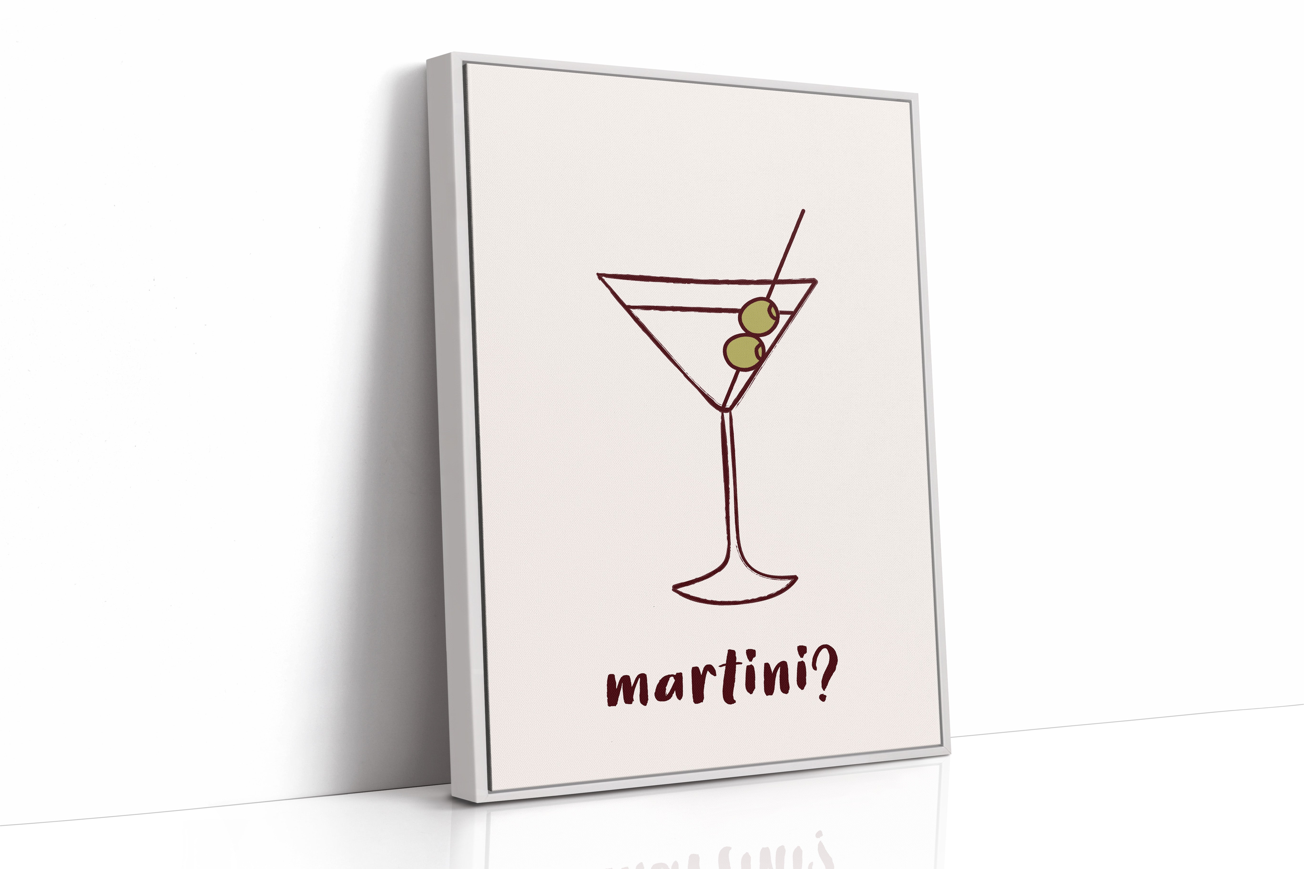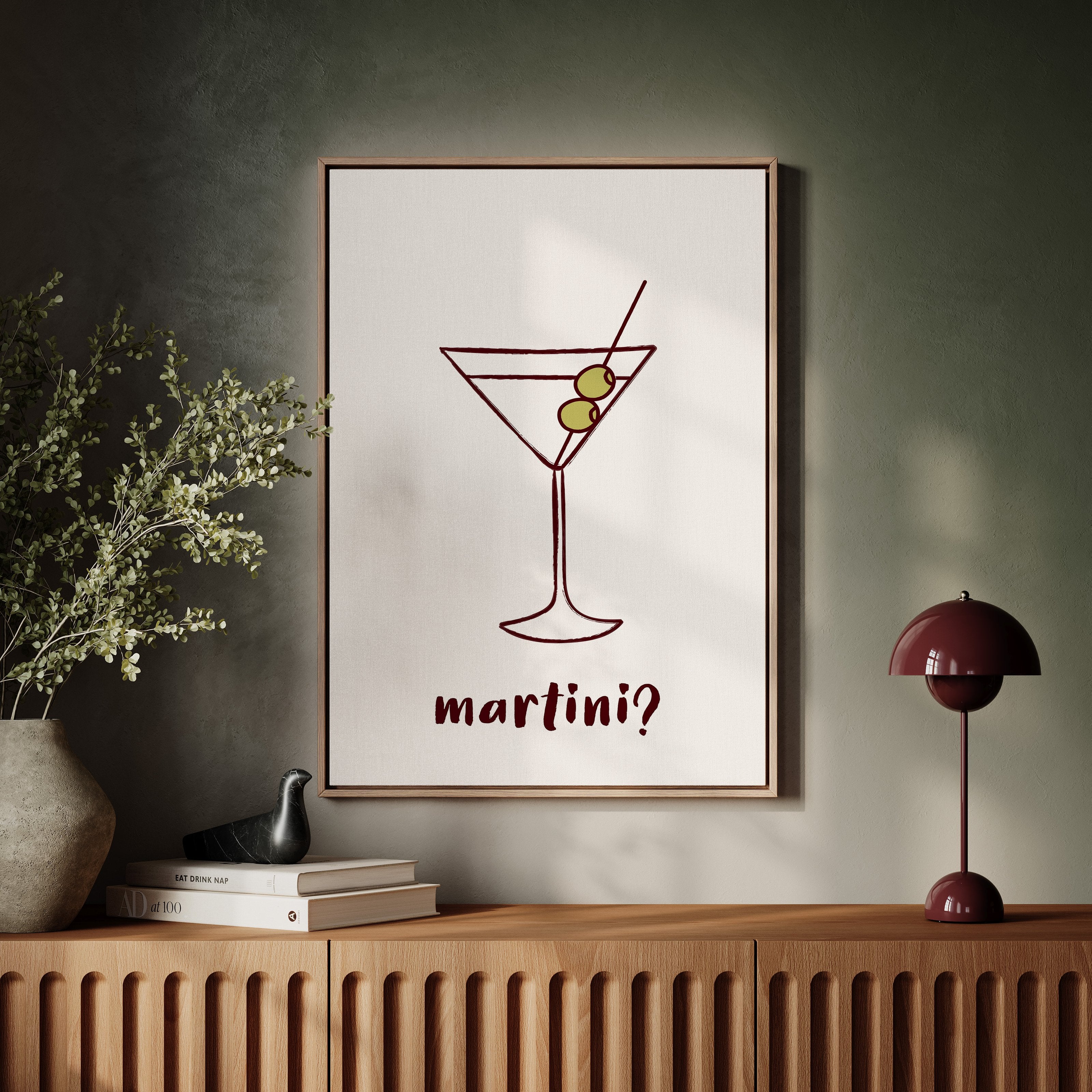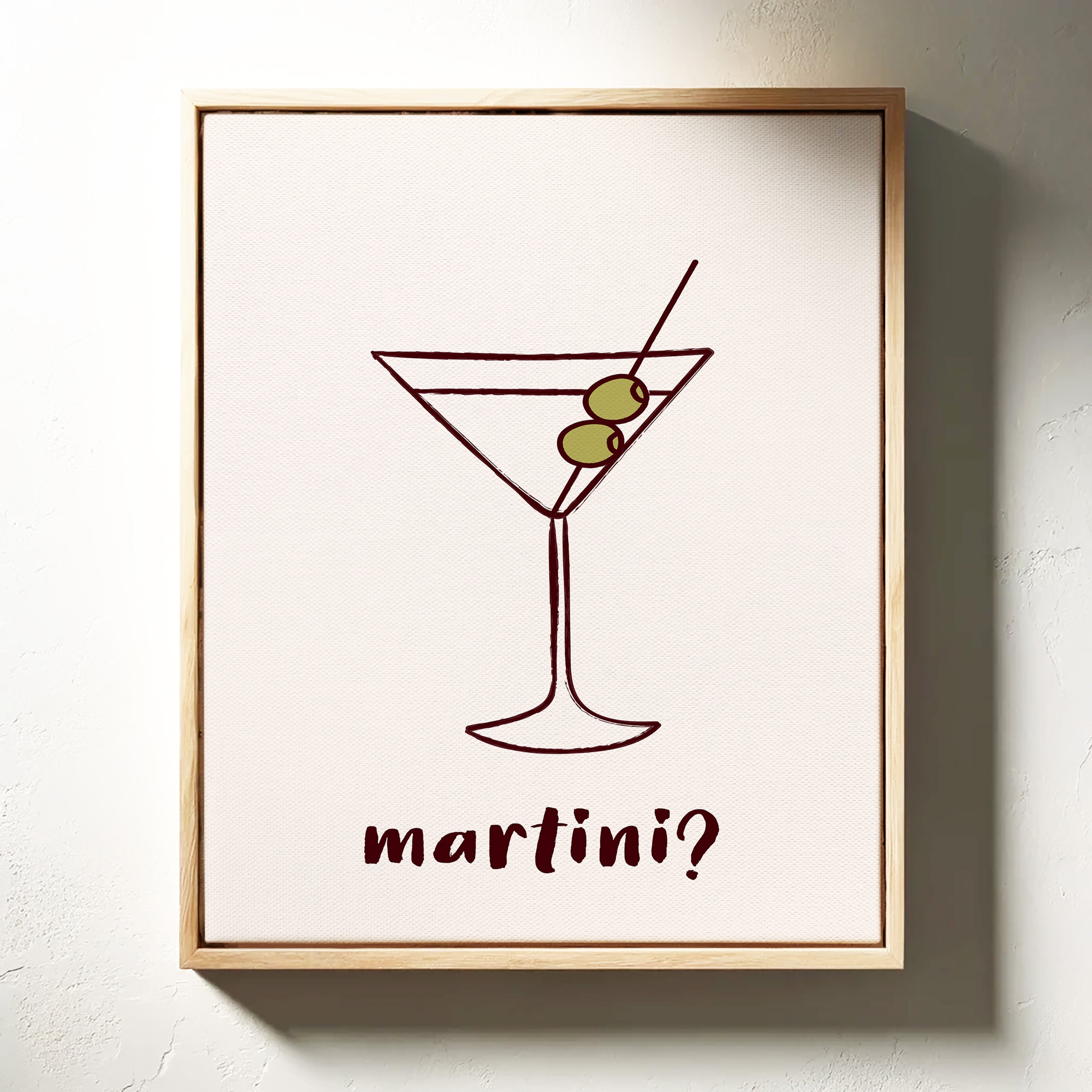 A simple question mark invites possibility, while two green olives rest gracefully against the clean lines of a classic cocktail glass. This minimalist piece from our Contemporary collection captures the sophisticated allure of cocktail culture. The deep burgundy brushstrokes create an effortless elegance against the pristine white background, while the playful handwritten text adds a touch of whimsy to the formal geometry above. Perfect for adding a dash of sophistication to a home bar area, dining room, or kitchen space. This piece speaks to those who appreciate both the art of mixology and clean, modern design.
