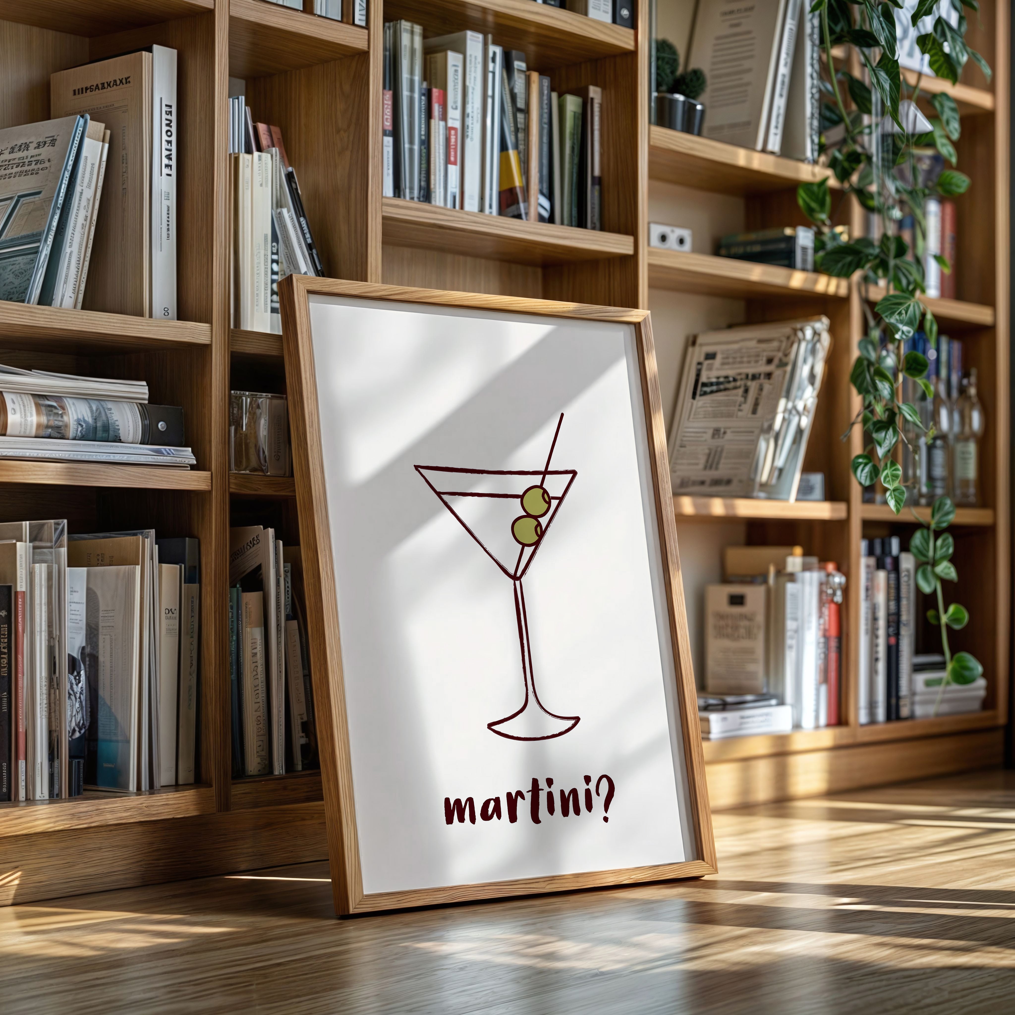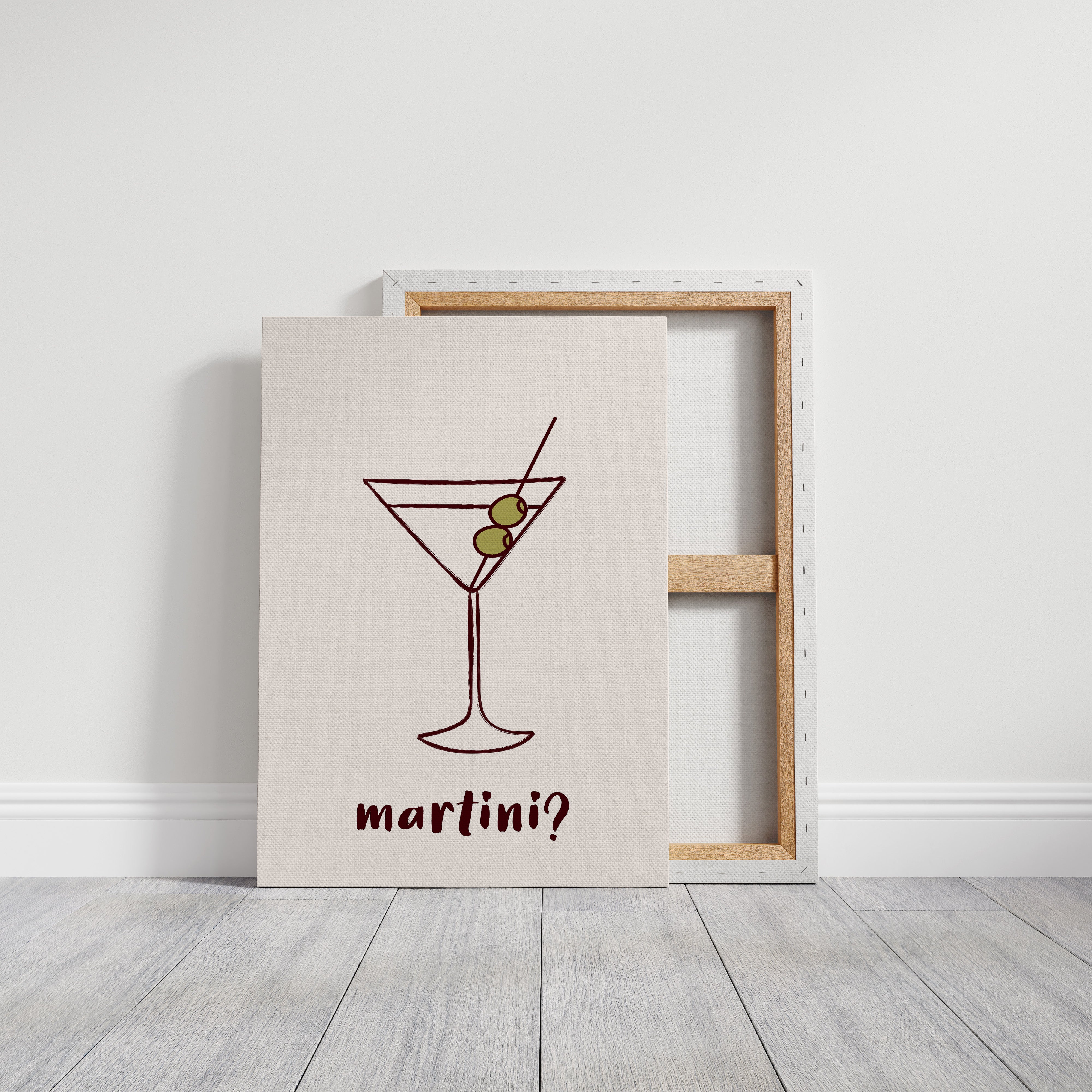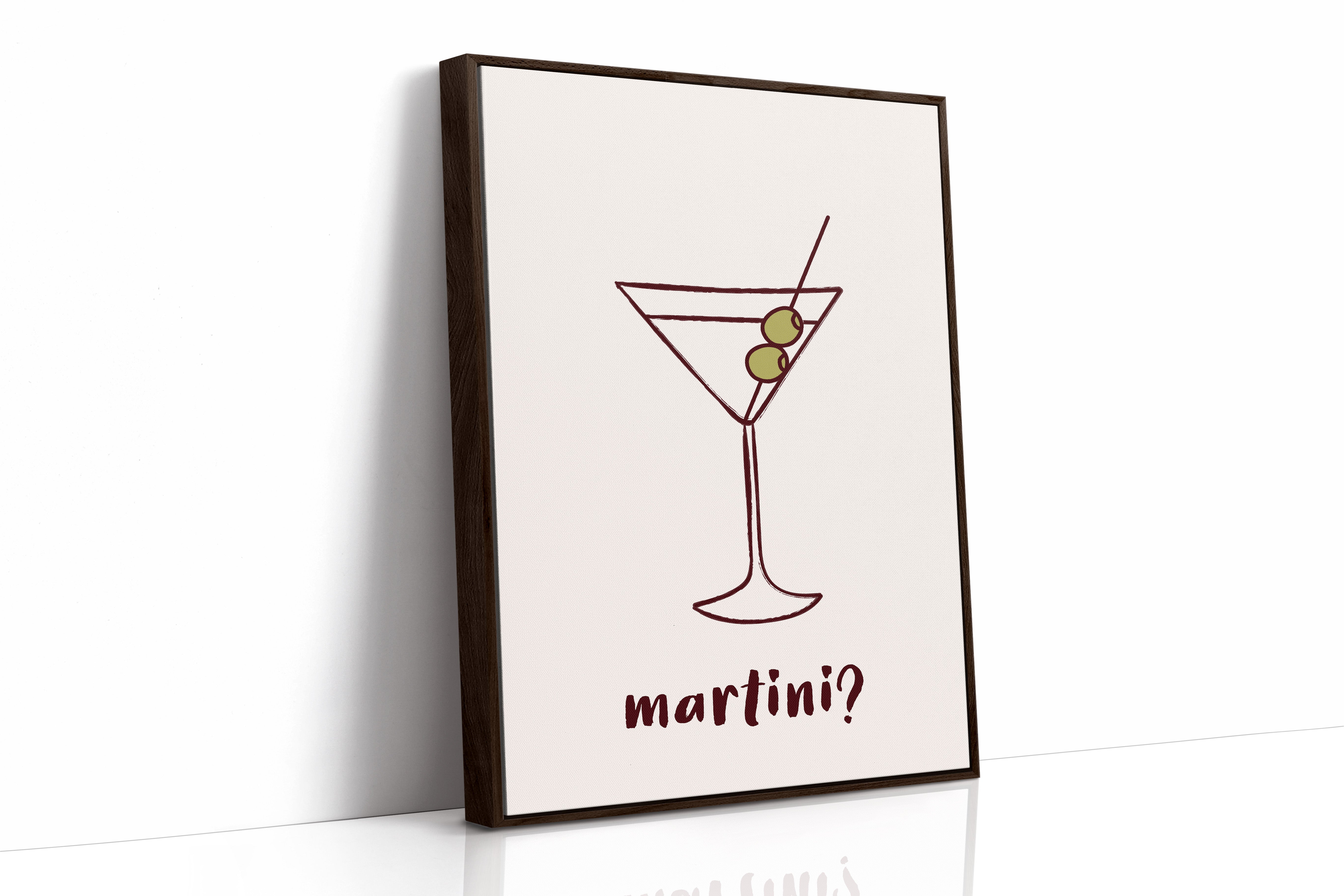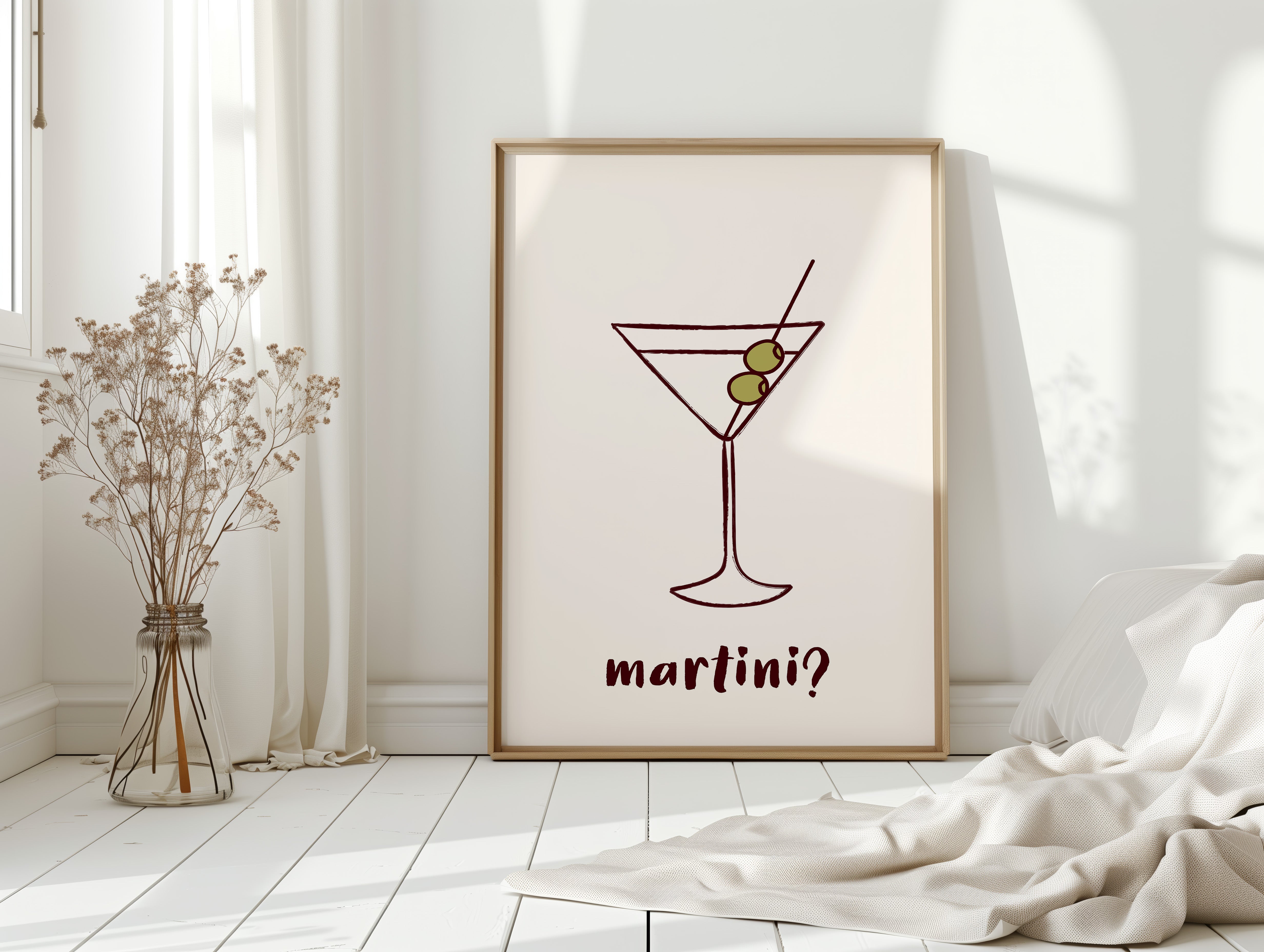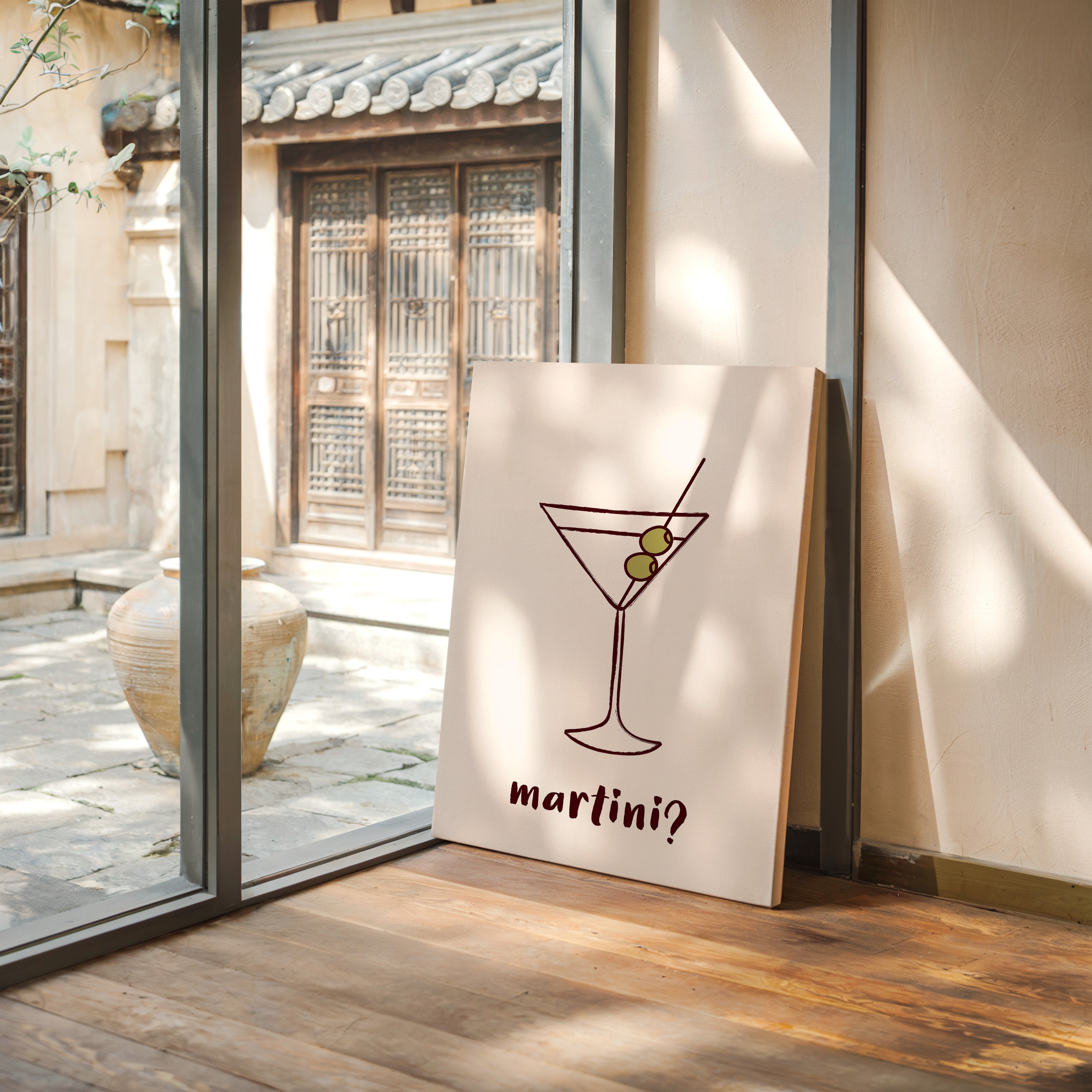 A simple question mark invites possibility, while two green olives rest gracefully against the clean lines of a classic cocktail glass. This minimalist piece from our Contemporary collection captures the sophisticated allure of cocktail culture. The deep burgundy brushstrokes create an effortless elegance against the pristine white background, while the playful handwritten text adds a touch of whimsy to the formal geometry above. Perfect for adding a dash of sophistication to a home bar area, dining room, or kitchen space. This piece speaks to those who appreciate both the art of mixology and clean, modern design.