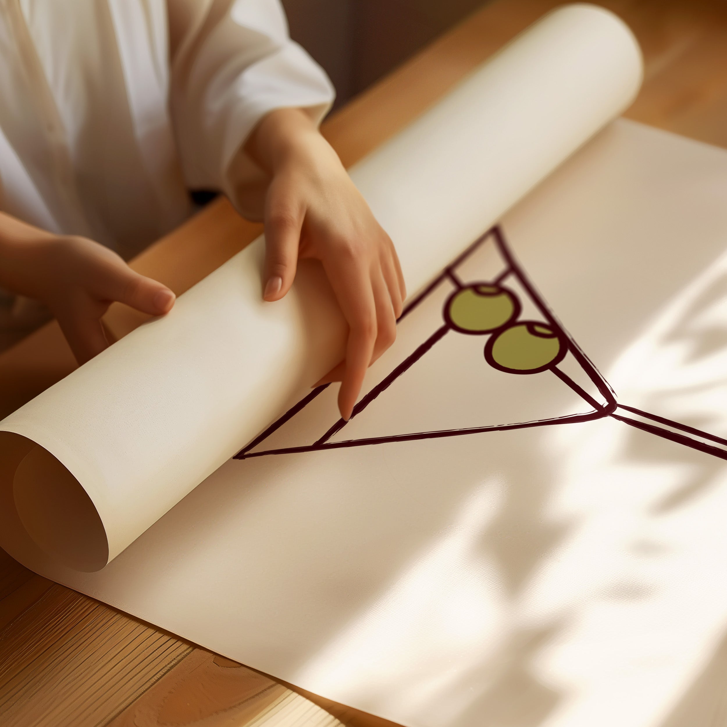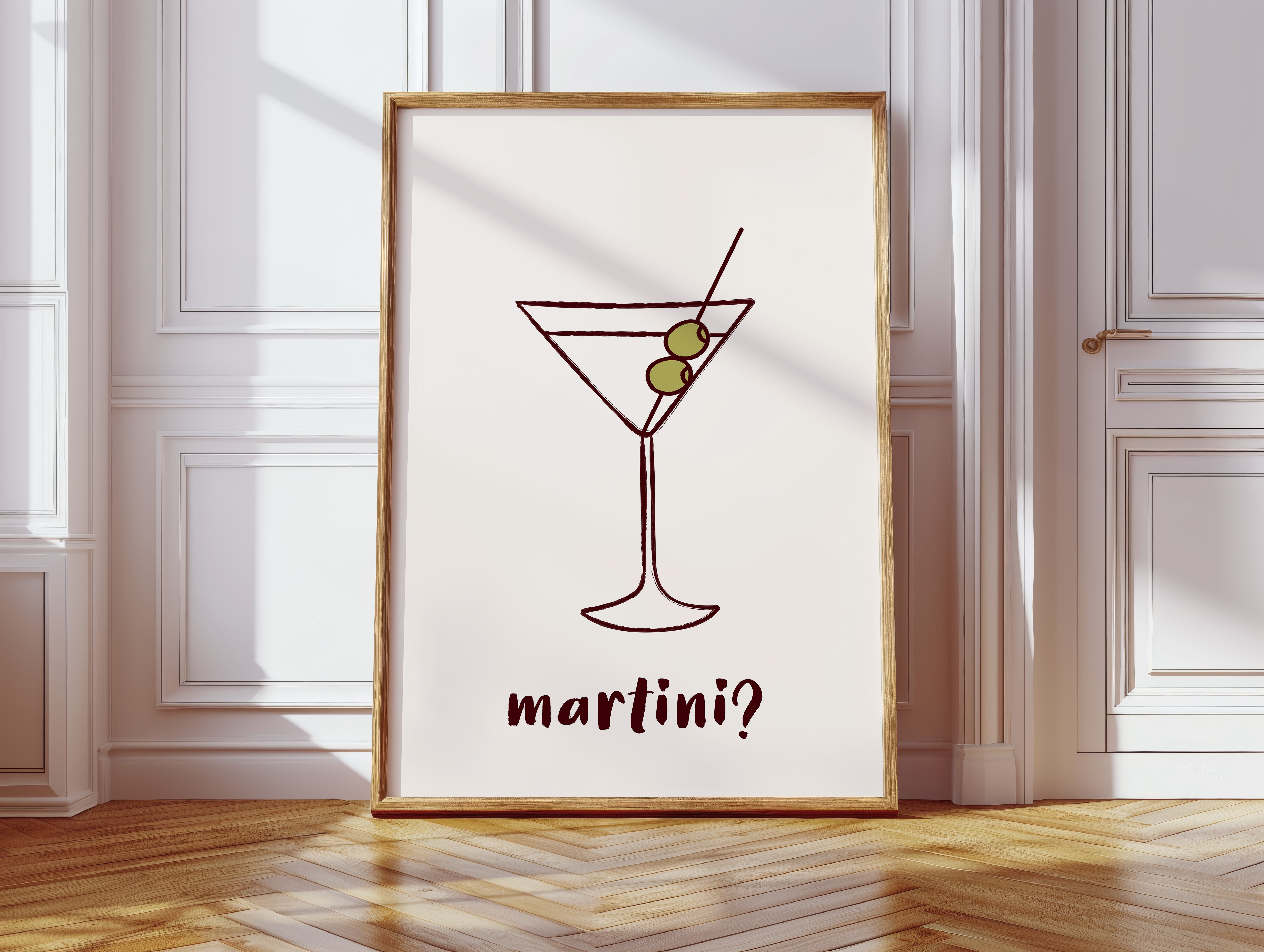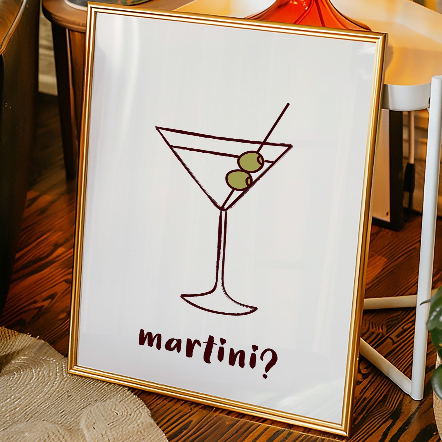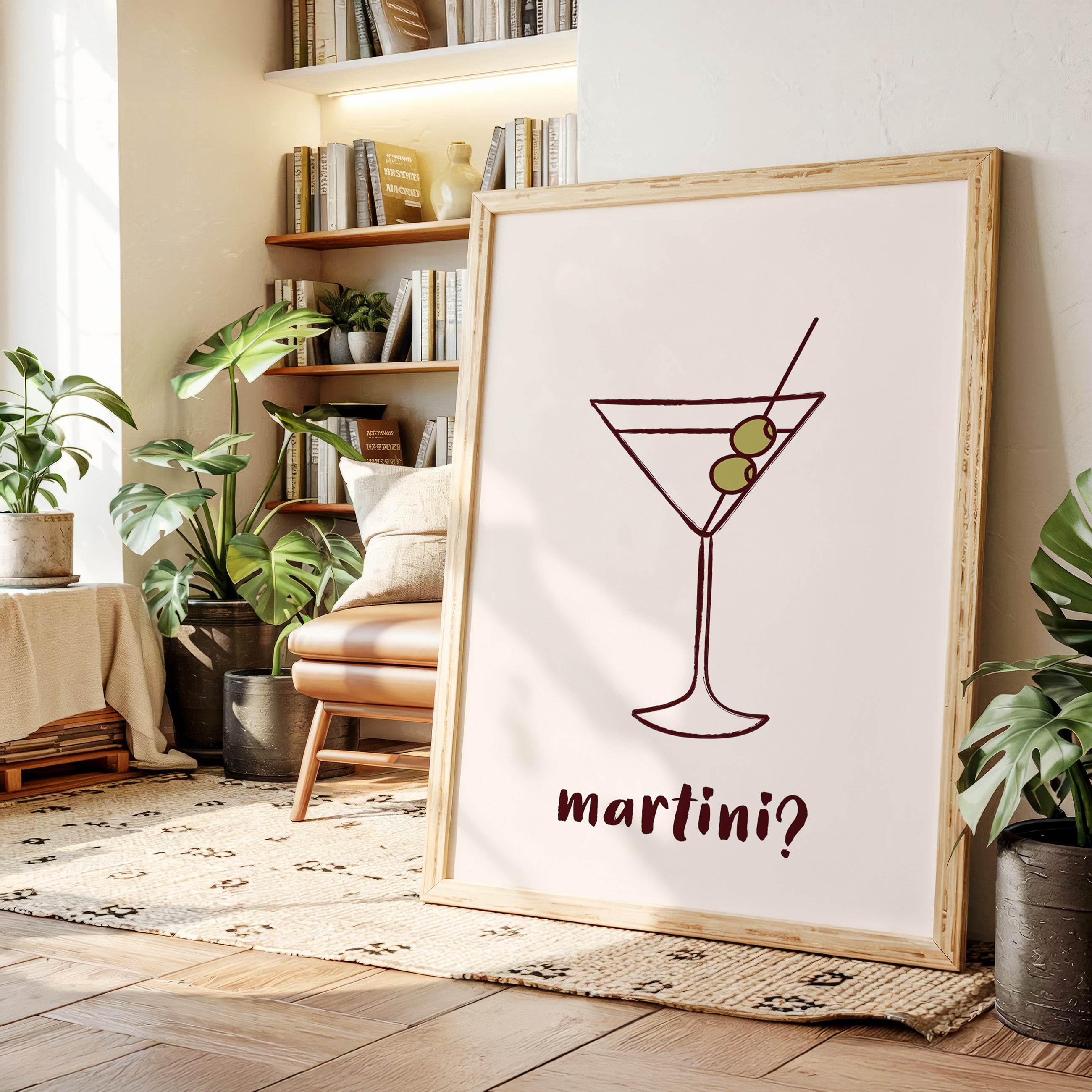 A simple question mark invites possibility, while two green olives rest gracefully against the clean lines of a classic cocktail glass. This minimalist piece from our Contemporary collection captures the sophisticated allure of cocktail culture. The deep burgundy brushstrokes create an effortless elegance against the pristine white background, while the playful handwritten text adds a touch of whimsy to the formal geometry above. Perfect for adding a dash of sophistication to a home bar area, dining room, or kitchen space. This piece speaks to those who appreciate both the art of mixology and clean, modern design.