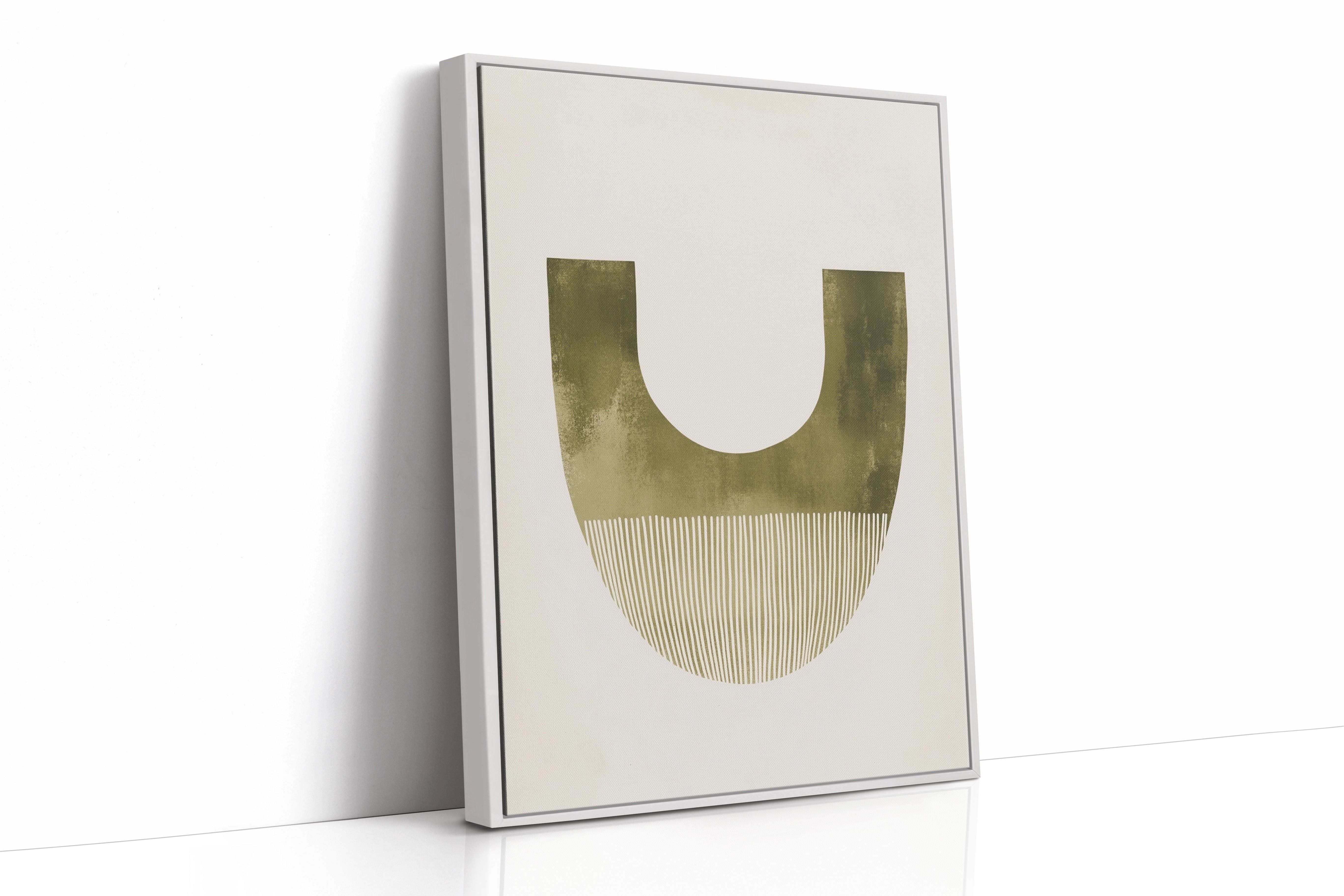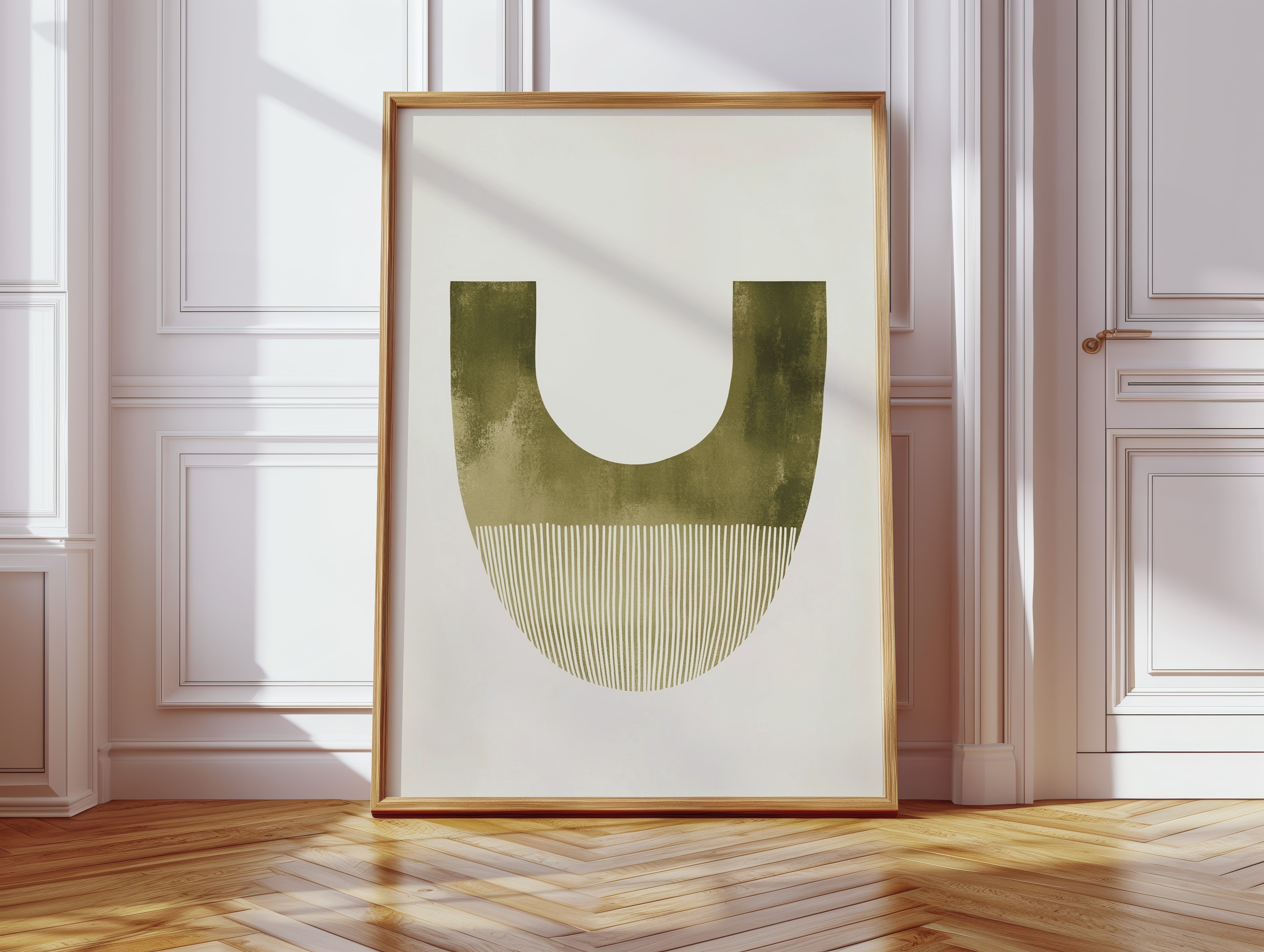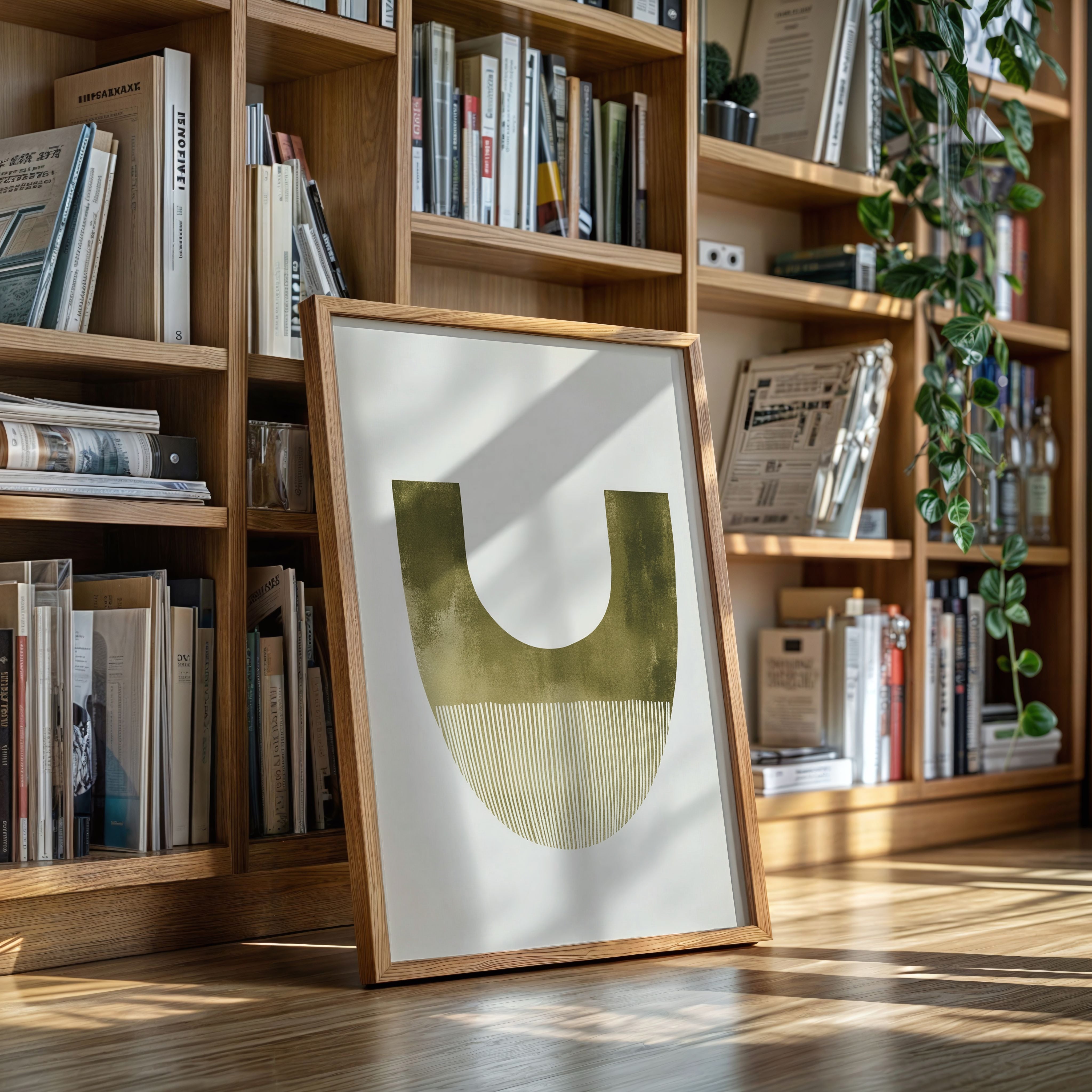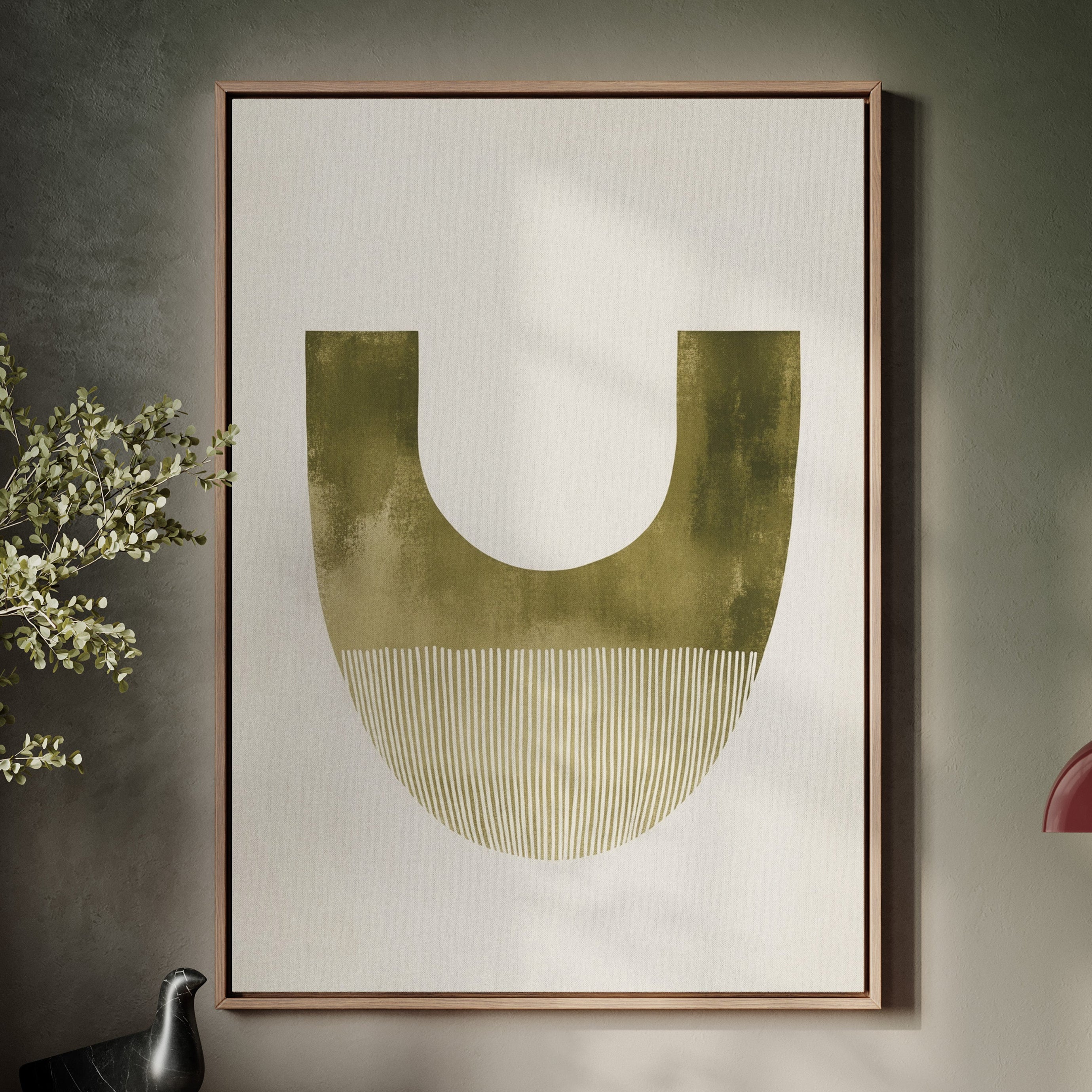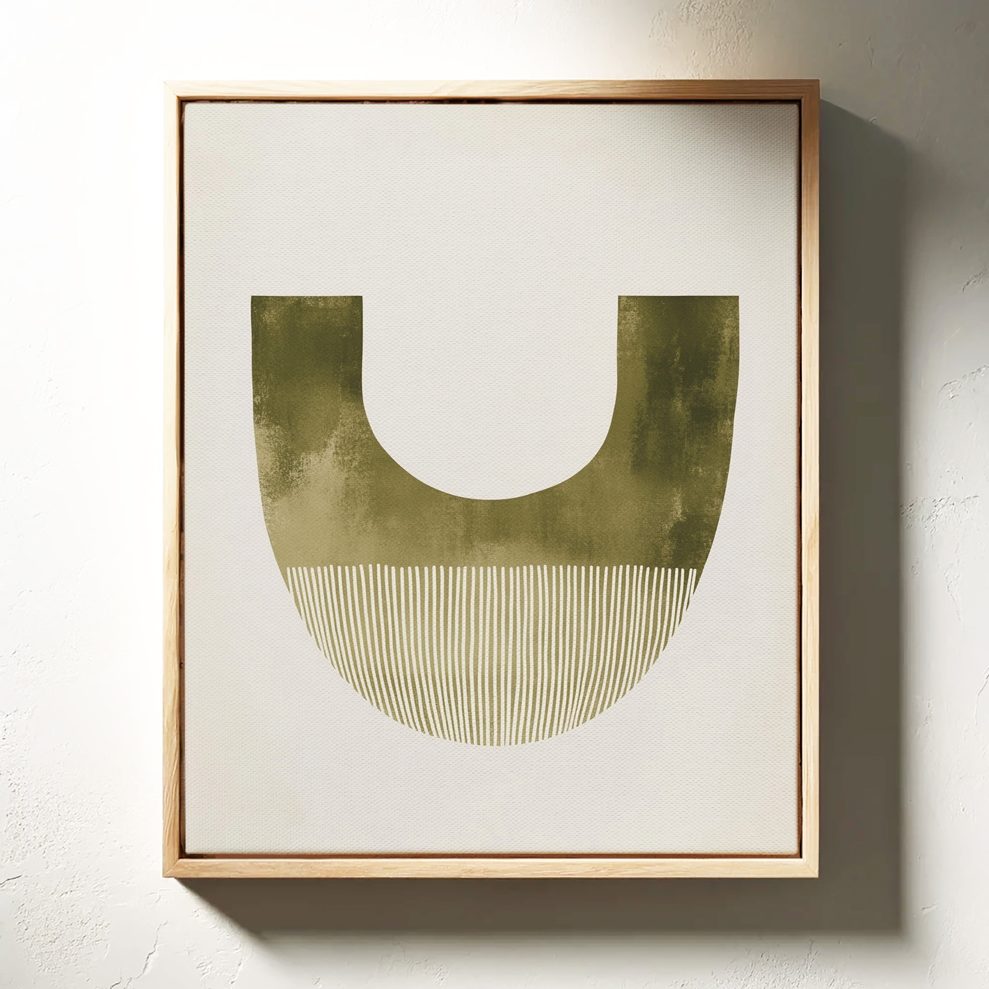 A harmonious blend of simplicity and sophistication emerges through this U-shaped form, rendered in rich olive tones against a pristine backdrop. The solid upper portion dissolves into precise vertical lines below, creating a mesmerizing rhythm that speaks to both order and organic beauty. The textured olive green carries the warmth of aged brass, while the striped pattern suggests the gentle fall of morning light through blinds. This piece would bring a sense of calm sophistication to a minimal dining room or add architectural interest to a contemporary home office space.