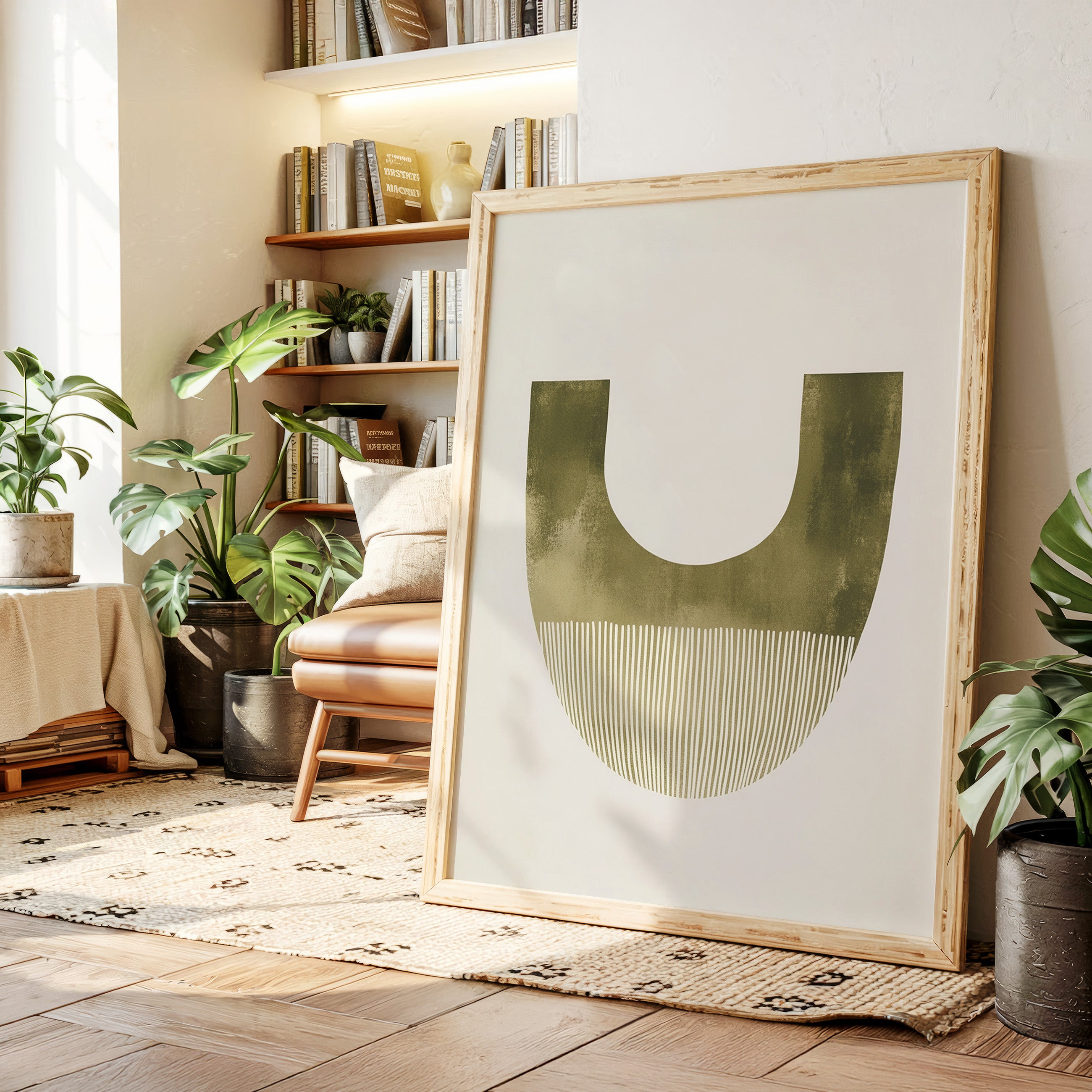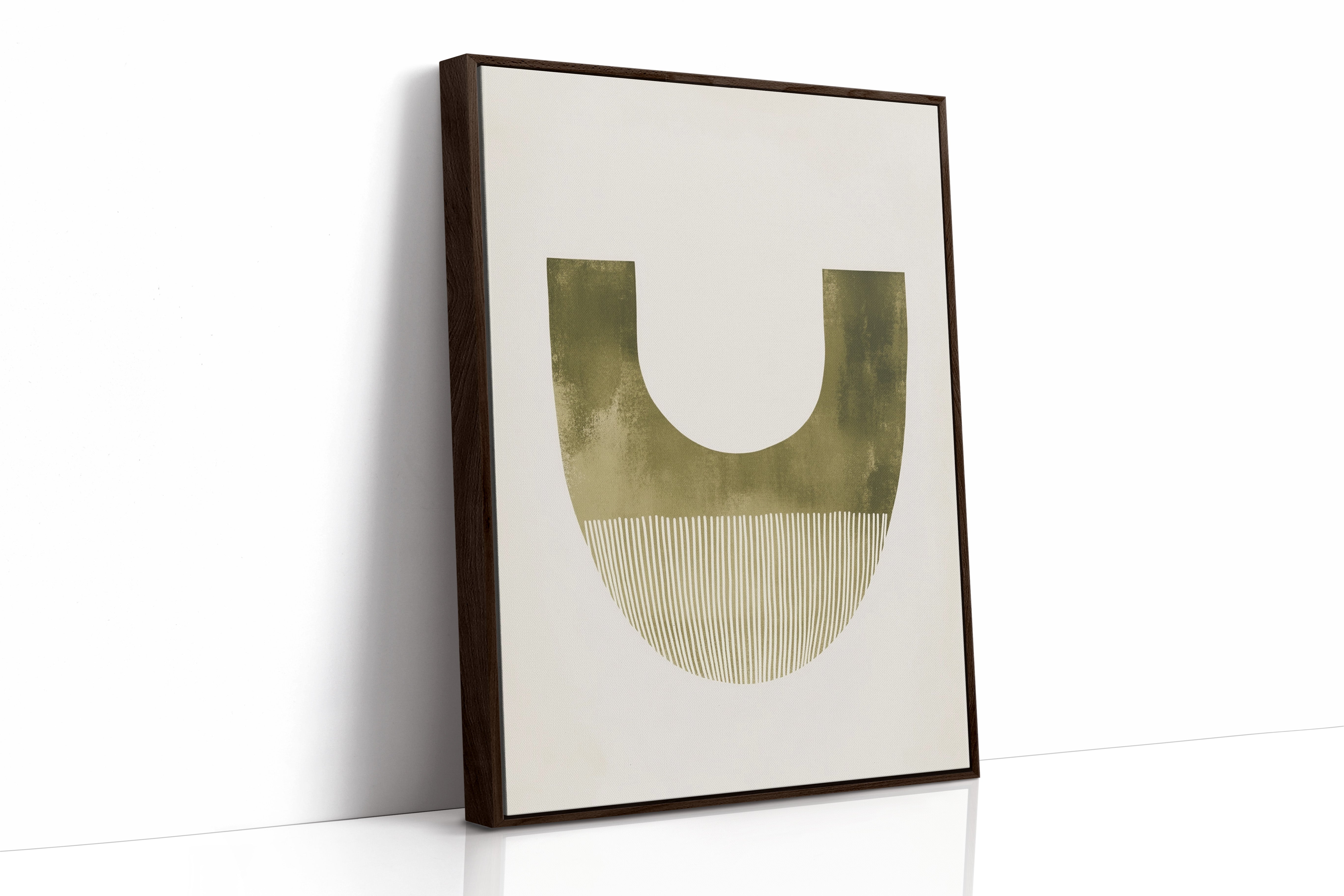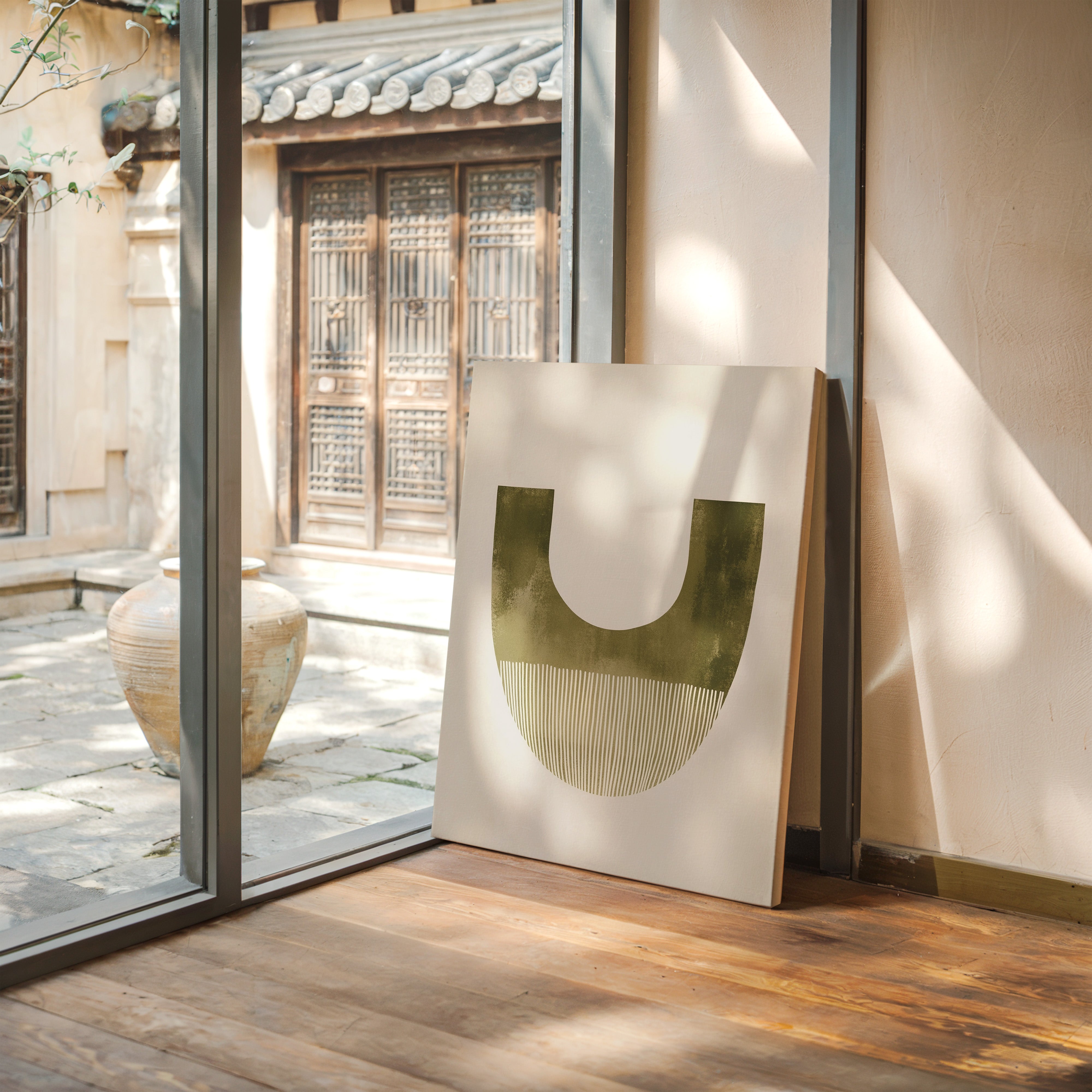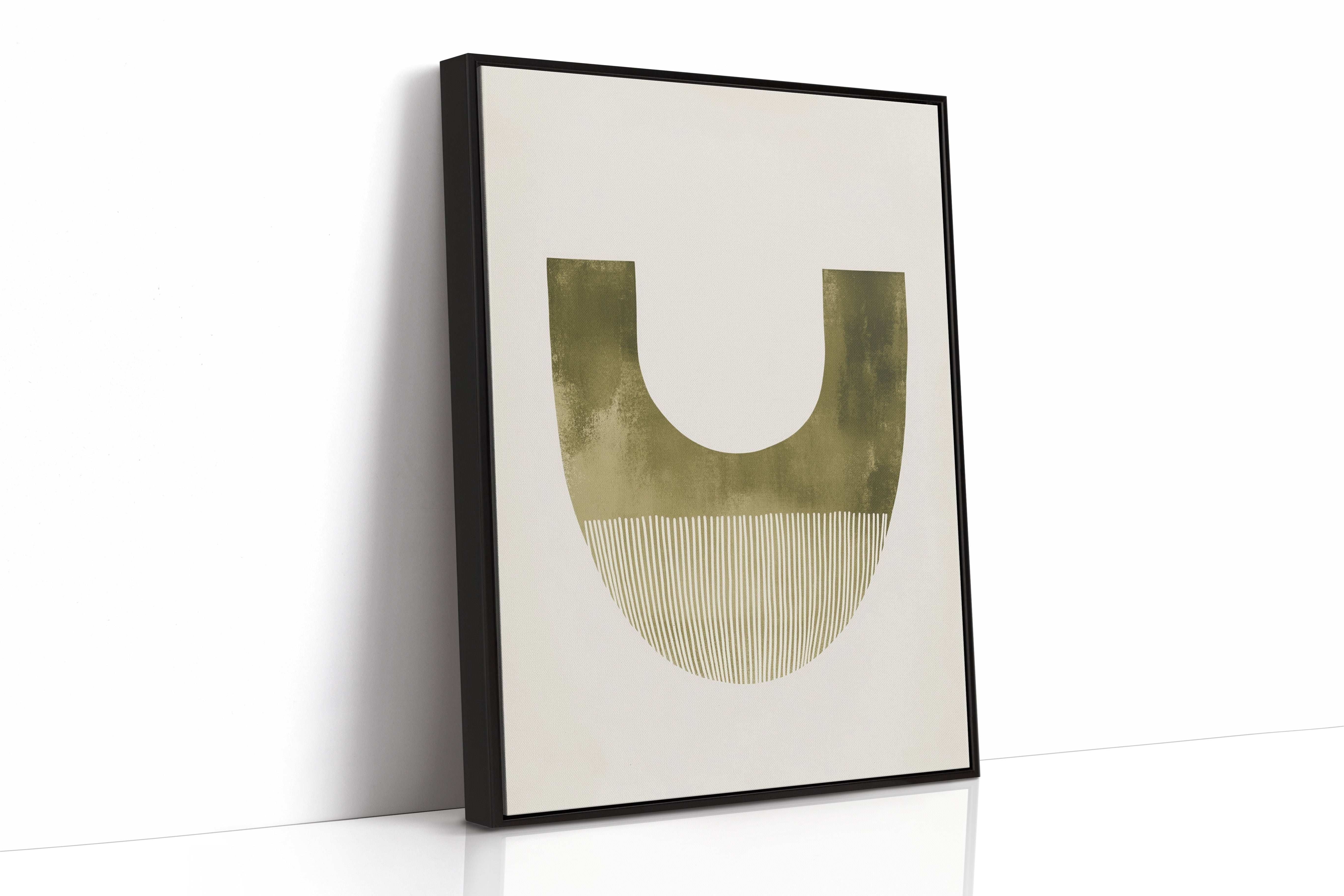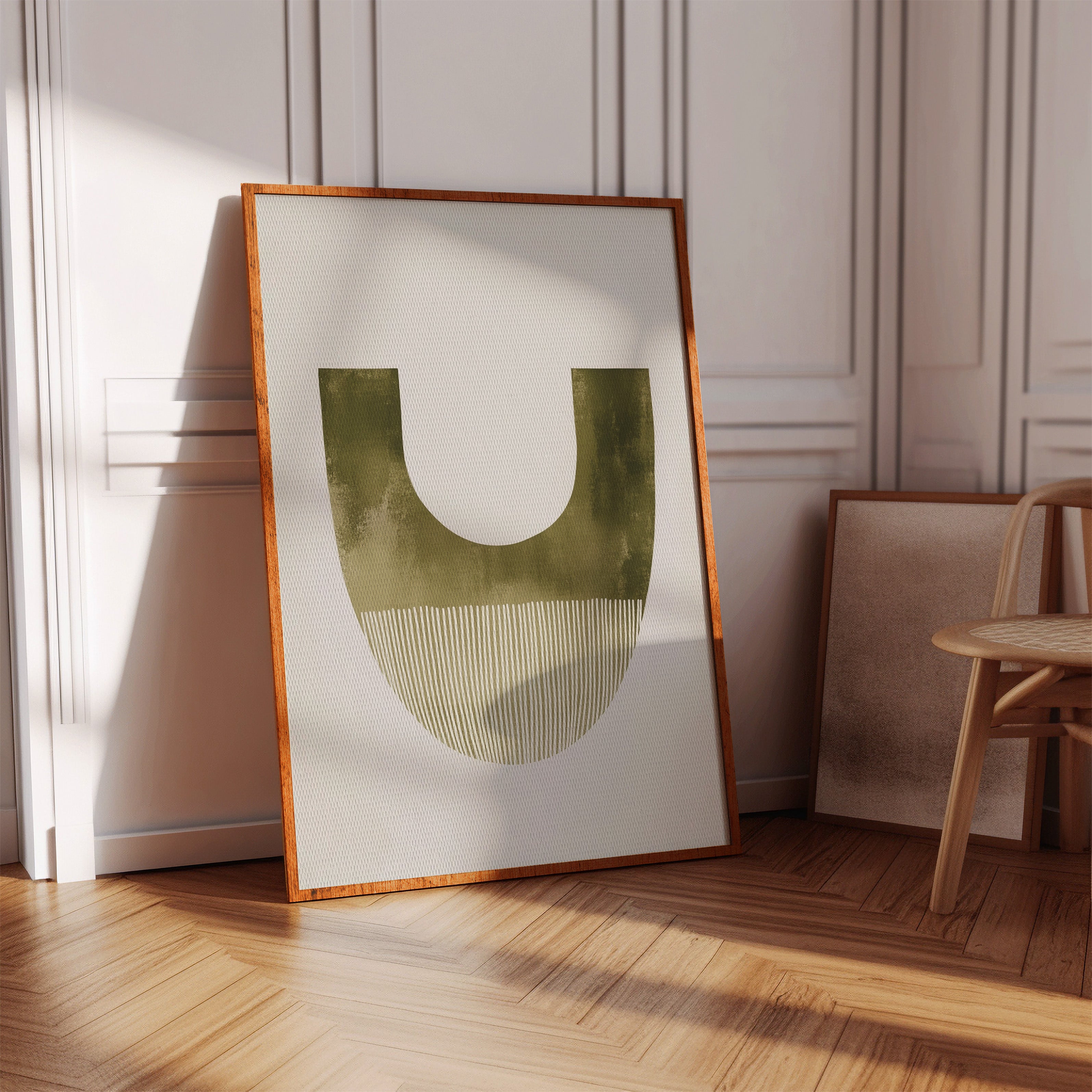 A harmonious blend of simplicity and sophistication emerges through this U-shaped form, rendered in rich olive tones against a pristine backdrop. The solid upper portion dissolves into precise vertical lines below, creating a mesmerizing rhythm that speaks to both order and organic beauty. The textured olive green carries the warmth of aged brass, while the striped pattern suggests the gentle fall of morning light through blinds. This piece would bring a sense of calm sophistication to a minimal dining room or add architectural interest to a contemporary home office space.