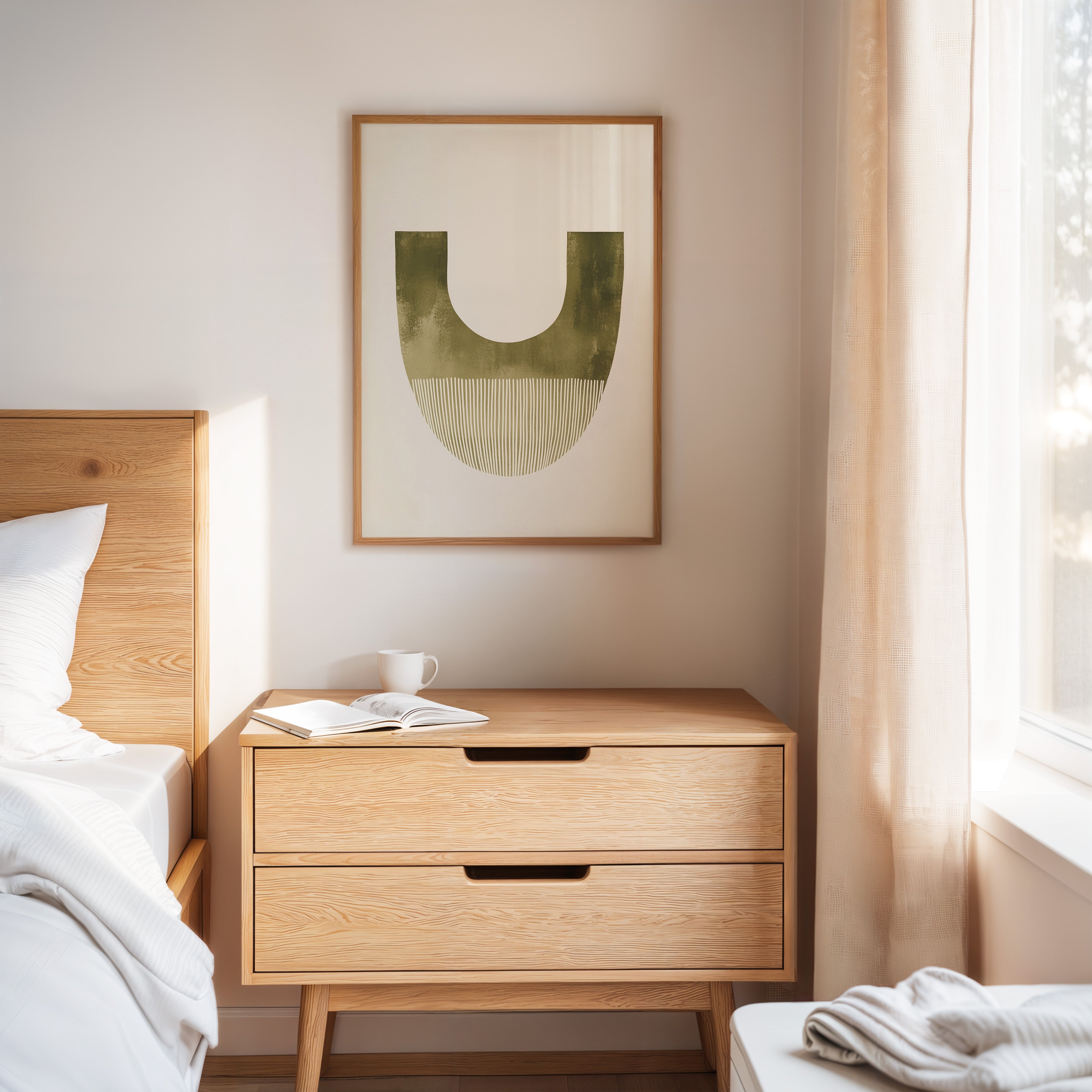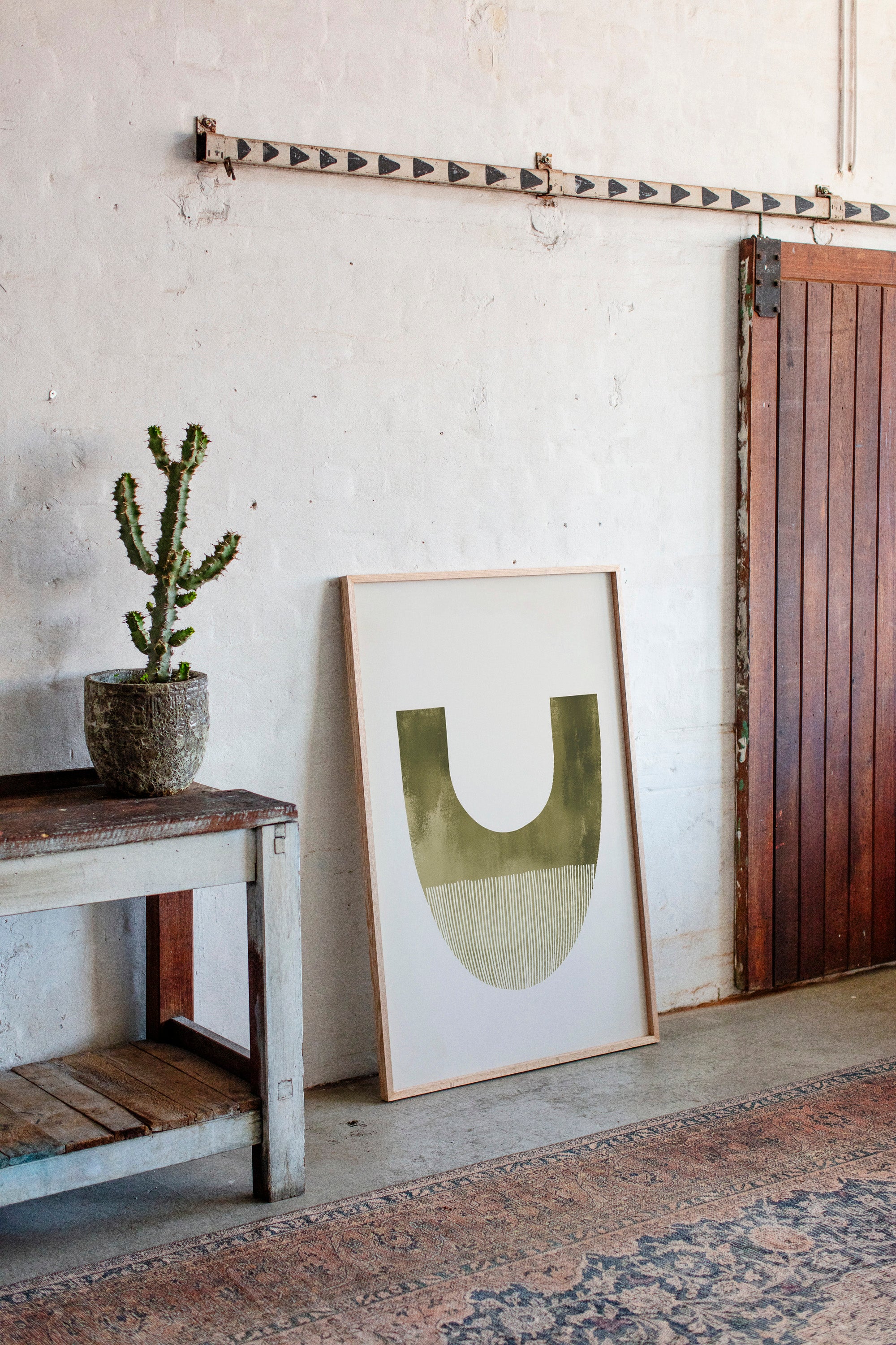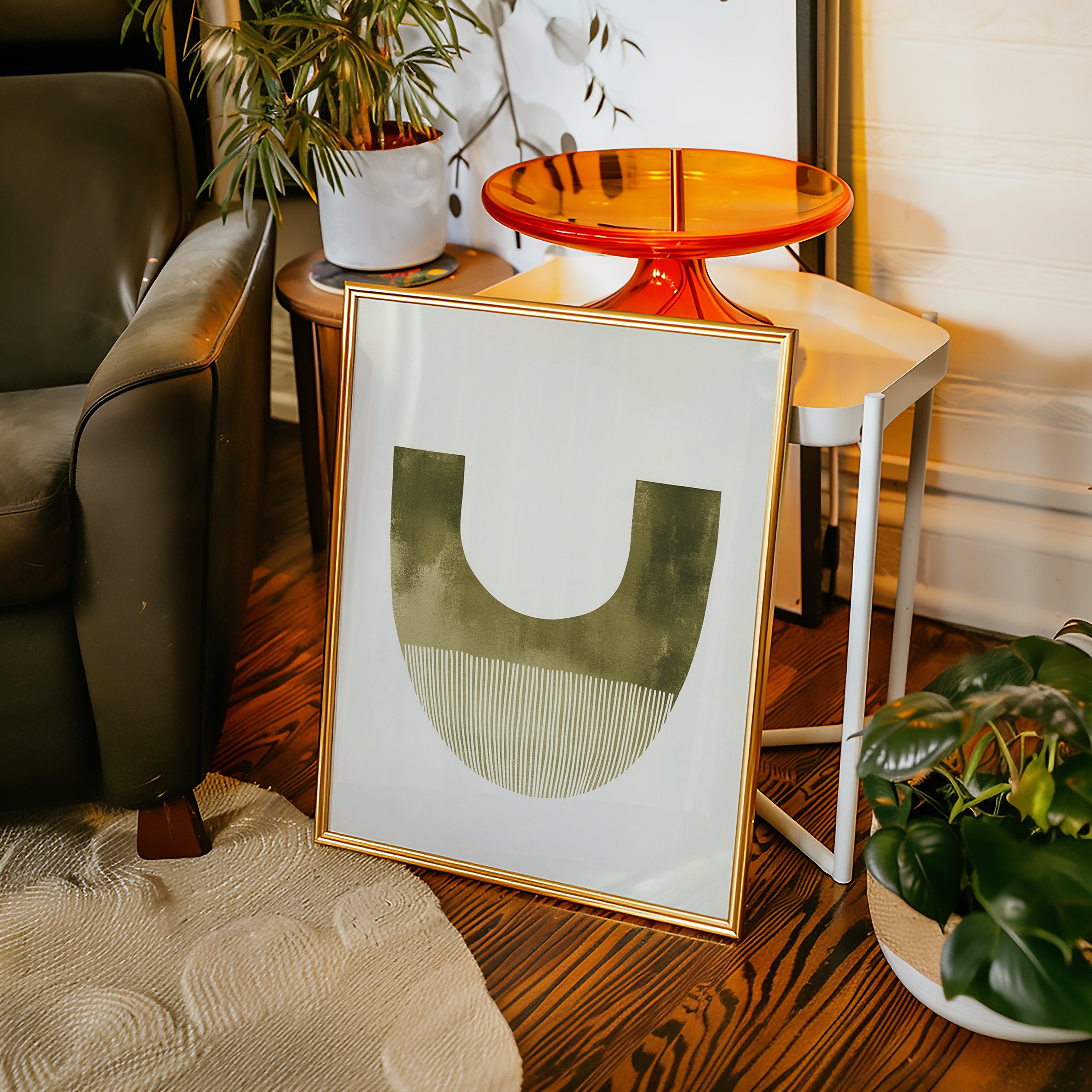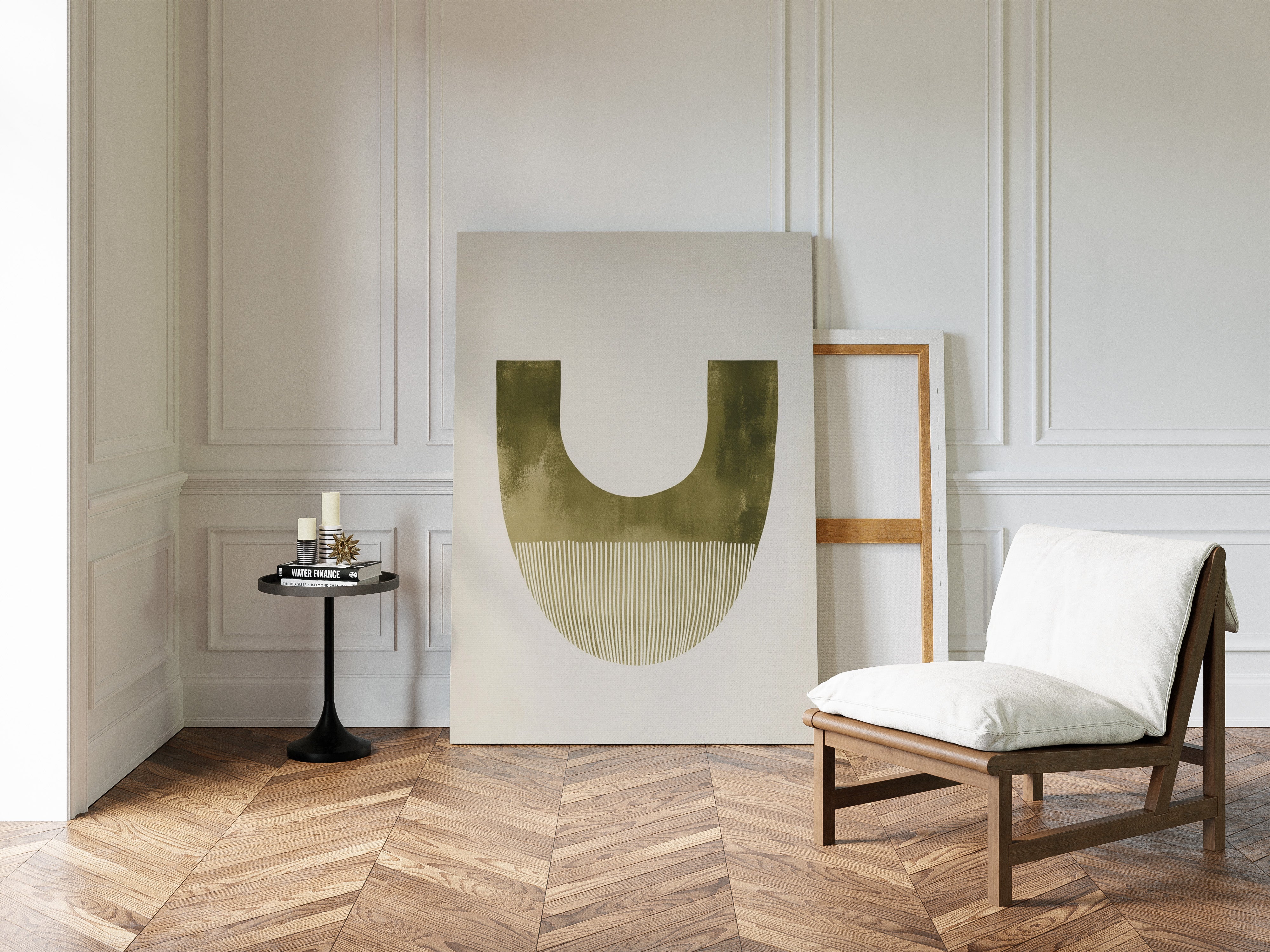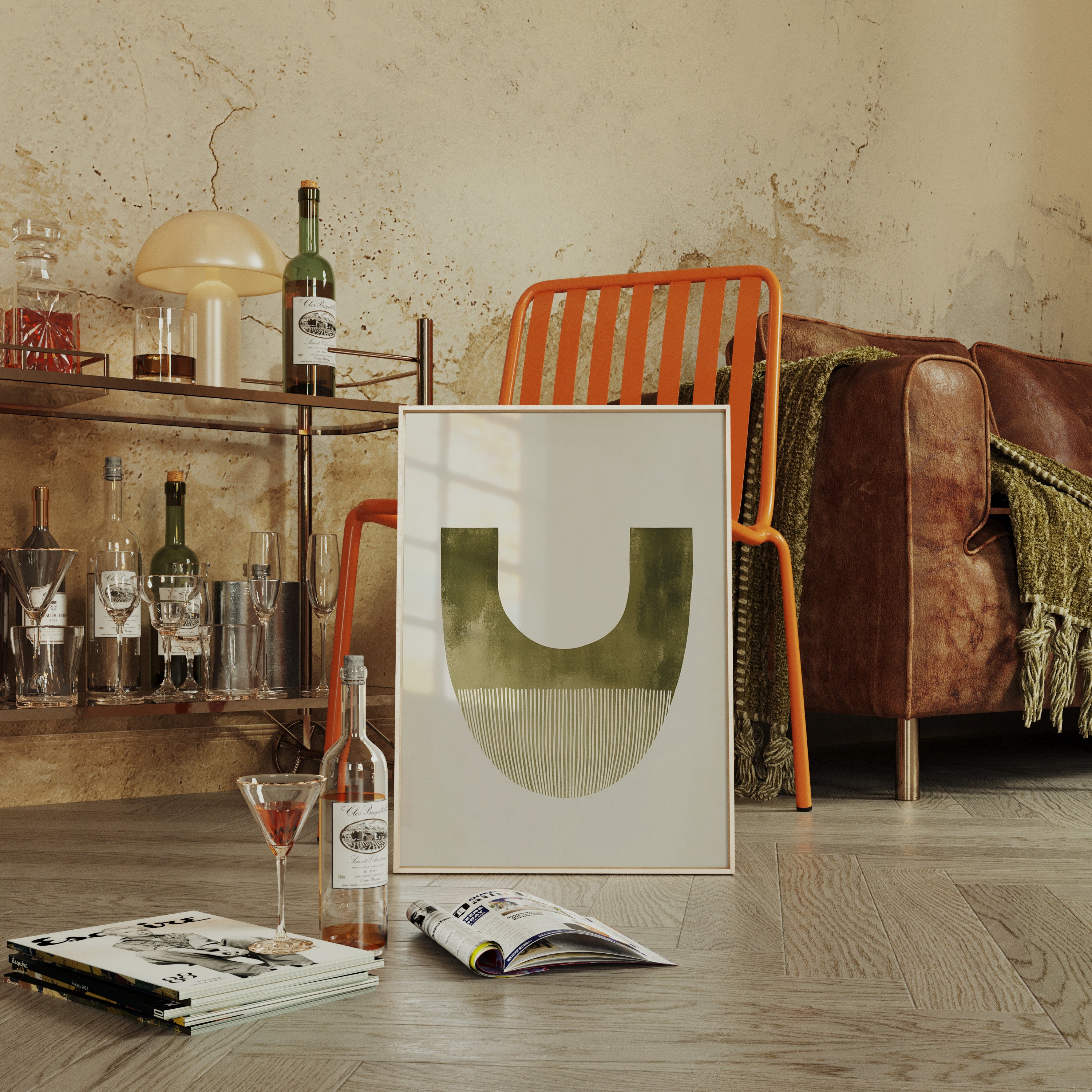 A harmonious blend of simplicity and sophistication emerges through this U-shaped form, rendered in rich olive tones against a pristine backdrop. The solid upper portion dissolves into precise vertical lines below, creating a mesmerizing rhythm that speaks to both order and organic beauty. The textured olive green carries the warmth of aged brass, while the striped pattern suggests the gentle fall of morning light through blinds. This piece would bring a sense of calm sophistication to a minimal dining room or add architectural interest to a contemporary home office space.