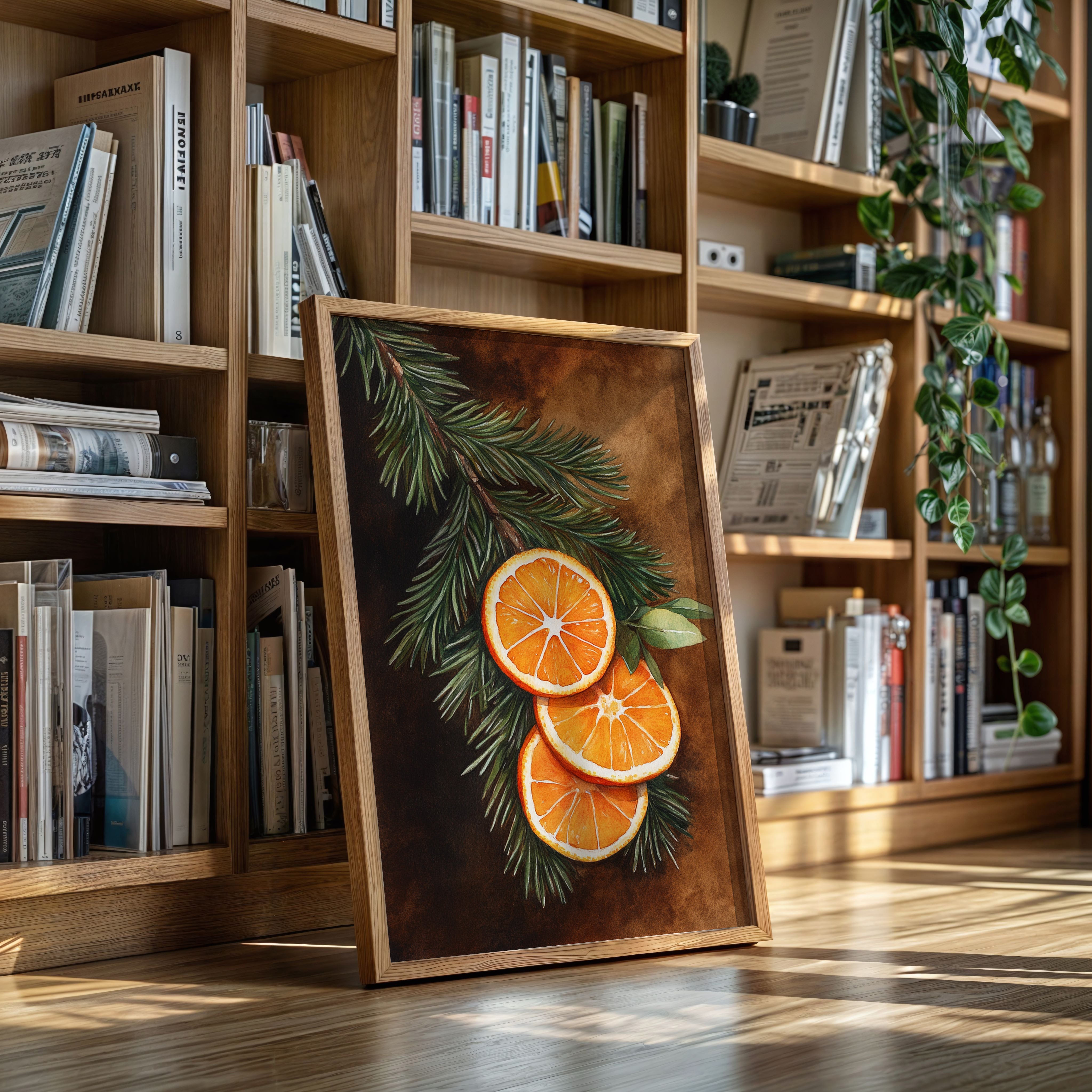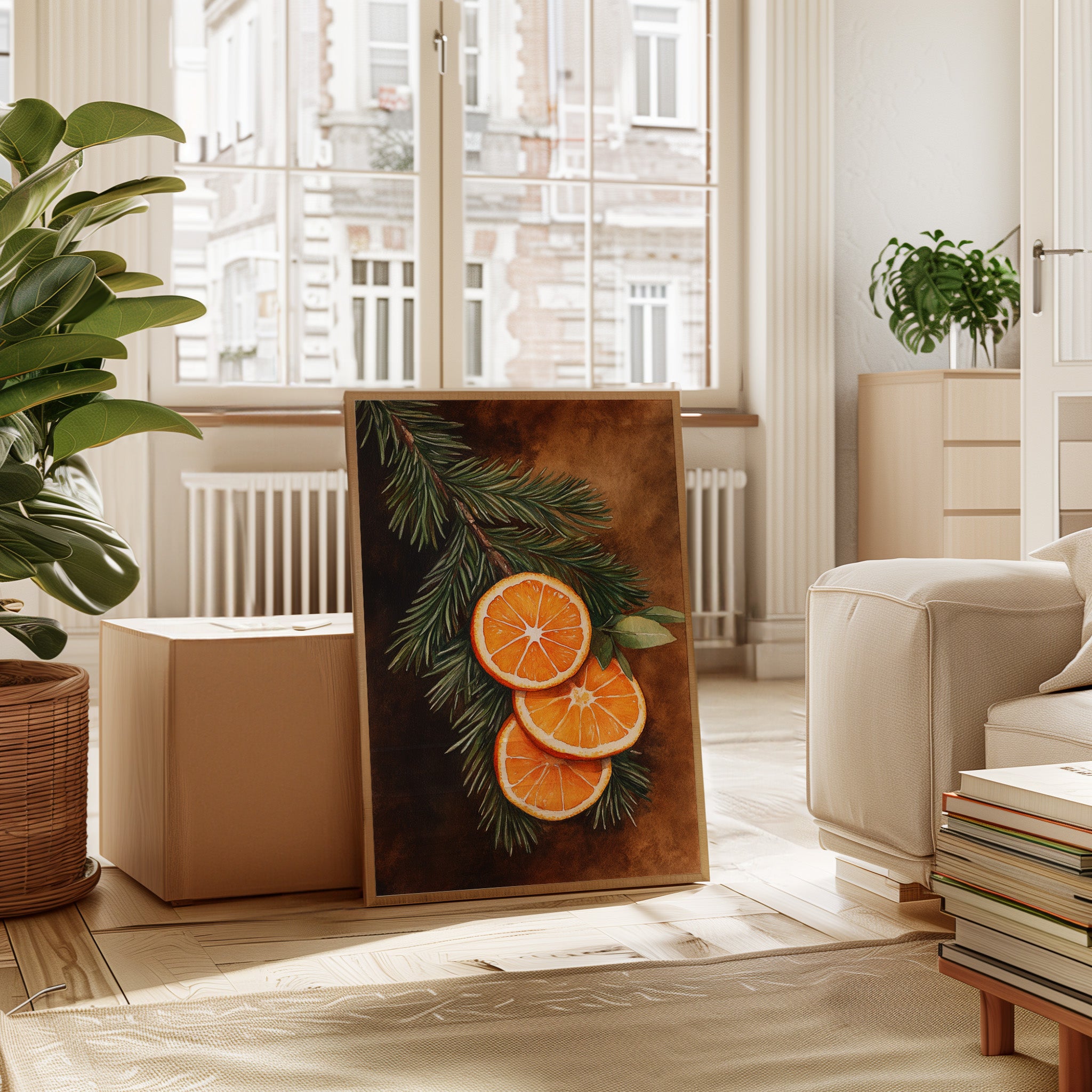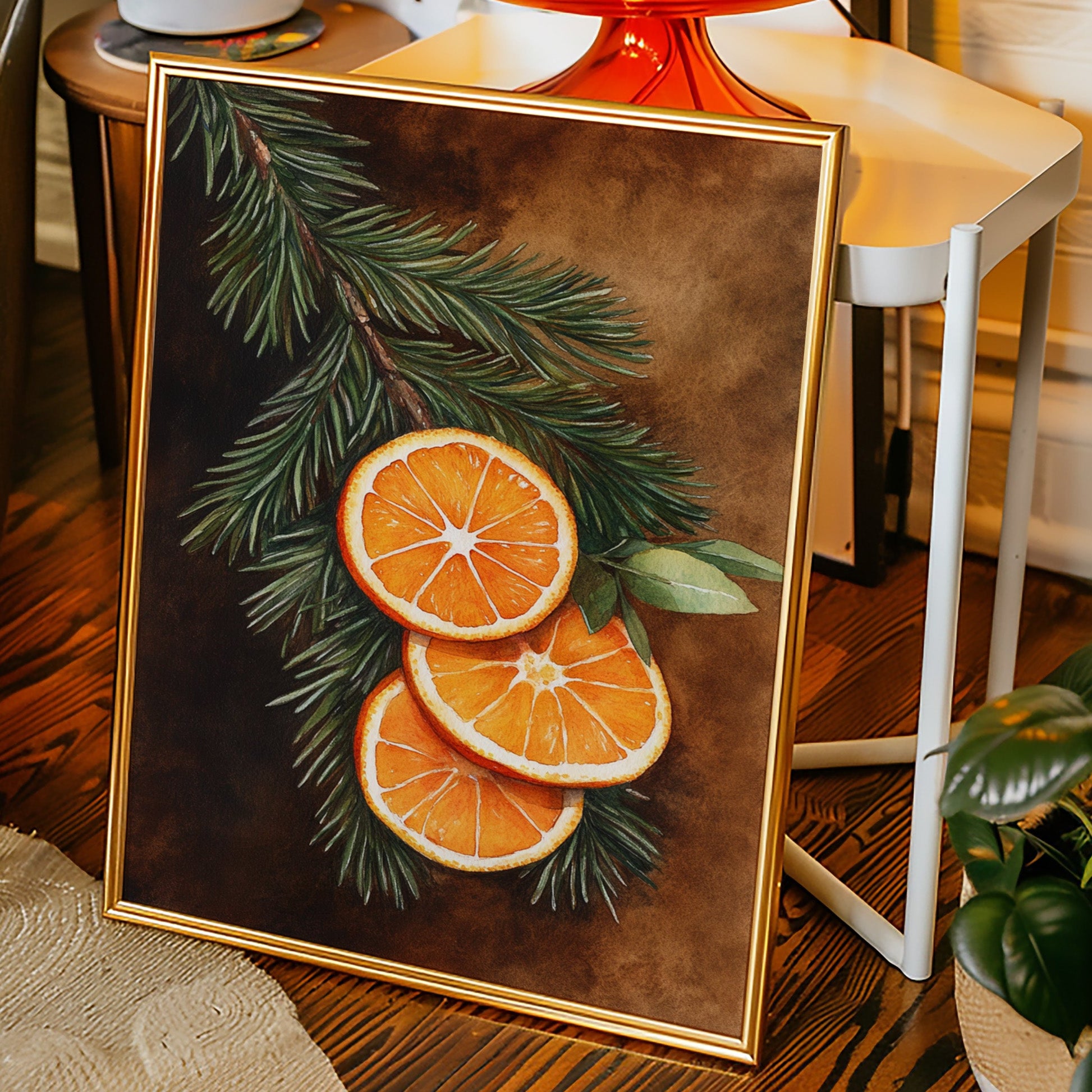 Product Details: • Museum-quality giclée print • Printed on archival matte paper • Available in multiple sizes • Pine branches with orange slices design • Optional solid wood frame in 3 finishes • Designed & printed in the USA