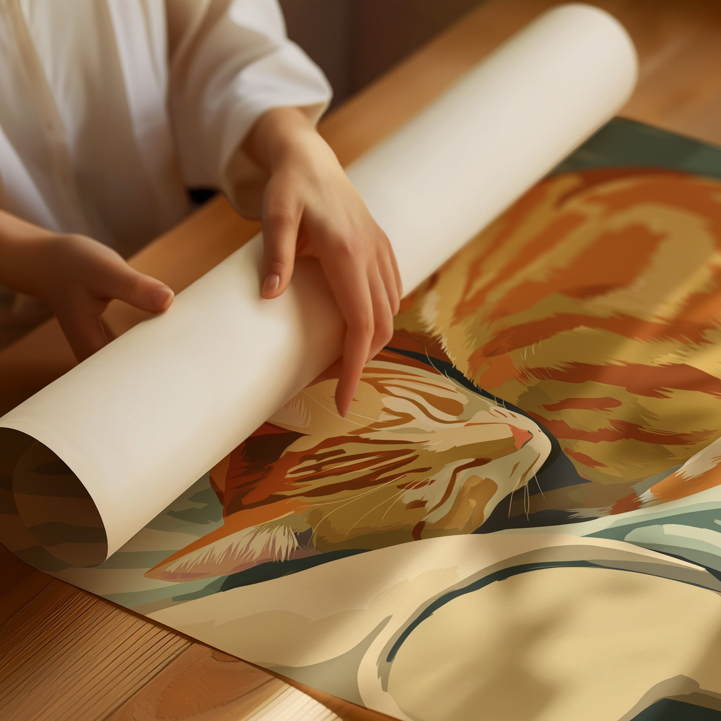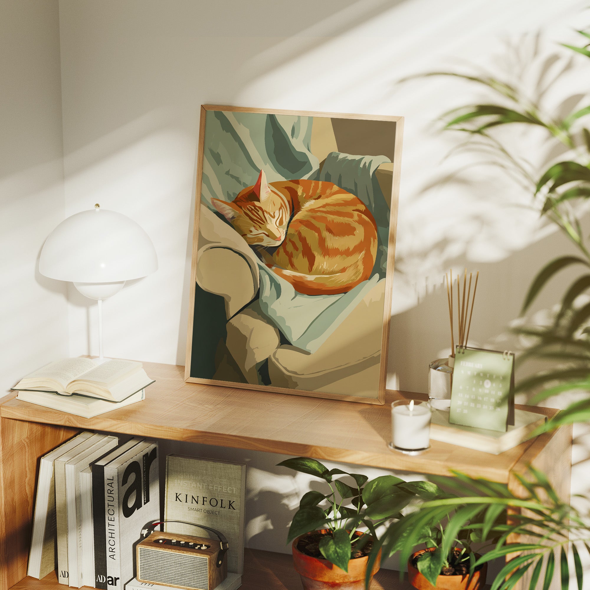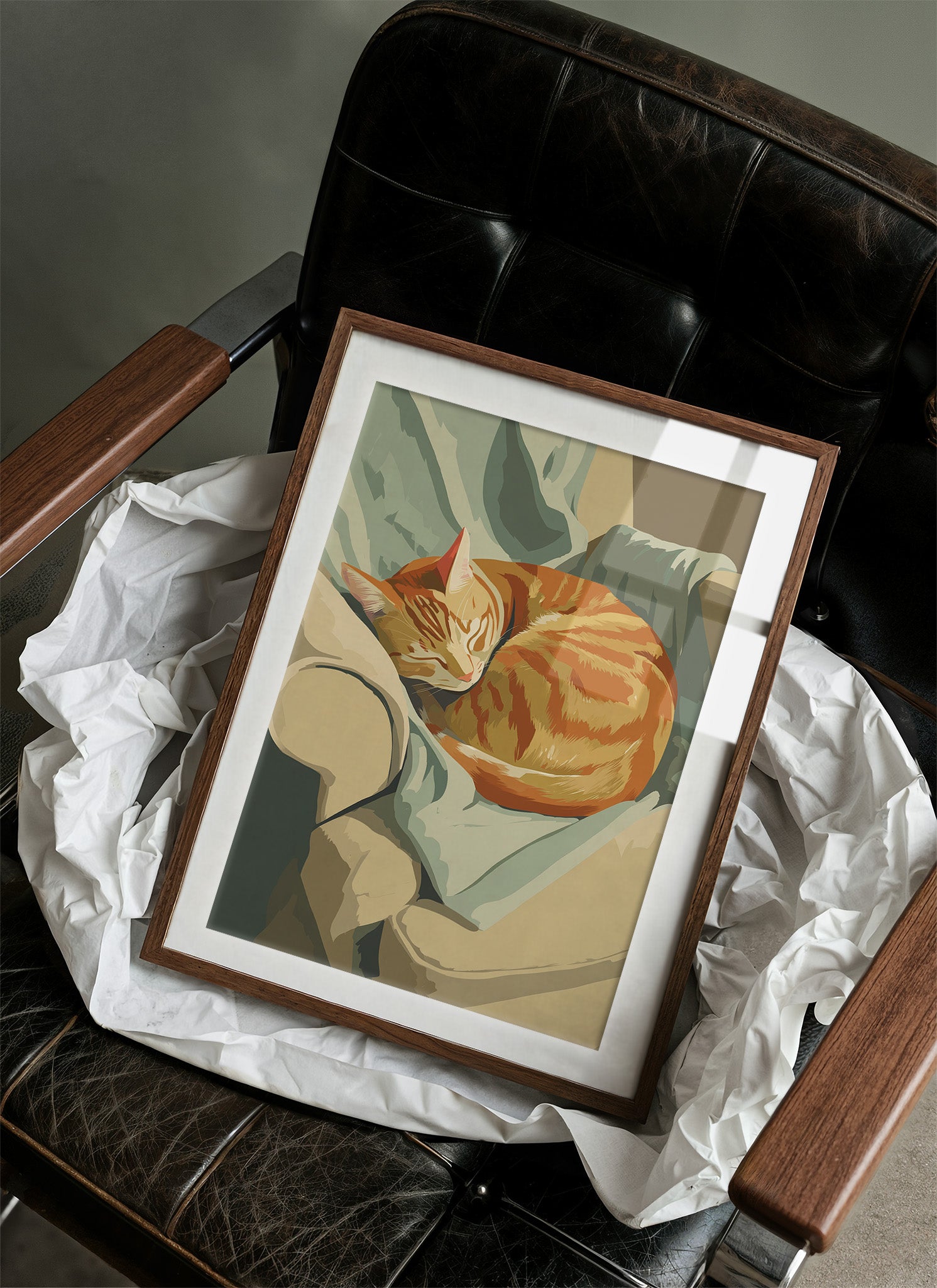 A ginger tabby cat curls into a perfect circle of contentment, nestled among soft cream and sage-green bedding that folds around its sleeping form. The warm orange and amber stripes of its fur contrast beautifully against the cool, muted tones of the fabric, while gentle afternoon light bathes the peaceful scene in golden warmth. This minimalist composition captures the quiet beauty of everyday moments with clean lines and a soothing color palette that feels both contemporary and timeless. Perfect for a bedroom where tranquility and comfort take center stage.