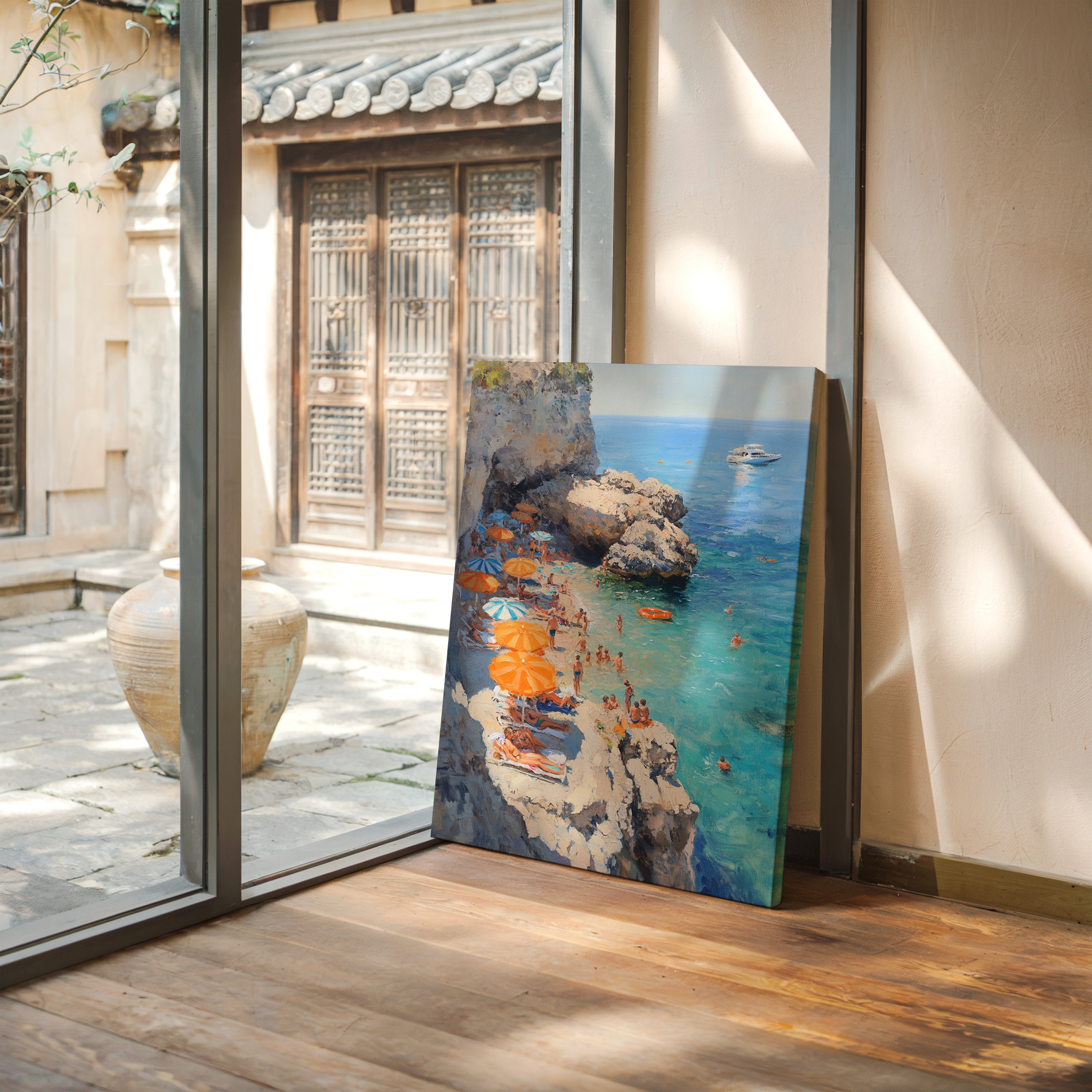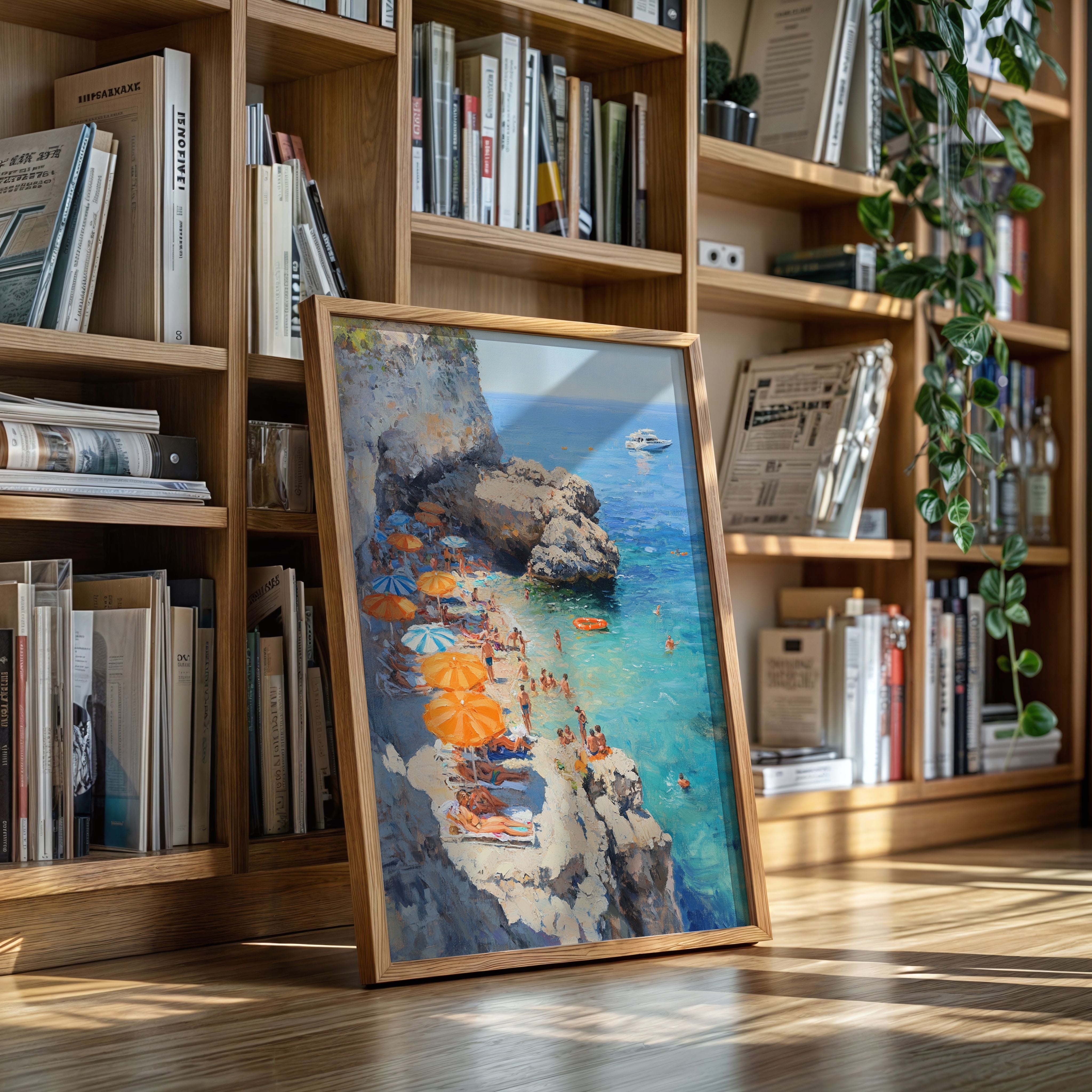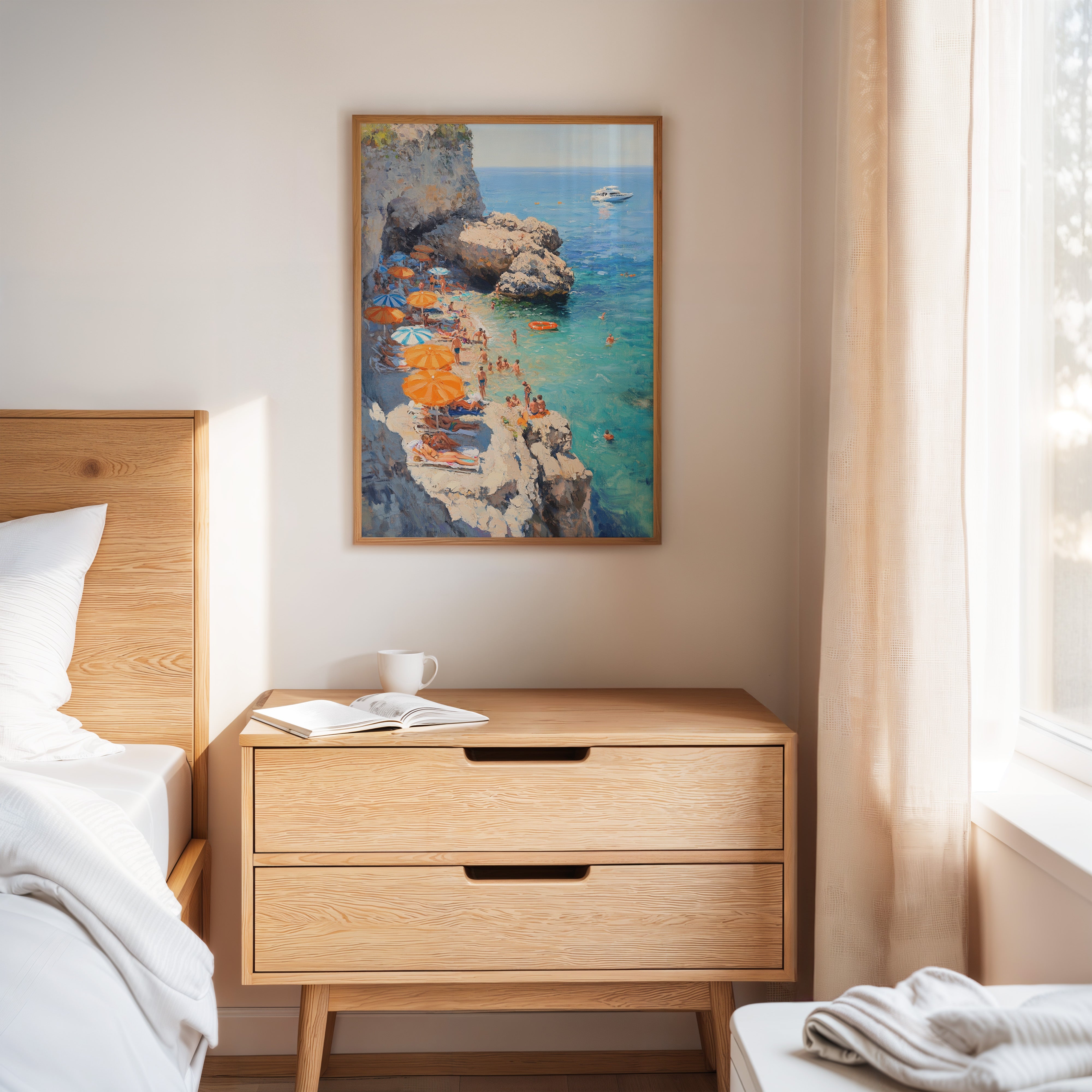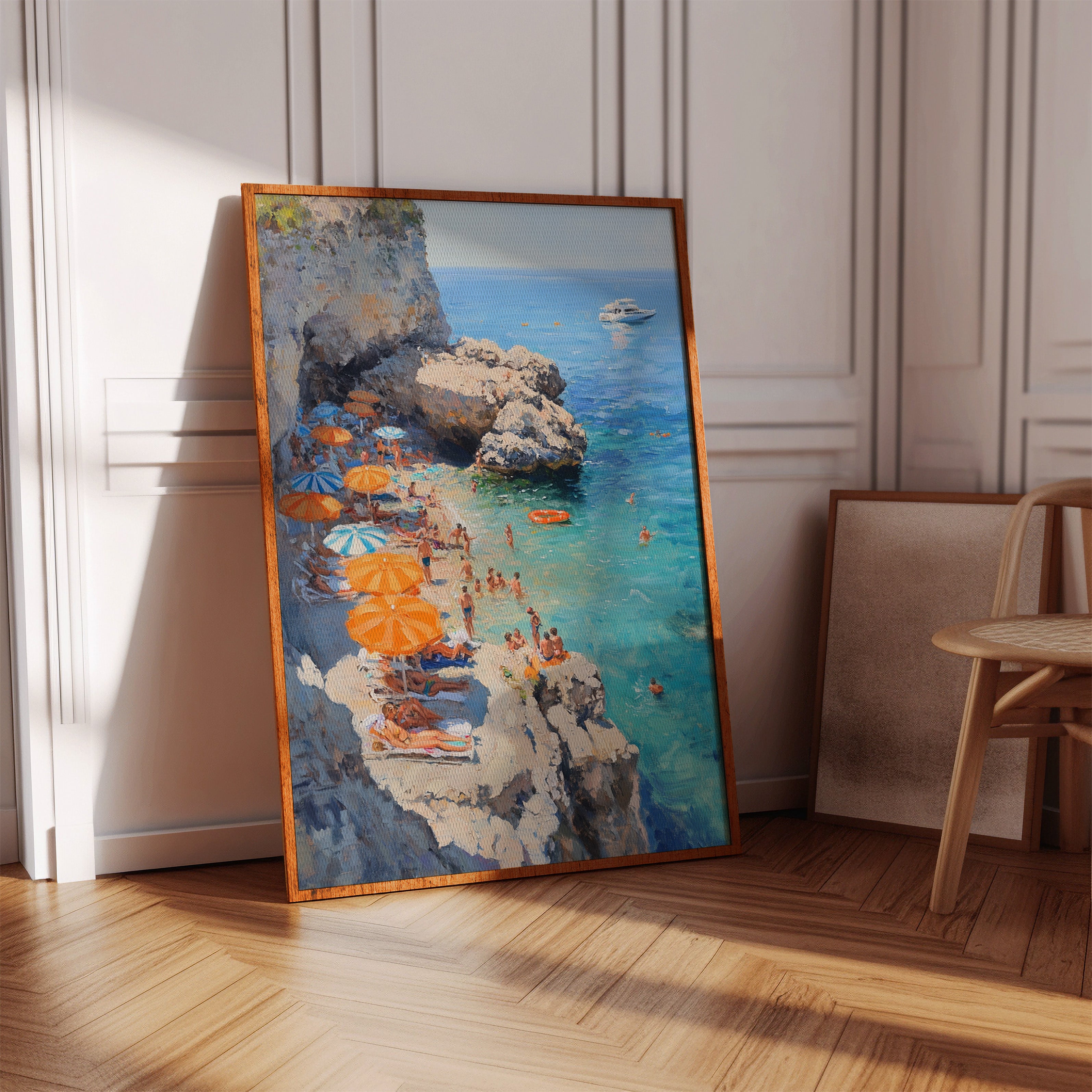 Sunlight dances across turquoise waters as vibrant orange and blue umbrellas dot the rocky coastline. The limestone cliffs create a natural sanctuary where swimmers and sunbathers find refuge from the summer heat. Crystal-clear waters merge with deeper blues on the horizon, where a pristine white yacht floats like a distant dream. This Mediterranean scene captures the essence of carefree summer days, with beachgoers creating their own paradise among the dramatic coastal formations. Perfect for bringing a sense of eternal summer and coastal sophistication to living rooms or sun-filled breakfast nooks.