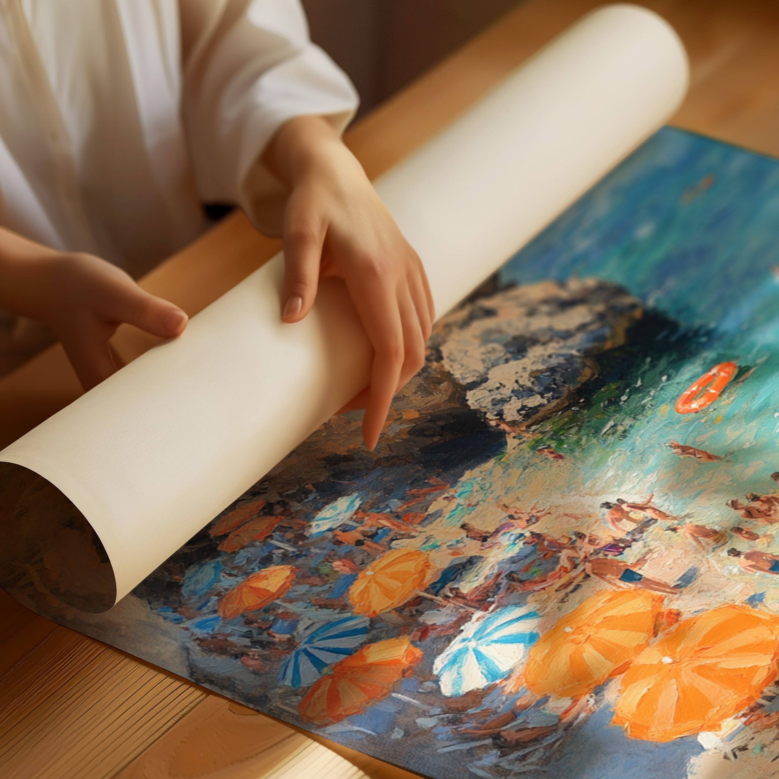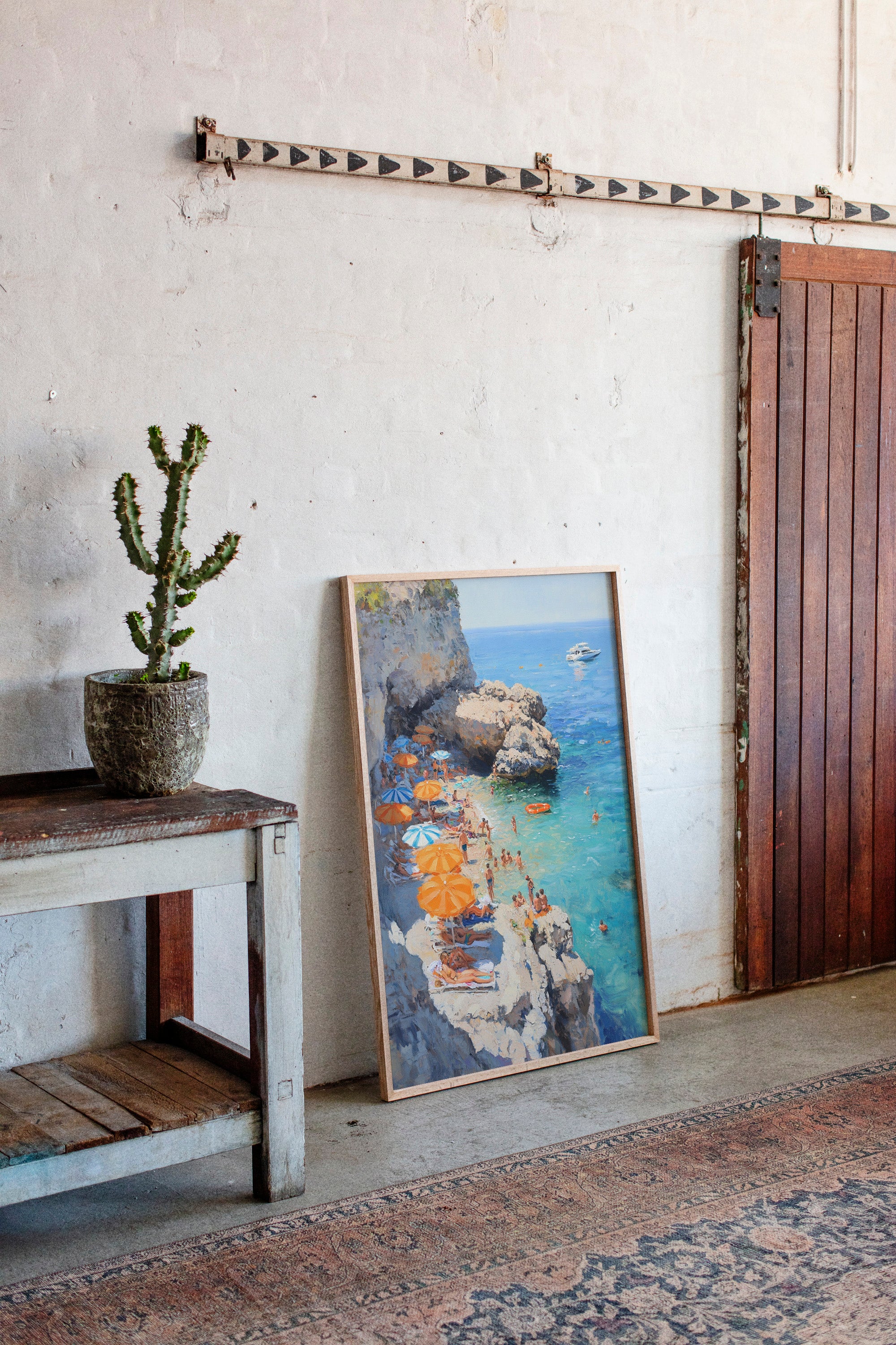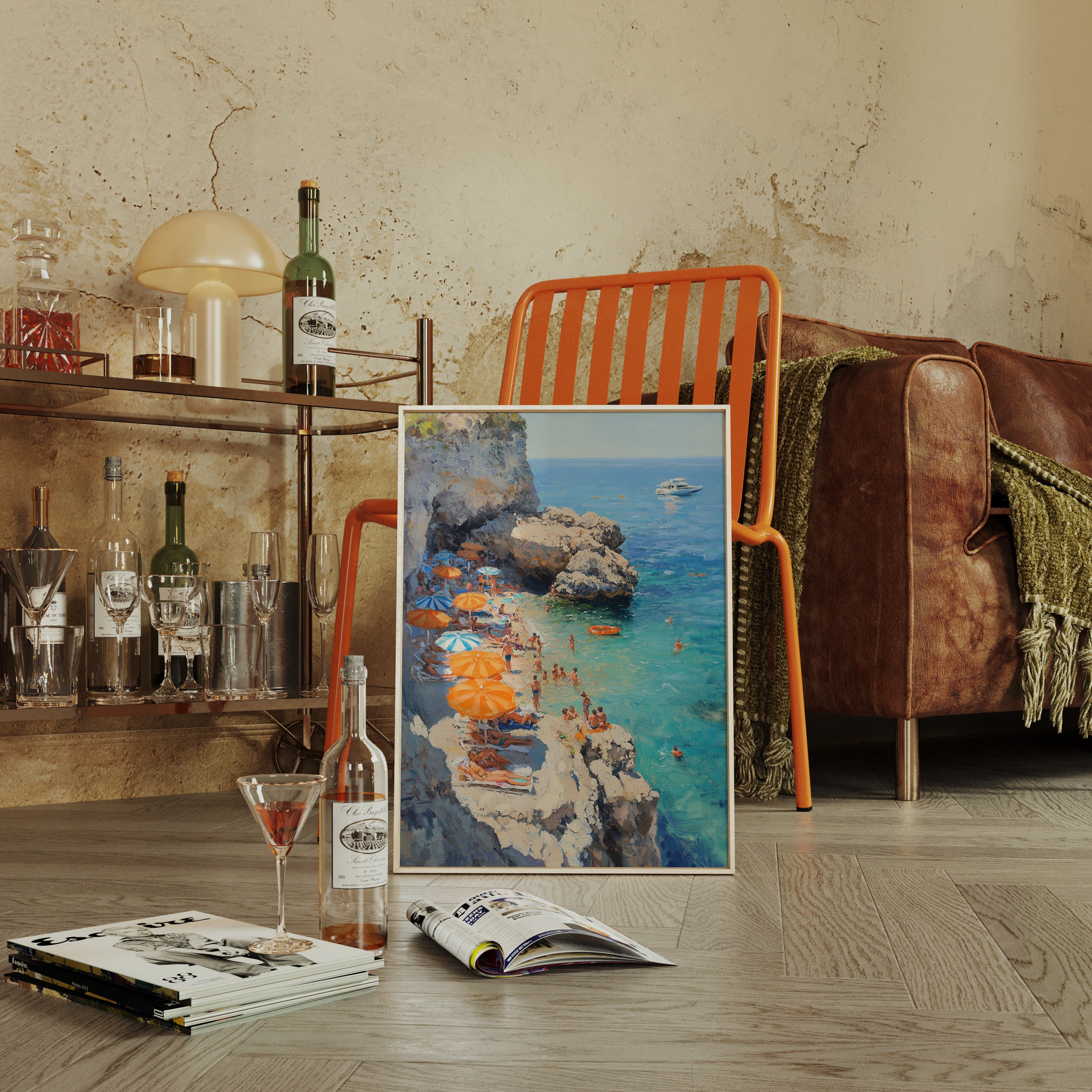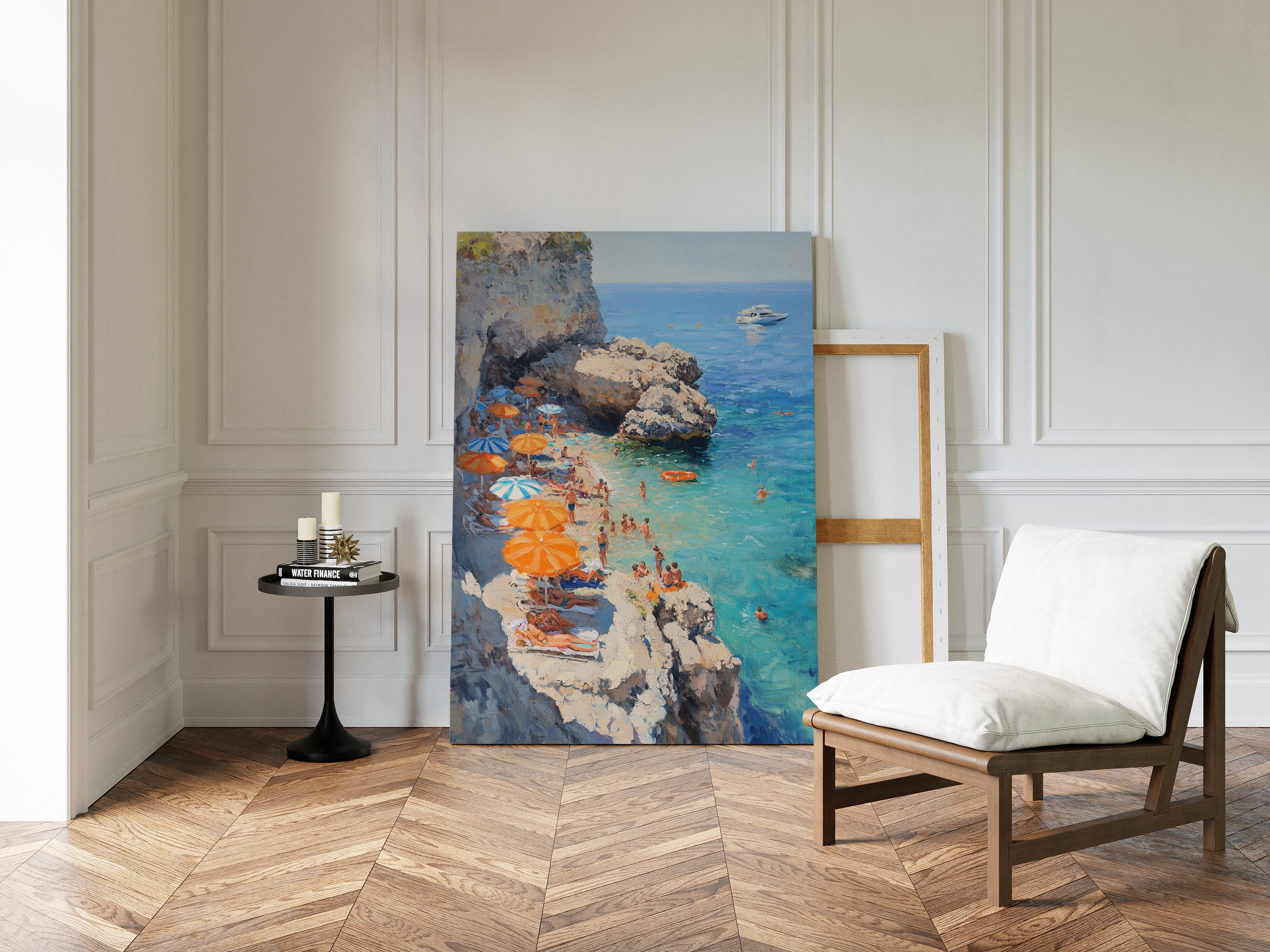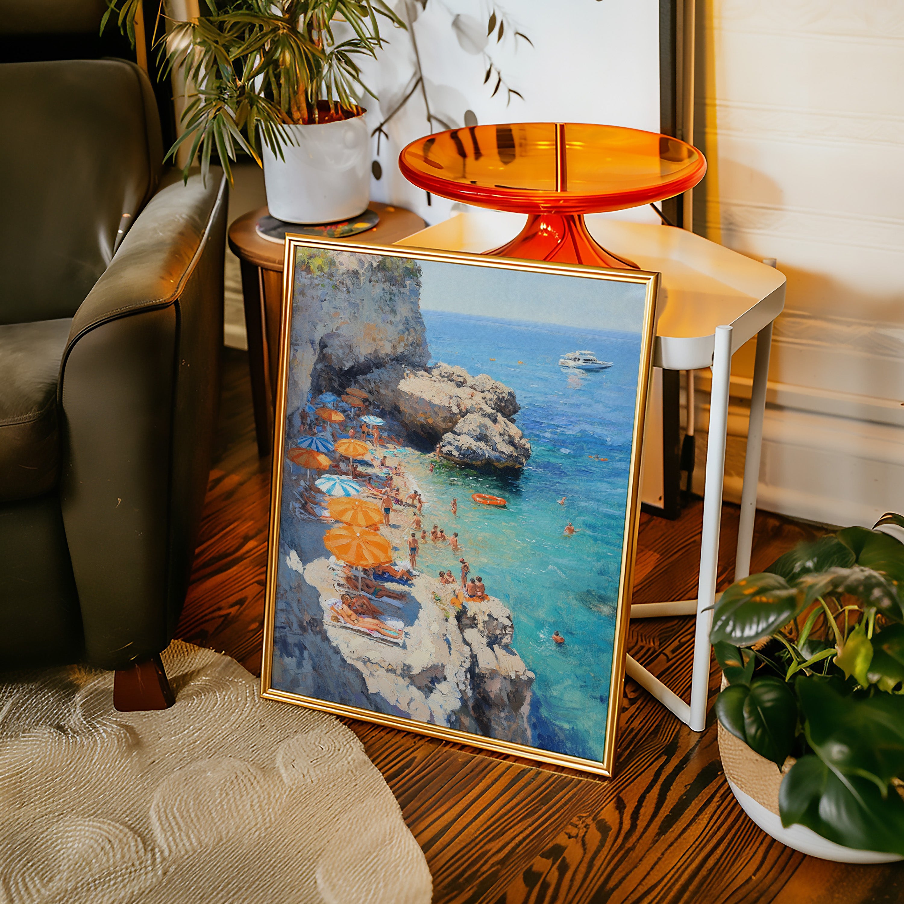 Sunlight dances across turquoise waters as vibrant orange and blue umbrellas dot the rocky coastline. The limestone cliffs create a natural sanctuary where swimmers and sunbathers find refuge from the summer heat. Crystal-clear waters merge with deeper blues on the horizon, where a pristine white yacht floats like a distant dream. This Mediterranean scene captures the essence of carefree summer days, with beachgoers creating their own paradise among the dramatic coastal formations. Perfect for bringing a sense of eternal summer and coastal sophistication to living rooms or sun-filled breakfast nooks.