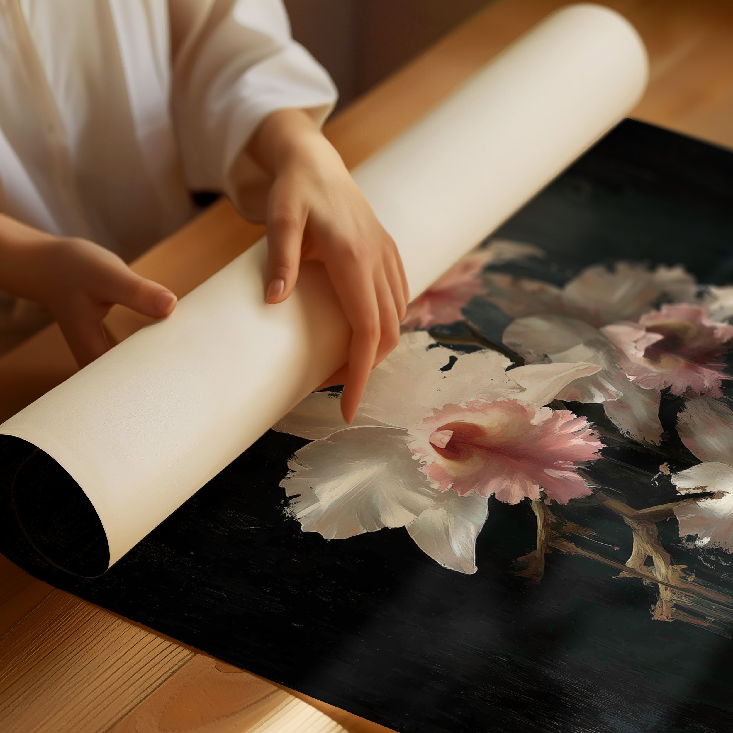 Delicate pink and white orchids float against an inky backdrop, their petals catching light like secret confessions in a darkened room. The dramatic contrast between the luminous blooms and the deep, textured darkness creates a haunting elegance, with gentle drips of paint suggesting tears or morning dew suspended in time. This striking botanical portrait stands confidently against classic black paneling, where sunlight plays across herringbone floors in geometric harmony.
