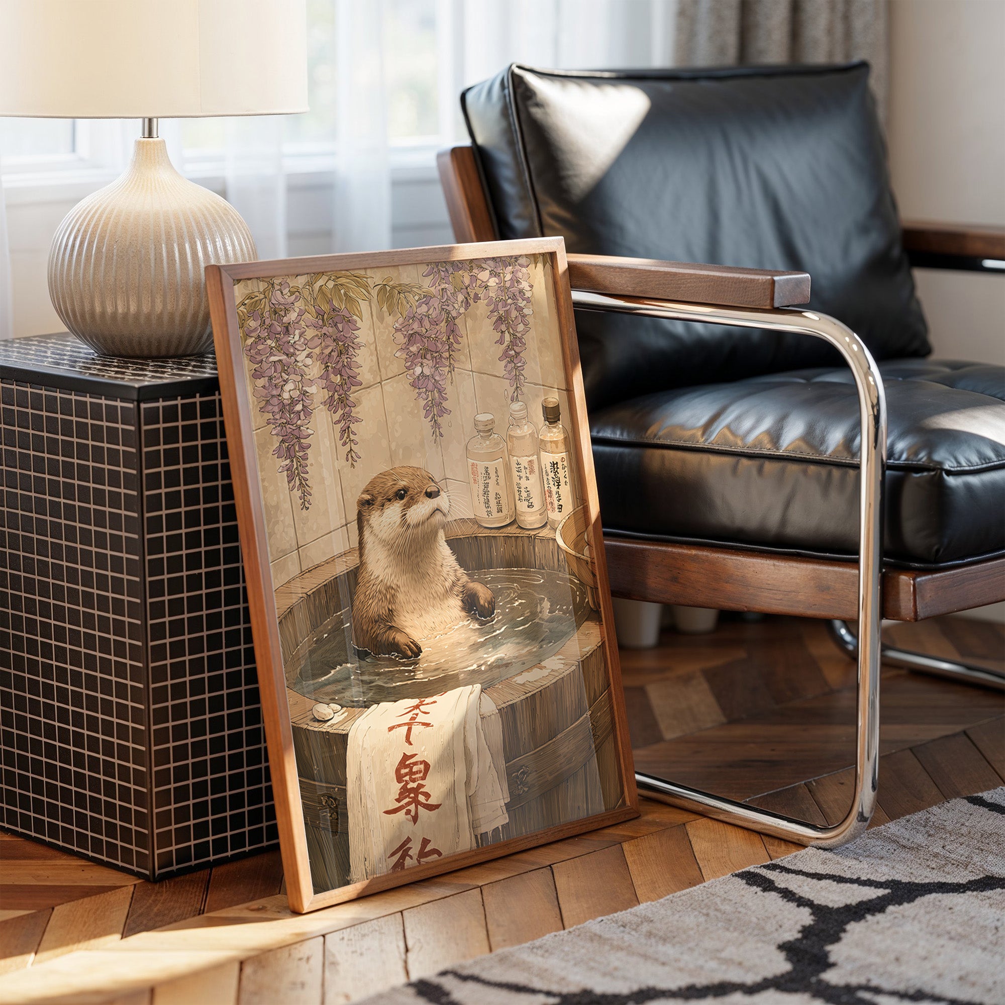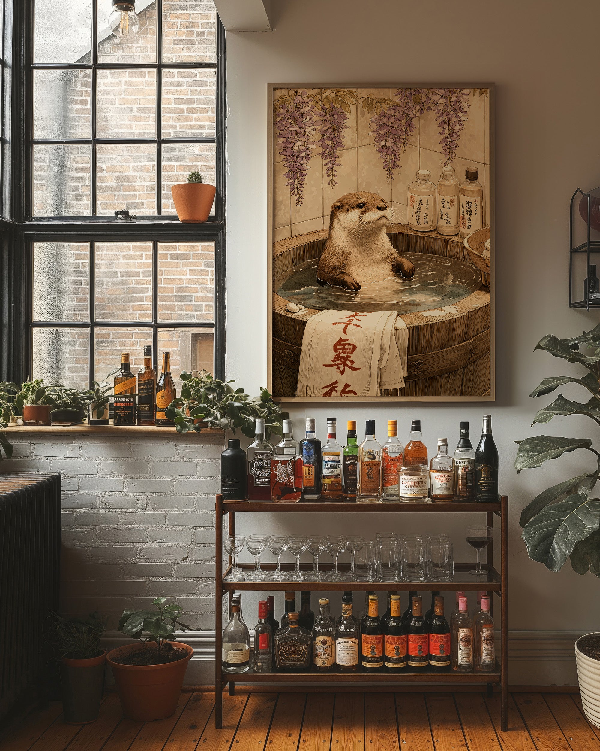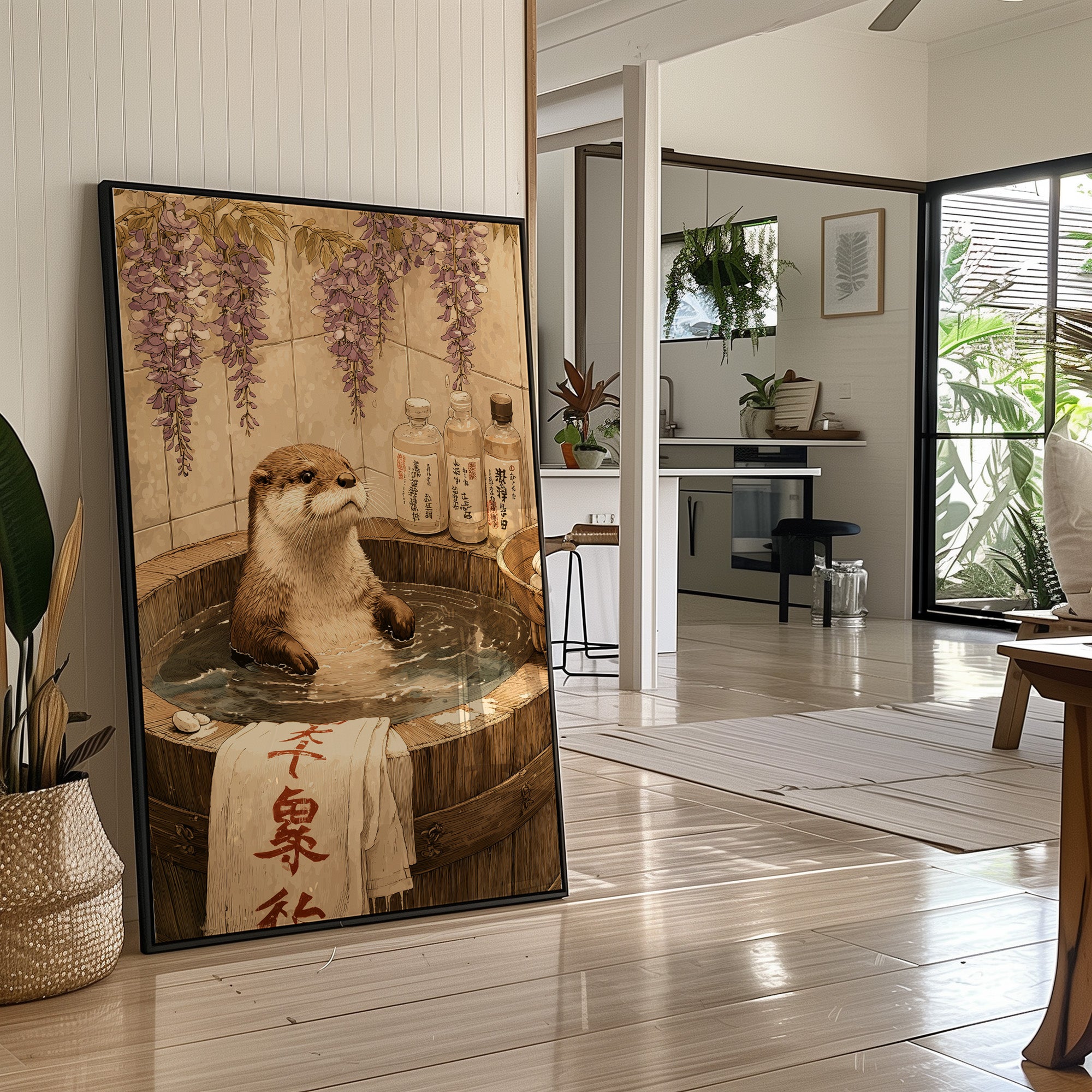 A whimsical scene unfolds as a content otter lounges in a traditional wooden soaking tub, surrounded by the delicate cascade of purple wisteria blooms. The warm sepia tones and Japanese aesthetic create an atmosphere of tranquil luxury, where sake bottles stand sentinel against a backdrop of flowing florals. The composition masterfully balances playful charm with sophisticated Asian-inspired elements, telling a story of peaceful indulgence and cultural fusion. Perfect for adding a touch of imaginative elegance to a home bar, dining room, or any space seeking to blend humor with refined artistic sensibility.