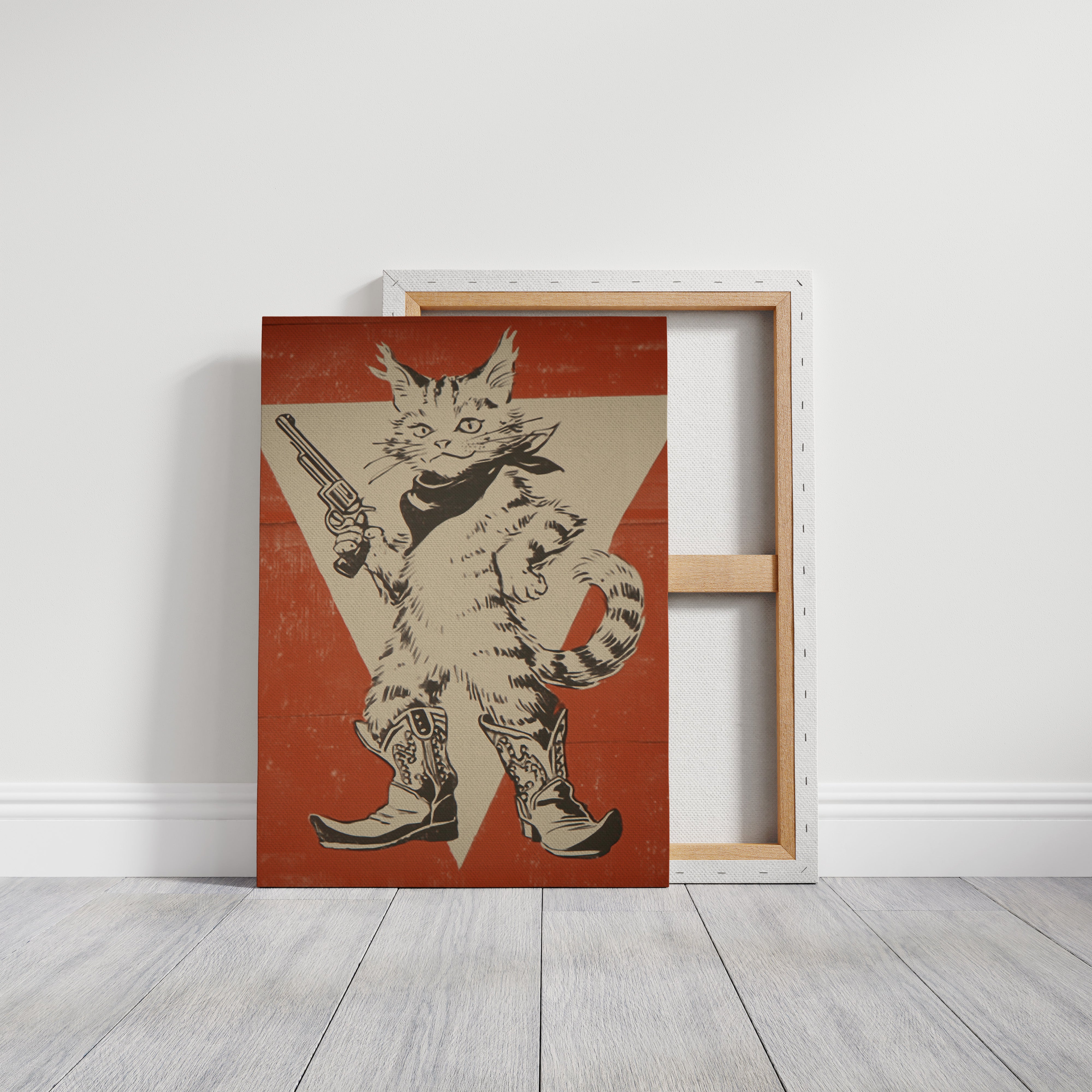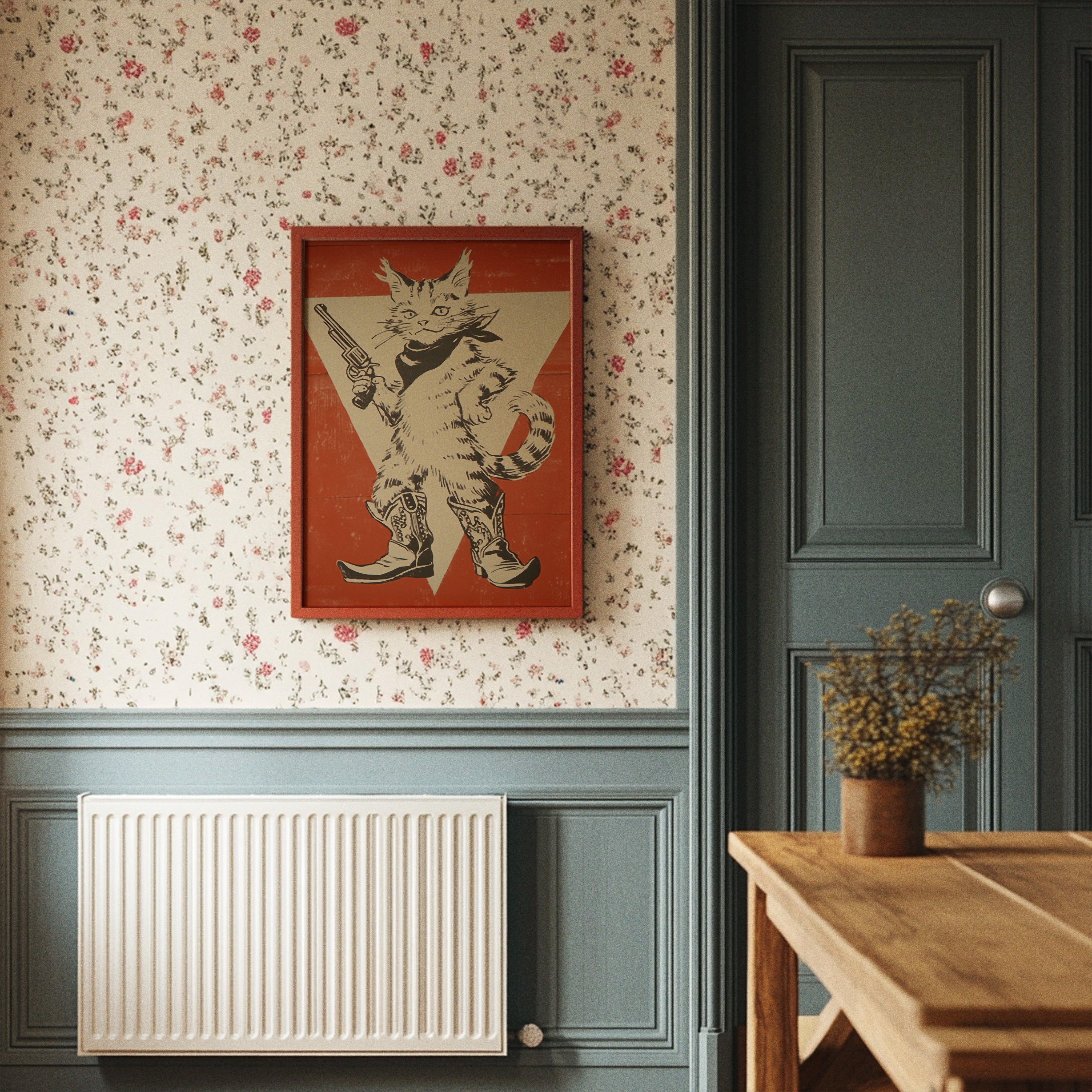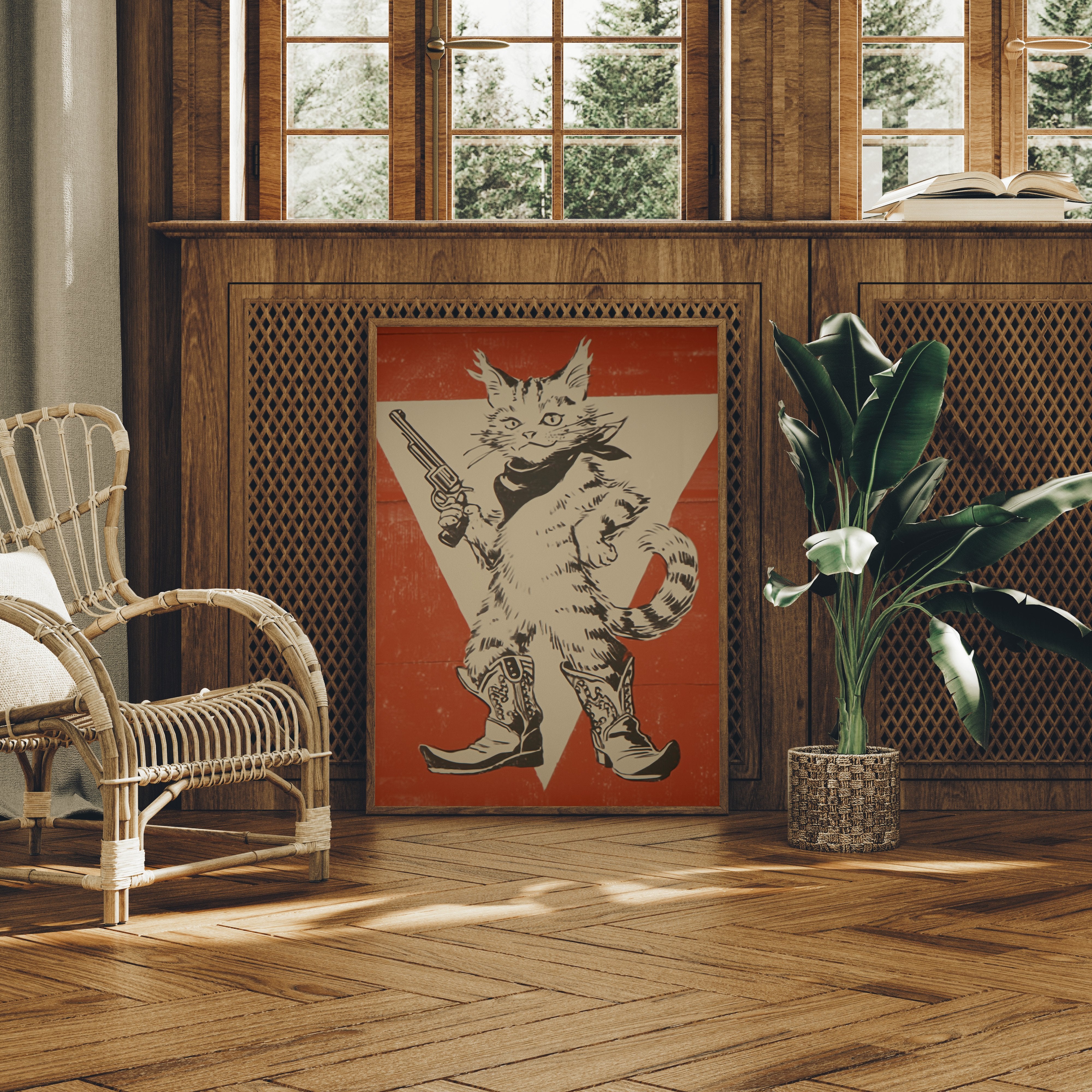 A mischievous feline stands tall in weathered cowboy boots, brandishing a revolver with unmistakable swagger against a bold red backdrop. This playful piece from our Contemporary collection merges whimsical charm with vintage western aesthetics. Bold black and white linework captures every detail, from the cat's confident expression to the intricate stitching on the boots, while the geometric composition adds modern edge to classic americana. The striking contrast and pop art sensibility make this piece an instant conversation starter. Perfect for adding personality to a home office or bringing unexpected wit to a modern dining space. Its blend of humor and style creates an atmosphere of sophisticated fun wherever it's displayed.
