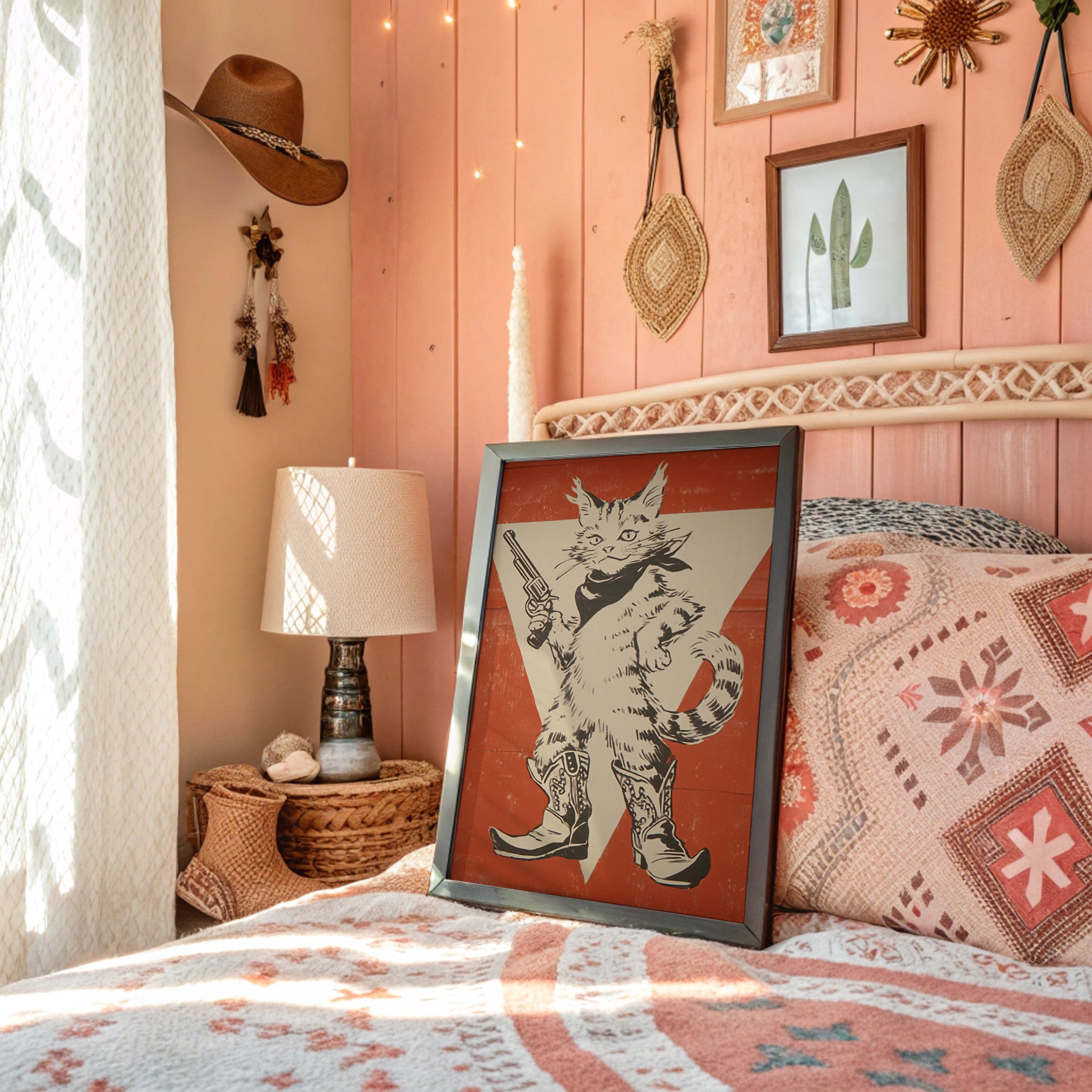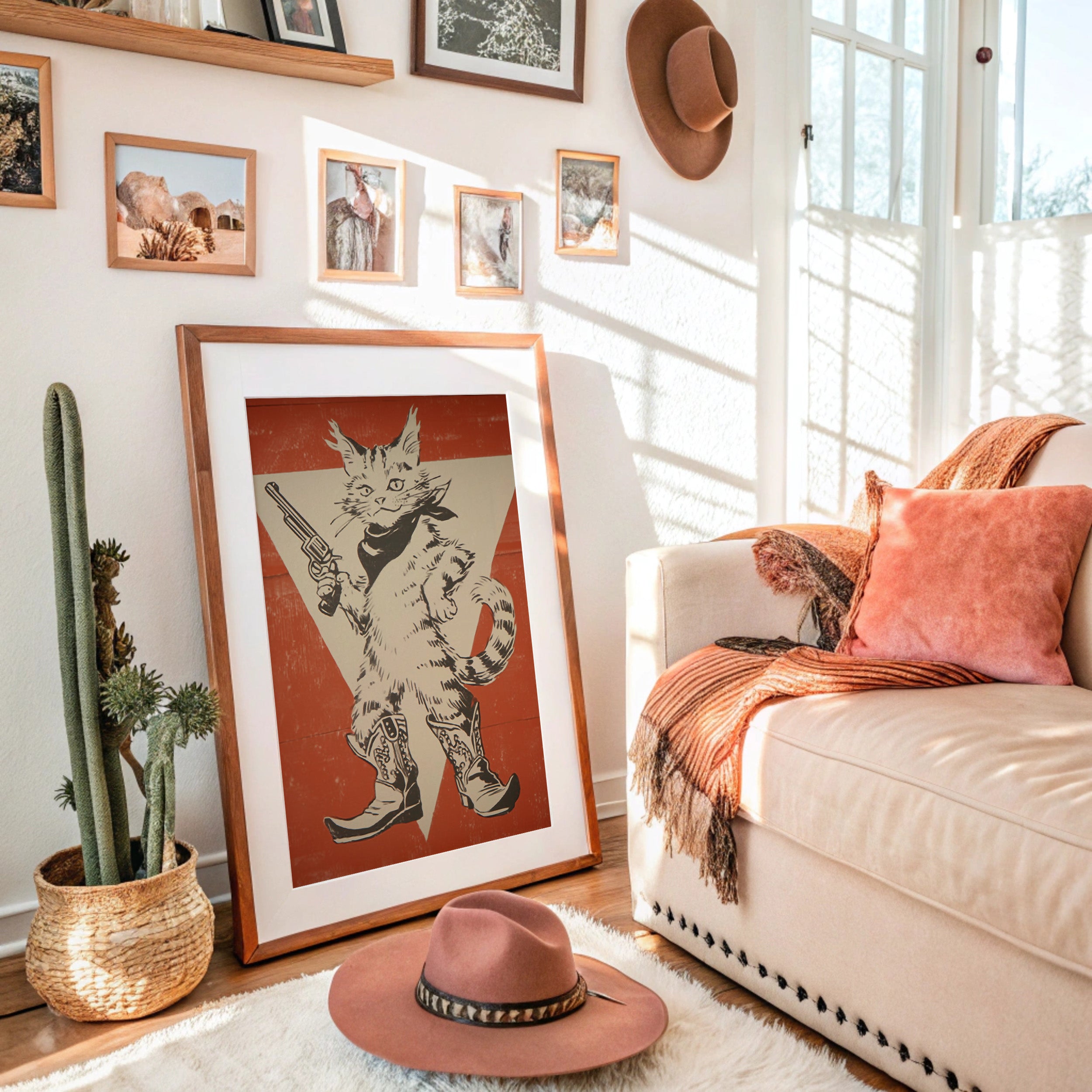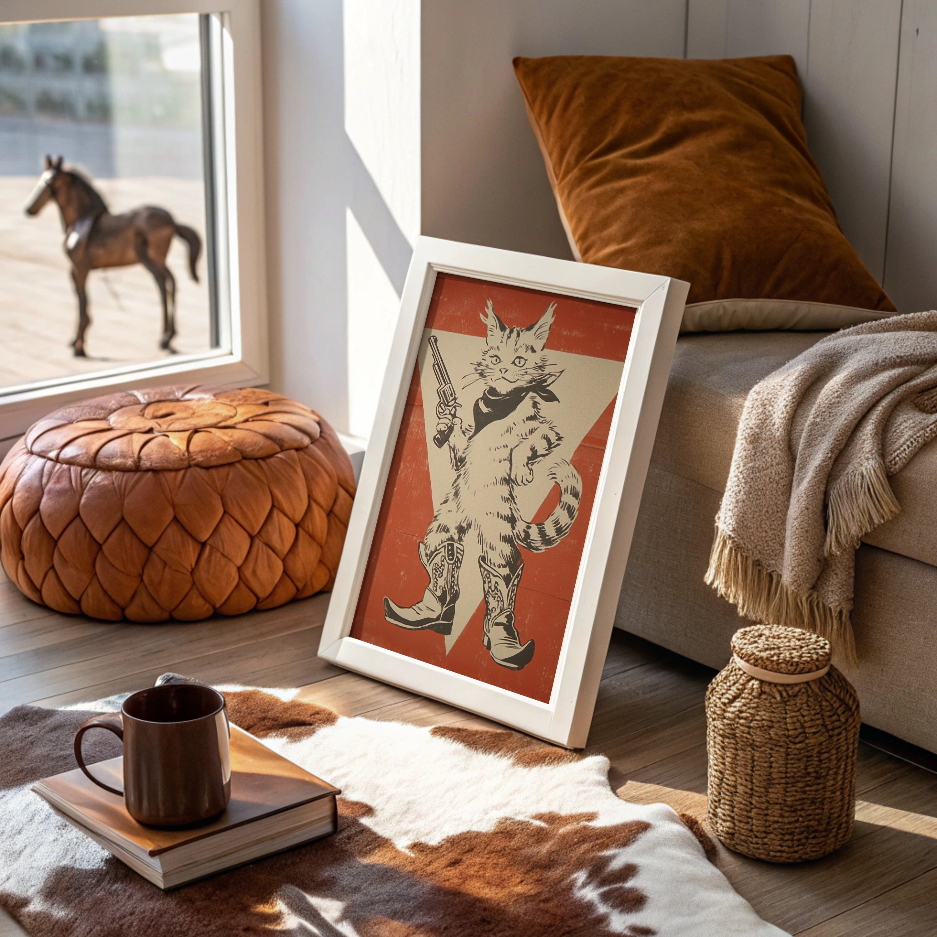 A mischievous feline stands tall in weathered cowboy boots, brandishing a revolver with unmistakable swagger against a bold red backdrop. This playful piece from our Contemporary collection merges whimsical charm with vintage western aesthetics. Bold black and white linework captures every detail, from the cat's confident expression to the intricate stitching on the boots, while the geometric composition adds modern edge to classic americana. The striking contrast and pop art sensibility make this piece an instant conversation starter. Perfect for adding personality to a home office or bringing unexpected wit to a modern dining space. Its blend of humor and style creates an atmosphere of sophisticated fun wherever it's displayed.