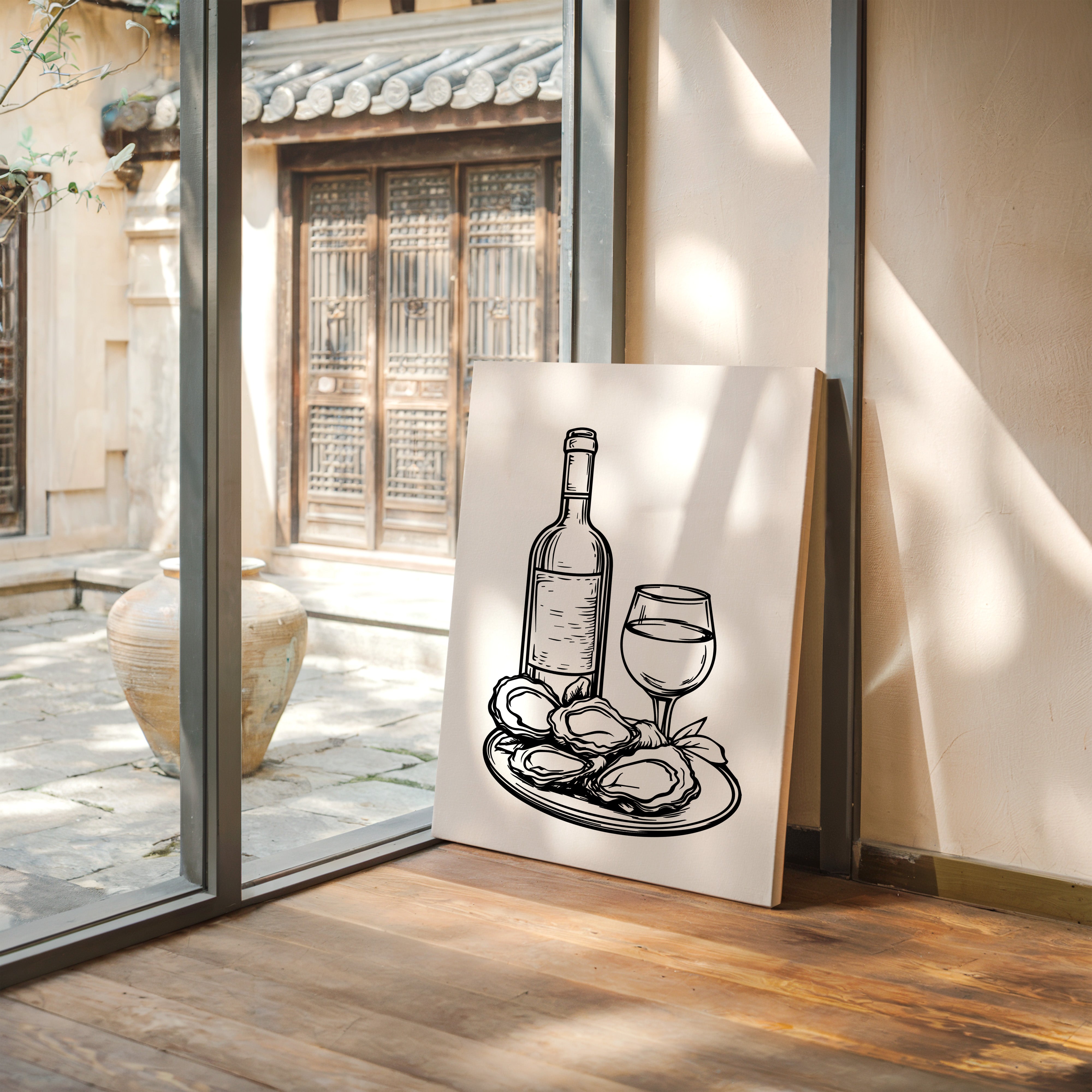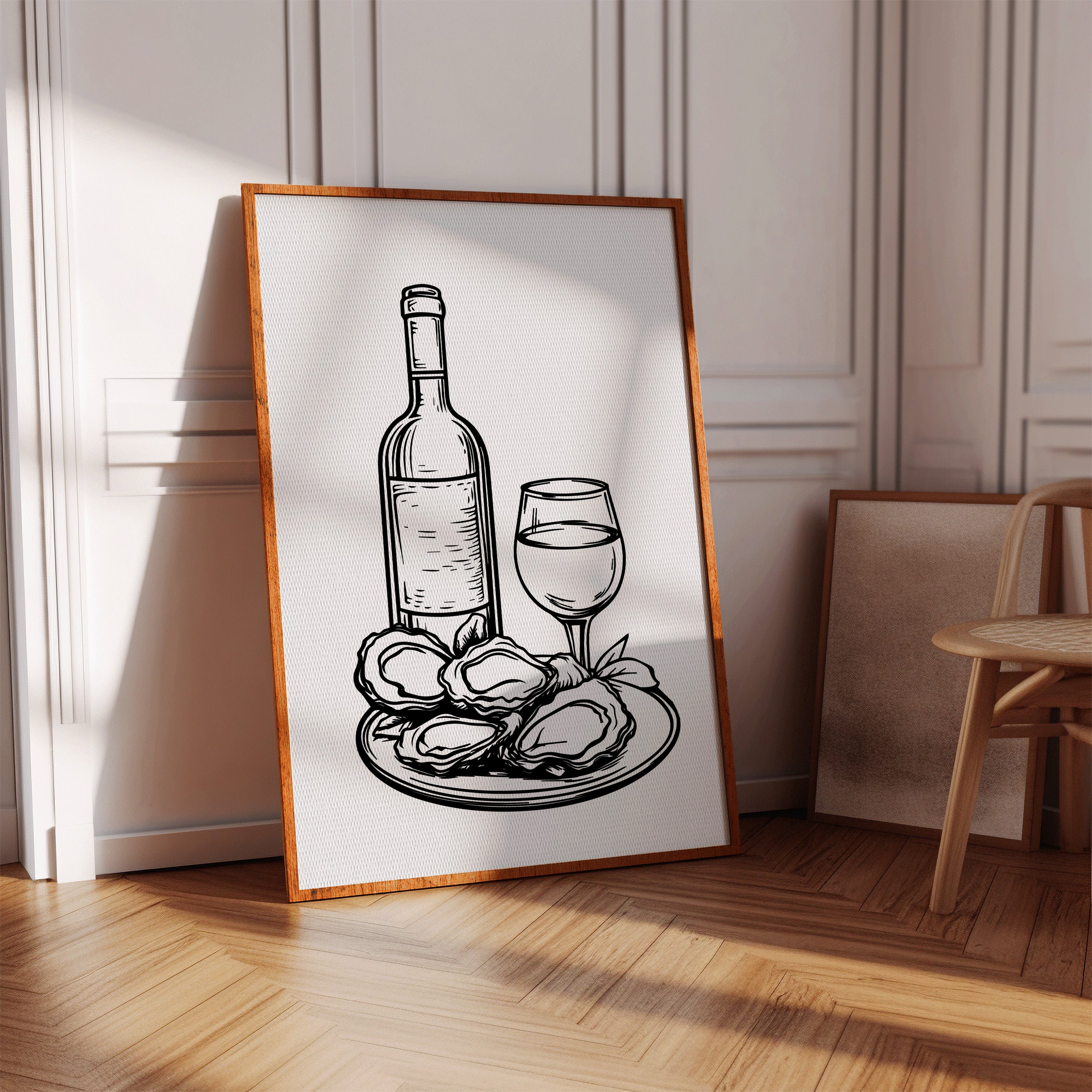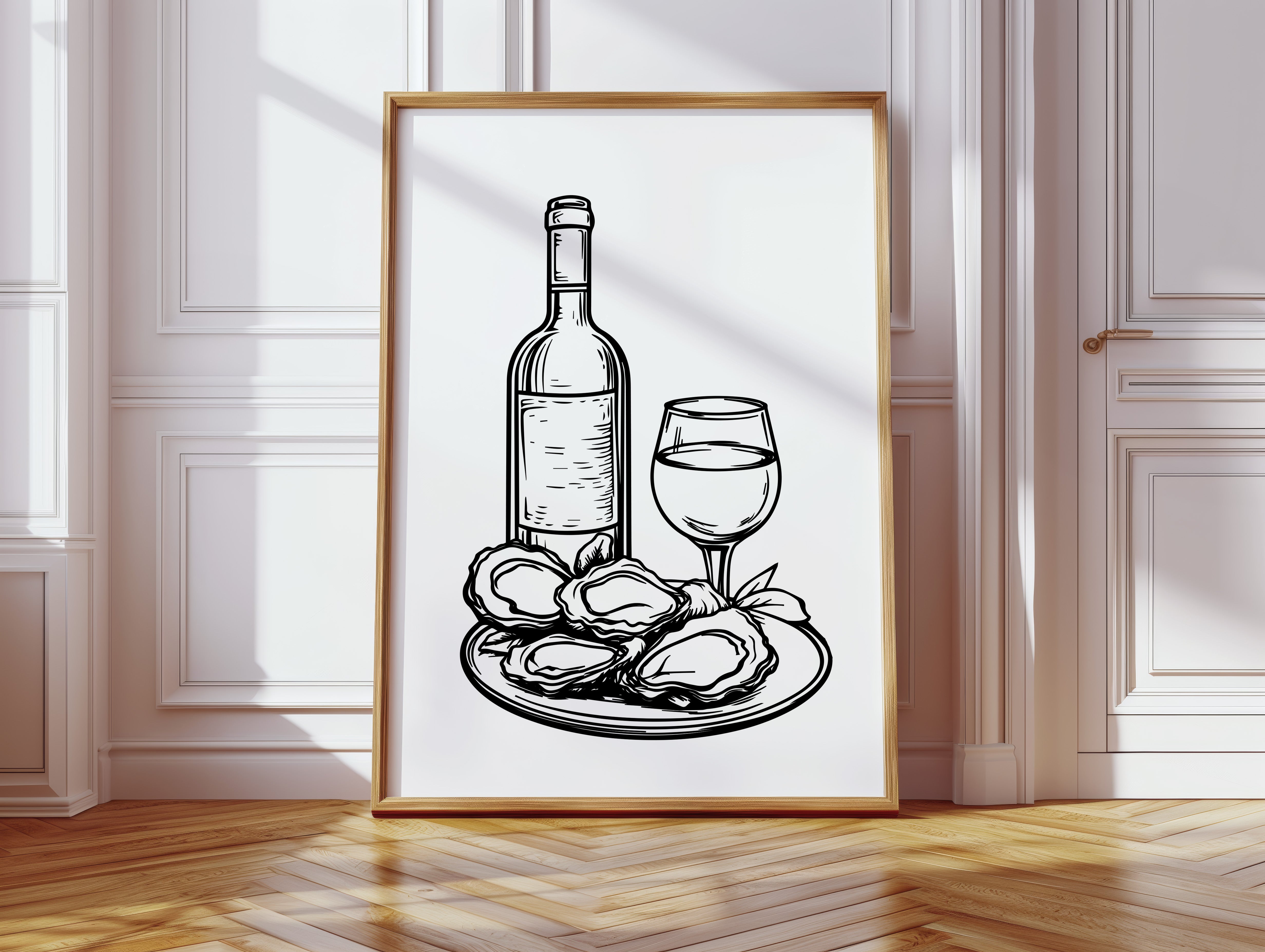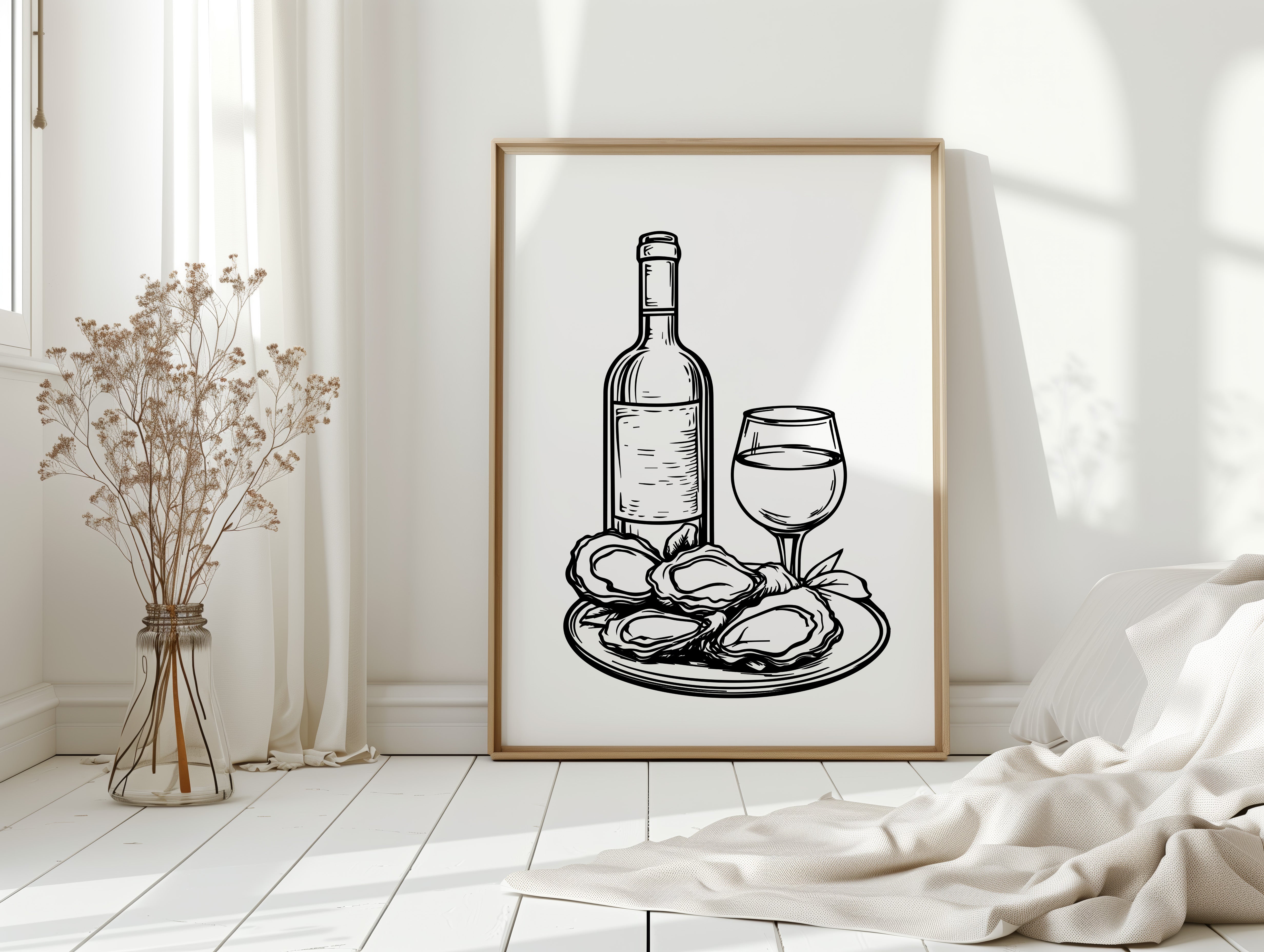 A plate of freshly shucked oysters glistens beside a perfectly poured glass of white wine, capturing the essence of seaside sophistication. This striking black and white illustration from our Contemporary collection brings classic culinary elegance to life through bold, decisive linework. The composition balances the organic shapes of the briny treasures against the refined geometry of bottle and stemware, while delicate details in the oysters' rippled shells create captivating visual texture. Perfect for dining rooms, wine cellars, or restaurant spaces seeking to evoke an elevated coastal ambiance. Each glance promises to spark memories of memorable meals shared with cherished company.