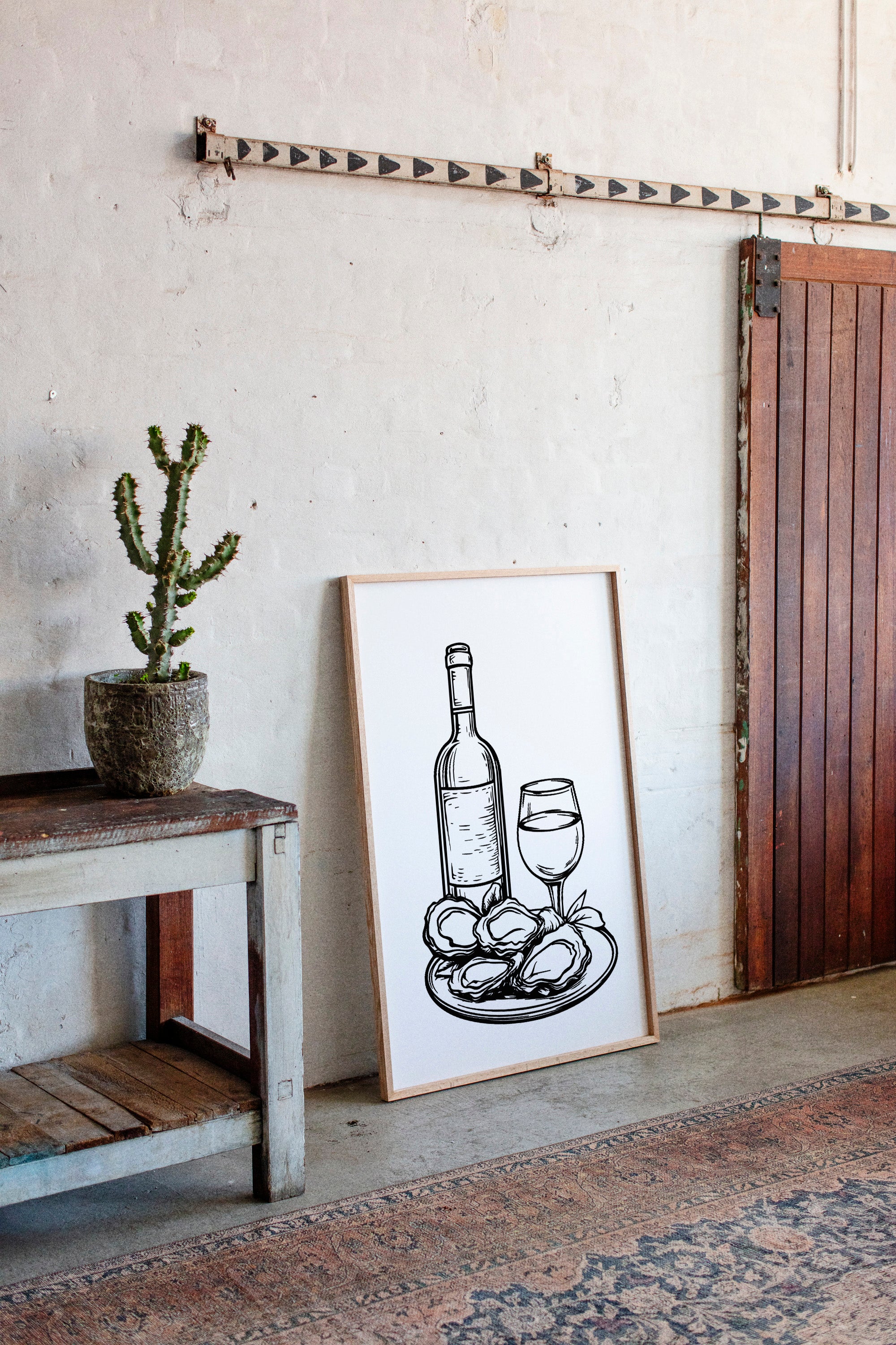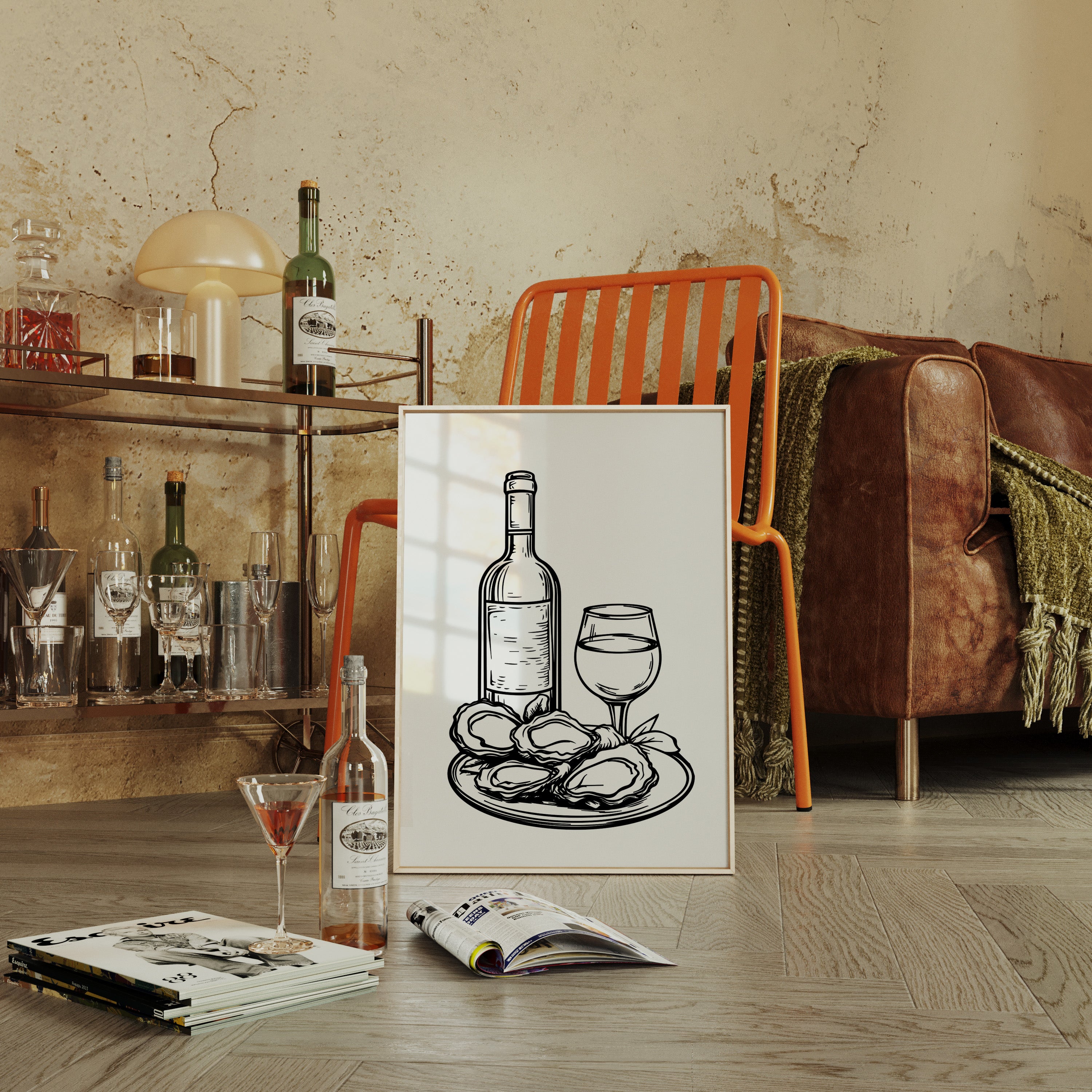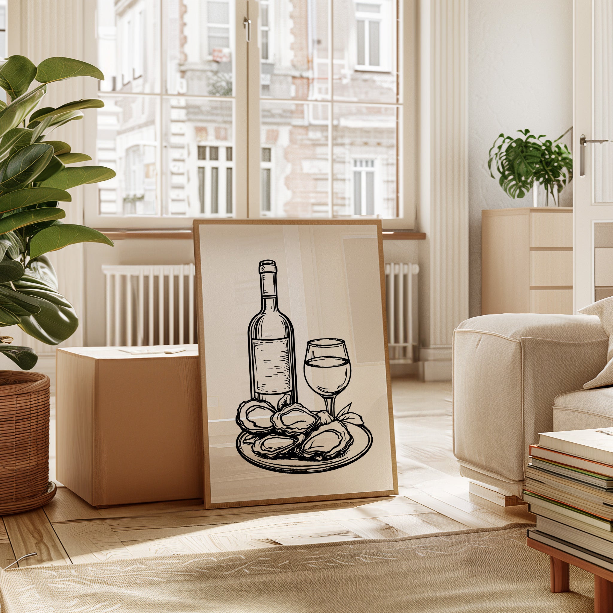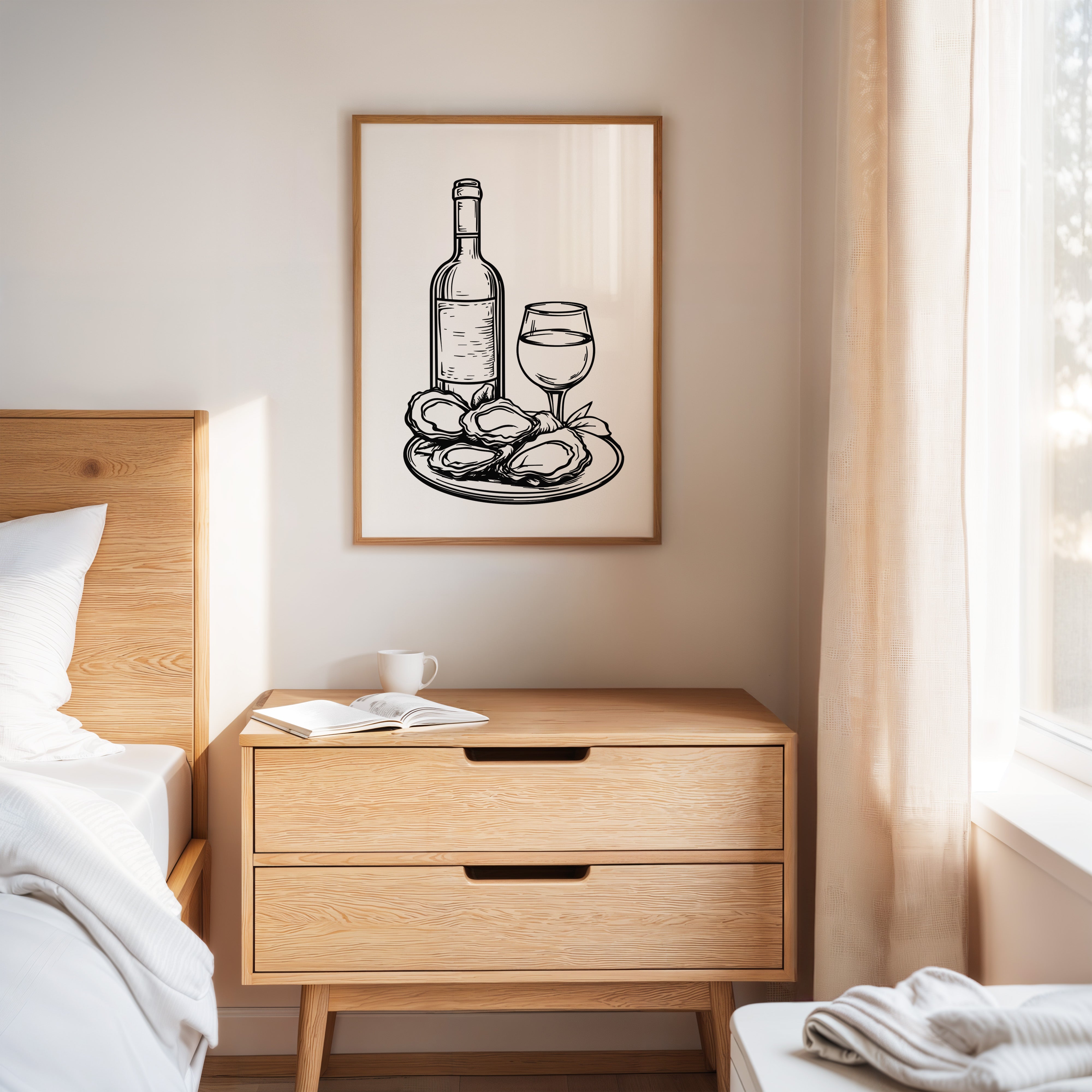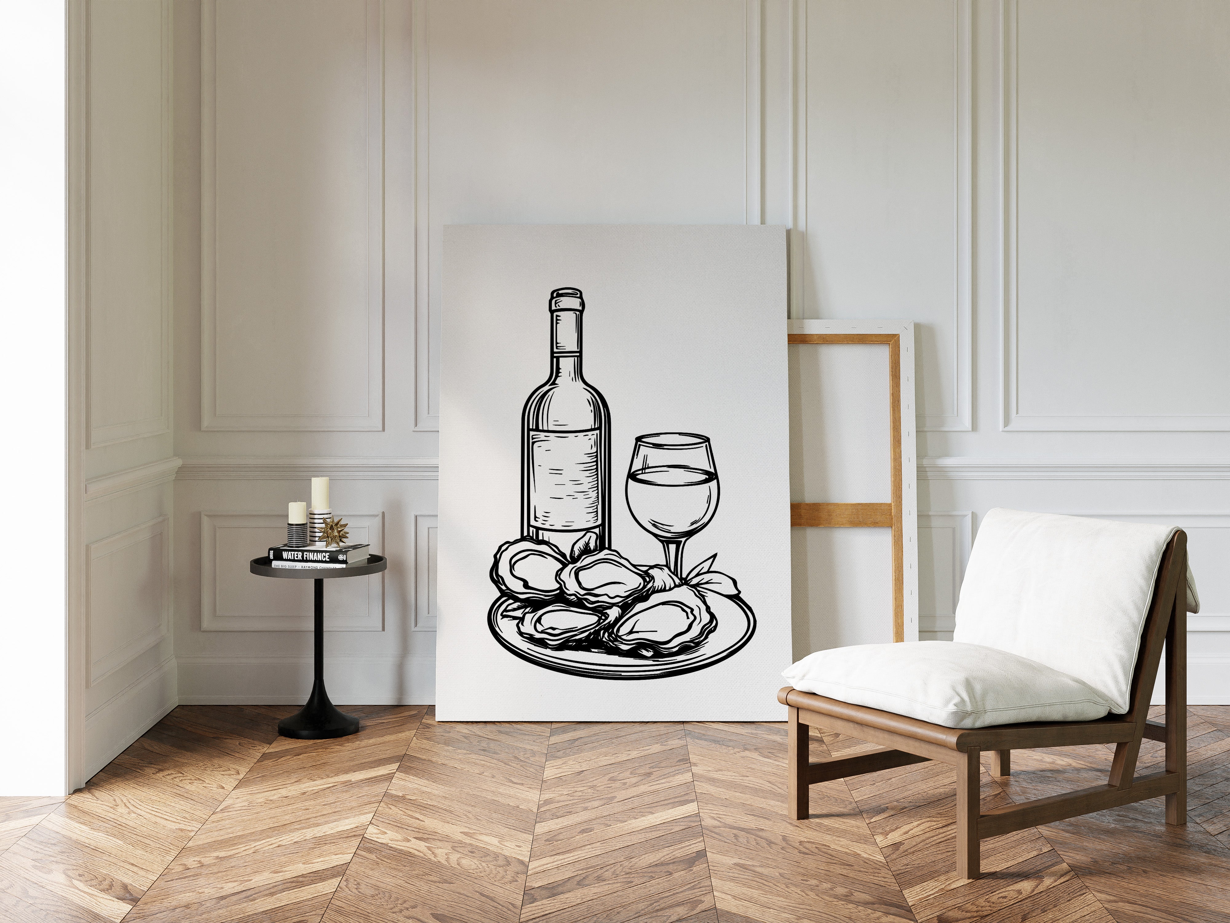 A plate of freshly shucked oysters glistens beside a perfectly poured glass of white wine, capturing the essence of seaside sophistication. This striking black and white illustration from our Contemporary collection brings classic culinary elegance to life through bold, decisive linework. The composition balances the organic shapes of the briny treasures against the refined geometry of bottle and stemware, while delicate details in the oysters' rippled shells create captivating visual texture. Perfect for dining rooms, wine cellars, or restaurant spaces seeking to evoke an elevated coastal ambiance. Each glance promises to spark memories of memorable meals shared with cherished company.