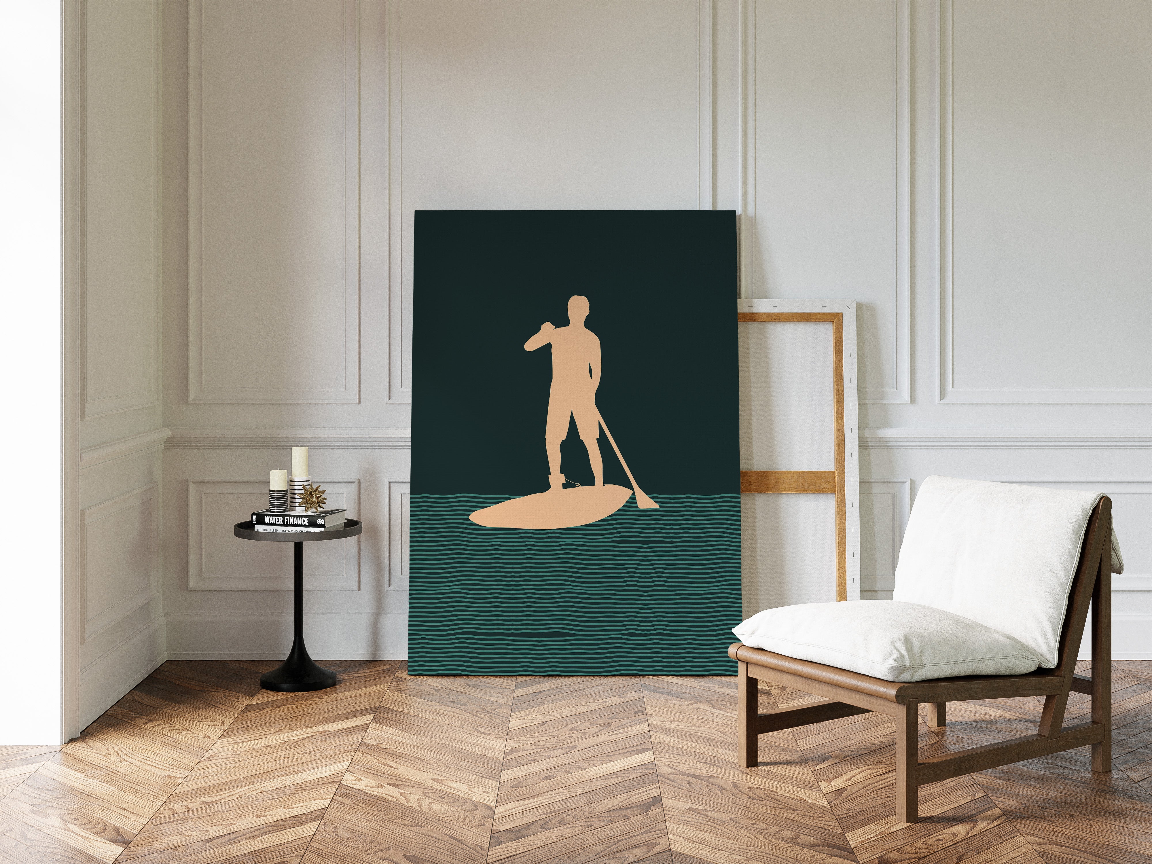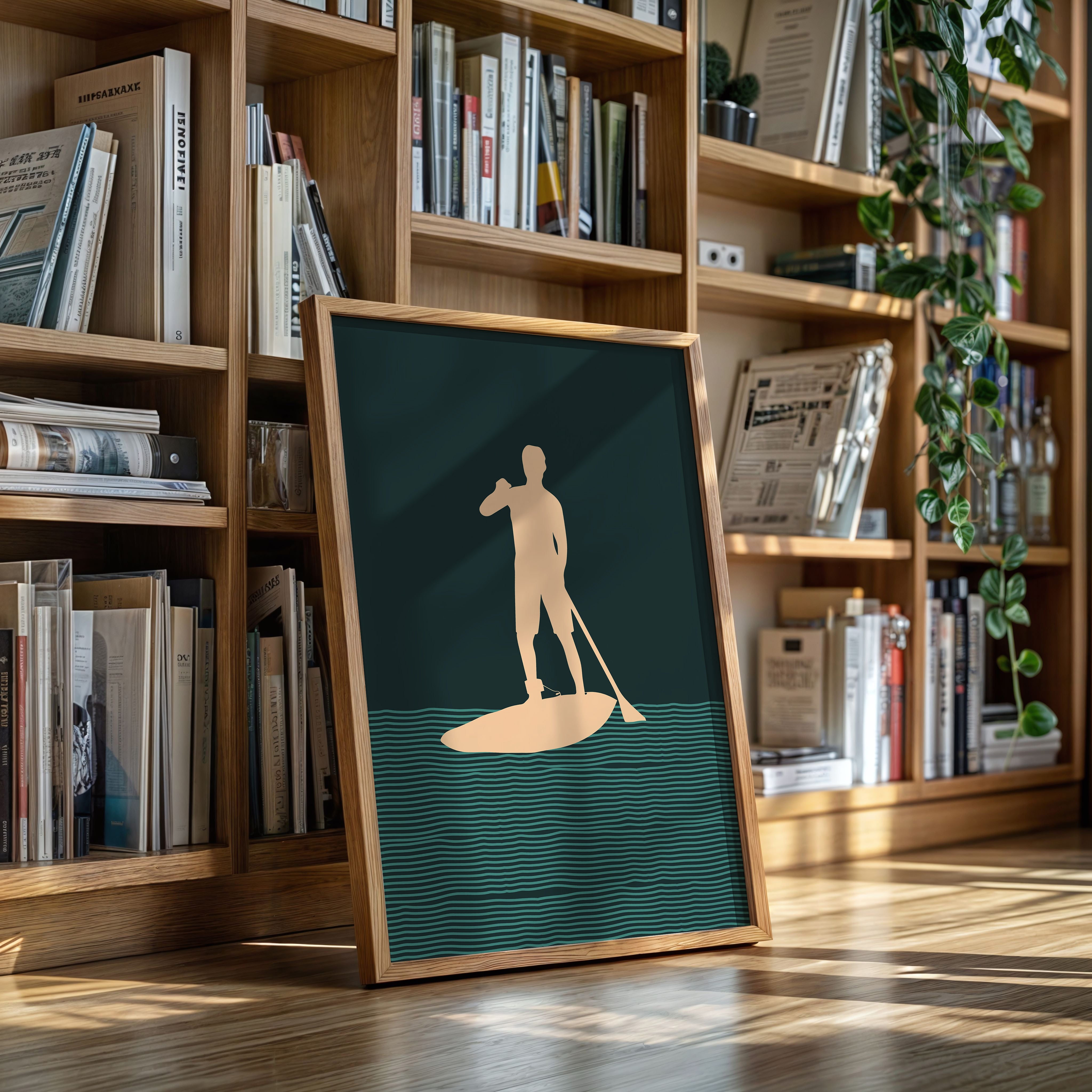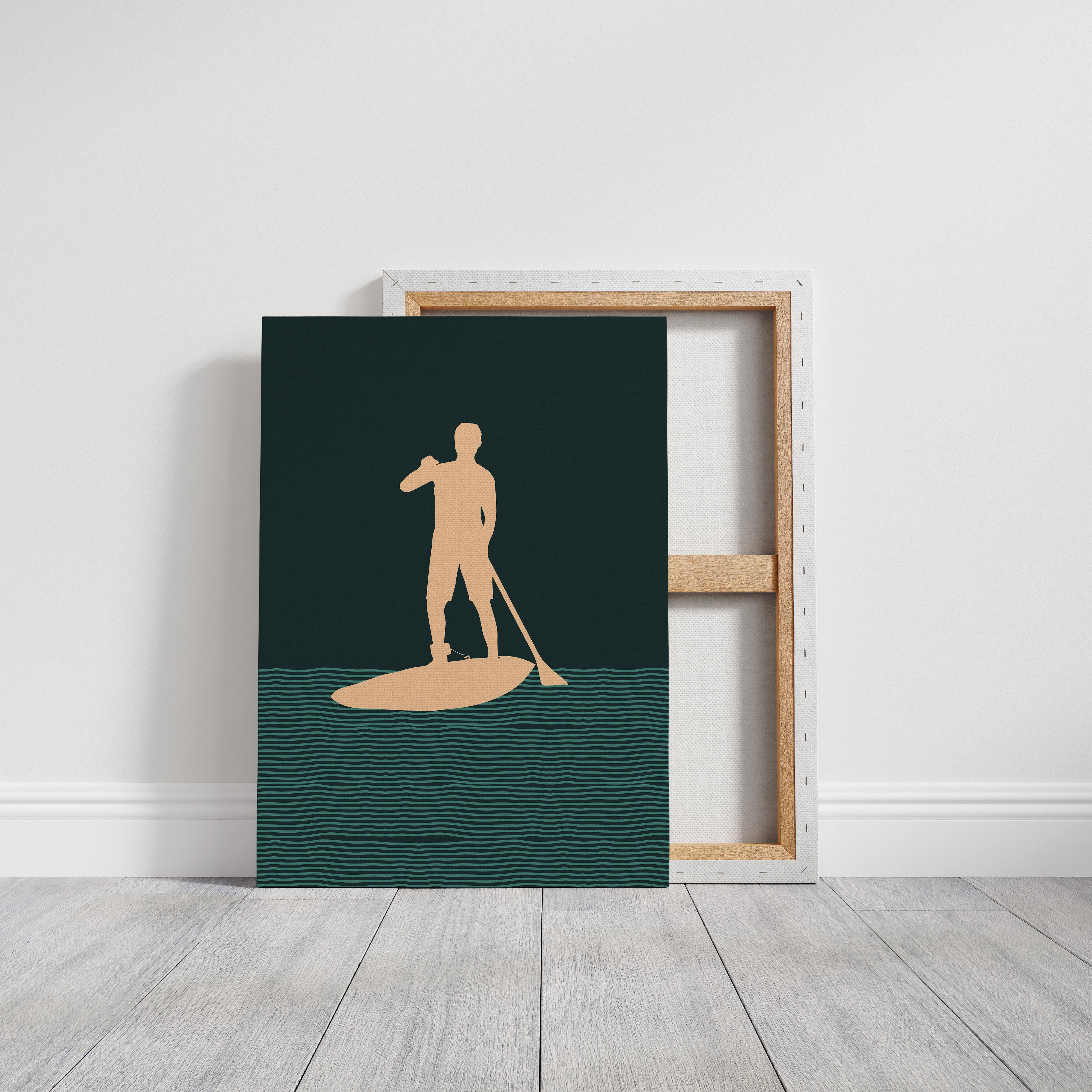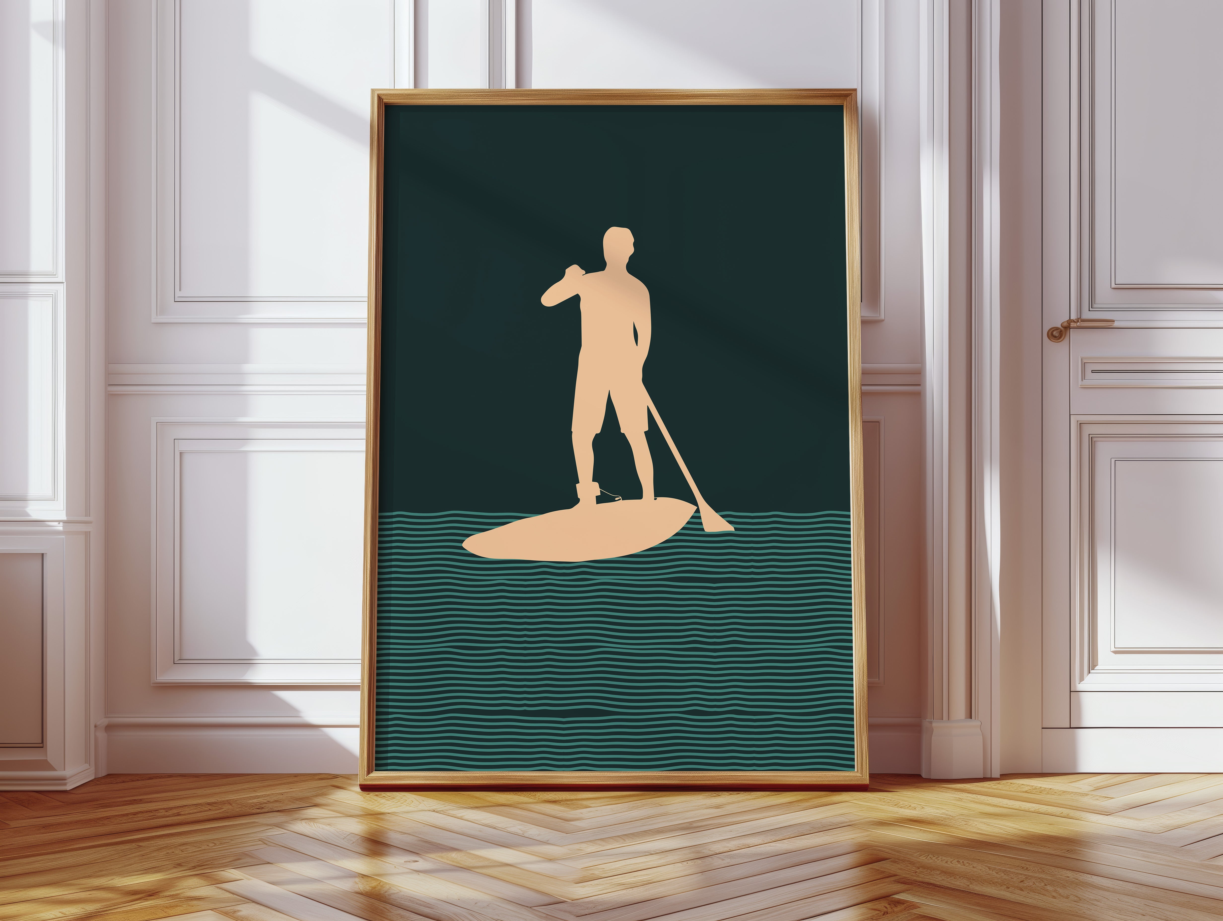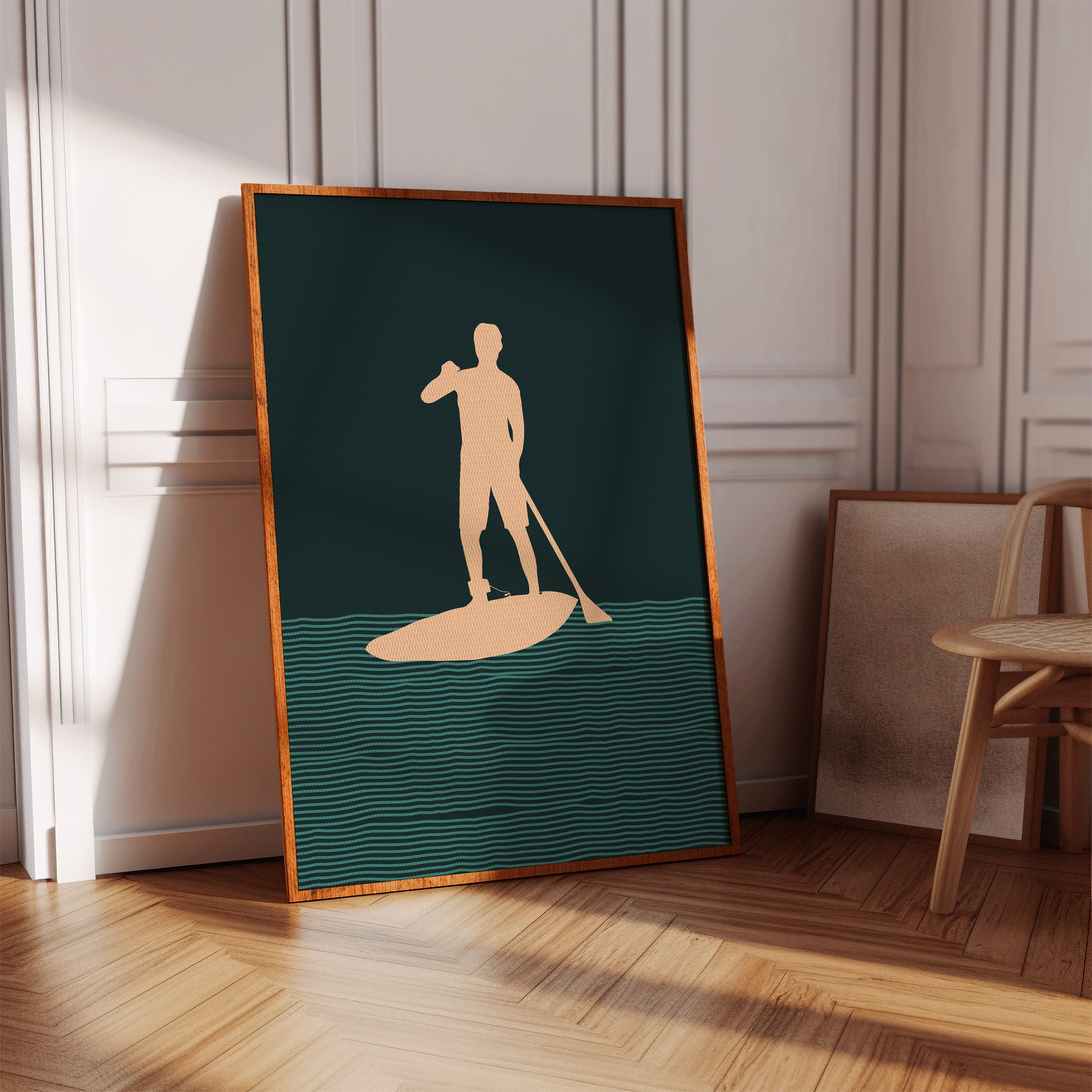 Tranquility flows through rhythmic waves, where a solitary figure finds balance between water and sky. This minimalist piece from our Contemporary collection captures the essence of modern coastal living through clean lines and bold silhouettes. The interplay of deep forest green waters and warm peach tones creates a meditative scene, while repeating wave patterns suggest perpetual motion and endless possibility. Perfect for bringing a sense of calm adventure to a modern coastal home or urban retreat. This piece resonates with anyone who finds peace in the gentle dance between human and nature.