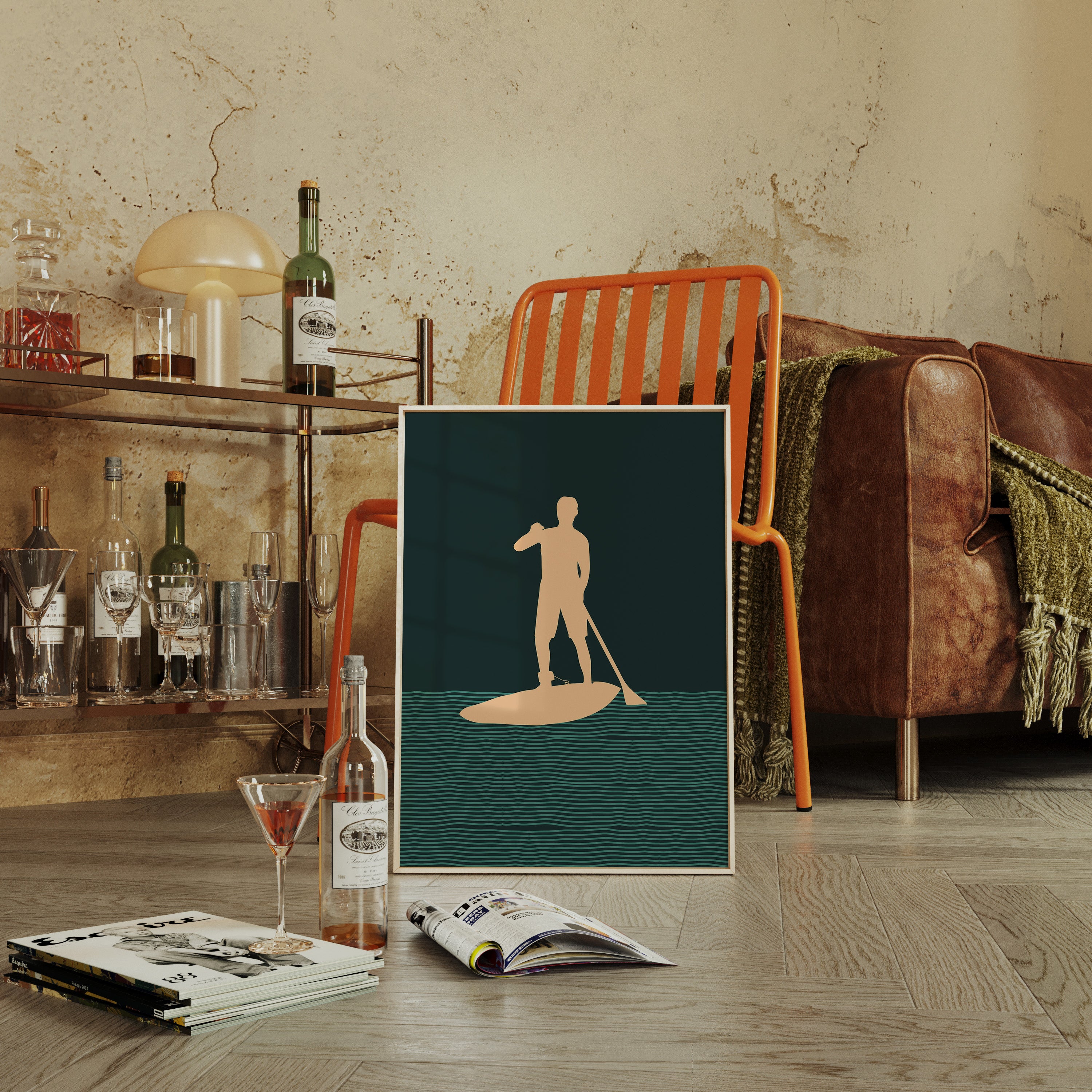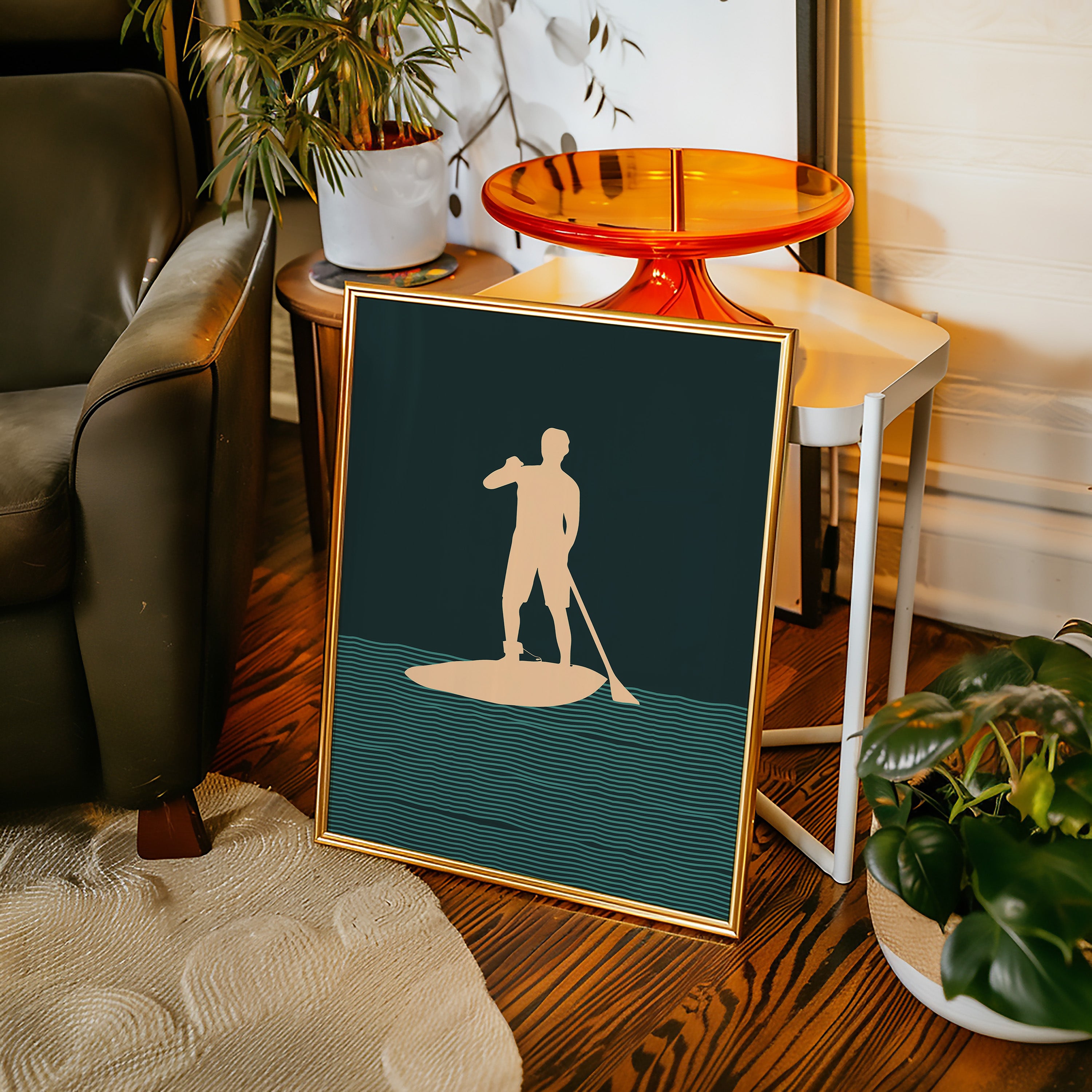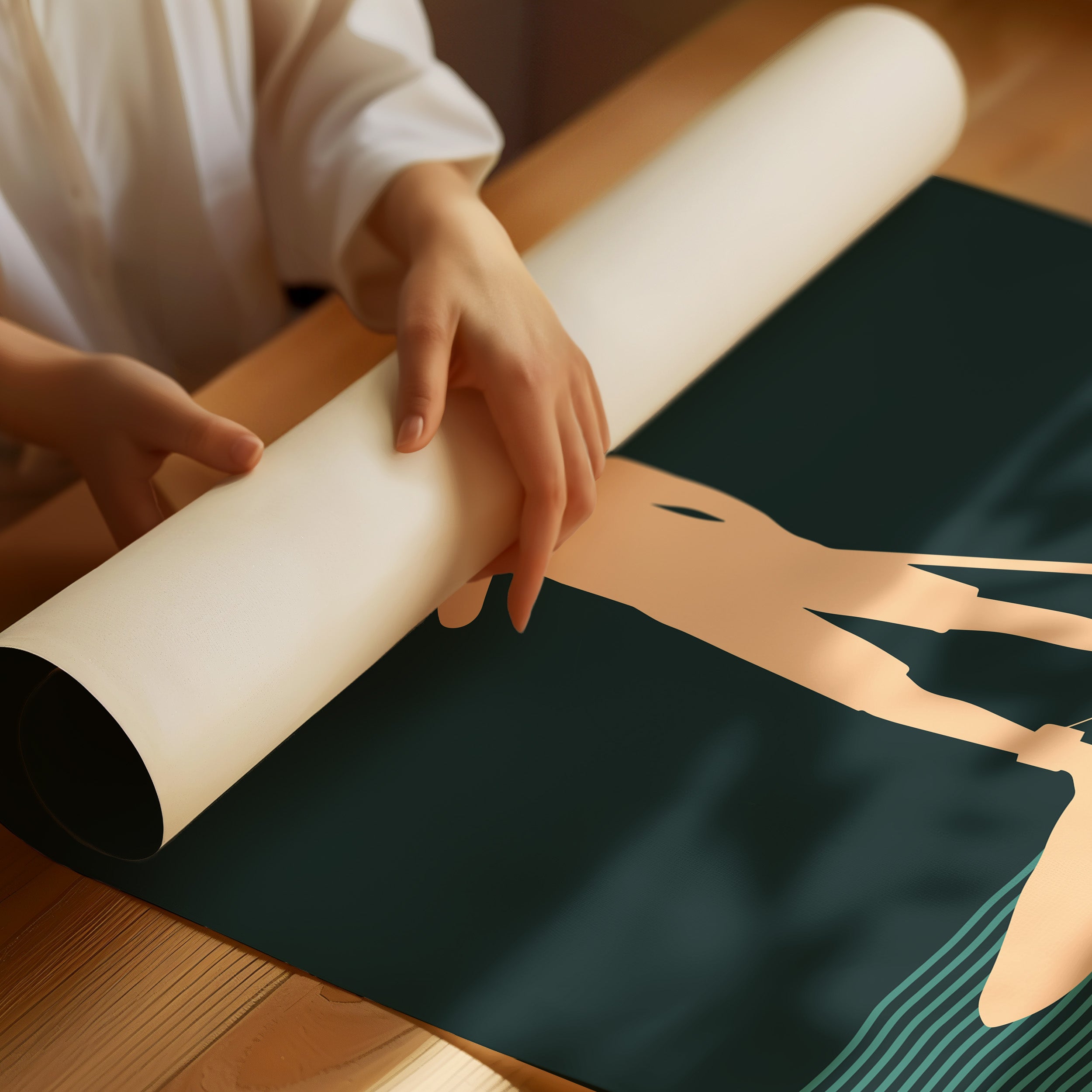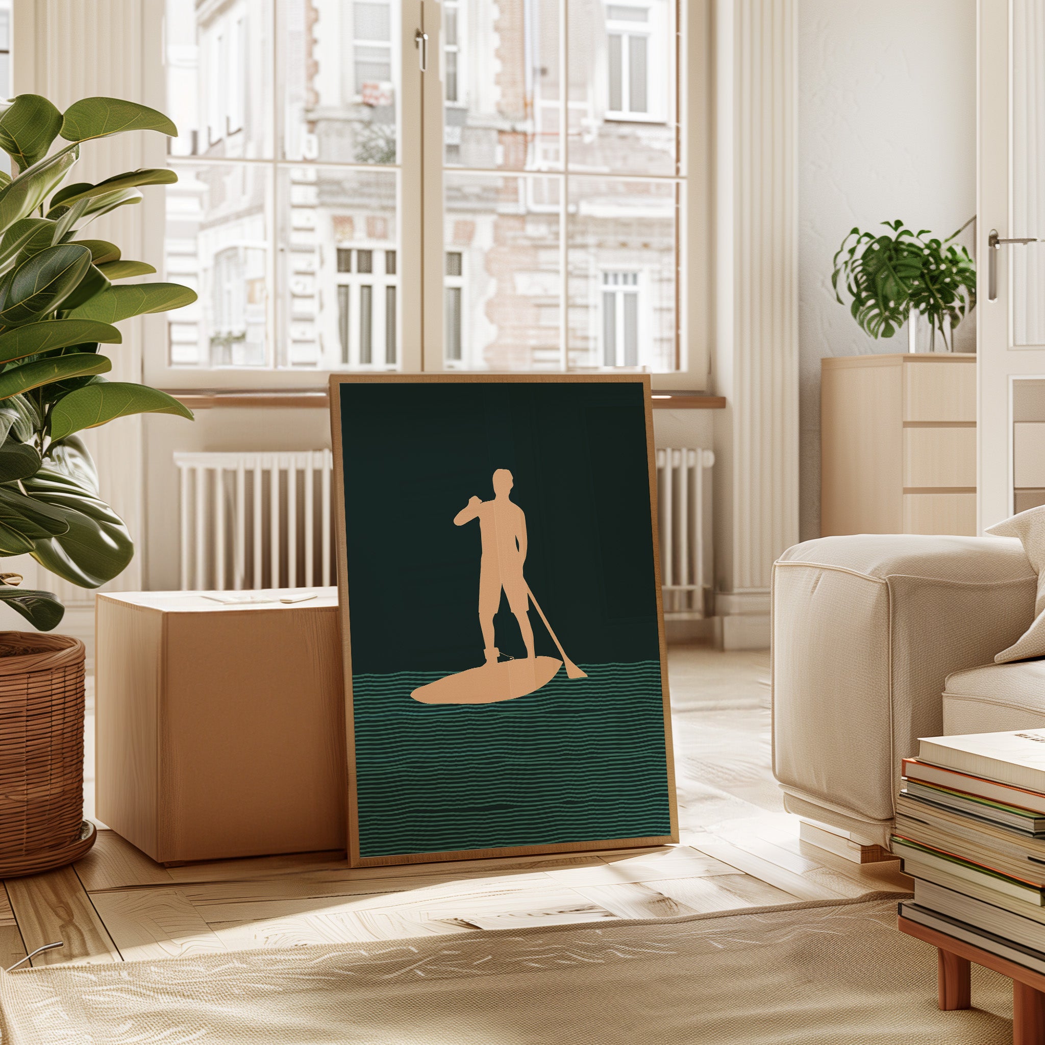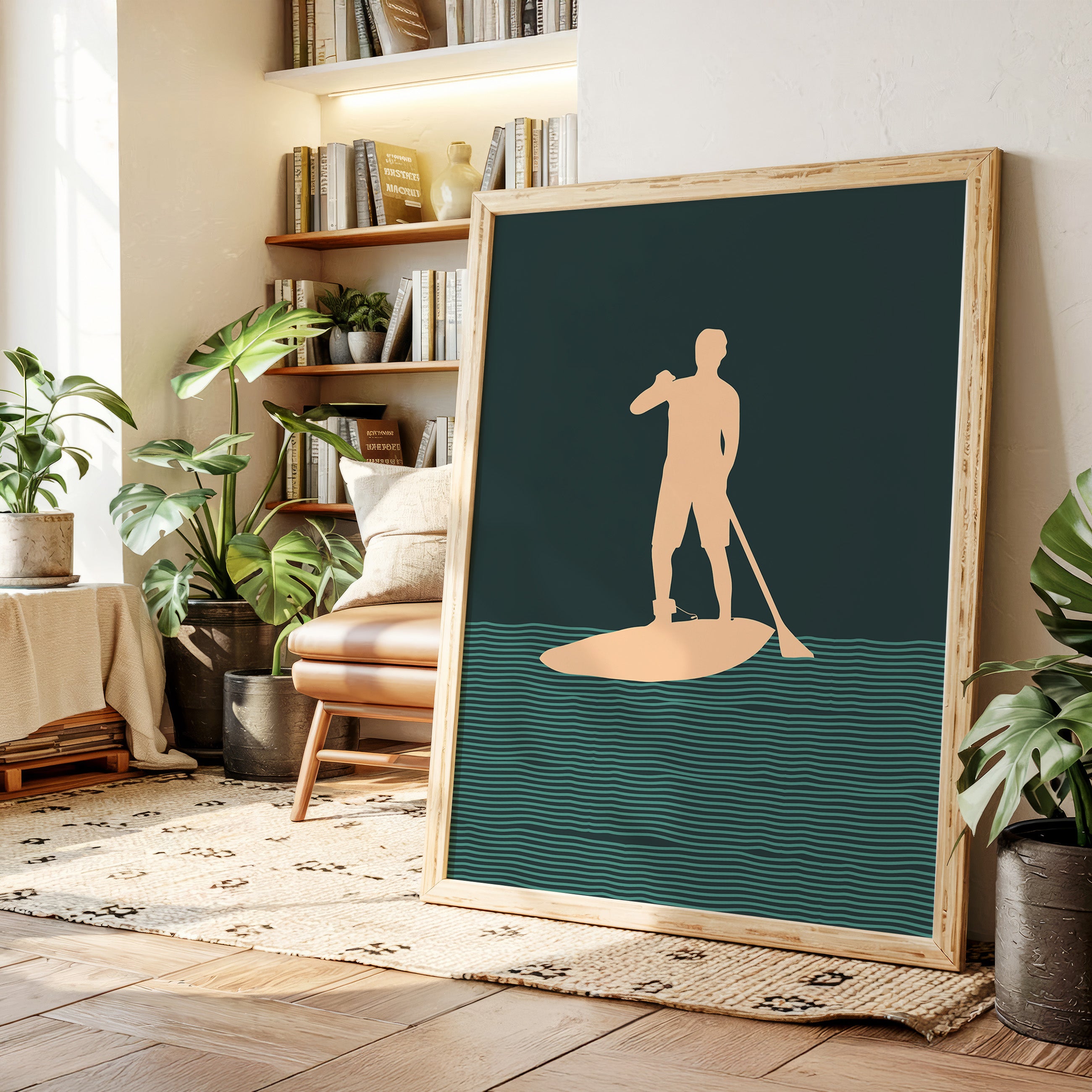 Tranquility flows through rhythmic waves, where a solitary figure finds balance between water and sky. This minimalist piece from our Contemporary collection captures the essence of modern coastal living through clean lines and bold silhouettes. The interplay of deep forest green waters and warm peach tones creates a meditative scene, while repeating wave patterns suggest perpetual motion and endless possibility. Perfect for bringing a sense of calm adventure to a modern coastal home or urban retreat. This piece resonates with anyone who finds peace in the gentle dance between human and nature.