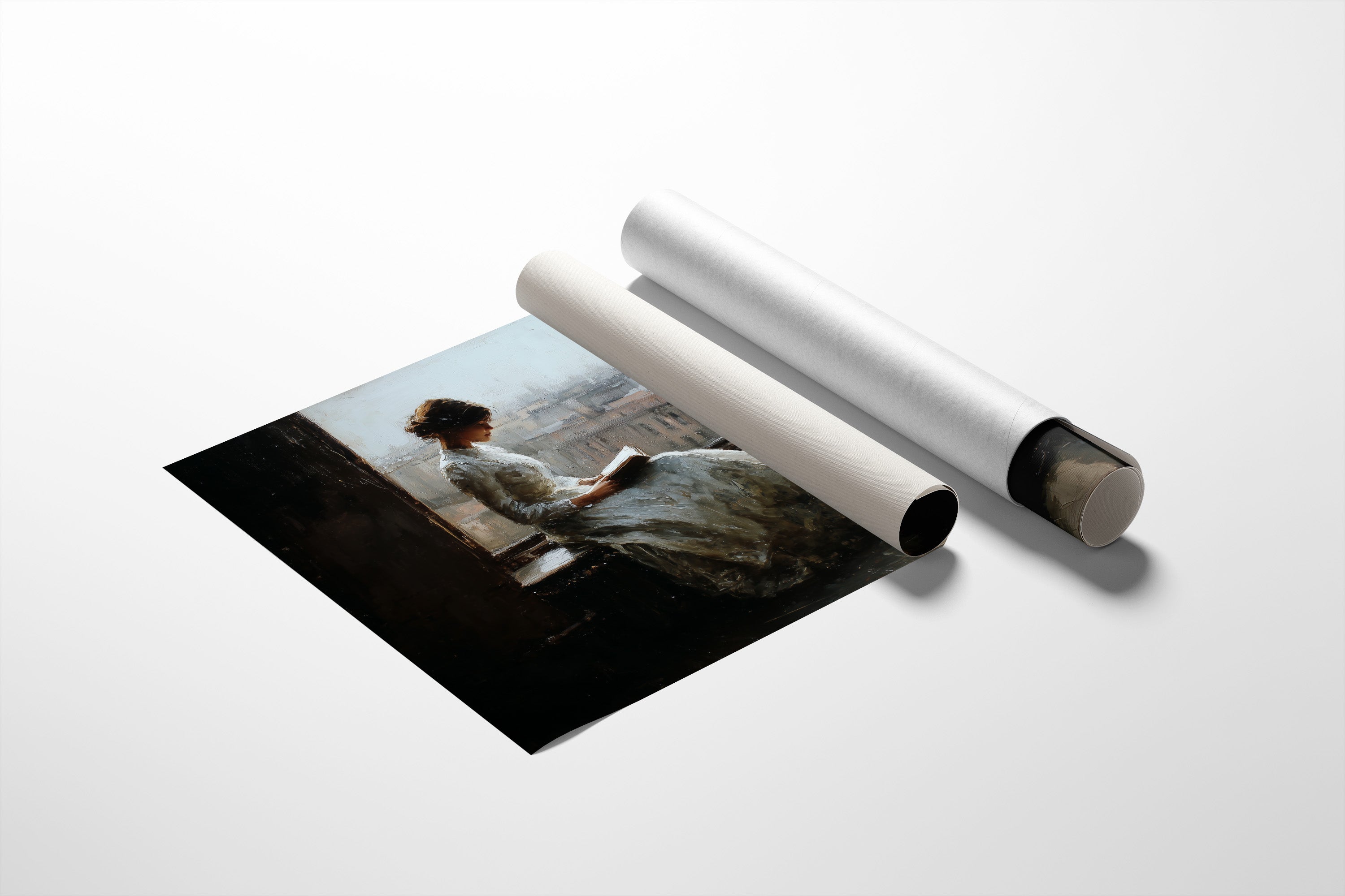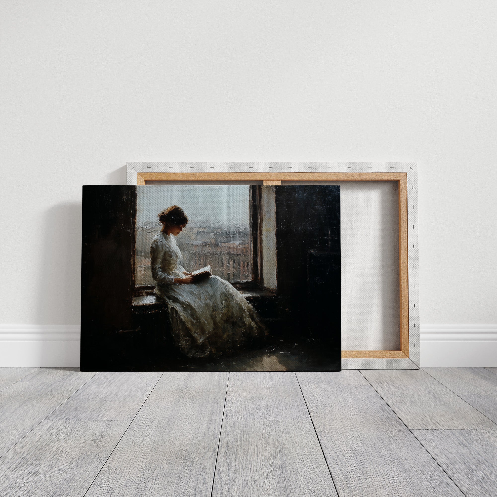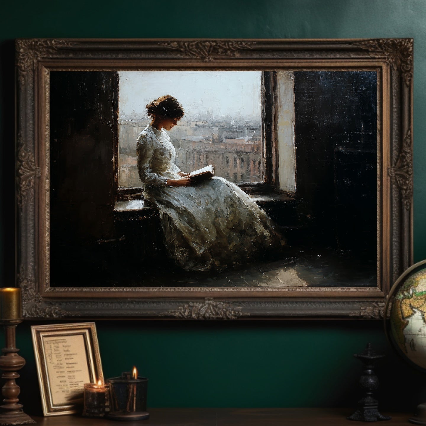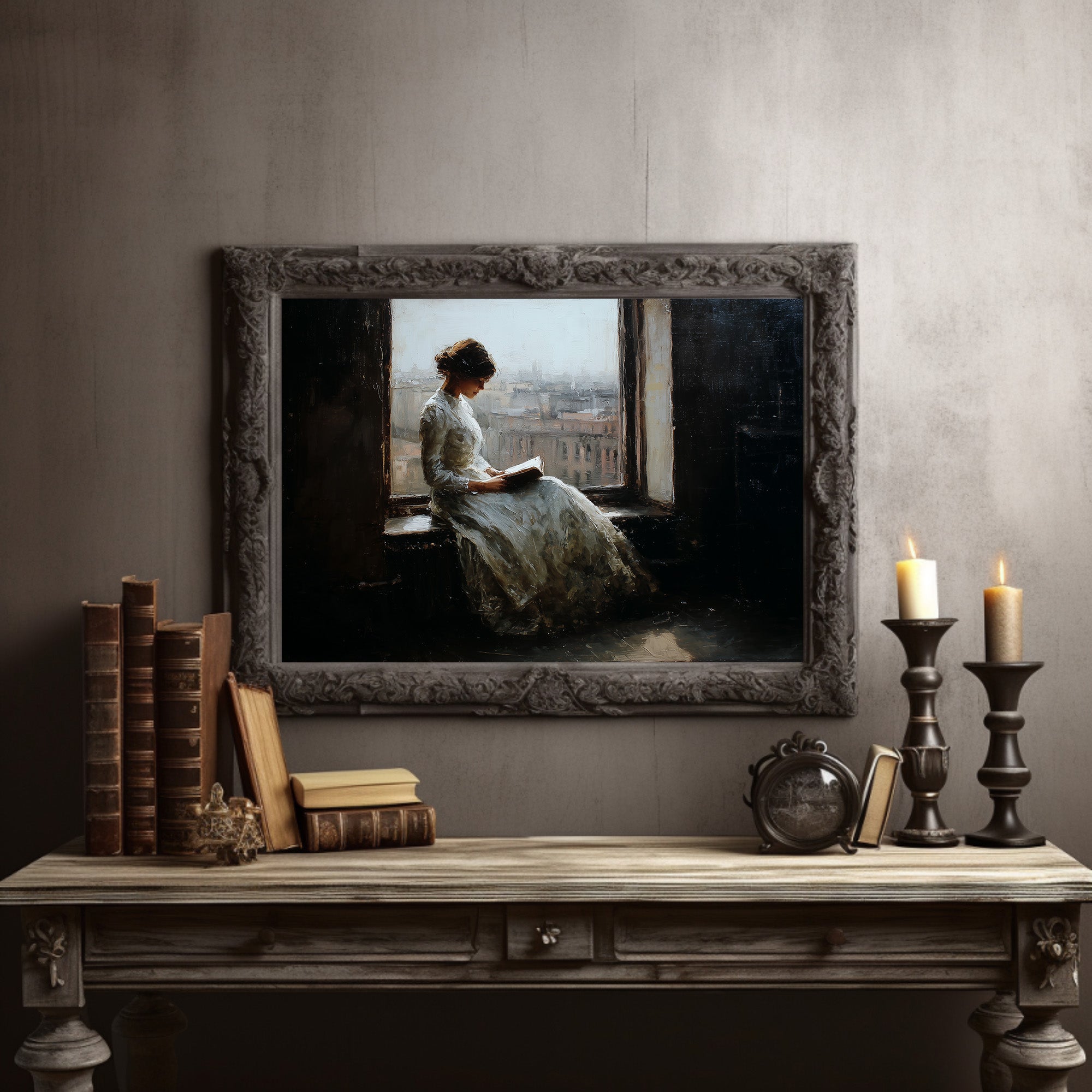 A classical painting nestled among literary treasures captures a moment of quiet contemplation. The soft, impressionistic brushstrokes depict a figure by a window, lost in the pages of a book while city rooftops fade into mist beyond the glass. The rich wooden bookshelves surrounding the framed artwork create a sanctuary of knowledge and beauty, where stories within stories invite endless exploration.