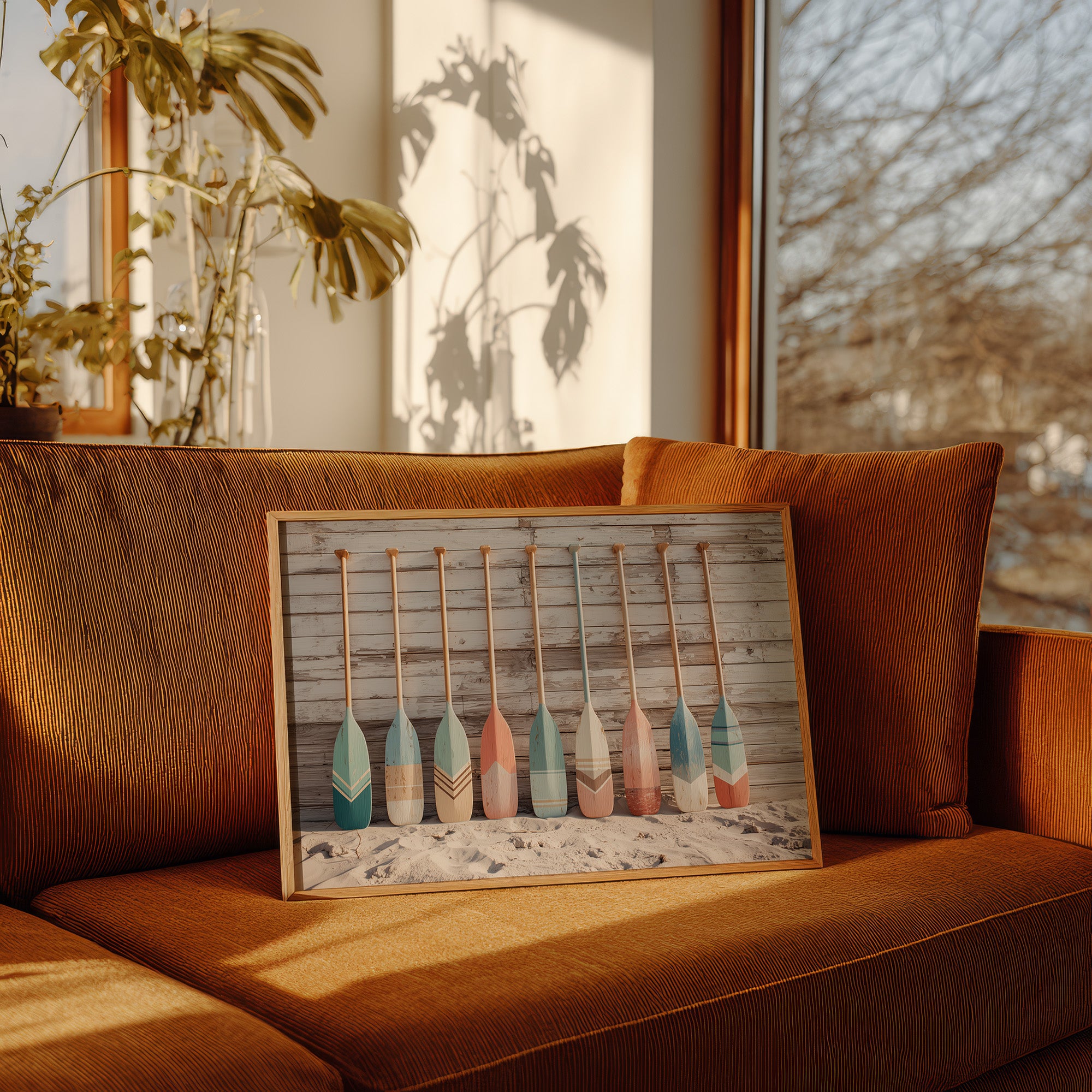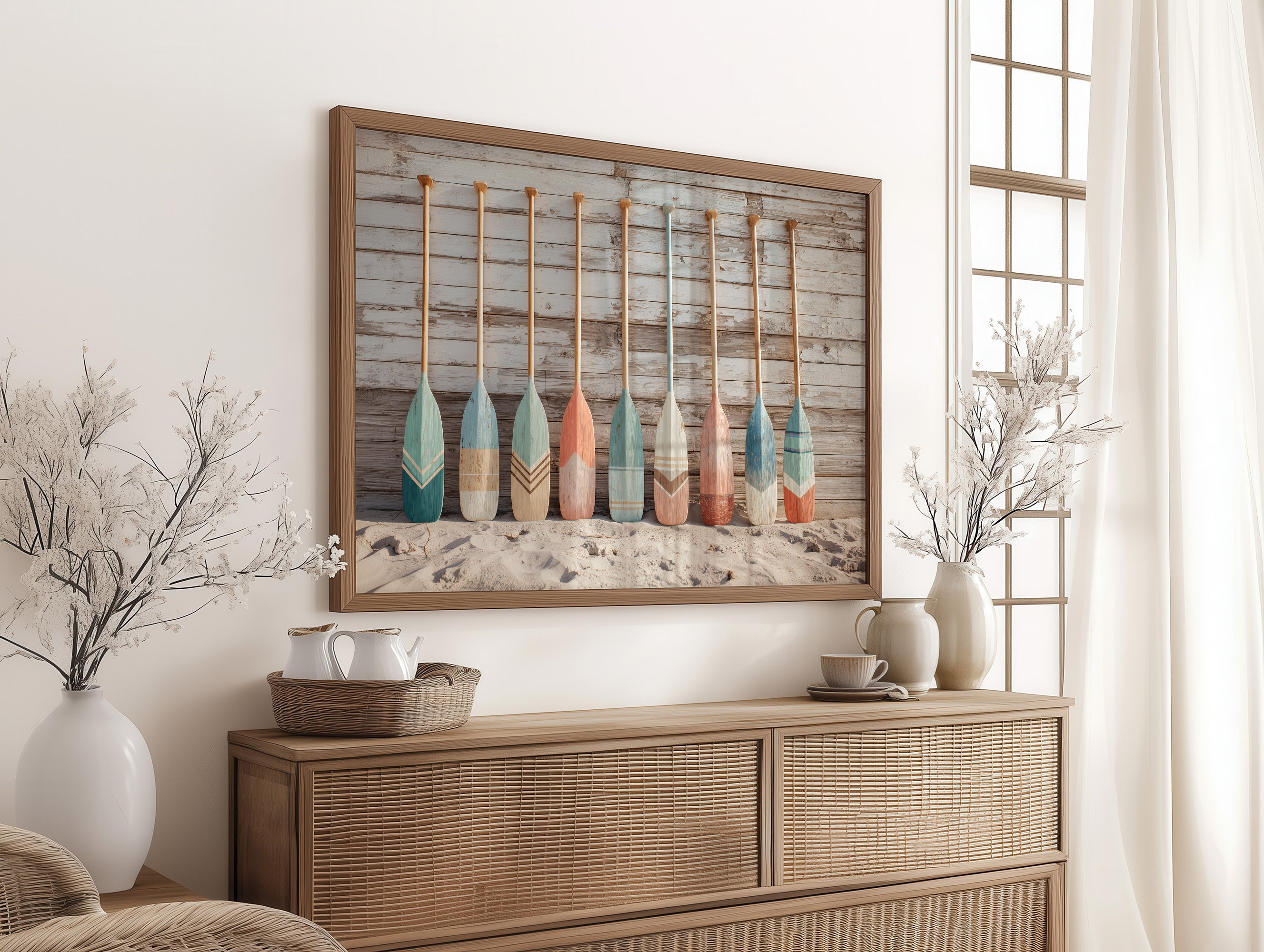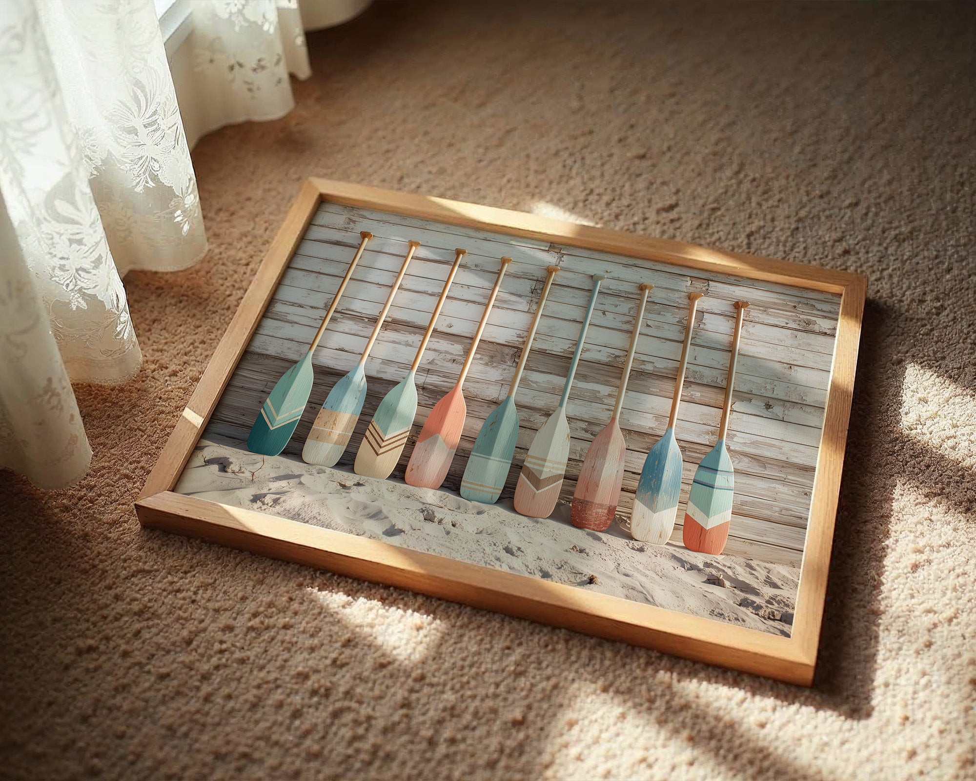 A row of artfully painted oars leans against weathered wooden planks, their pastel hues of mint, coral, and azure capturing the essence of lazy coastal afternoons. Each paddle bears unique geometric patterns and color blocks that speak of handcrafted care, resting on a bed of soft sand that seems to hold memories of shoreline adventures. This serene coastal piece brings the relaxed rhythm of lakeside retreats into contemporary living spaces, perfect for brightening a dining area or hallway with its subtle nautical charm.