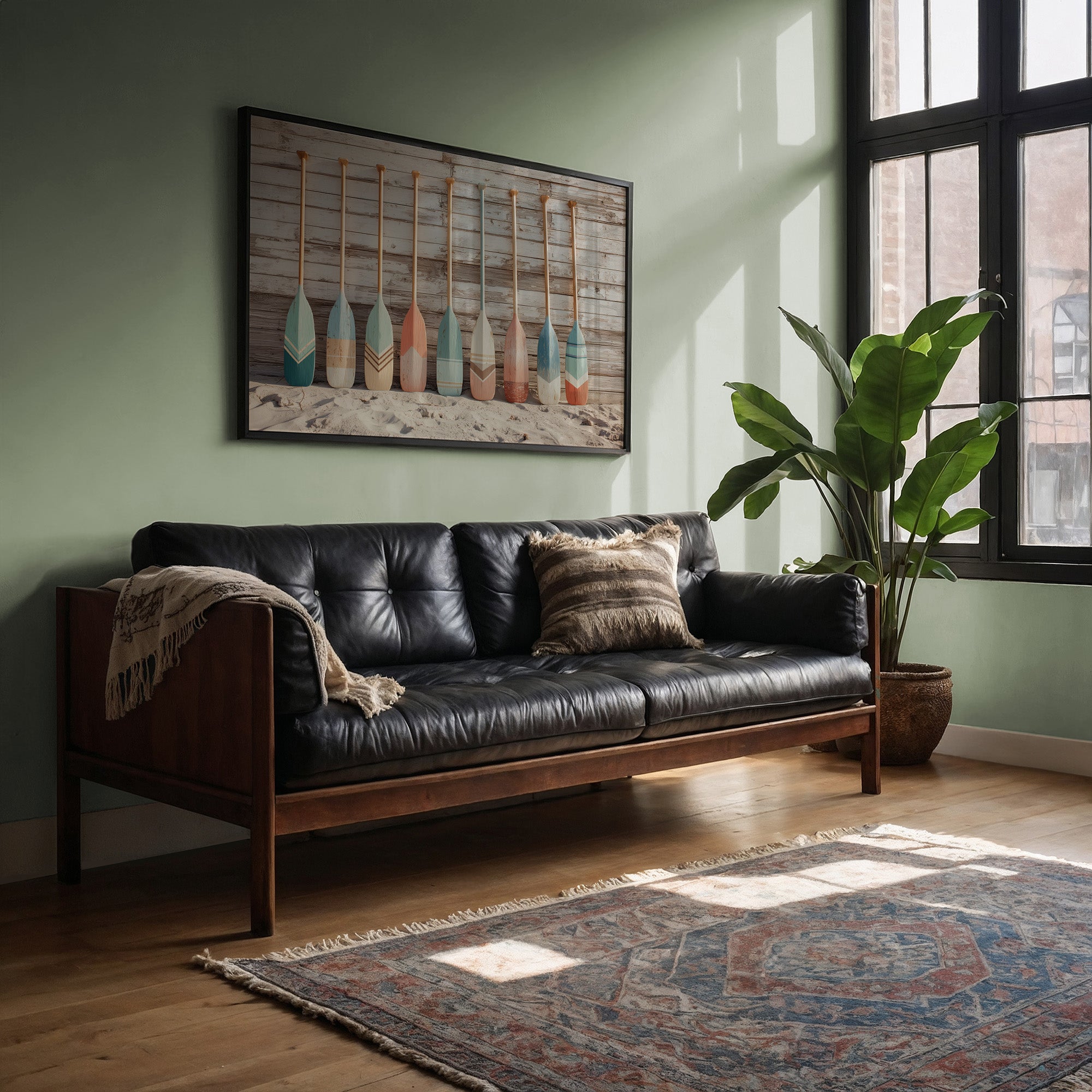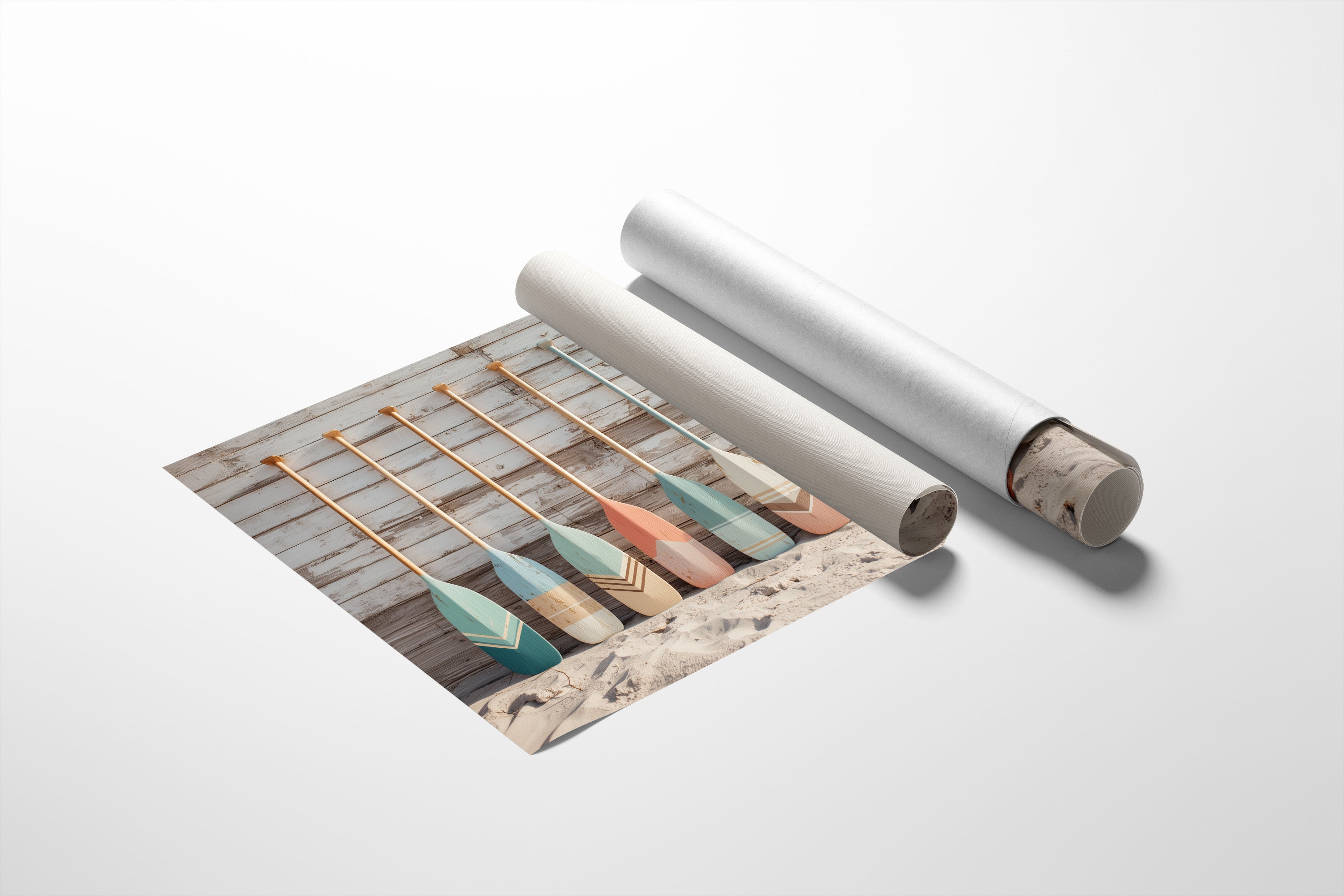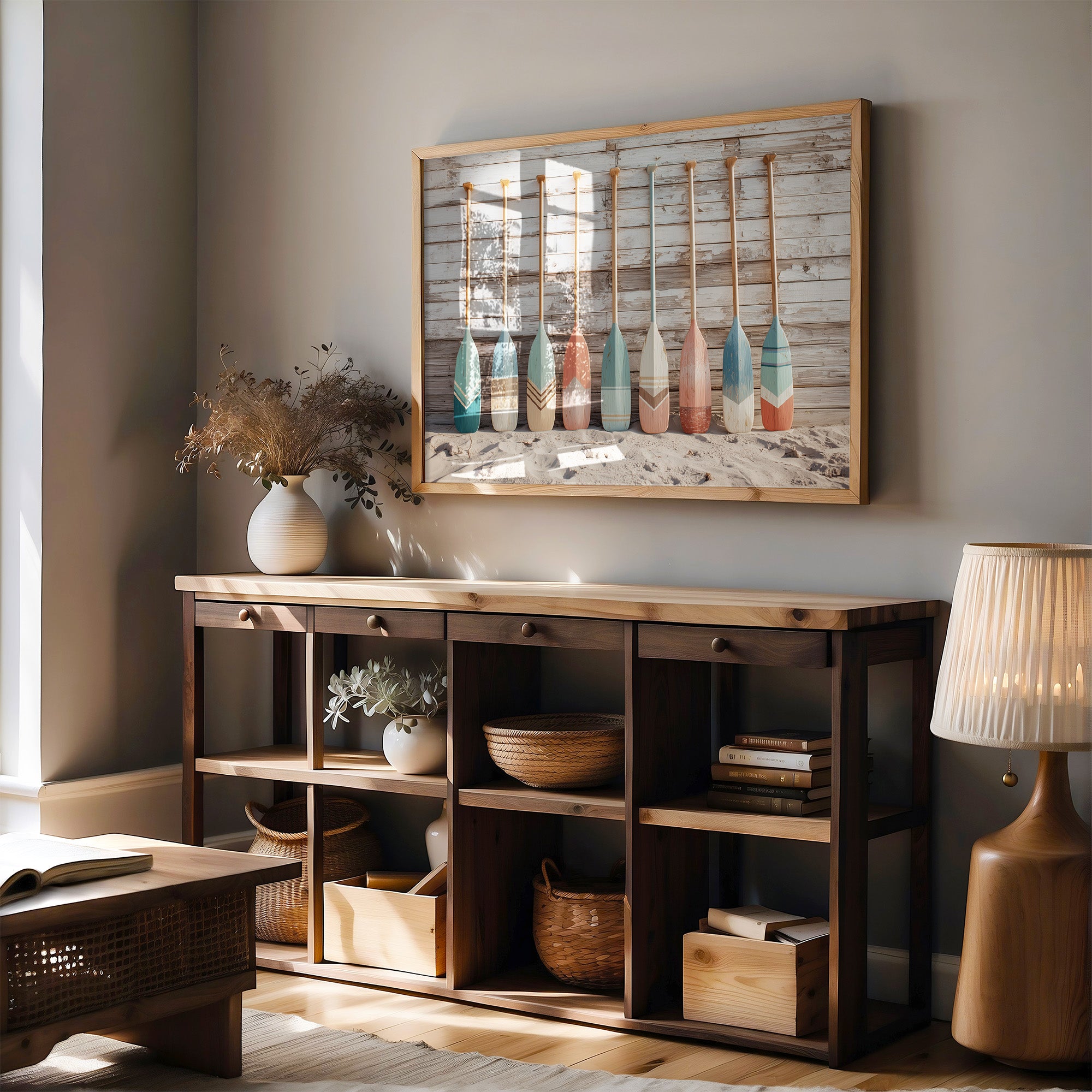 A row of artfully painted oars leans against weathered wooden planks, their pastel hues of mint, coral, and azure capturing the essence of lazy coastal afternoons. Each paddle bears unique geometric patterns and color blocks that speak of handcrafted care, resting on a bed of soft sand that seems to hold memories of shoreline adventures. This serene coastal piece brings the relaxed rhythm of lakeside retreats into contemporary living spaces, perfect for brightening a dining area or hallway with its subtle nautical charm.