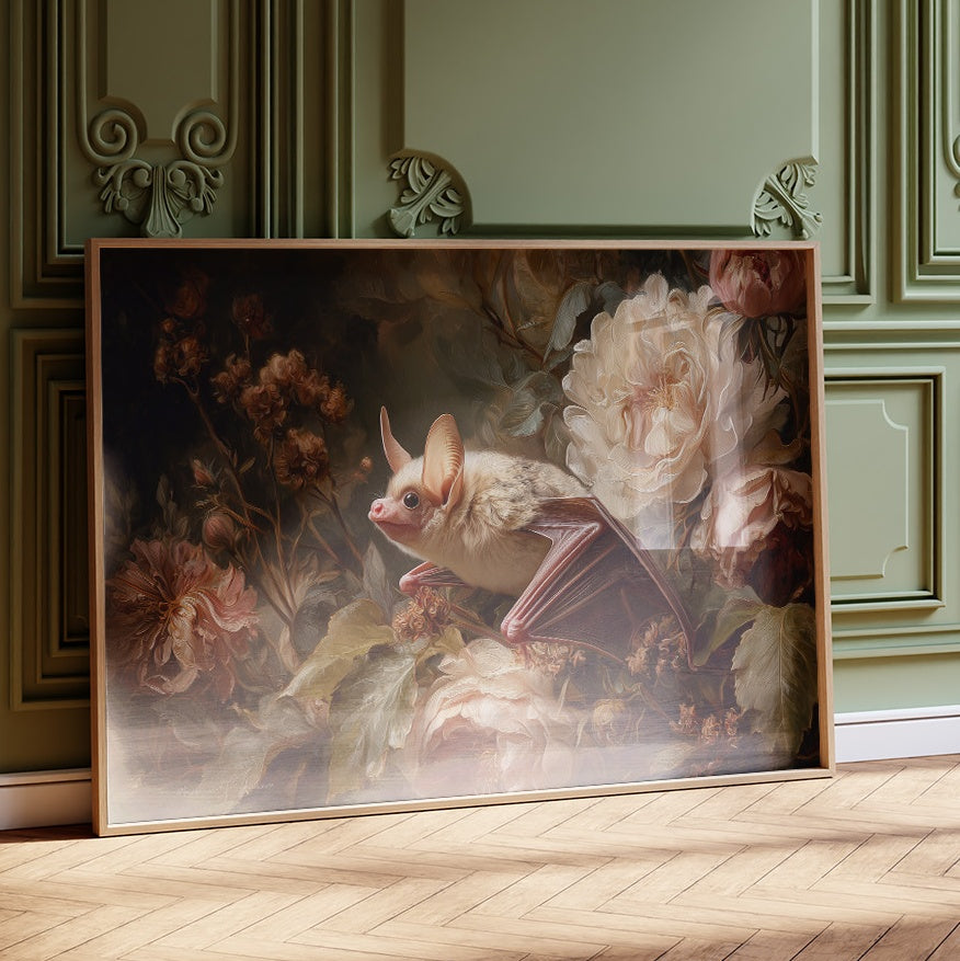 Pale Bat Among Vintage Blooms | Gallery Canvas / 11" x 9" | $65.00