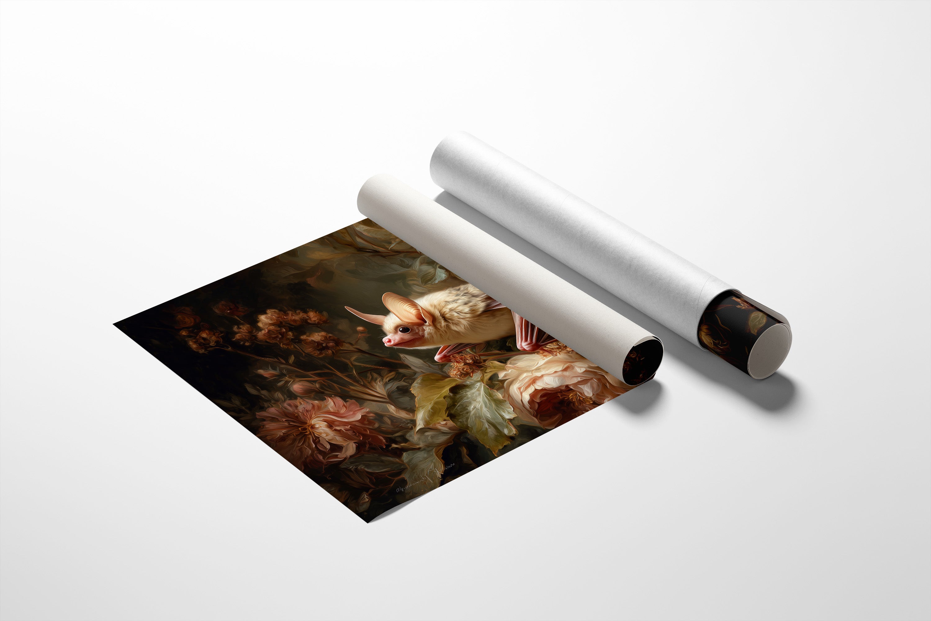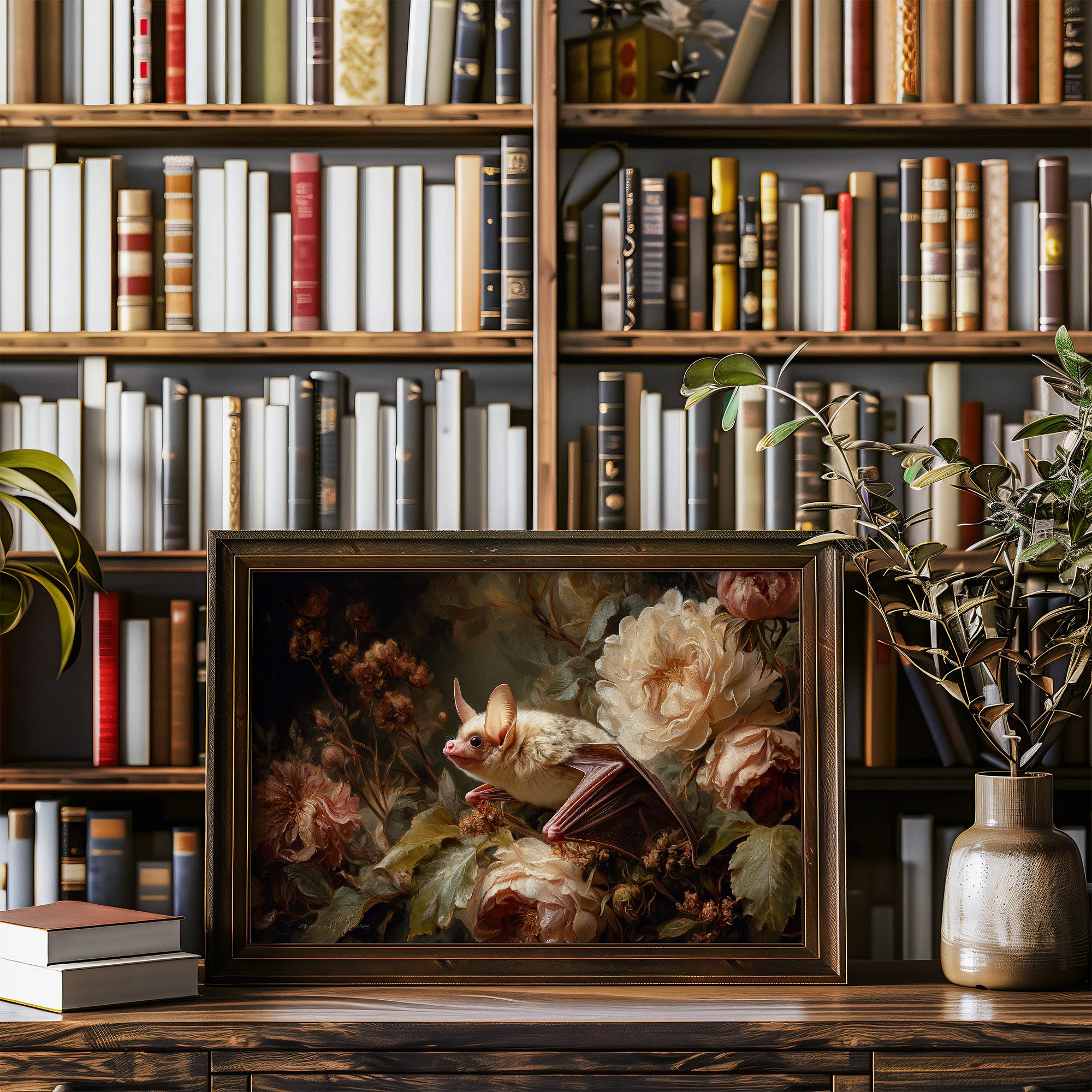 A delicate white bat flutters among lush peonies and roses, creating an unexpected juxtaposition of the nocturnal and the floral. The rich, dark-toned painting captures the creature mid-flight, its translucent wings spread against a backdrop of blush pink blooms and deep green foliage. This contemporary twist on classical still life rests elegantly against a scholar's library, where wooden shelves filled with leather-bound volumes create a sanctuary of knowledge and curiosity.