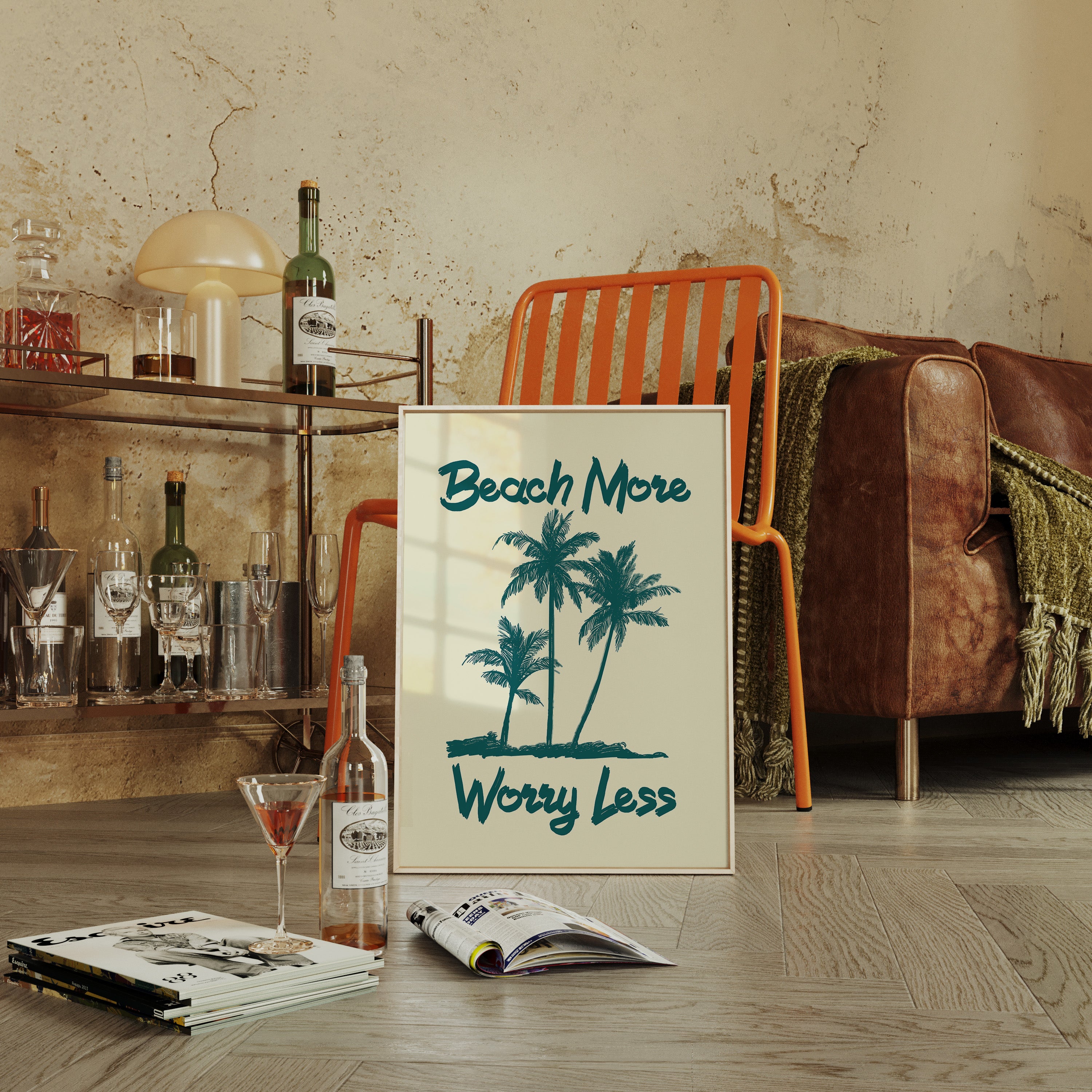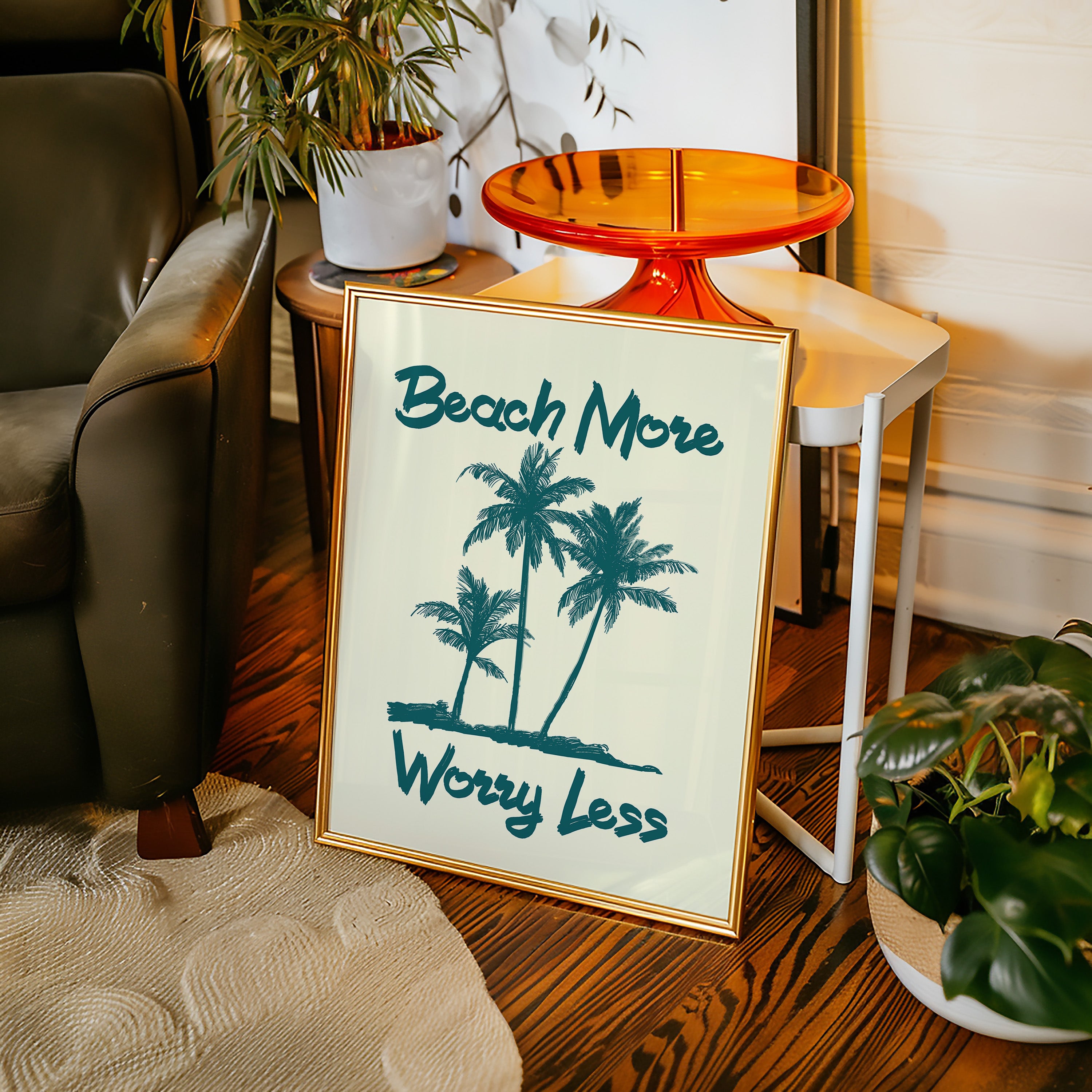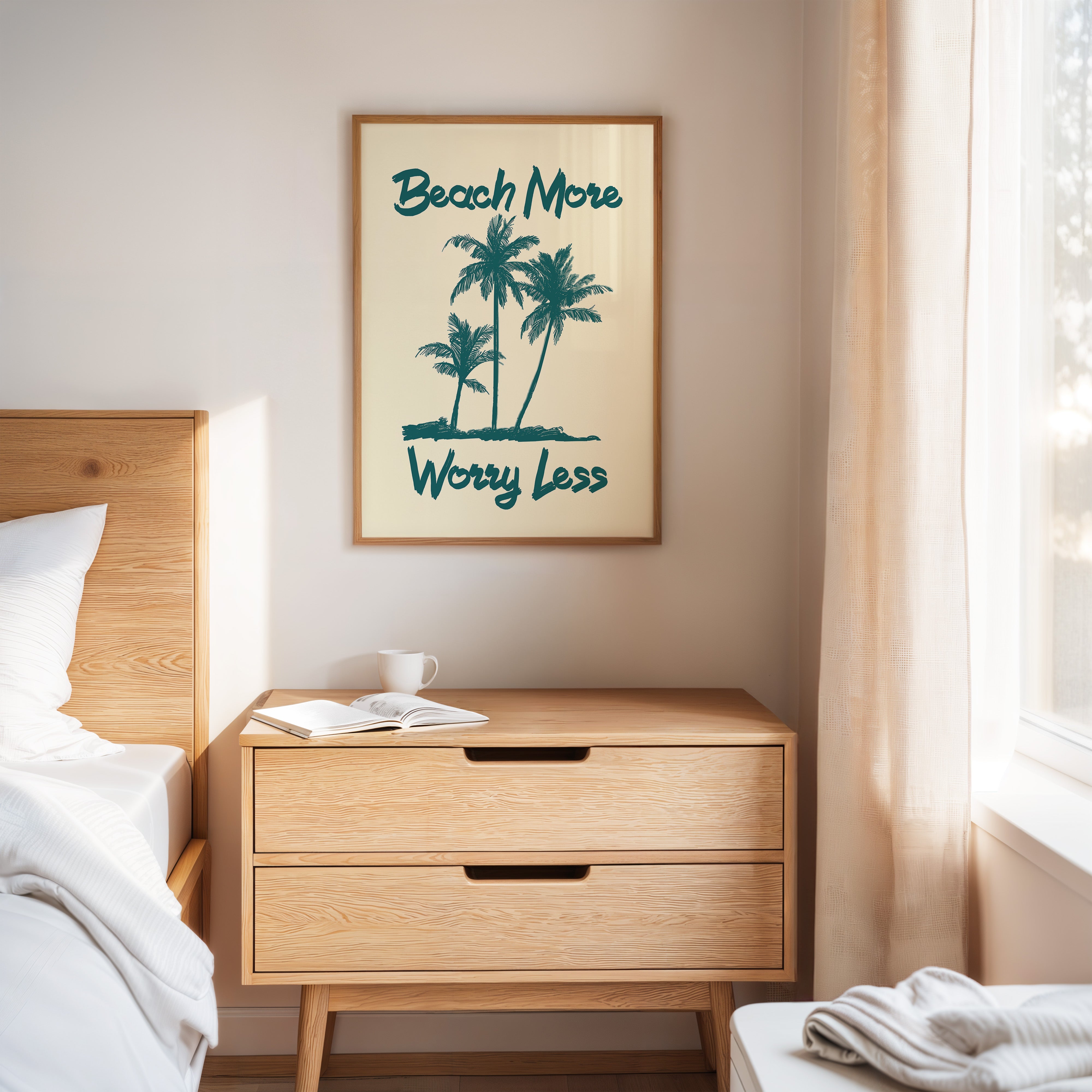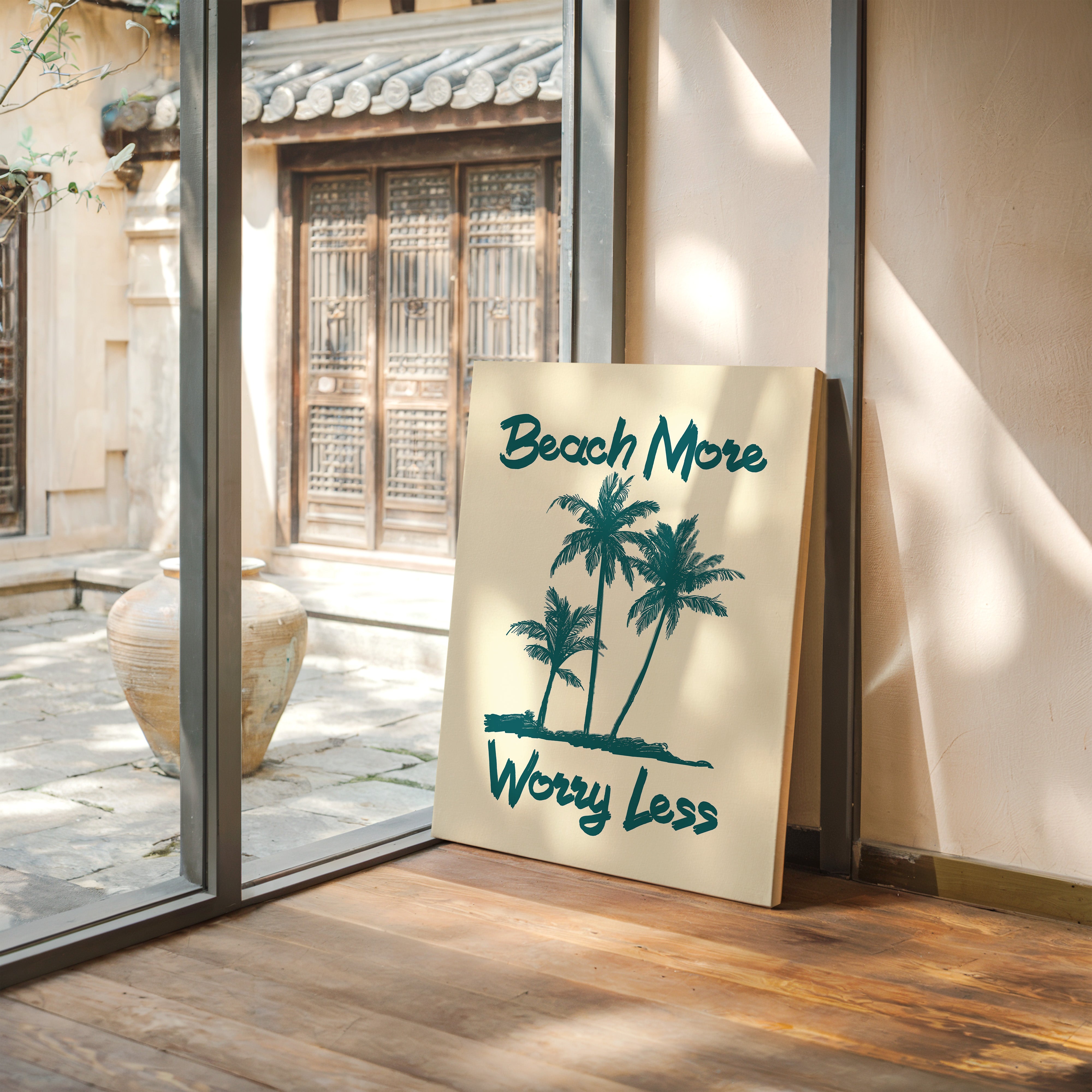Turquoise palms sway against cream canvas, offering a gentle reminder to slow down and savor life's simple pleasures. This piece from our Contemporary collection brings casual coastal wisdom to modern spaces. The bold typography and minimalist palm silhouettes create a perfect balance of playful energy and zen-like calm, while the teal and ivory palette speaks to both ocean depths and sandy shores. This statement piece transforms any room into a mindful retreat, ideal for brightening a home office or adding beachy sophistication to a living space. Let it serve as your daily reminder to choose joy over worry.
