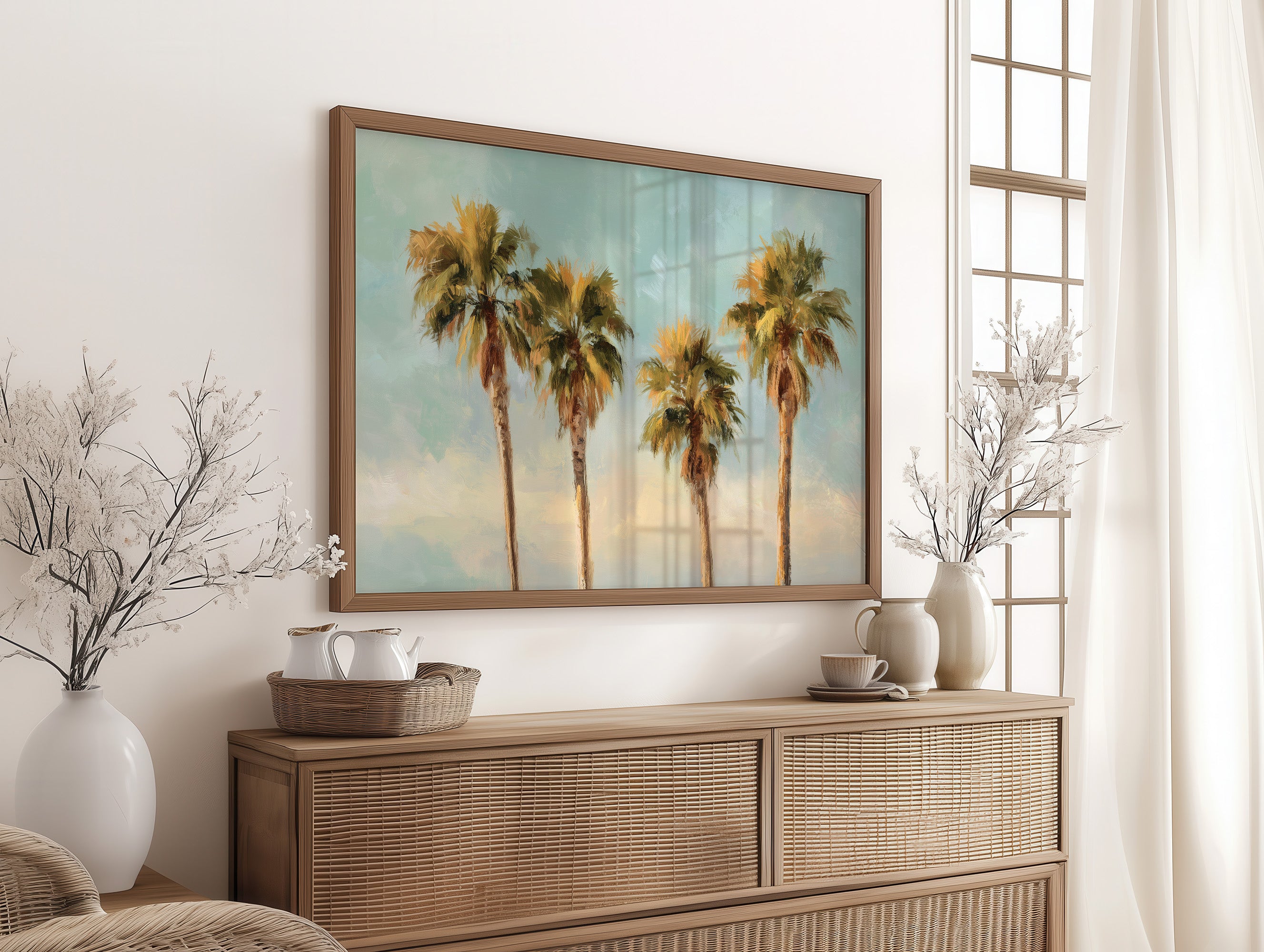 The golden crowns of palm trees reach toward an endless turquoise sky, capturing that perfect moment when afternoon light turns everything magical. Brushstrokes blend the warm amber fronds with a serene blue backdrop, creating a dreamy coastal atmosphere that feels both nostalgic and timeless. The composition balances simplicity with emotional depth, inviting you to escape into memories of sun-drenched horizons and gentle ocean breezes.