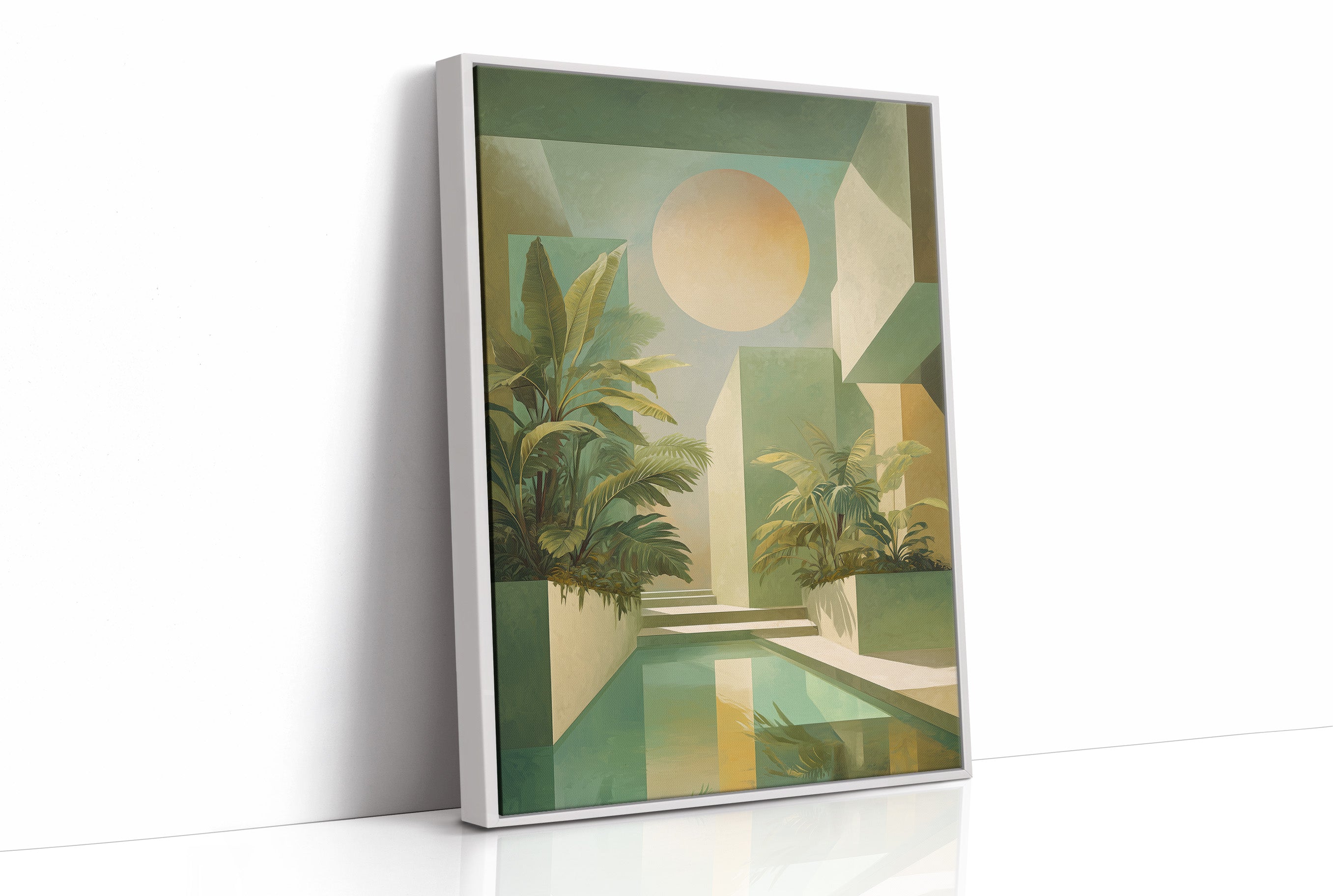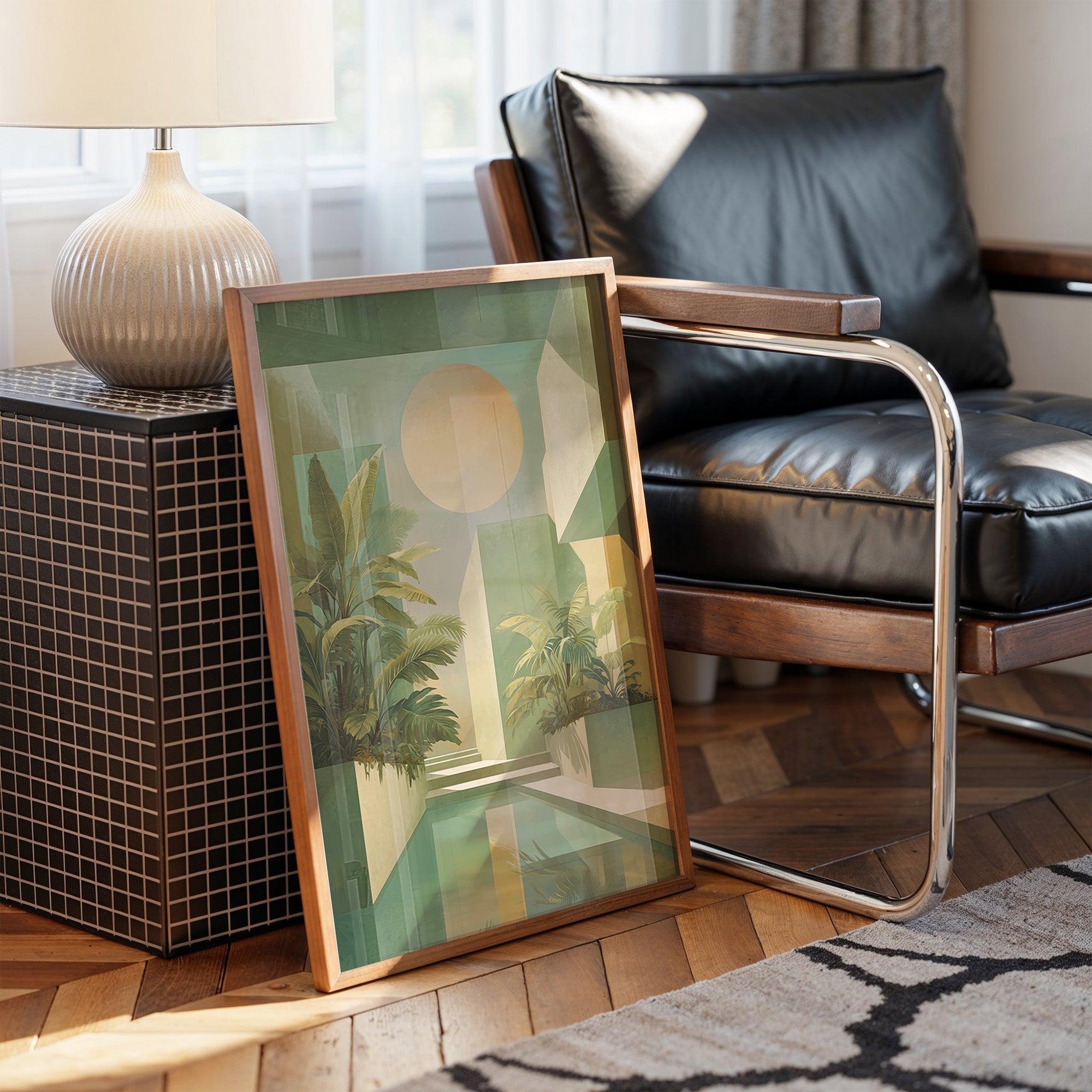 Soft geometric shapes frame a tranquil tropical scene, where palm fronds reach toward a luminous orb in a misty sage atmosphere. The modern composition blends architectural elements with organic forms, creating a harmonious dialogue between structure and nature in subtle greens and warm creams. This contemporary piece brings a sense of serenity and sophistication to any space, perfect for creating a calming focal point in a minimalist living room or adding an artistic touch to a modern home office.