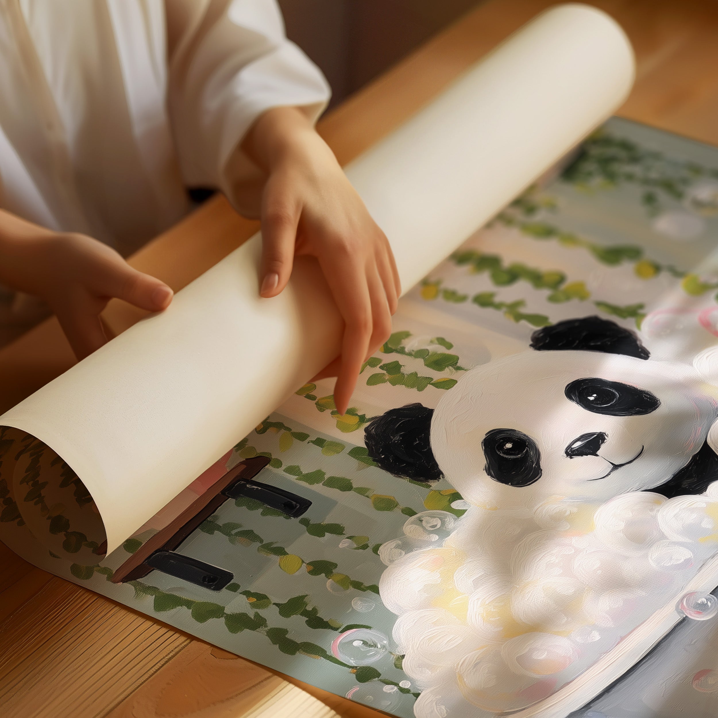 Nestled in a whimsical bathroom, a cheerful panda soaks among fluffy bubbles beneath cascading vines. The playful scene combines the serenity of a spa day with the charm of a storybook illustration, as delicate soap bubbles float through the air. The checkerboard floor, vintage amber bottles, and lush hanging plants create a sophisticated yet playful sanctuary, while soft natural light filters through the greenery to illuminate this peaceful moment. This enchanting piece brings a touch of whimsy and calm to a child's room or modern bathroom, perfectly balancing sophistication with pure joy.