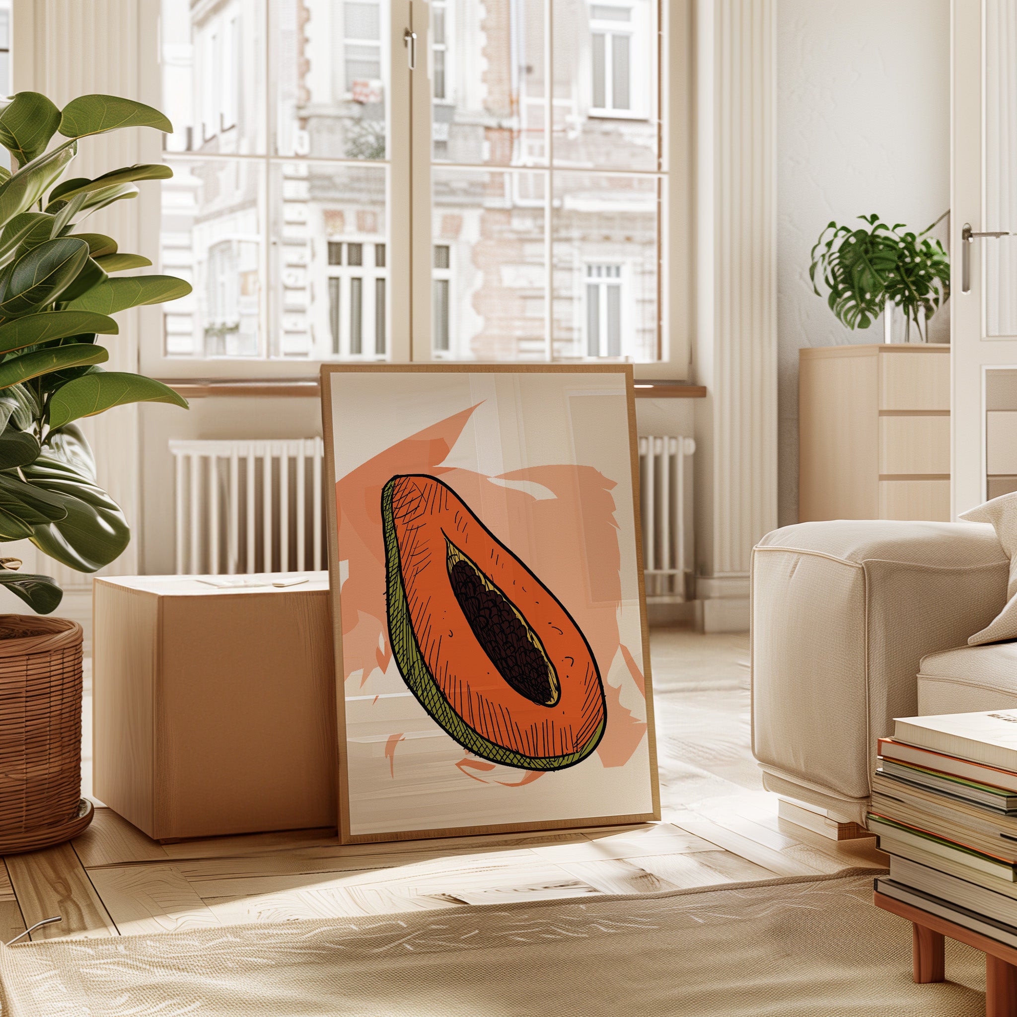 A bold stroke of tropical warmth cuts across a peachy horizon, capturing the essence of summer's sweetest offerings. This piece from our Contemporary collection brings modern minimalism to nature's perfect design. The vibrant coral-orange flesh contrasts beautifully with the dark cluster of seeds and lime-green rind, creating a striking study in color and organic form. Each line sketch detail adds character while maintaining sophisticated simplicity. Perfect for bringing a fresh, modern energy to kitchen spaces or dining areas, this piece speaks to both culinary appreciation and artistic restraint.