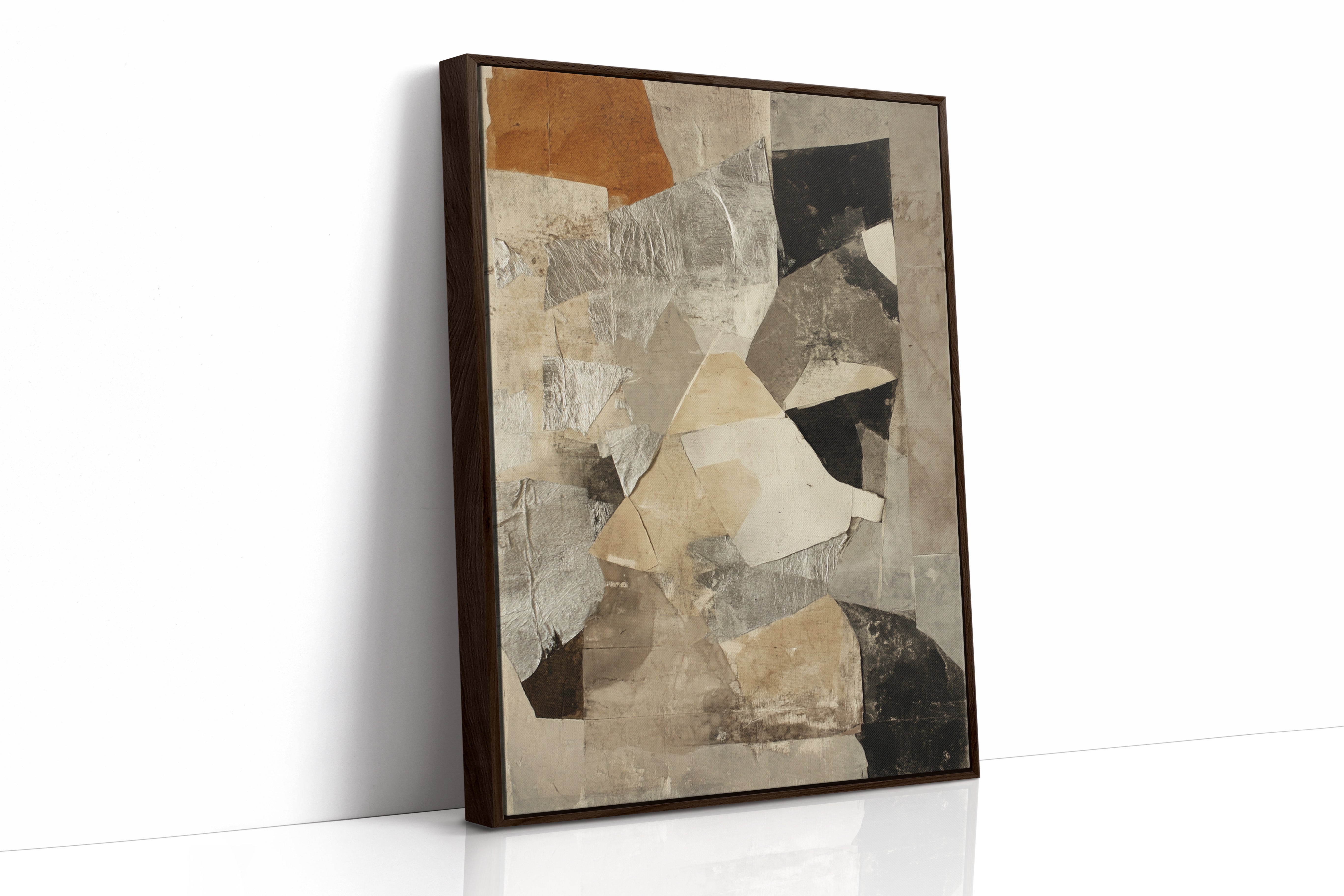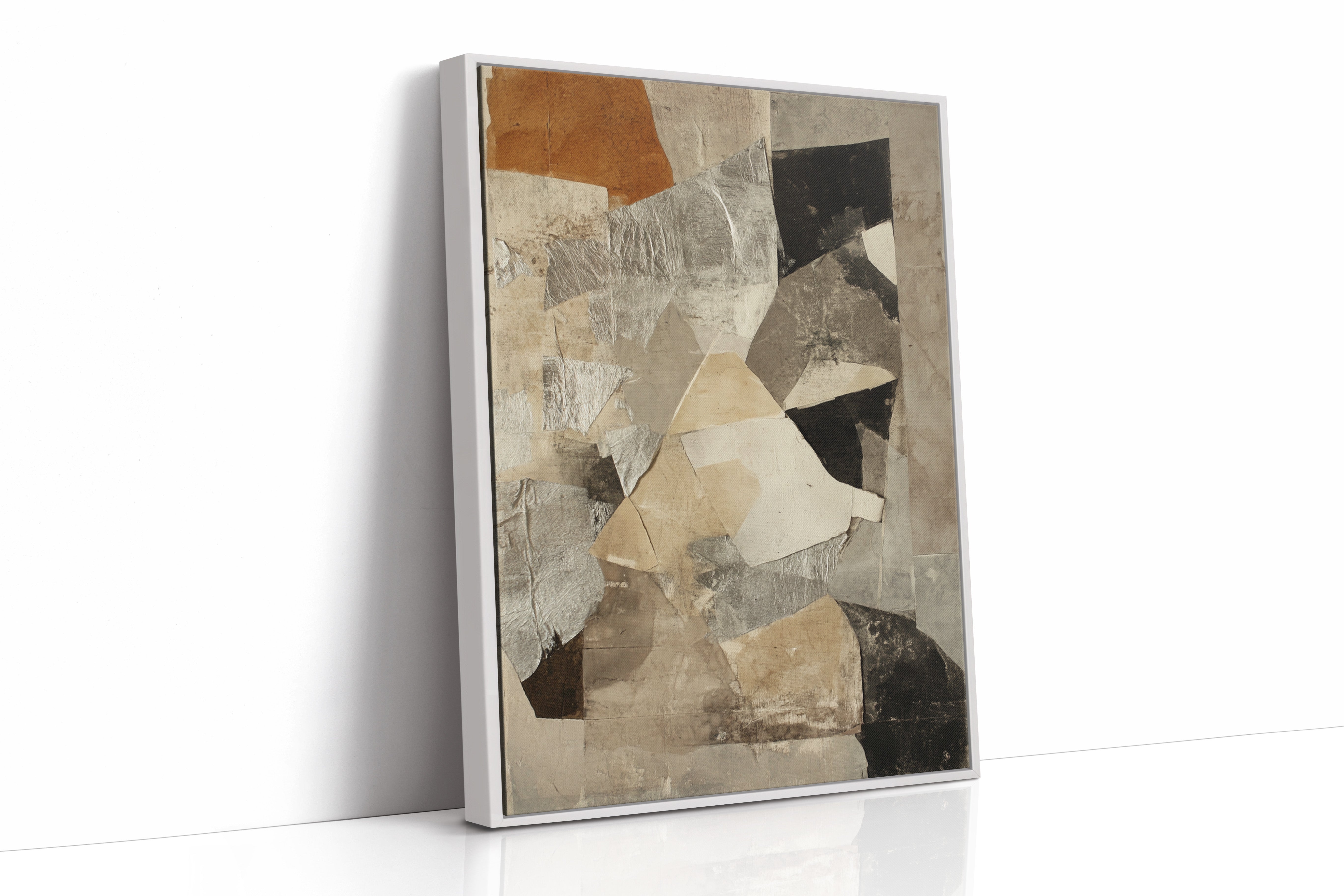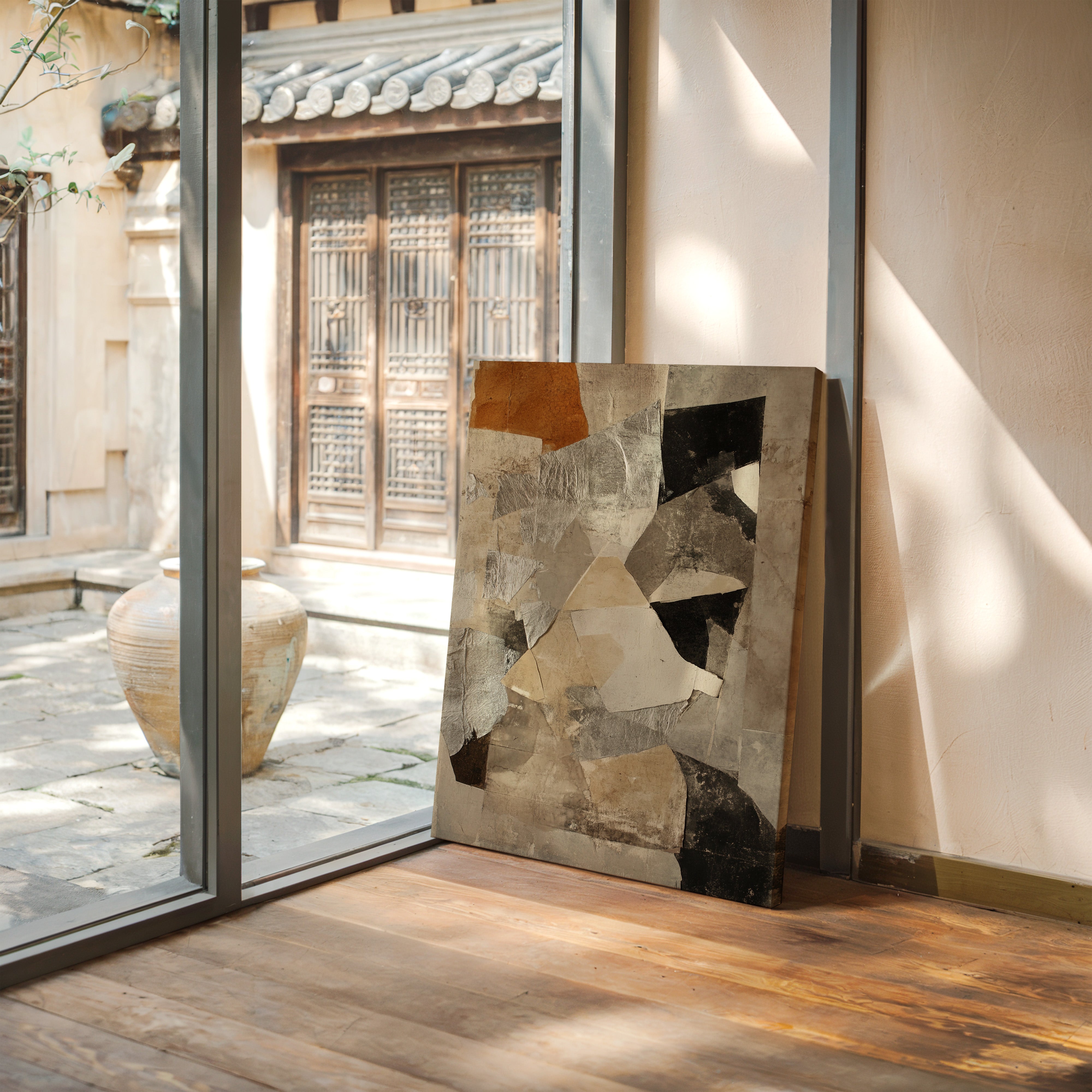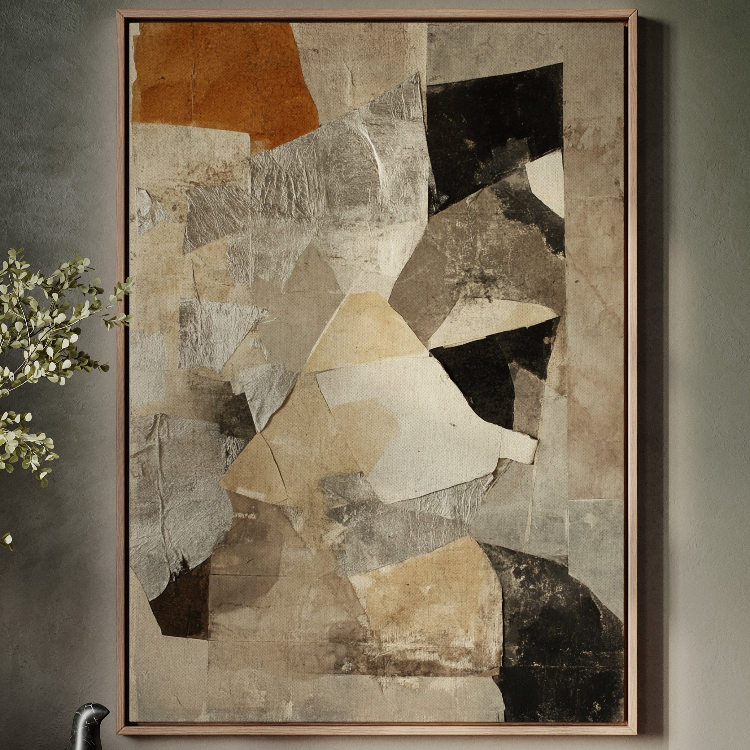 Weathered pieces of paper dance across the canvas like archaeological findings, each fragment telling its own tale of time. The composition juxtaposes rough-textured silver surfaces against smooth cream tones and bold black shapes, creating a sophisticated interplay of form and texture. Distressed edges and layered elements evoke memories of discovered letters and forgotten documents, while earthy rust tones add warmth to the otherwise monochromatic palette. This piece would bring contemplative sophistication to a modern study or minimal dining space, where its subtle complexity can be fully appreciated.