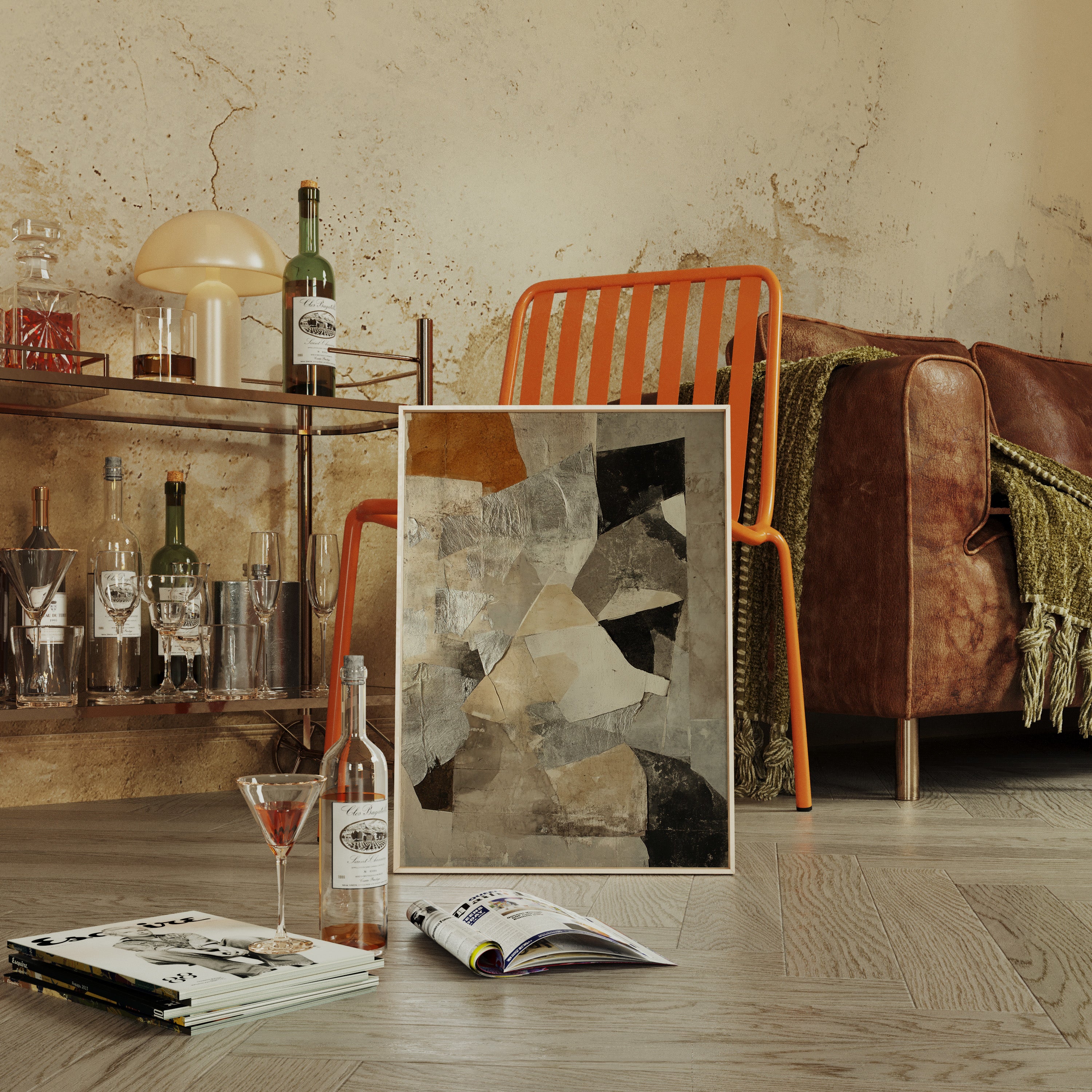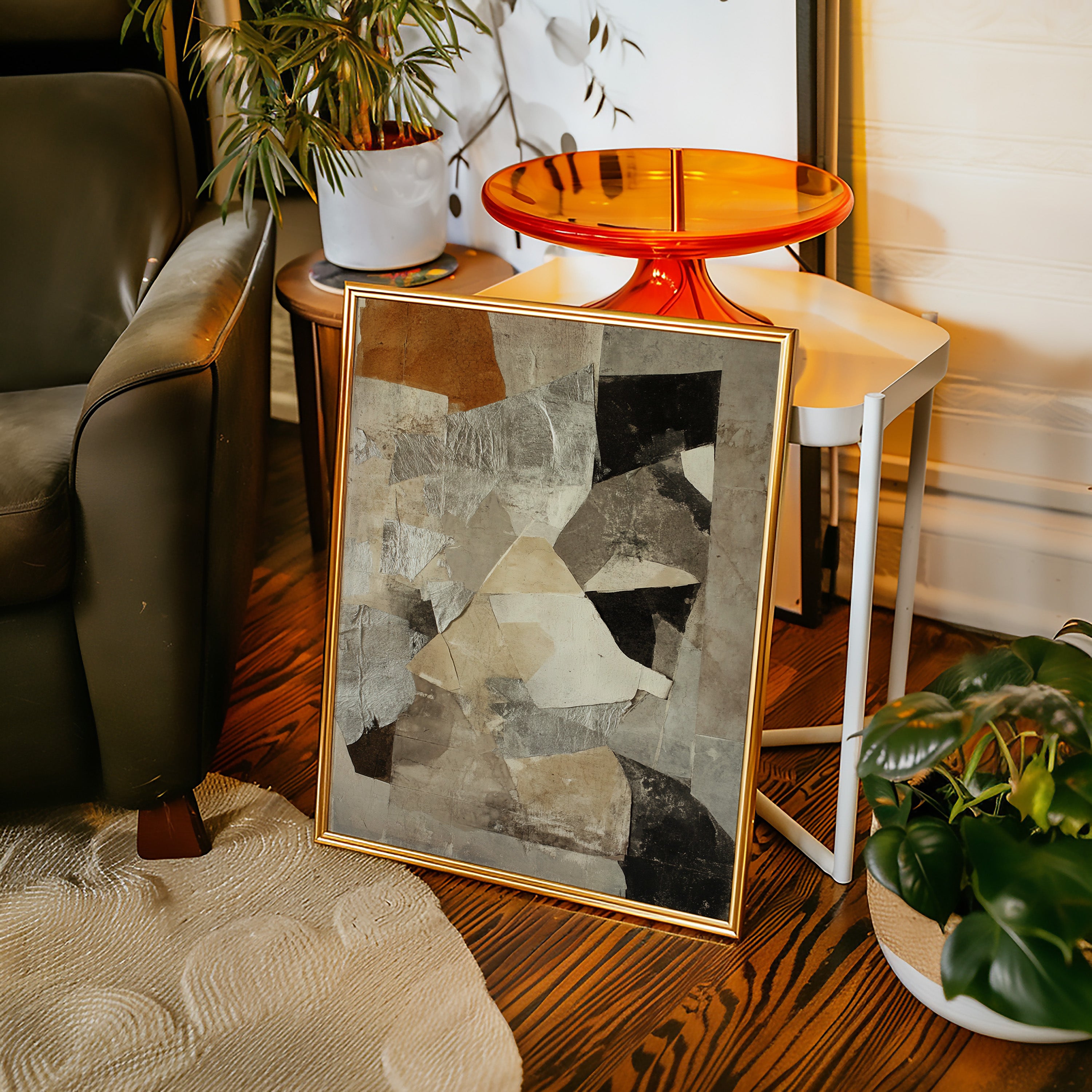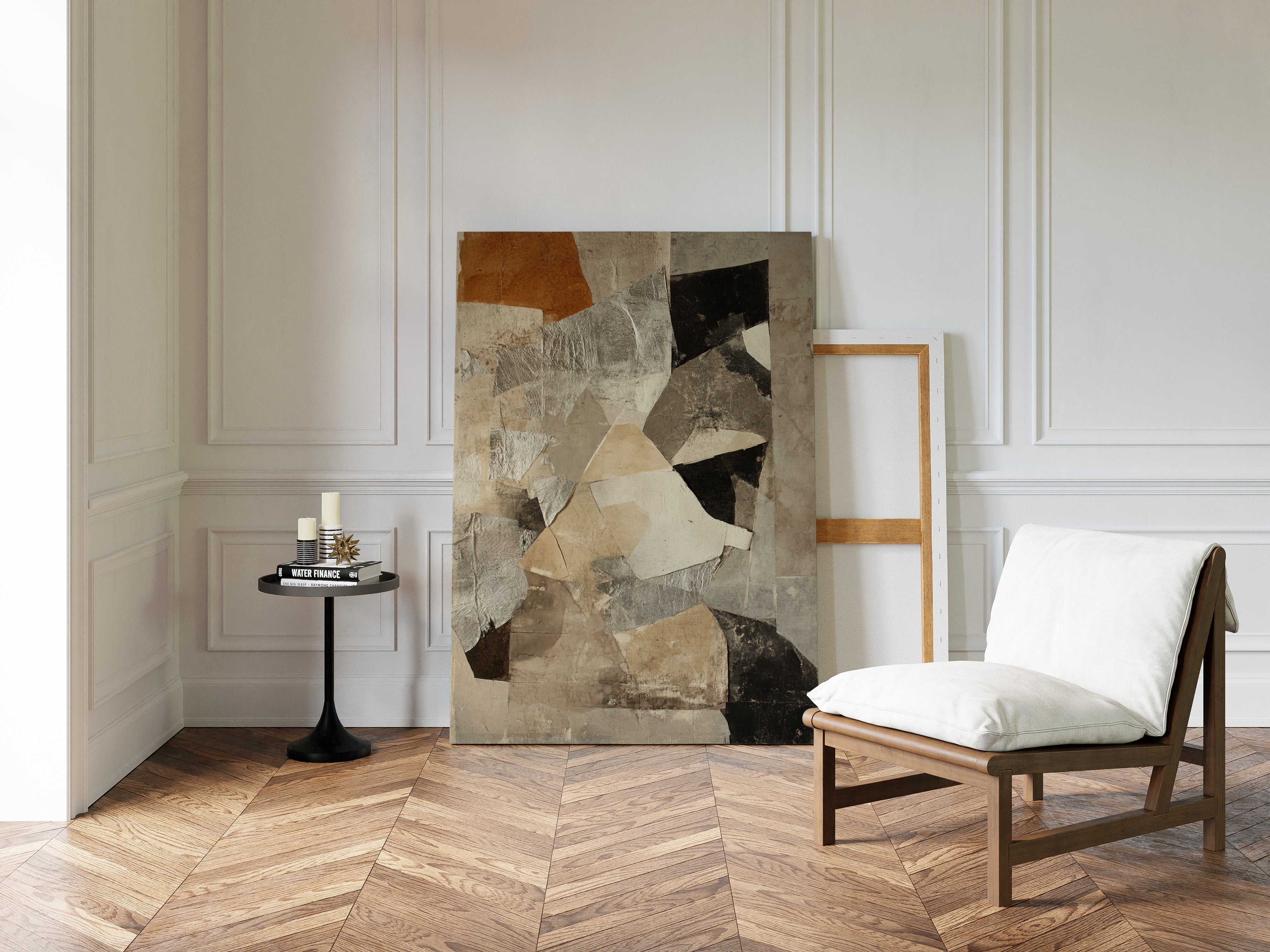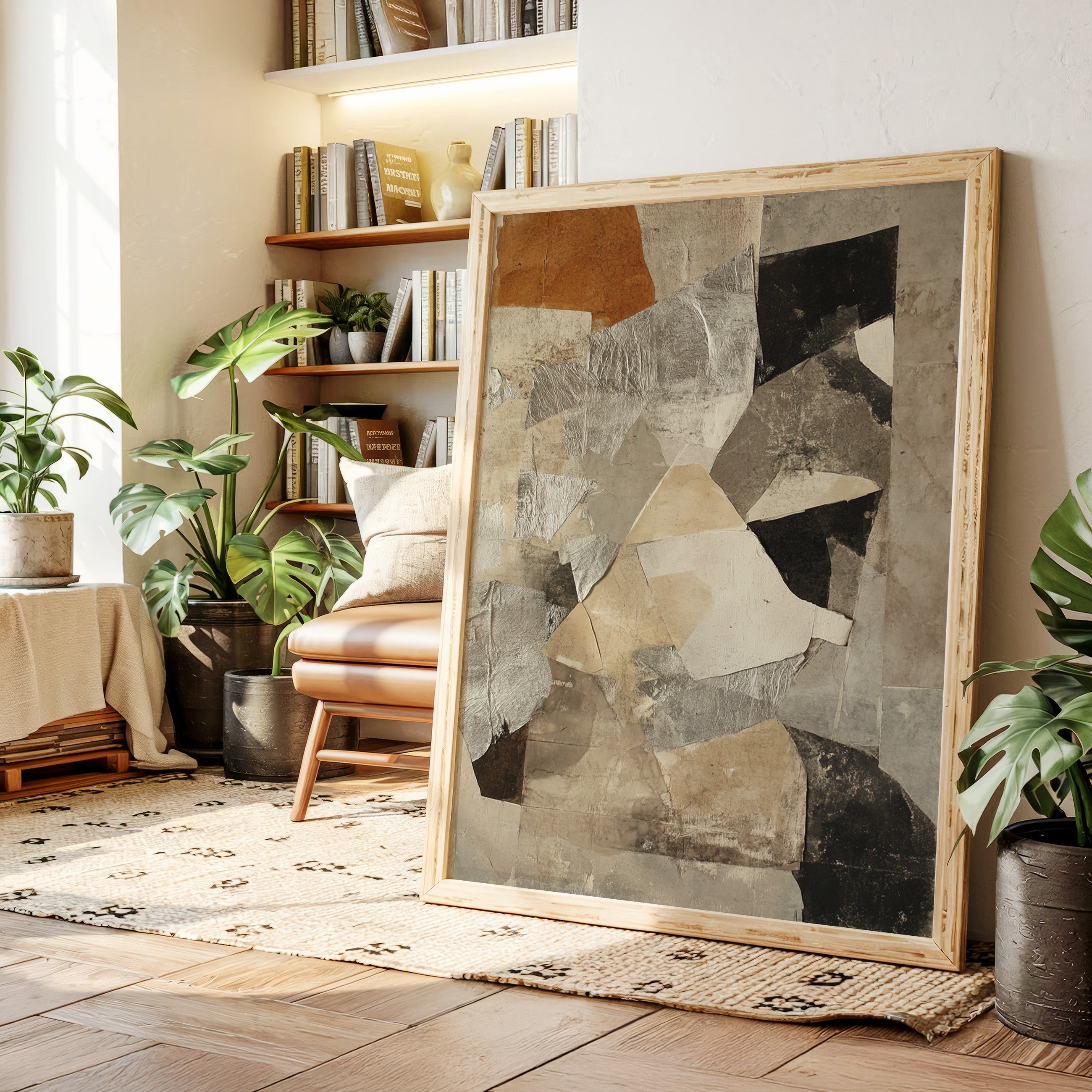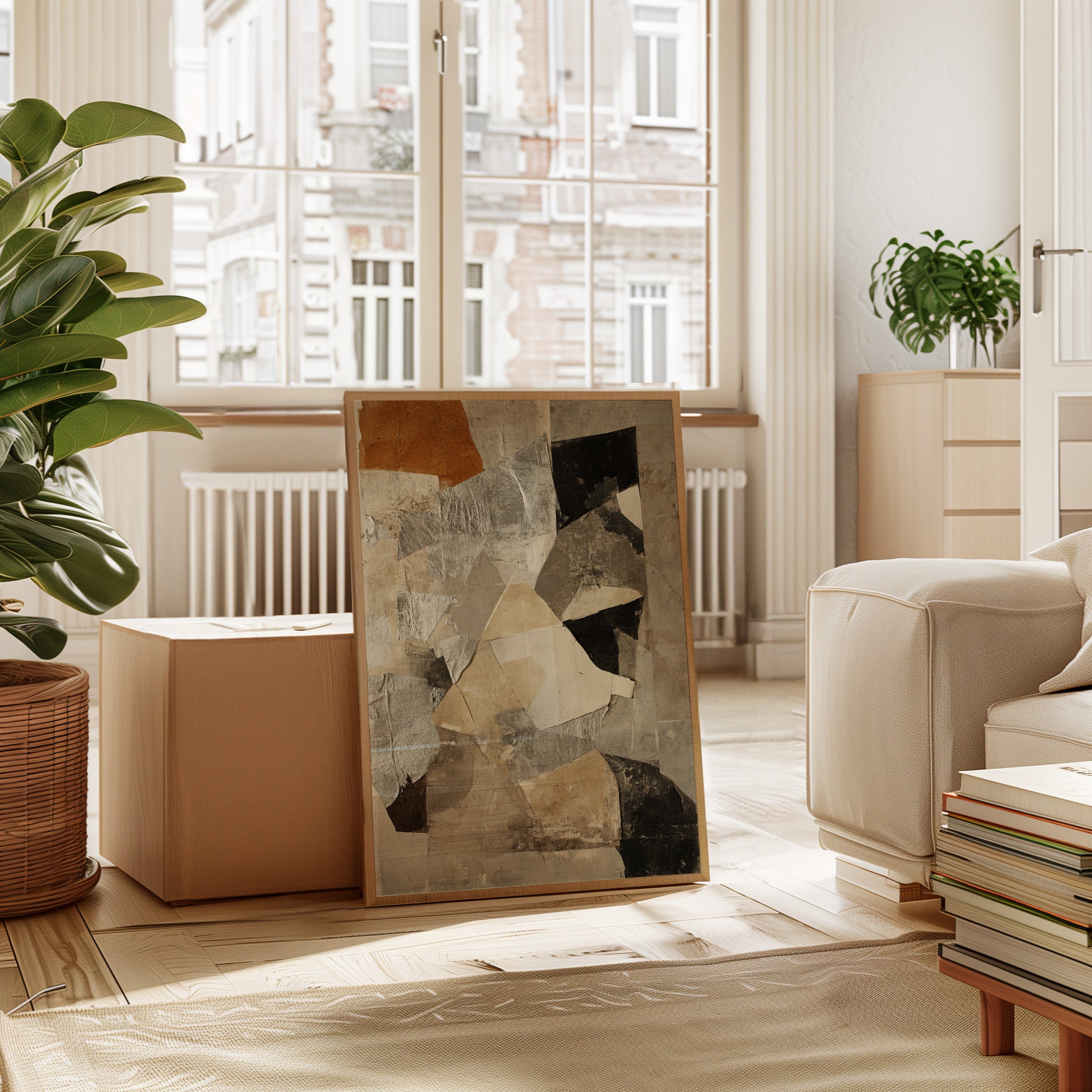 Weathered pieces of paper dance across the canvas like archaeological findings, each fragment telling its own tale of time. The composition juxtaposes rough-textured silver surfaces against smooth cream tones and bold black shapes, creating a sophisticated interplay of form and texture. Distressed edges and layered elements evoke memories of discovered letters and forgotten documents, while earthy rust tones add warmth to the otherwise monochromatic palette. This piece would bring contemplative sophistication to a modern study or minimal dining space, where its subtle complexity can be fully appreciated.